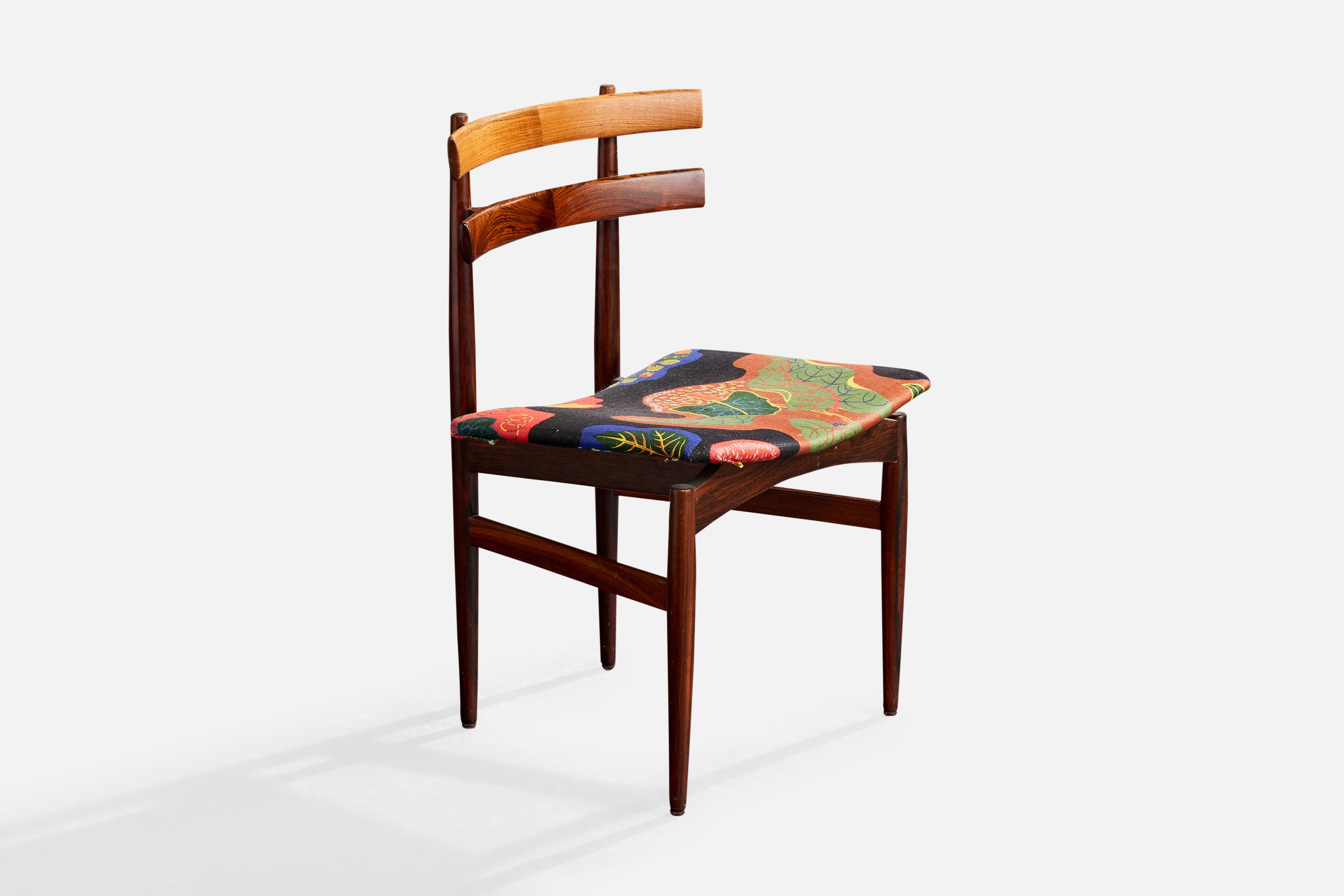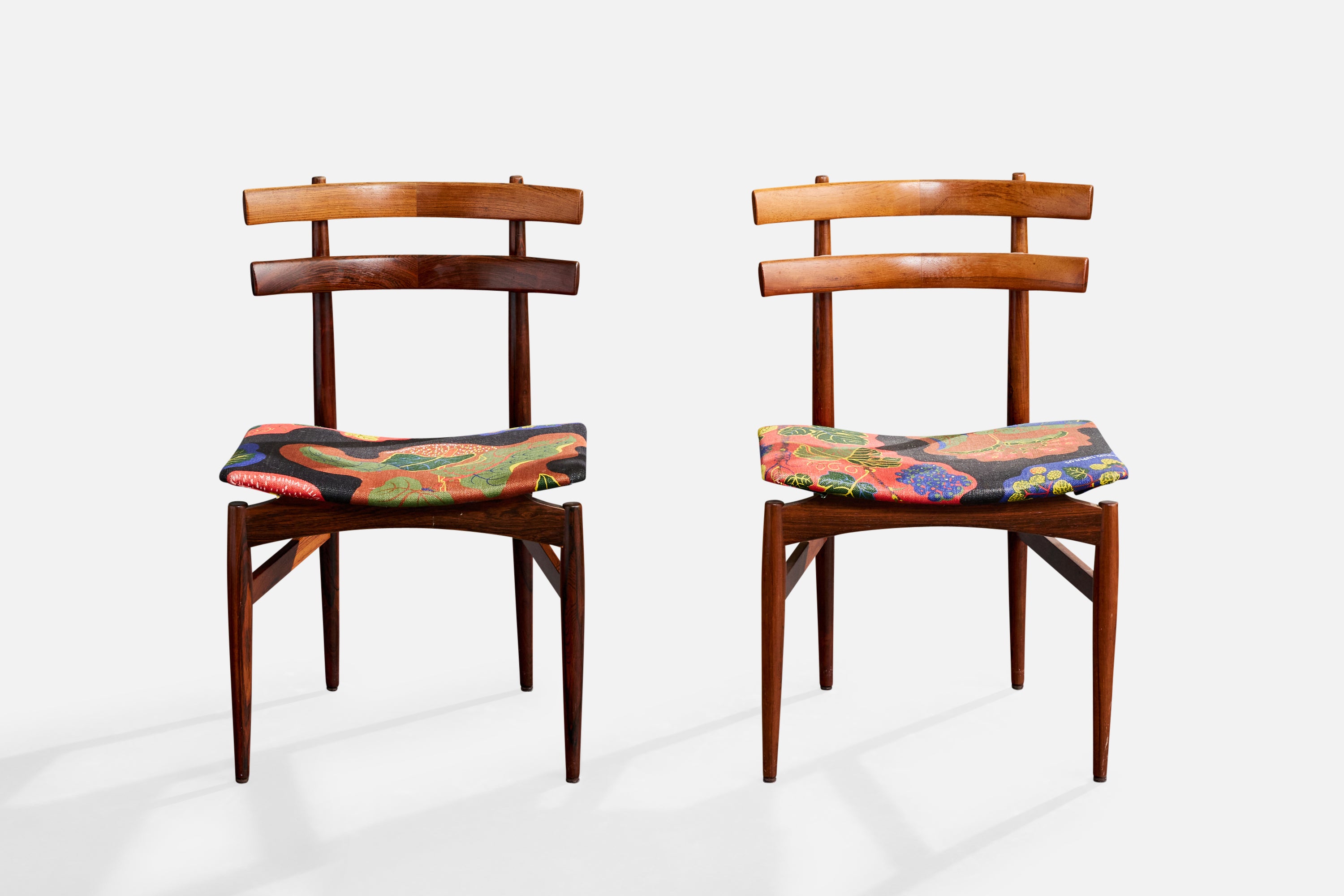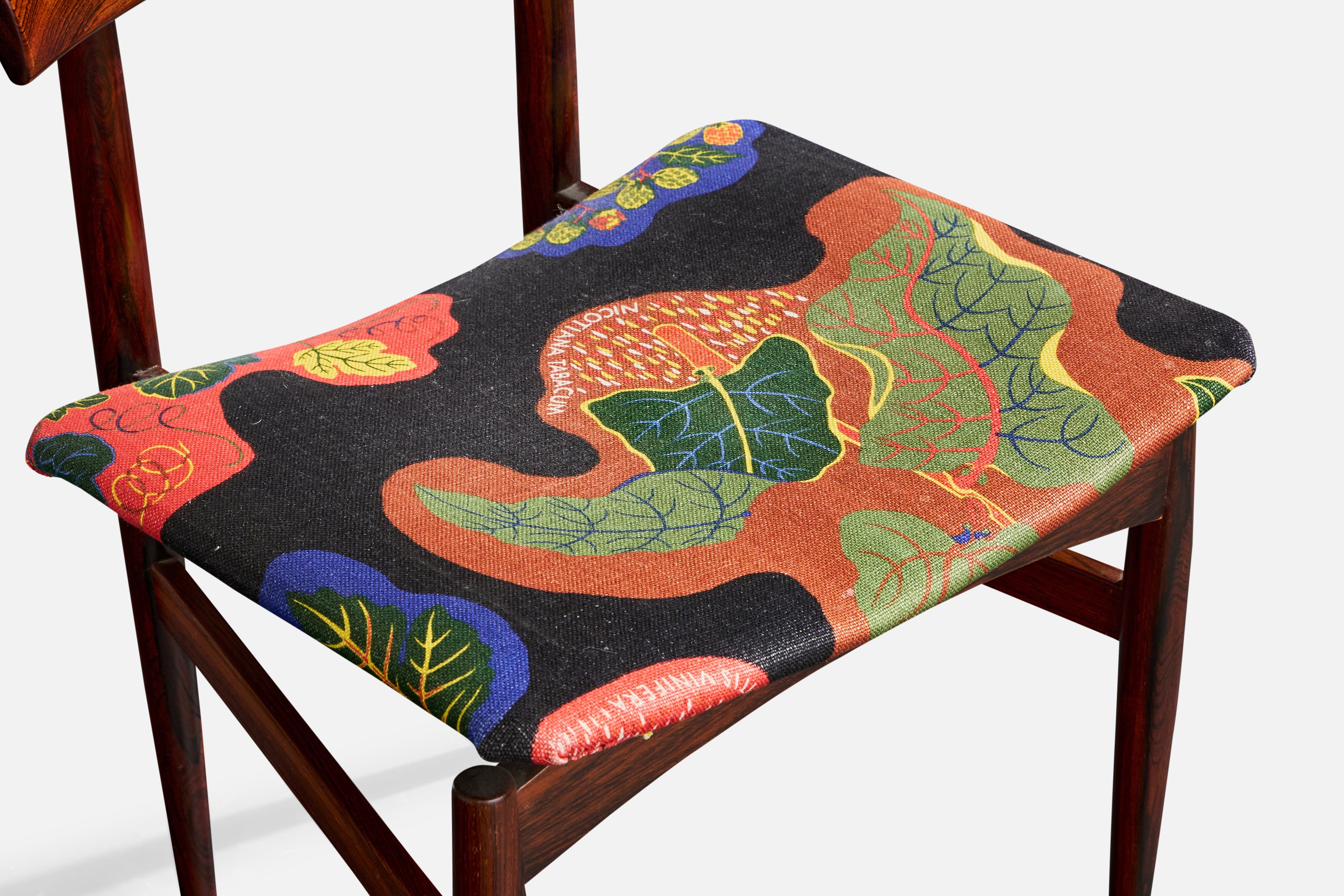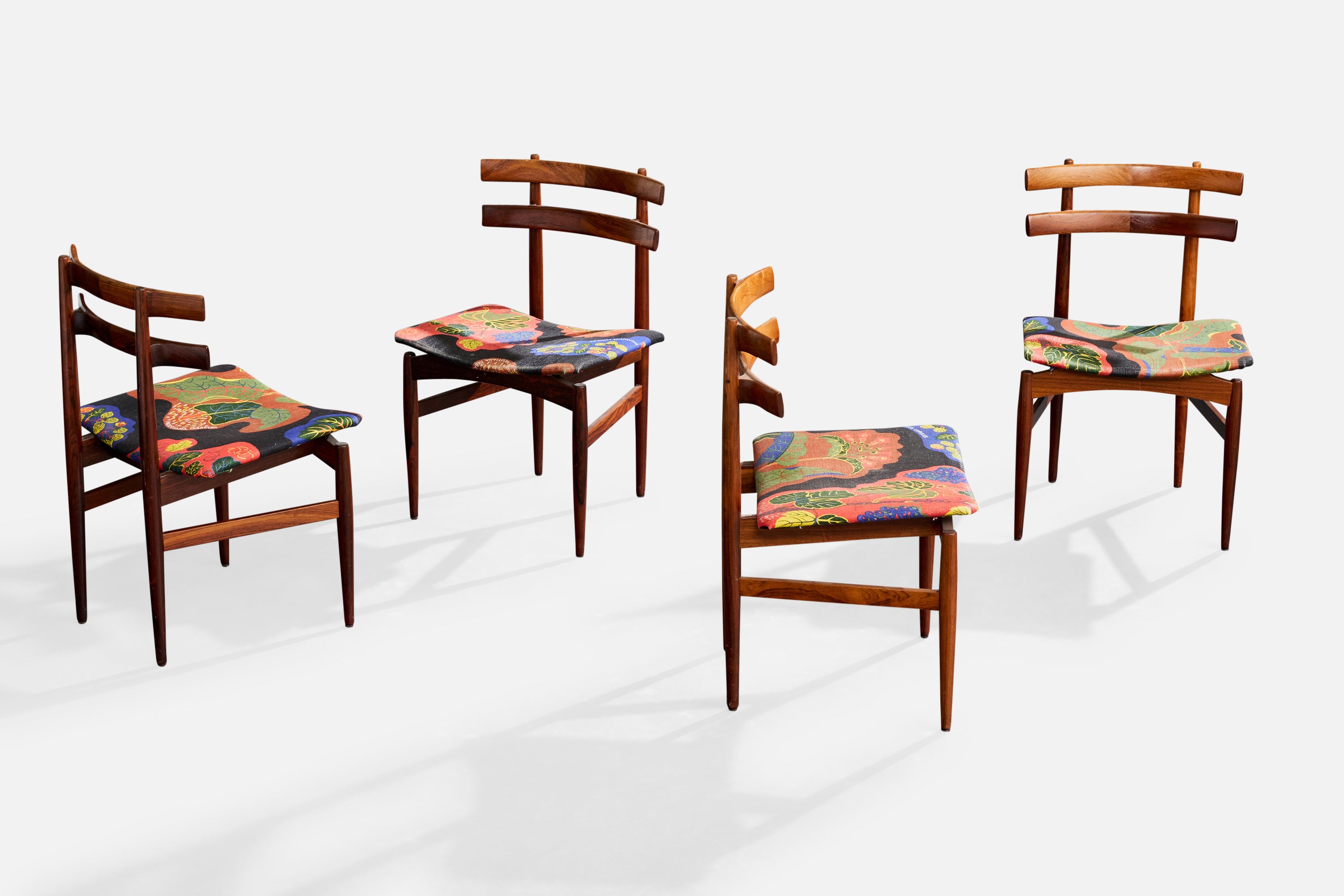 A set of four wood and floral-printed fabric dining chairs or side chairs designed and produced by Poul Hundevad, Denmark, c. 1960s.