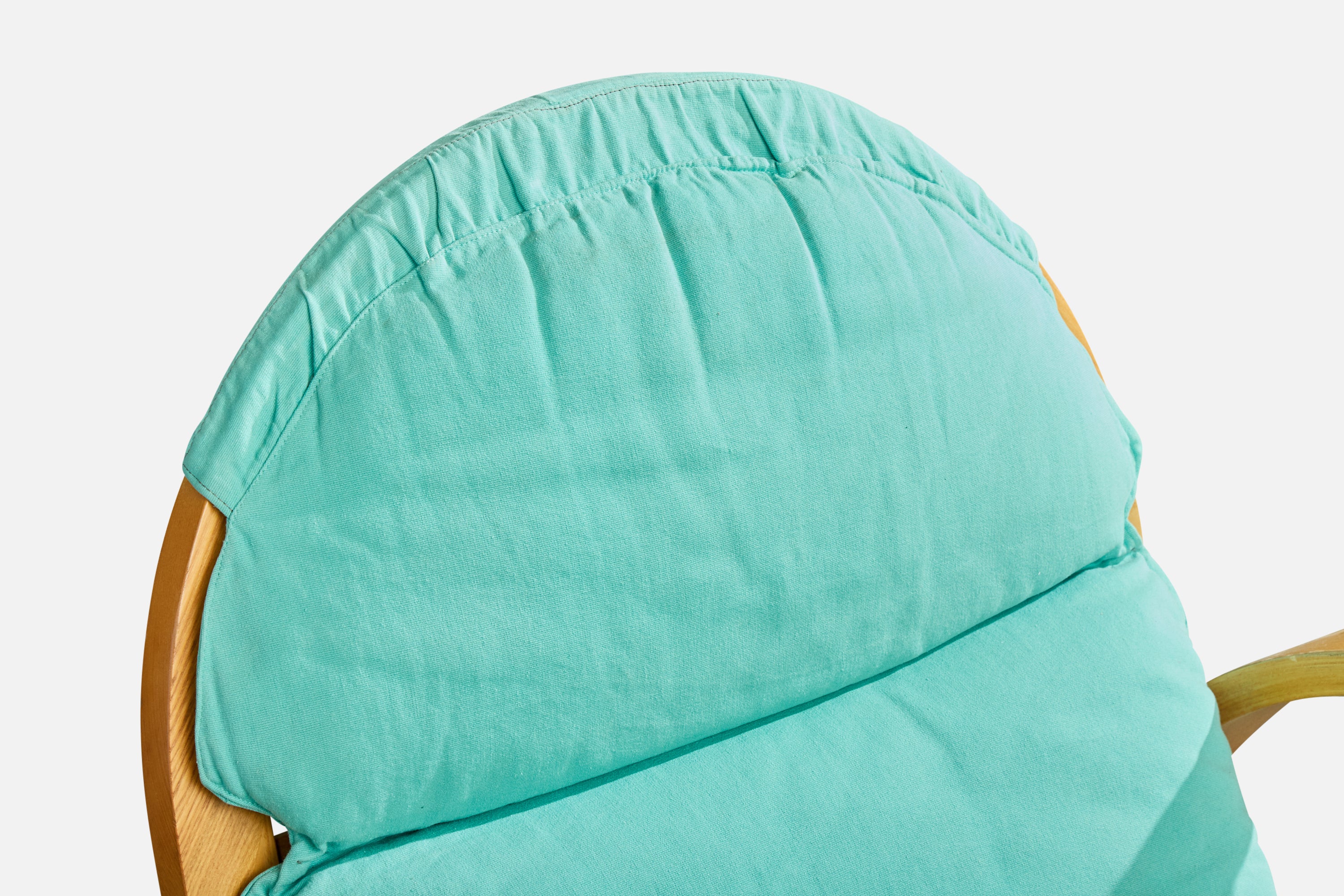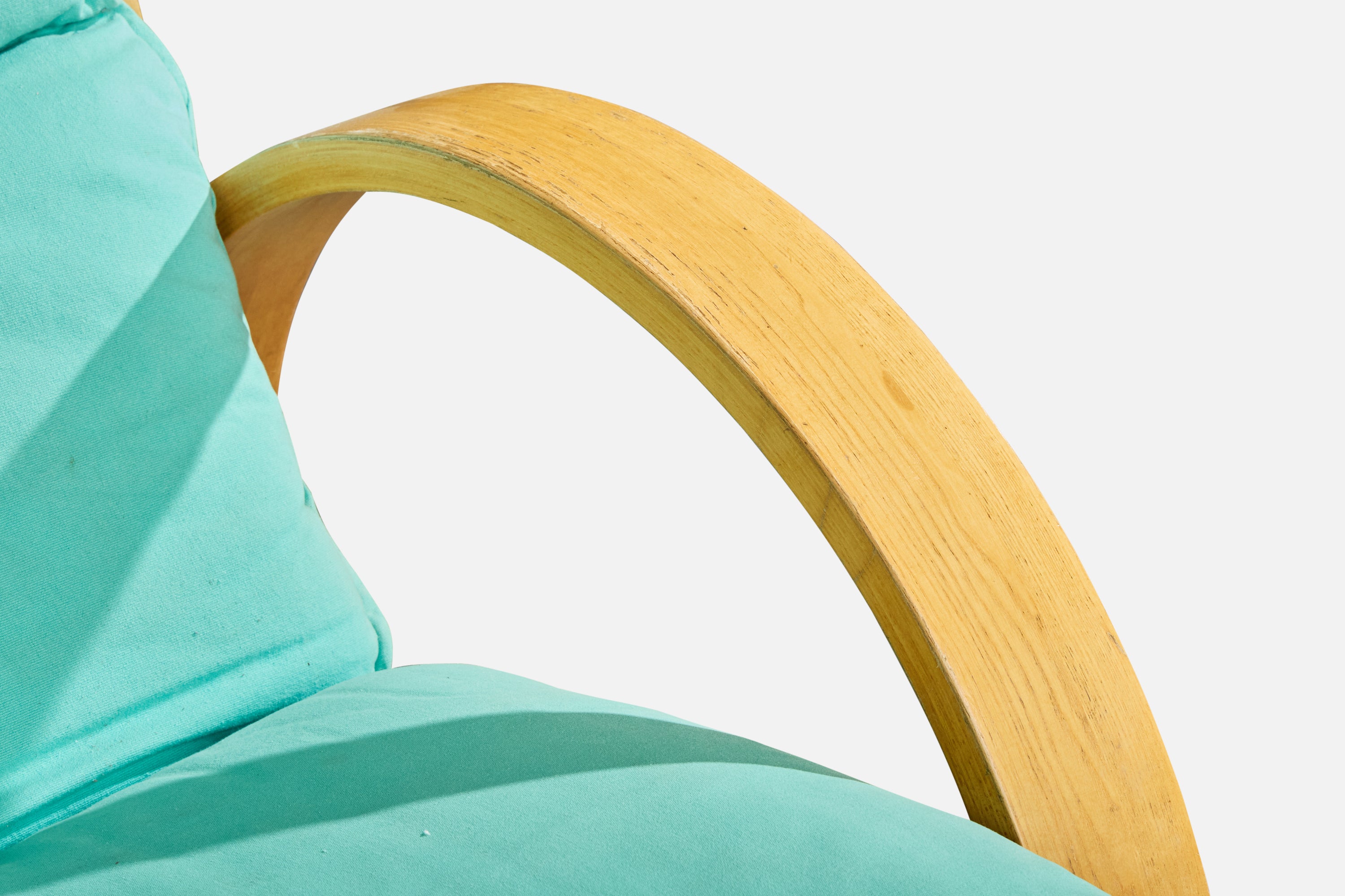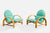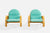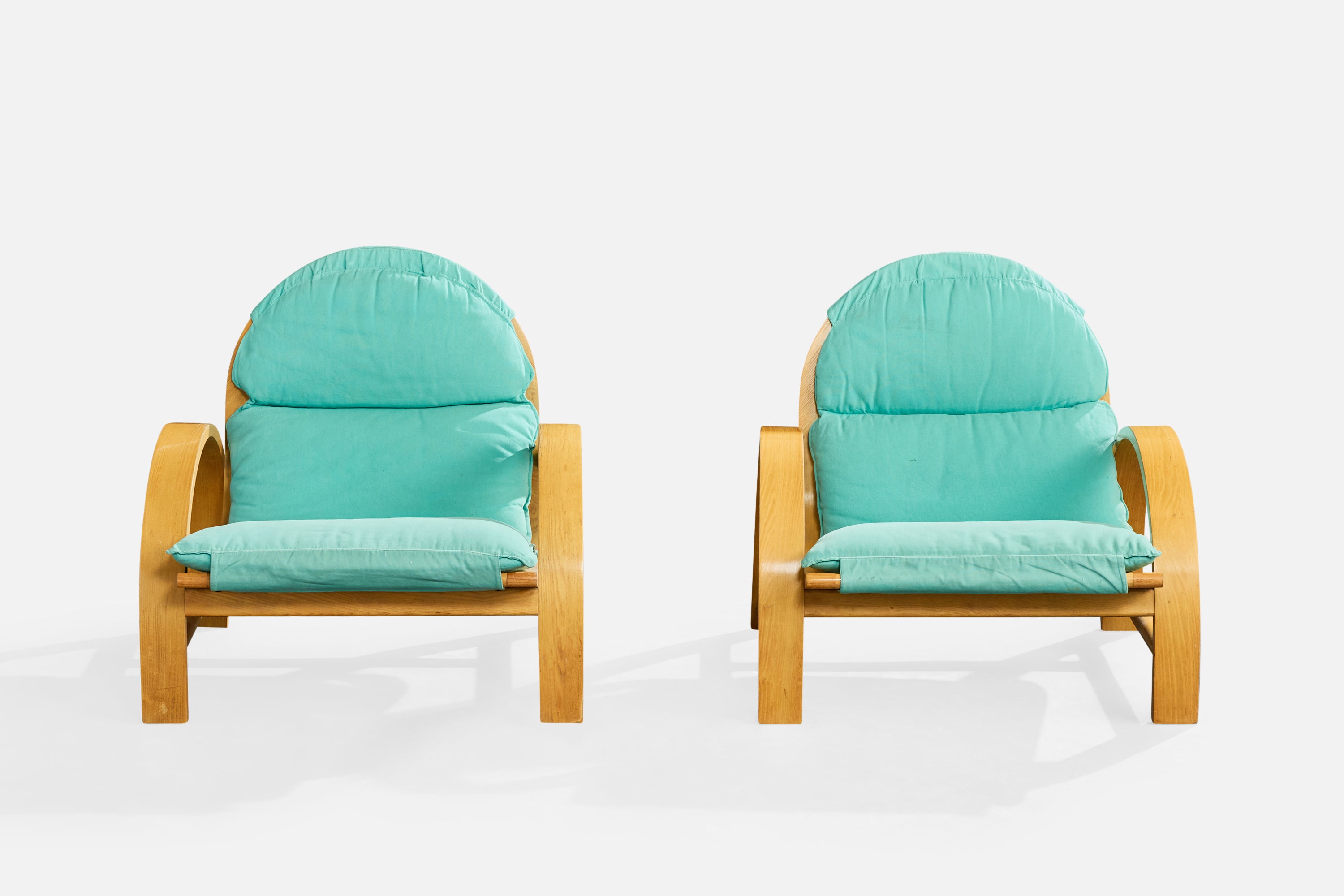 A pair of wood and teal fabric lounge chairs designed by Adalberto Dal Lago and produced by Germa, Italy, c. 1970s.