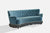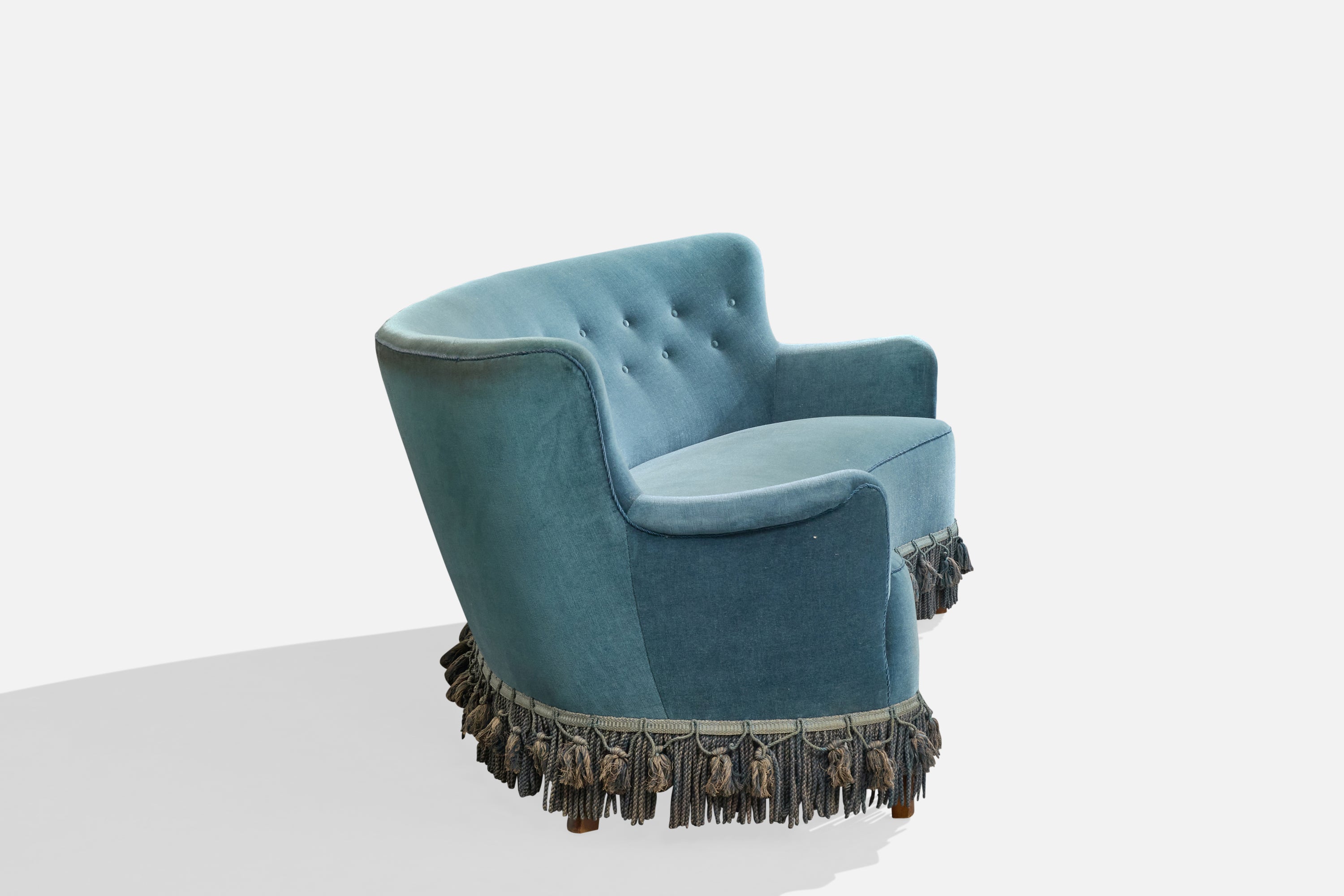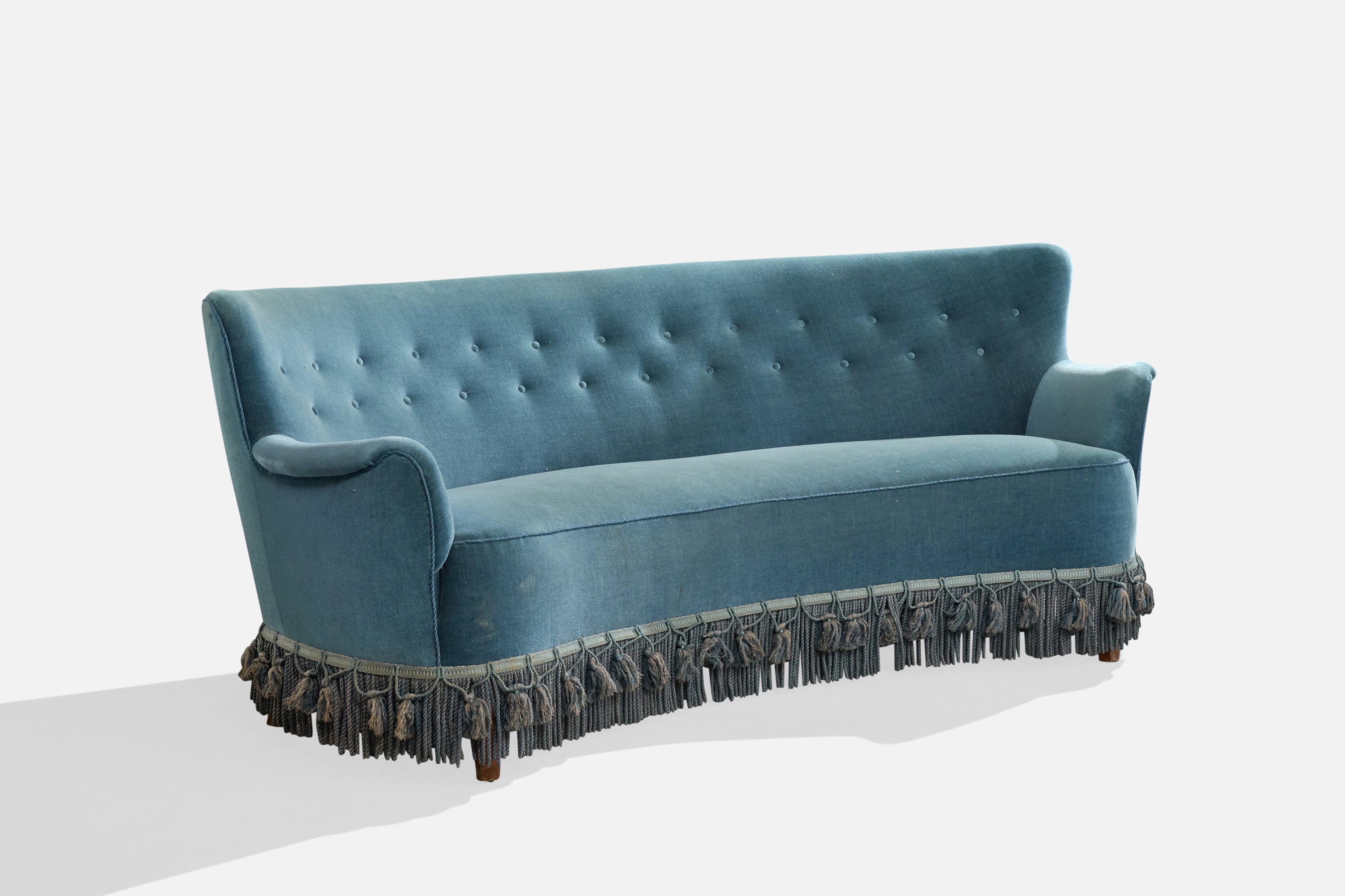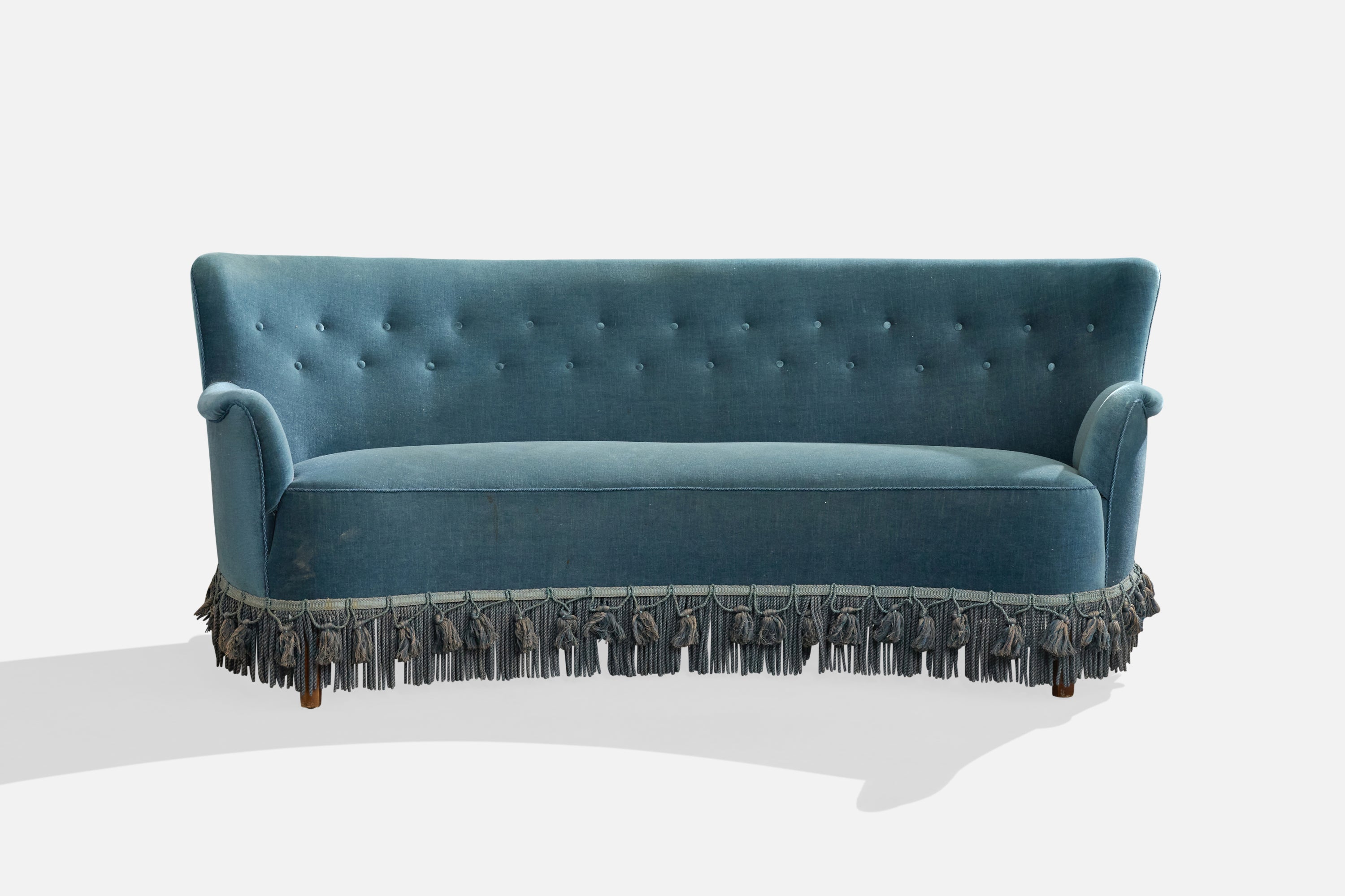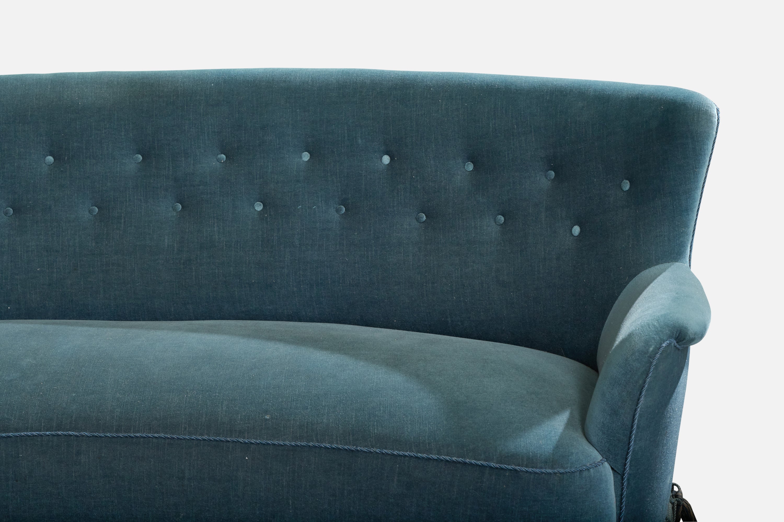 A blue velvet, fabric string and wood sofa designed and produced in Denmark, c. 1950s.
