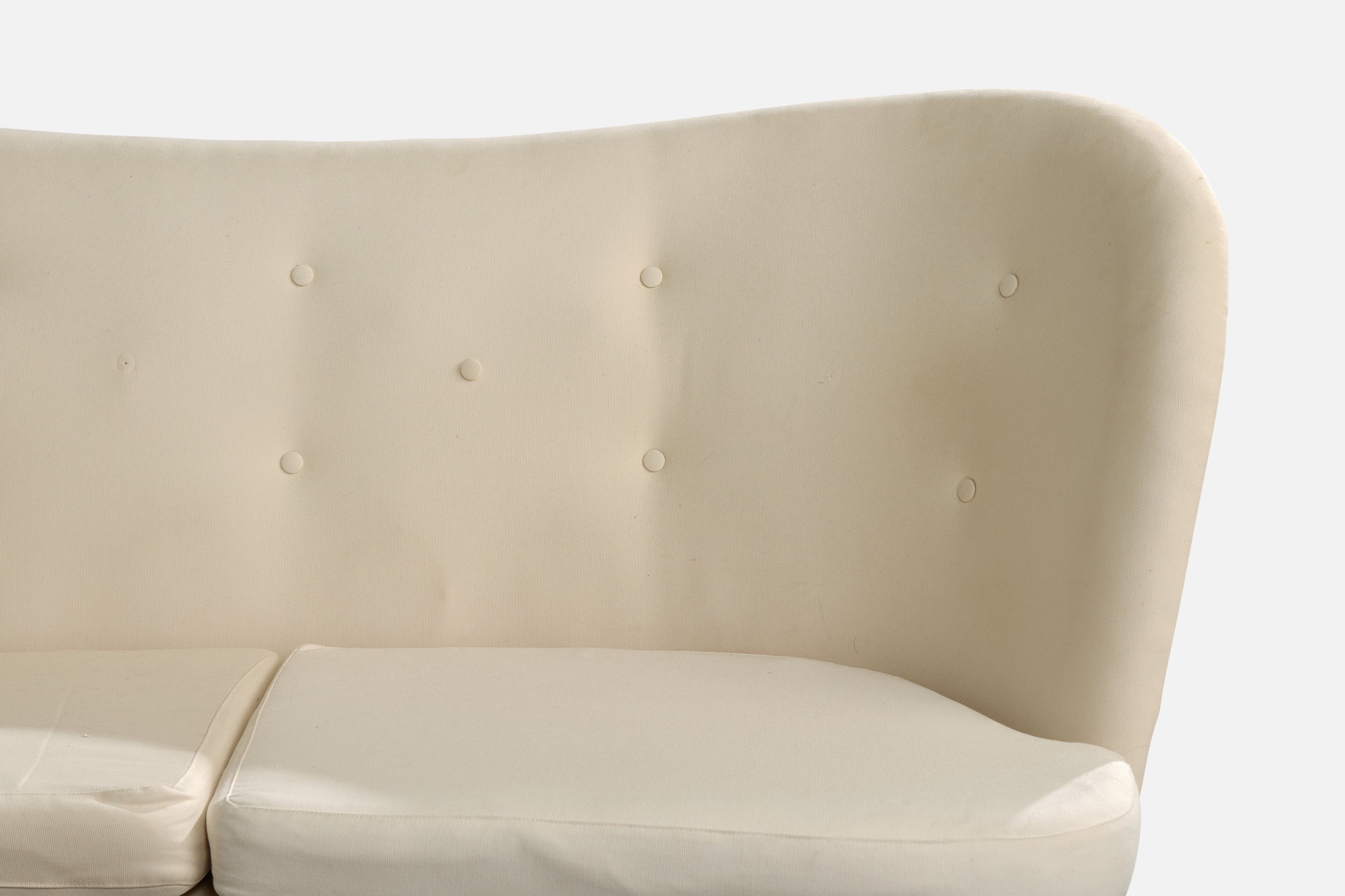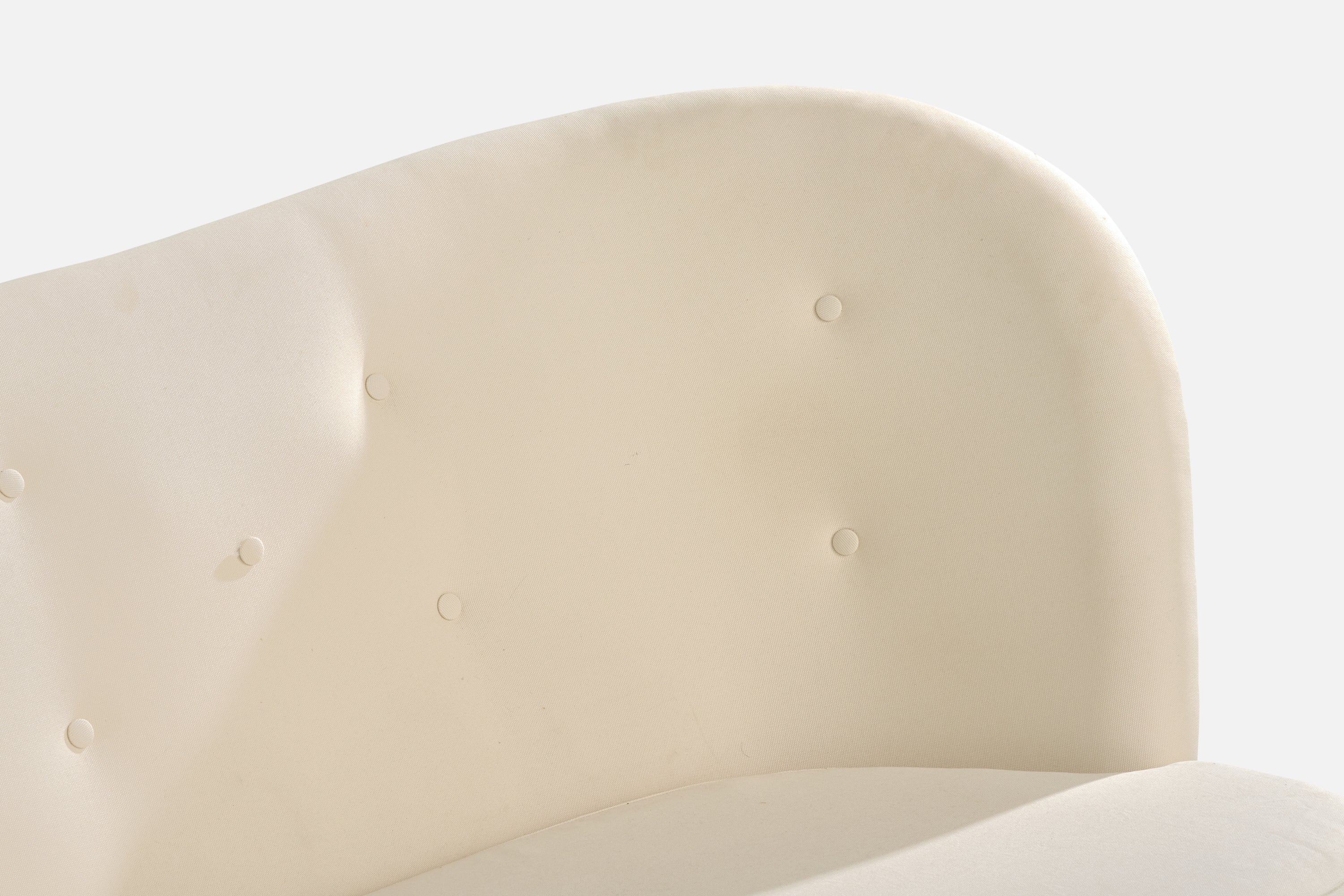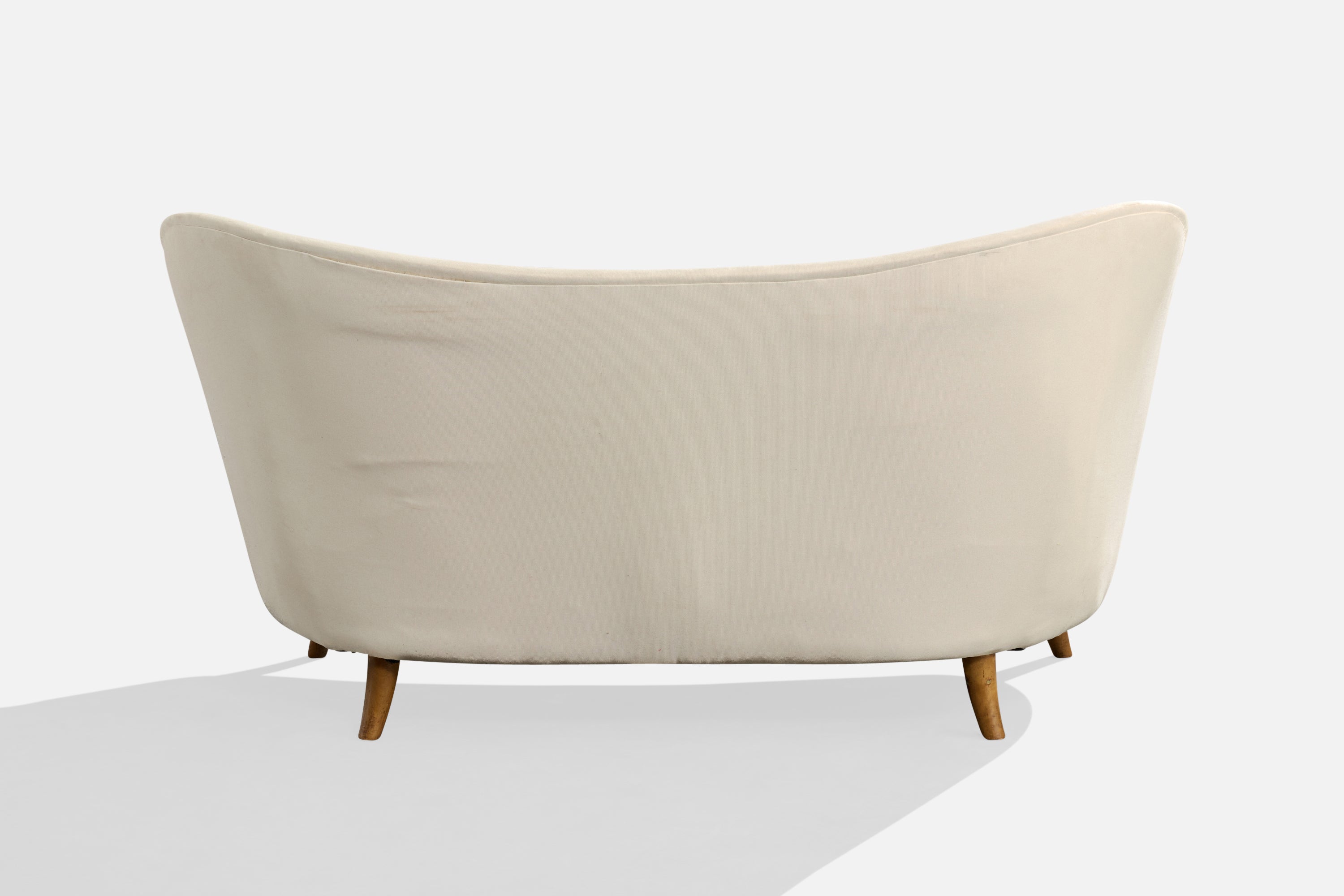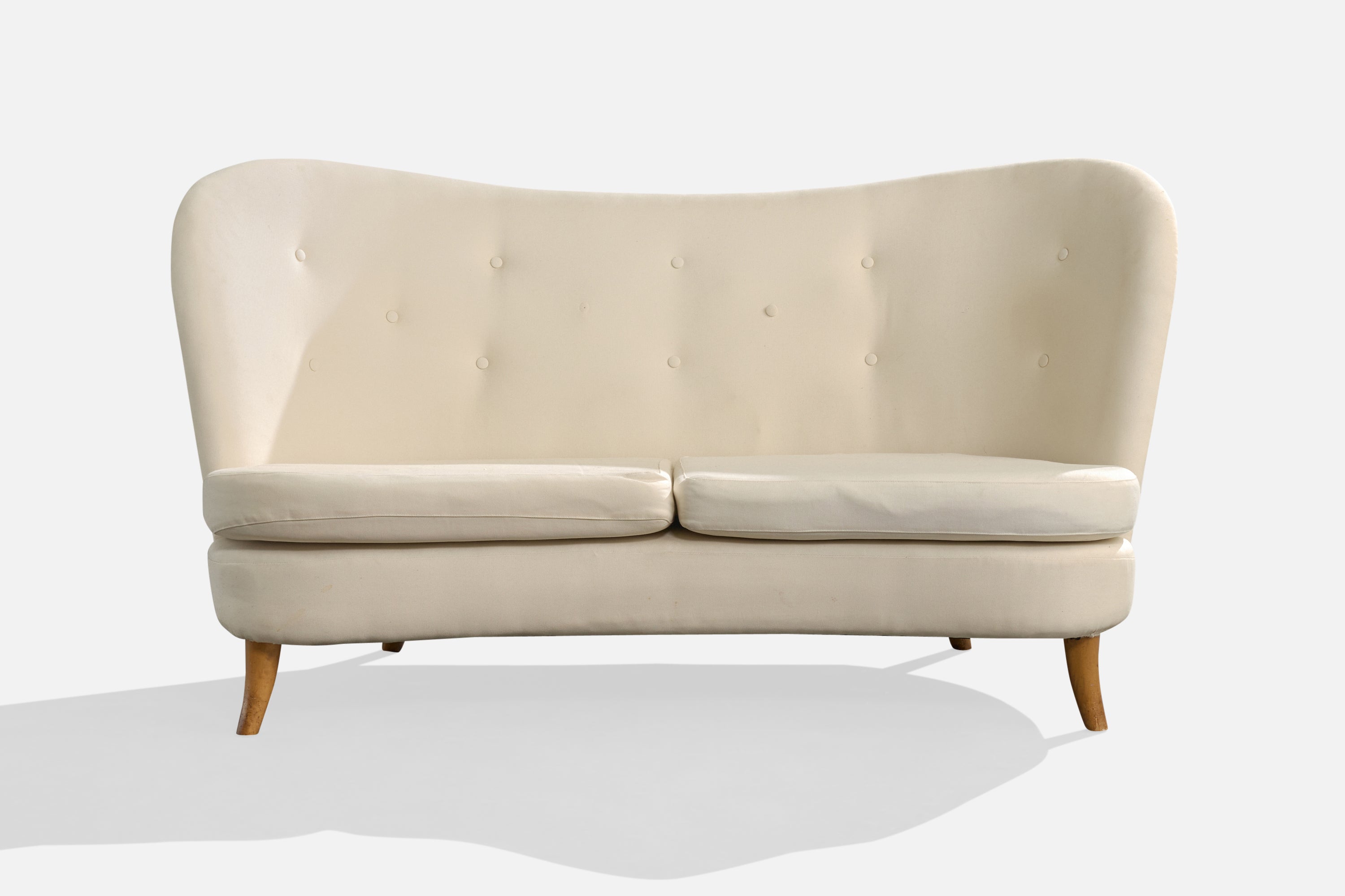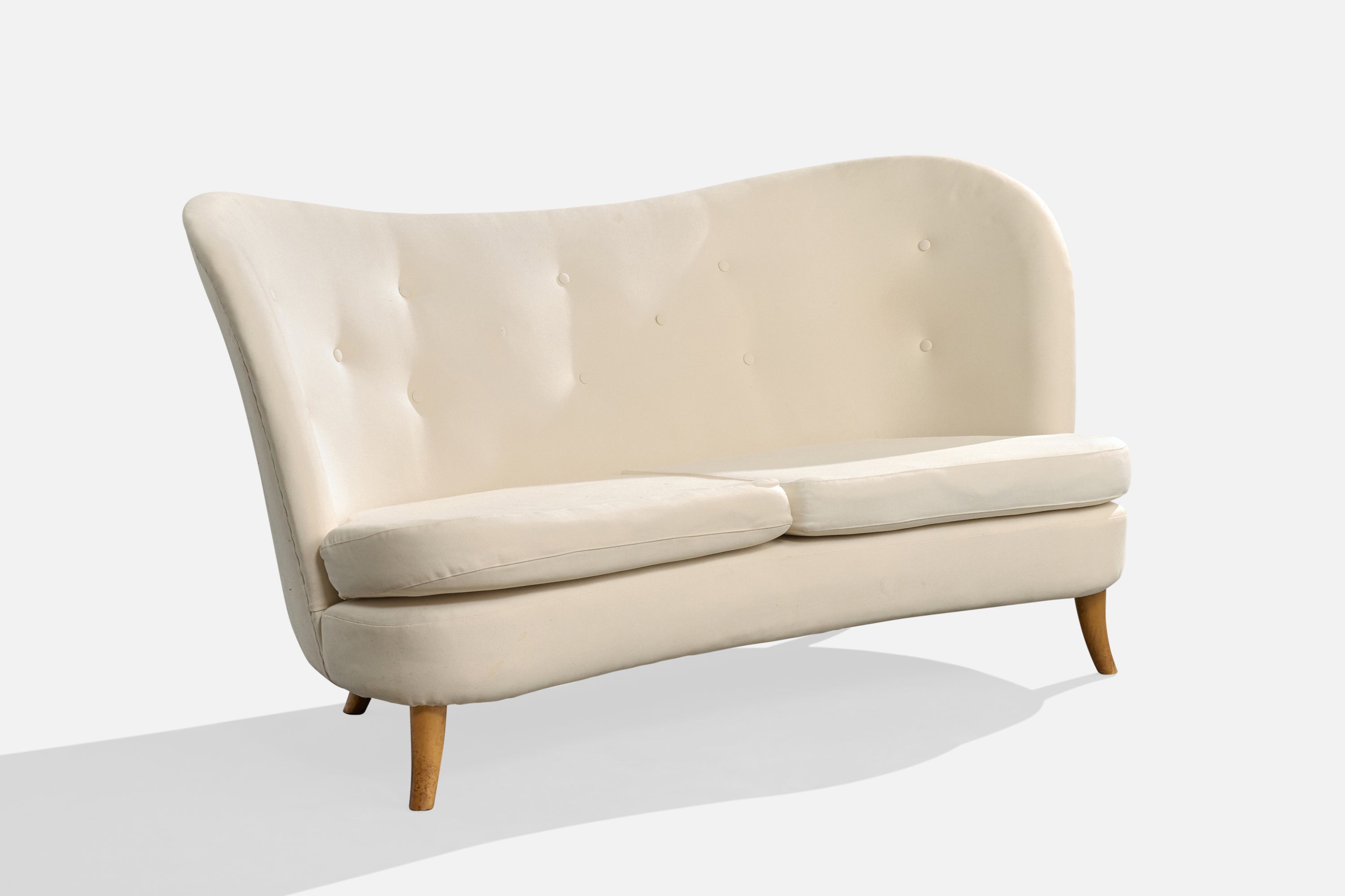 A white fabric and wood sofa designed by Carl-Johan Boman and produced by Oy Boman Ab, Finland, c. 1940s.