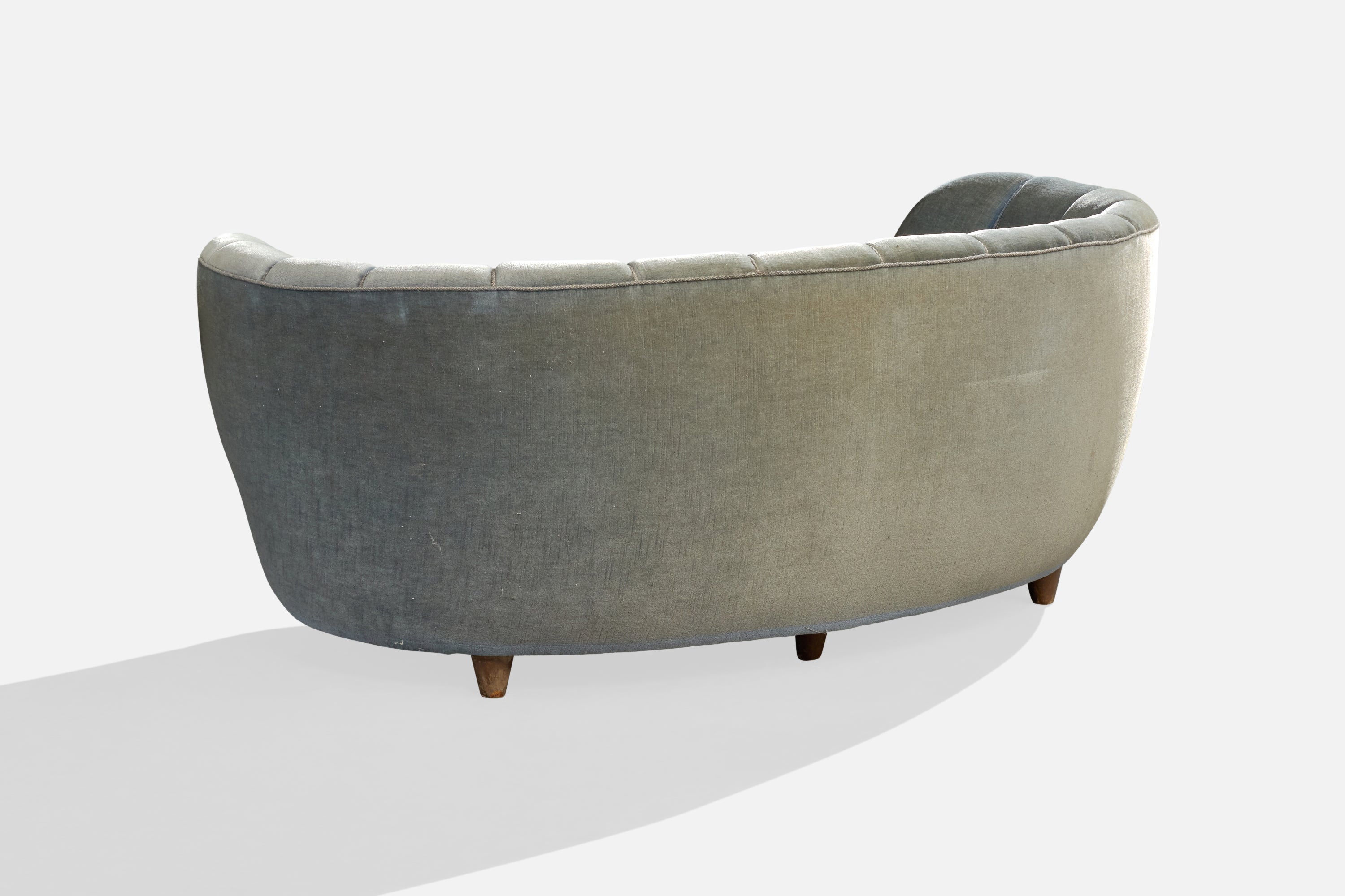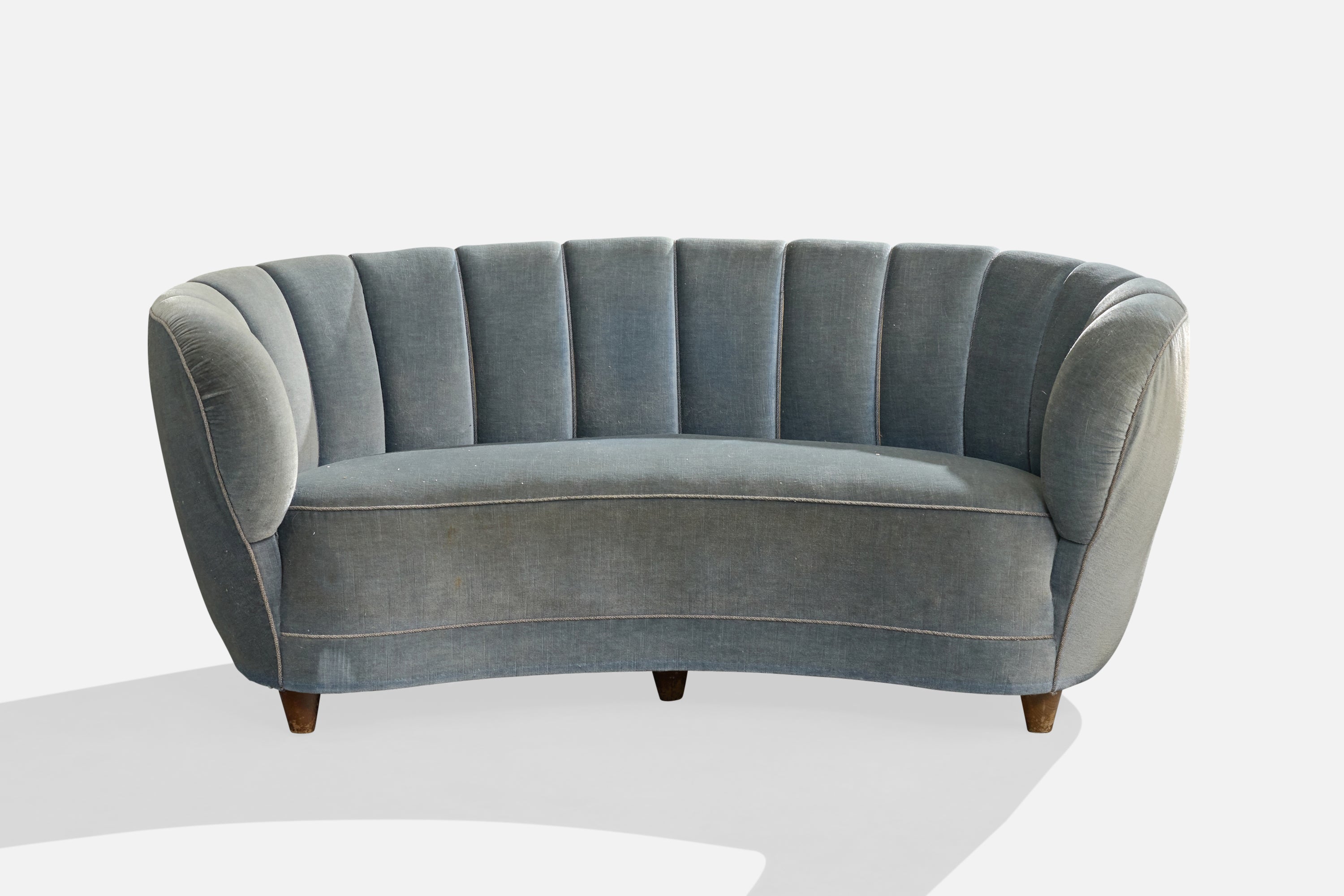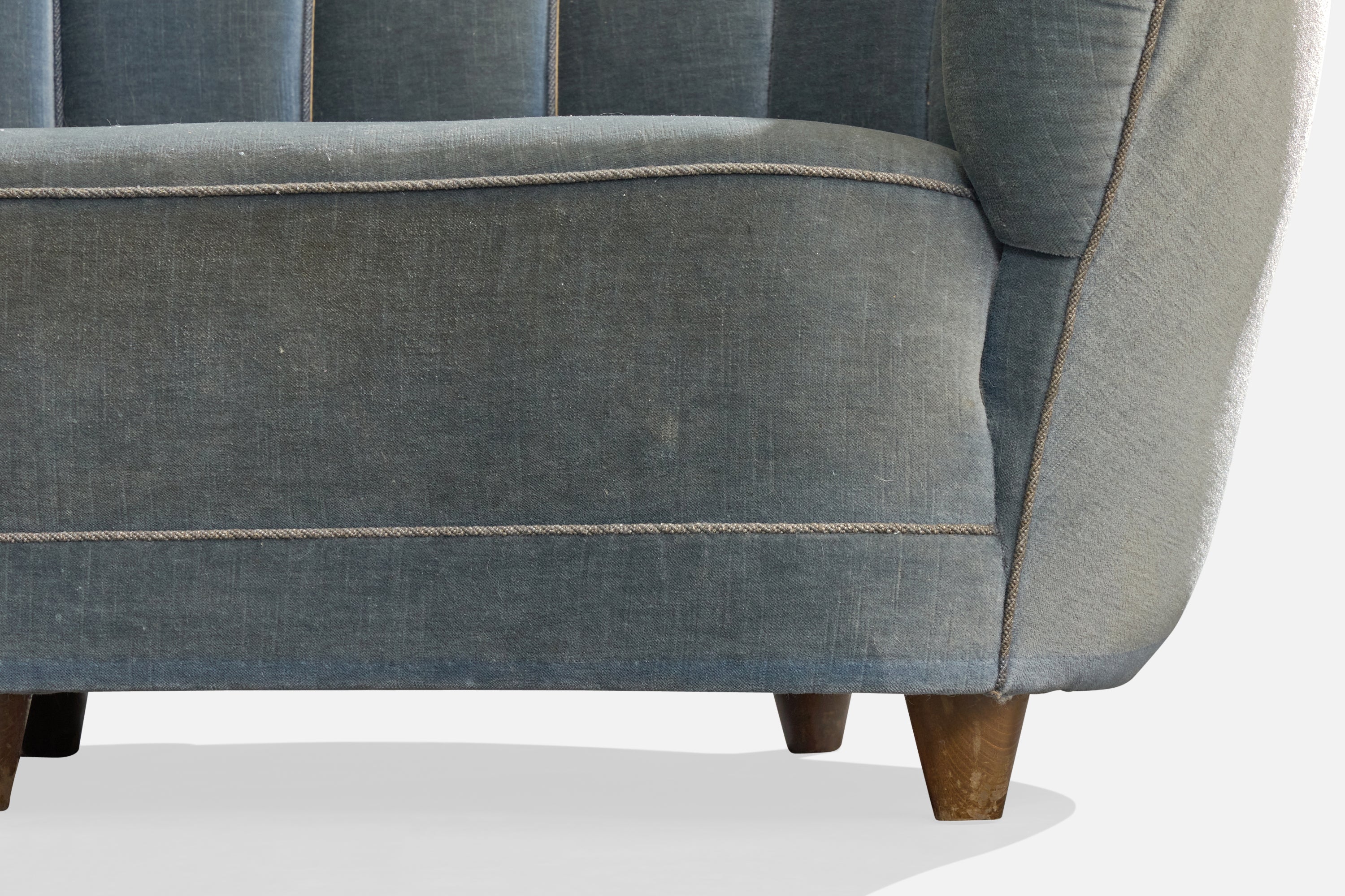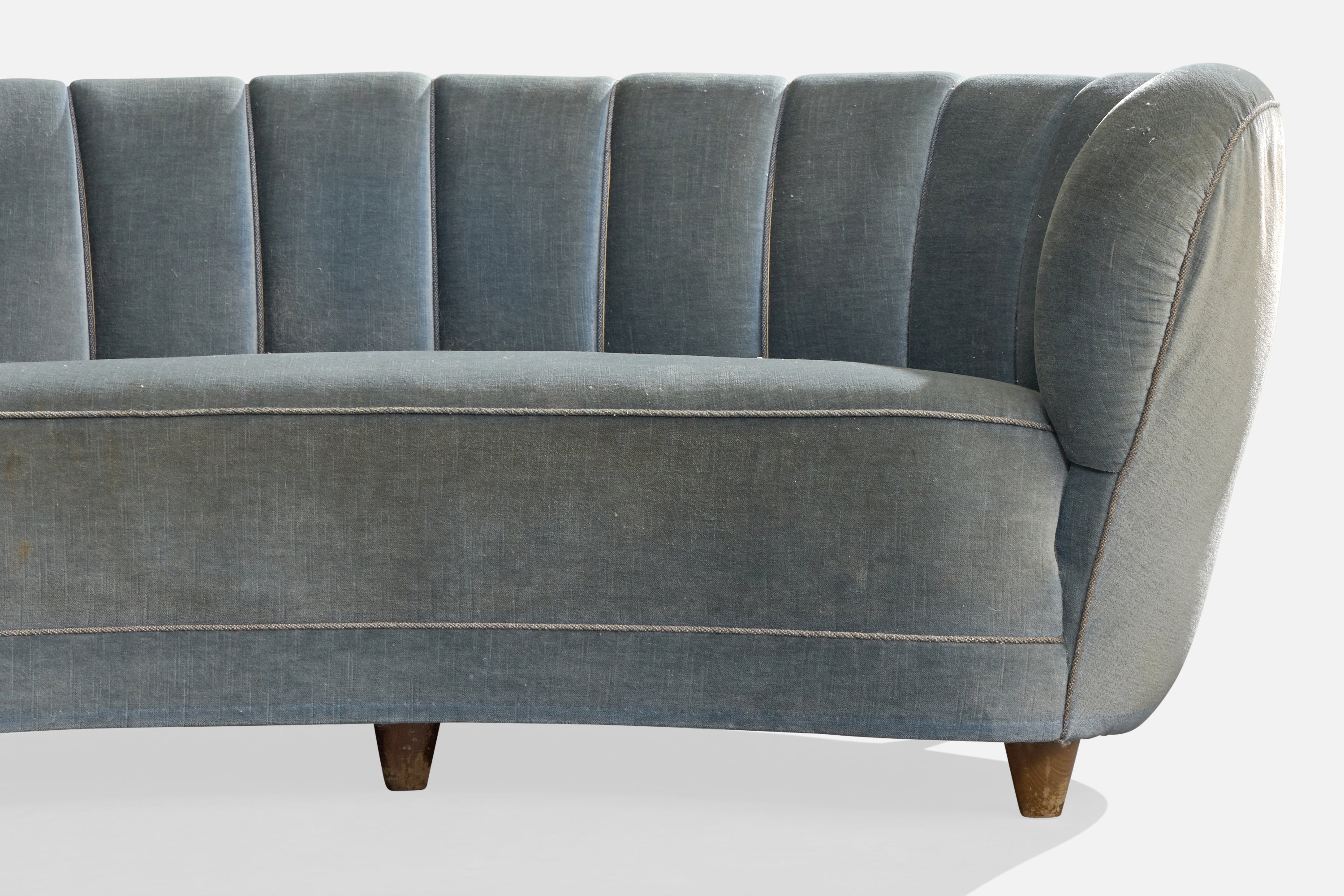 A blue velvet and wood sofa designed and produced in Denmark, c. 1940s.