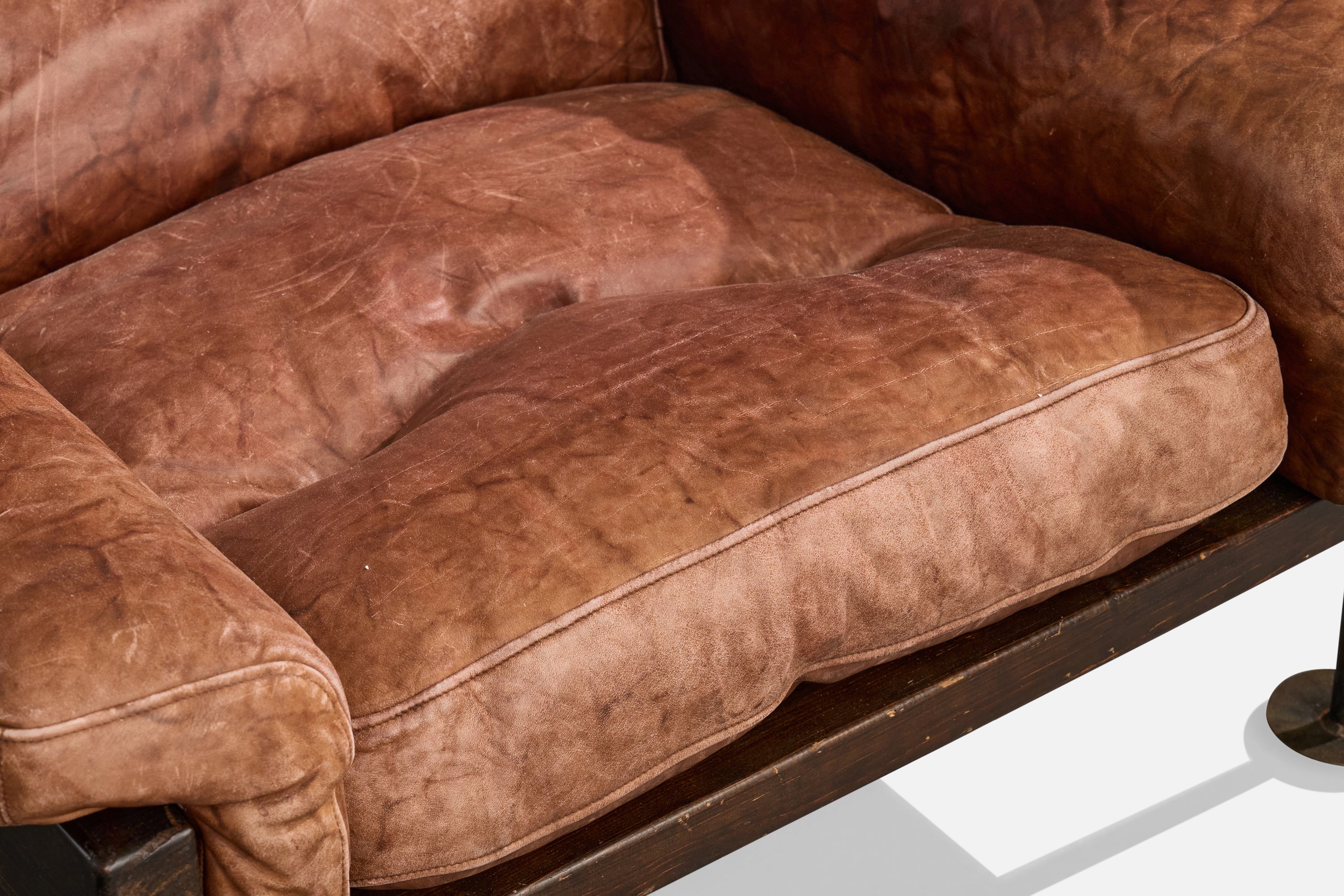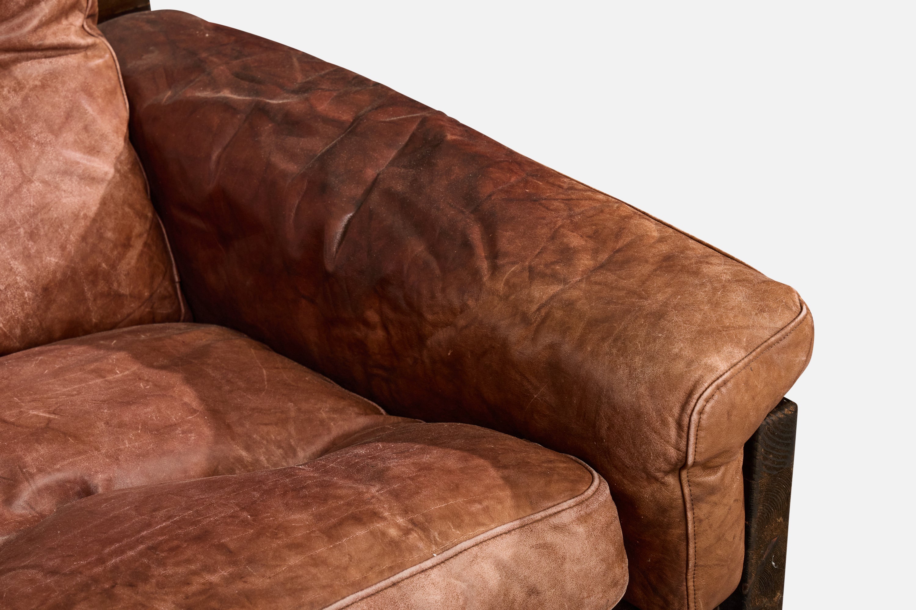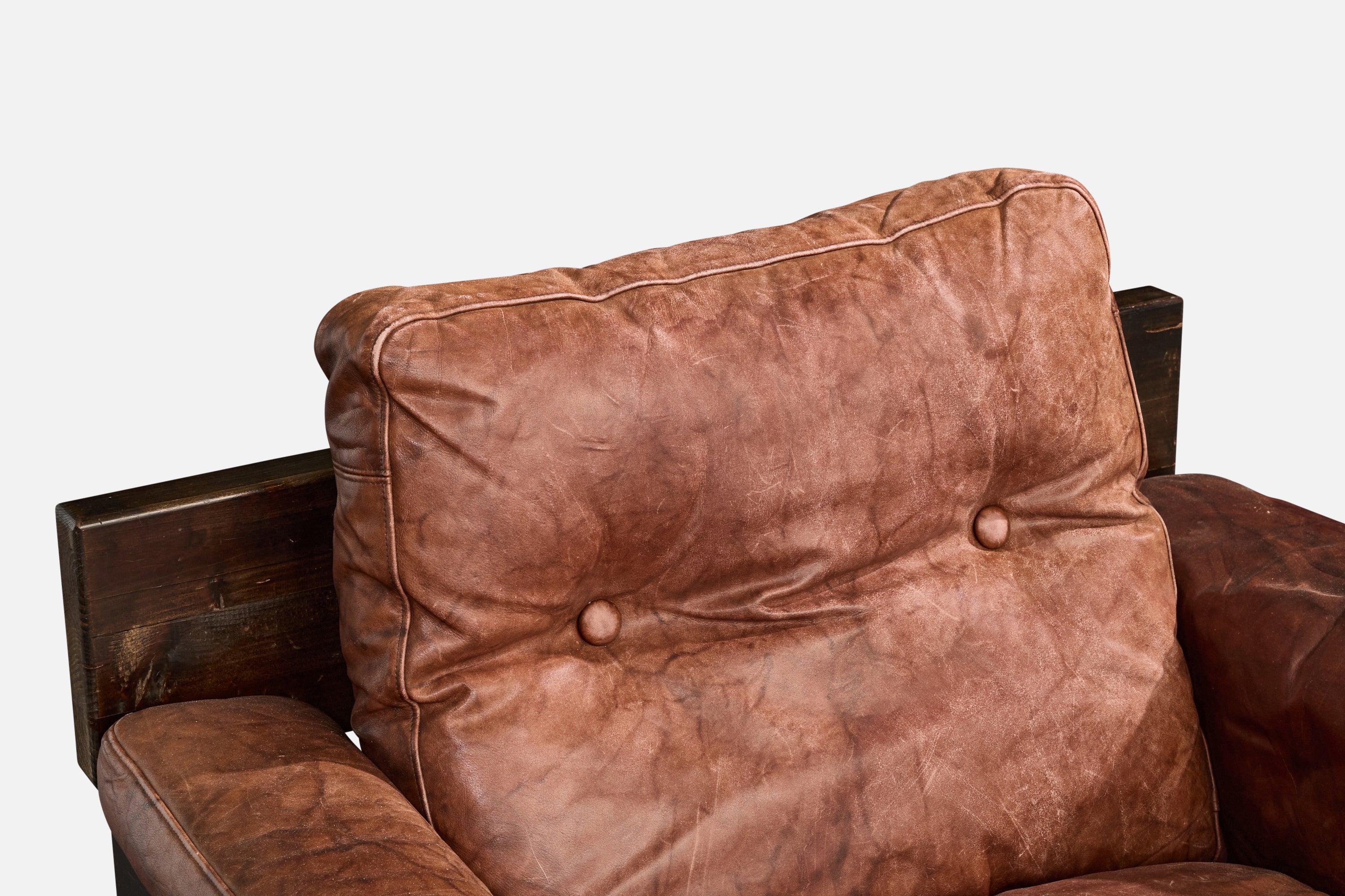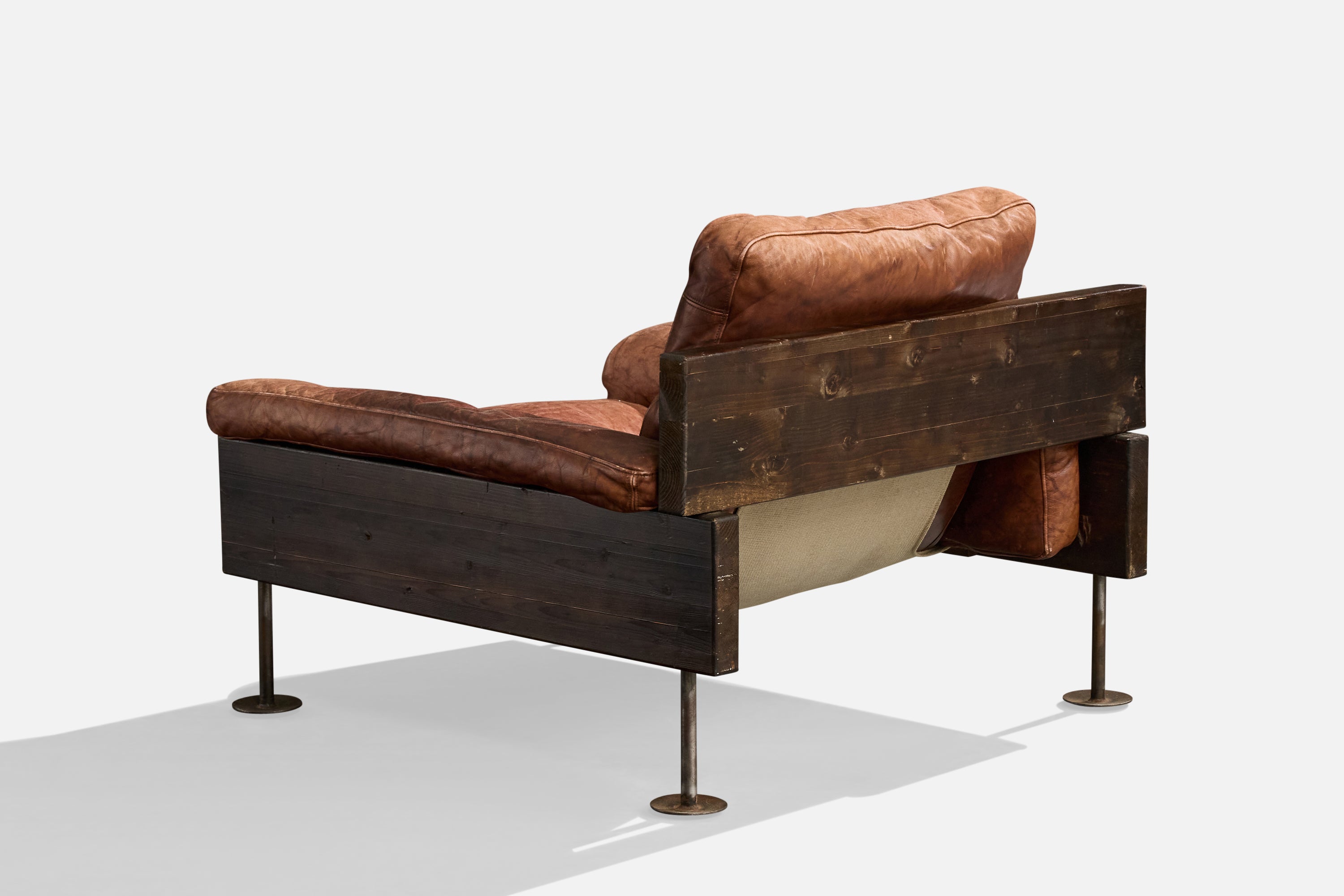 A dark-stained pine, brown leather and patinated metal lounge chair designed by Hannu Jyräs and produced by Peem Oy, Finland, c. 1970s.
