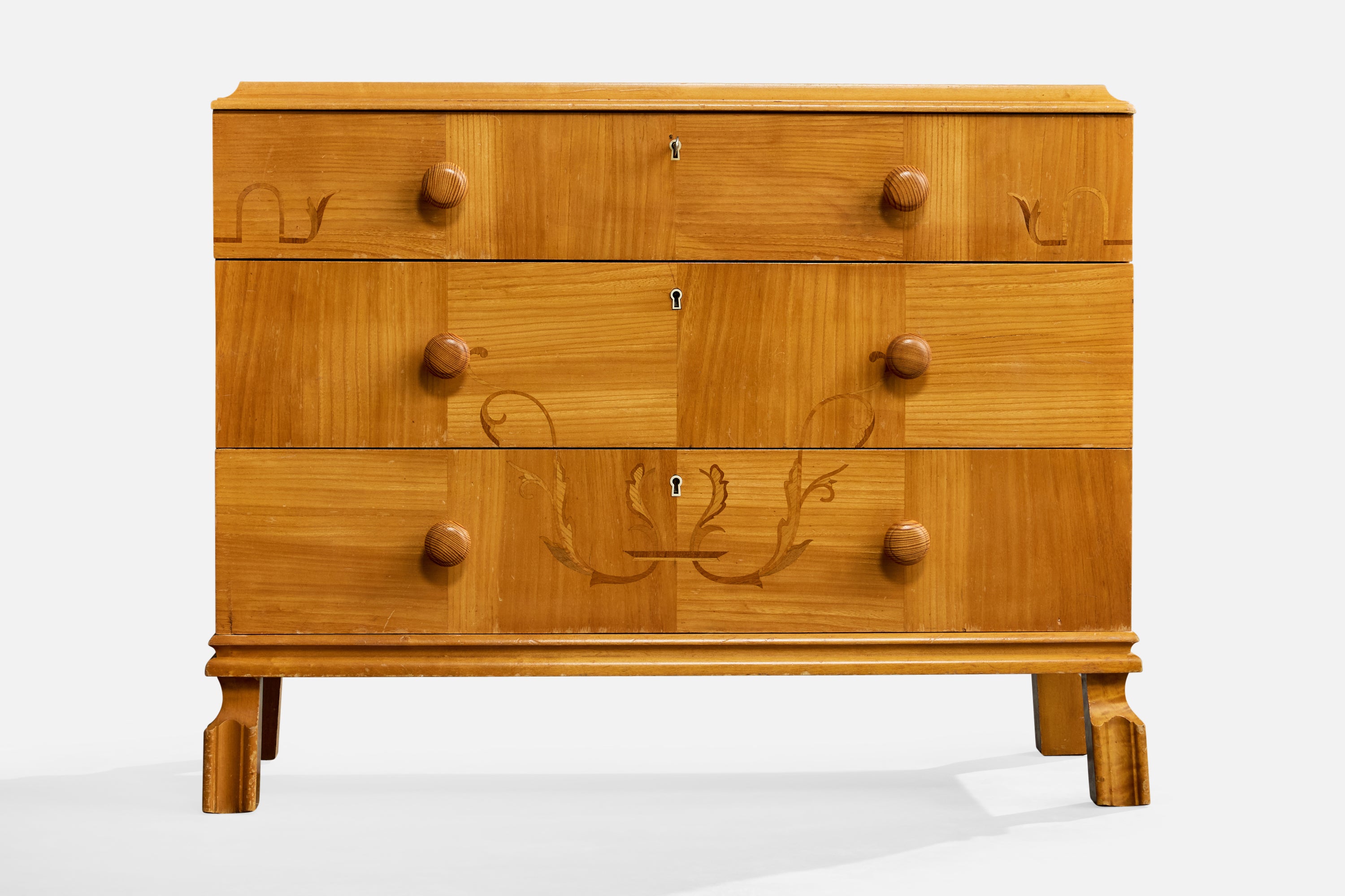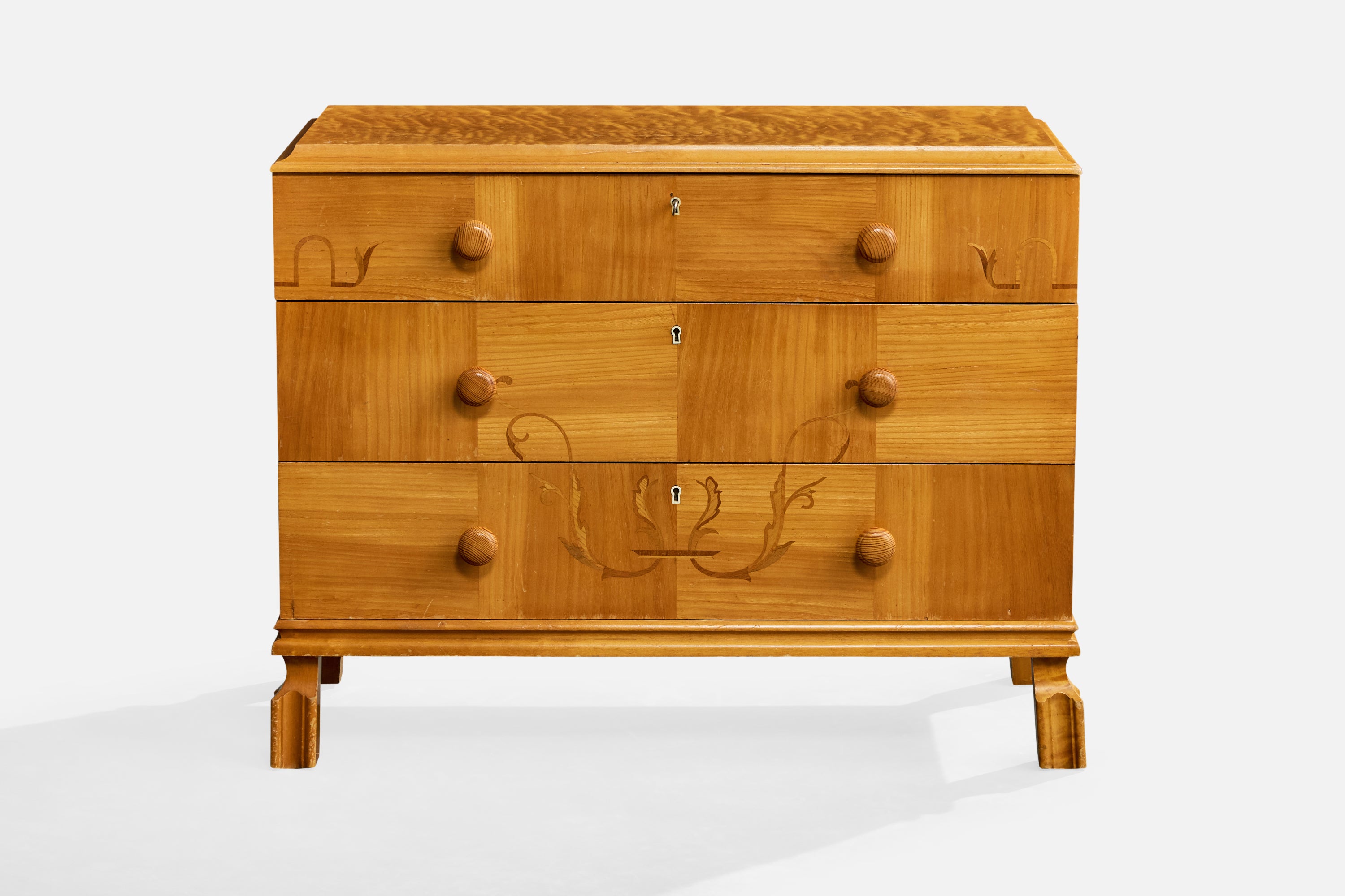A birch and oak chest of drawers with wooden inlays designed and produced in Sweden, c. 1930s.