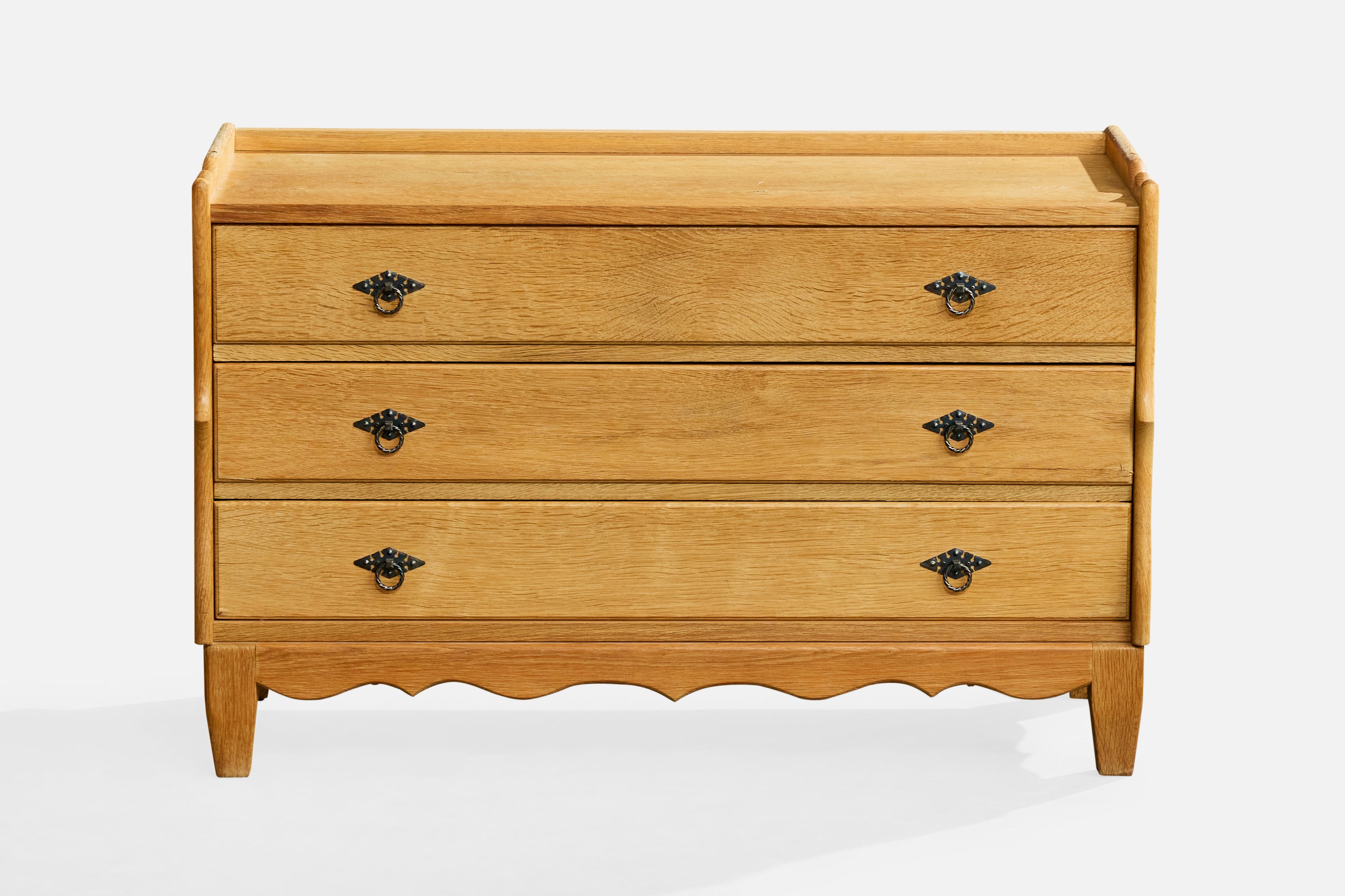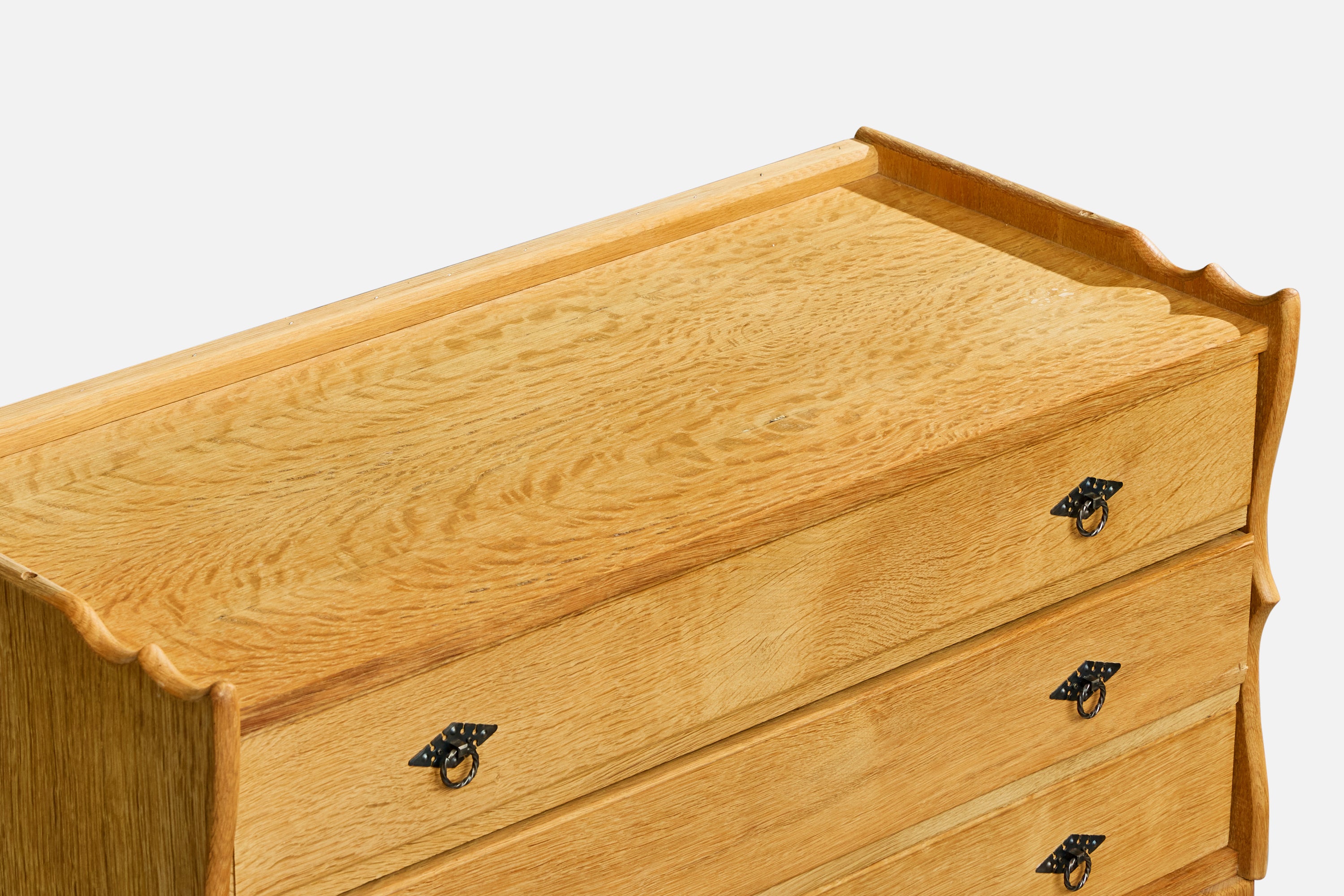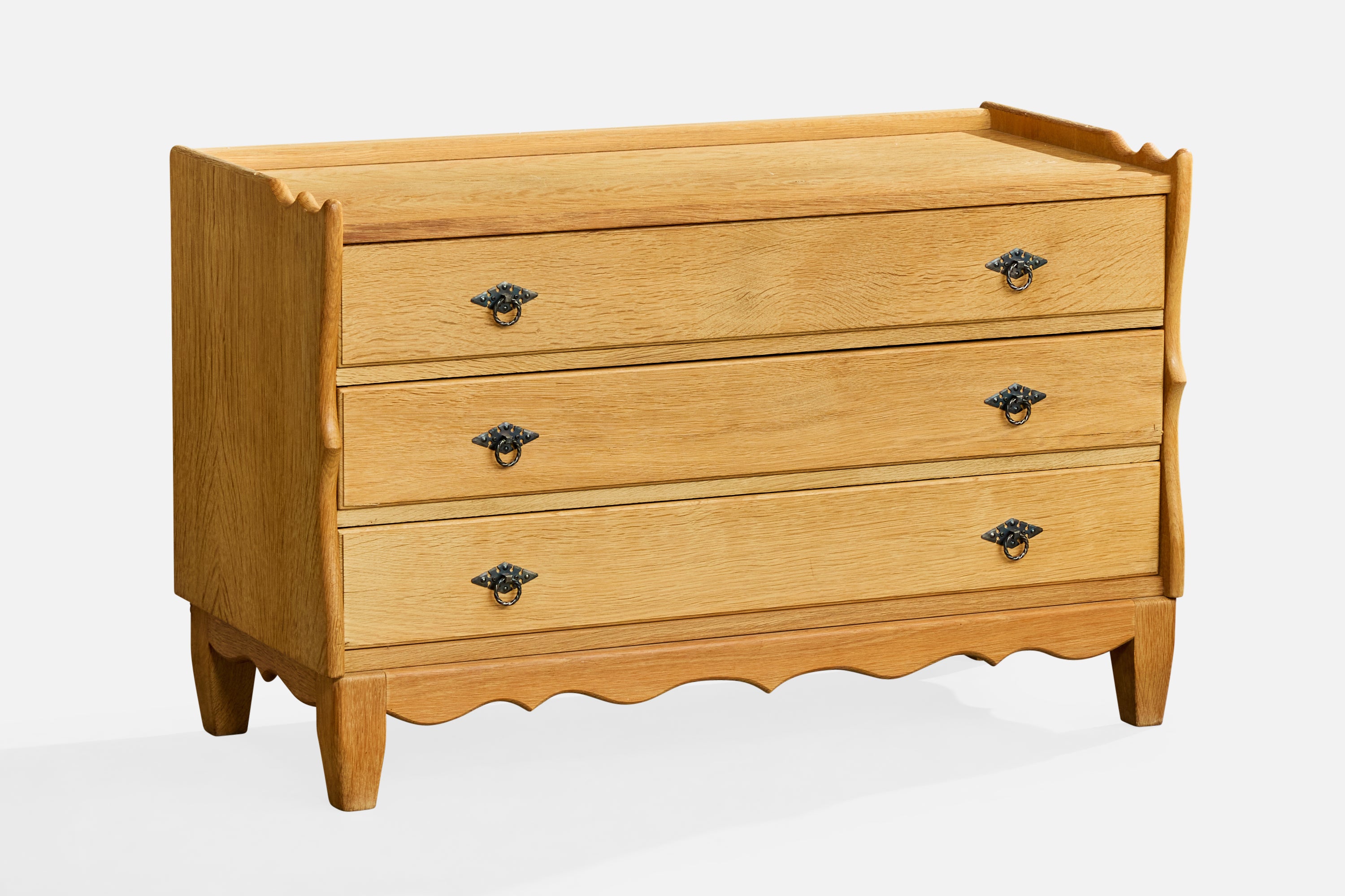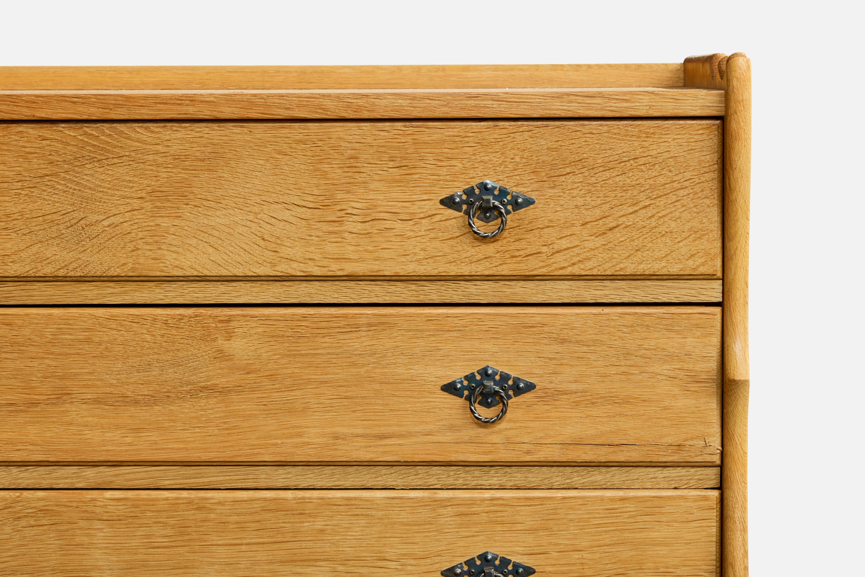 A pair of oak and iron cabinets and a chest of drawers designed and produced in Denmark, c. 1960s.