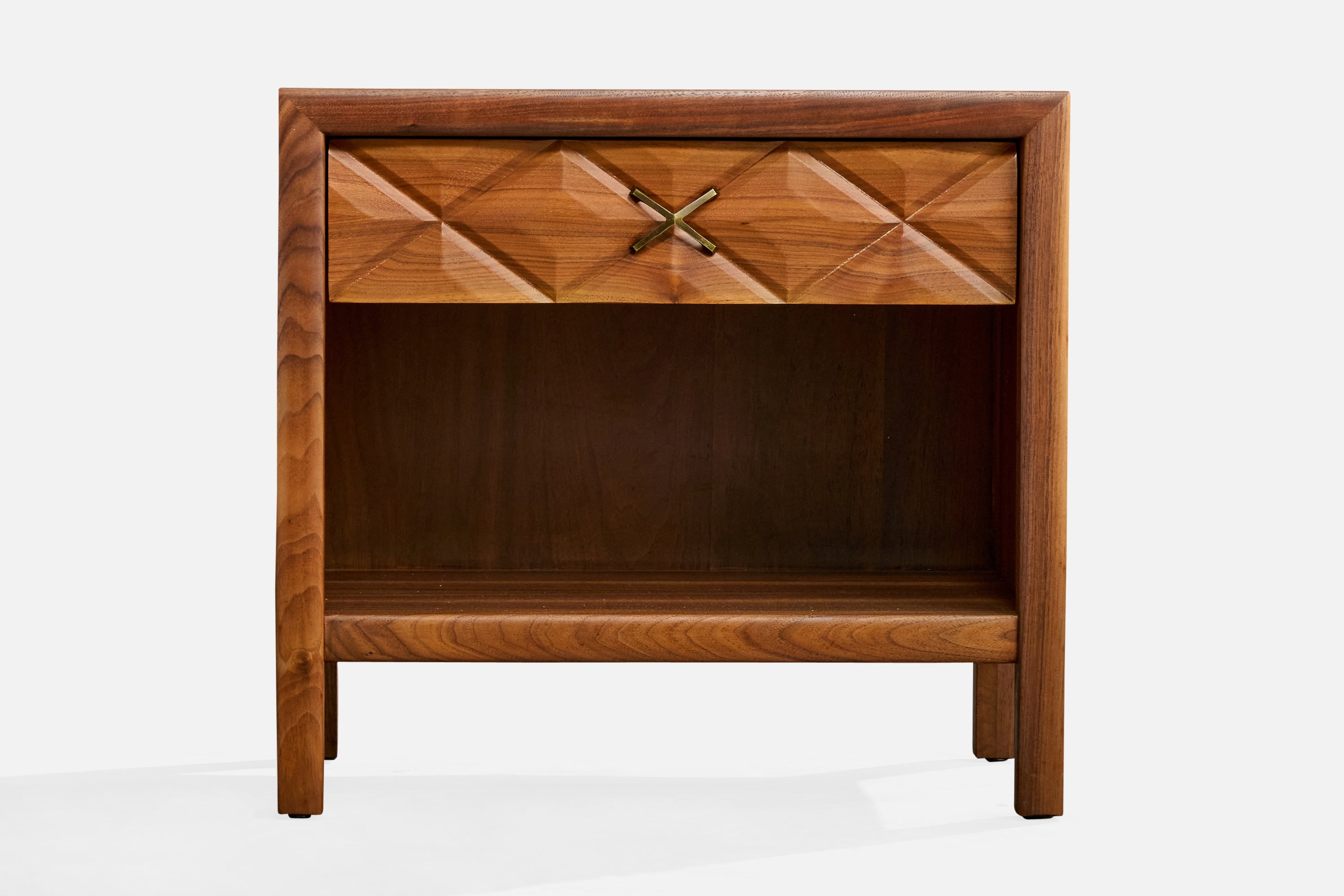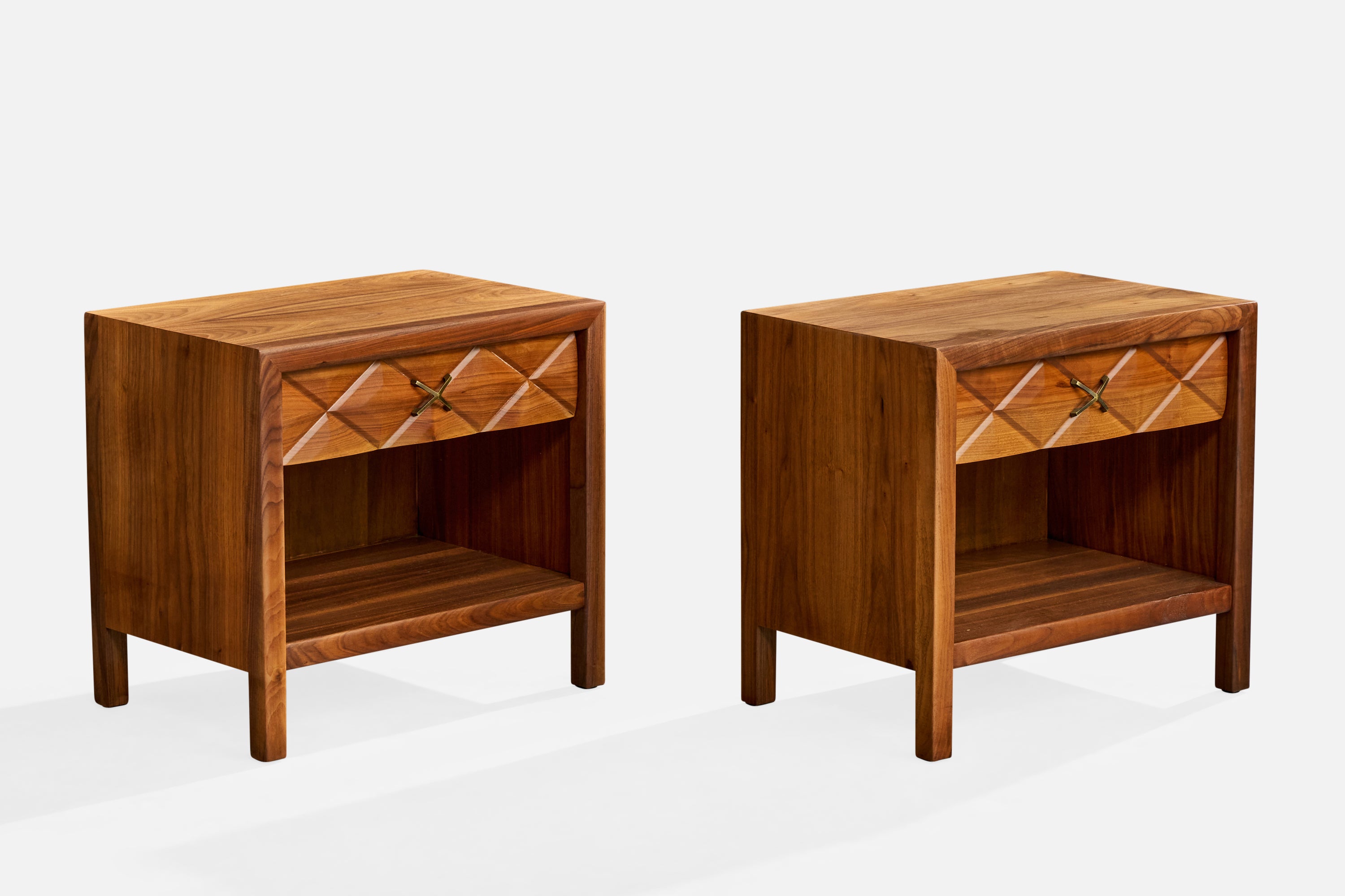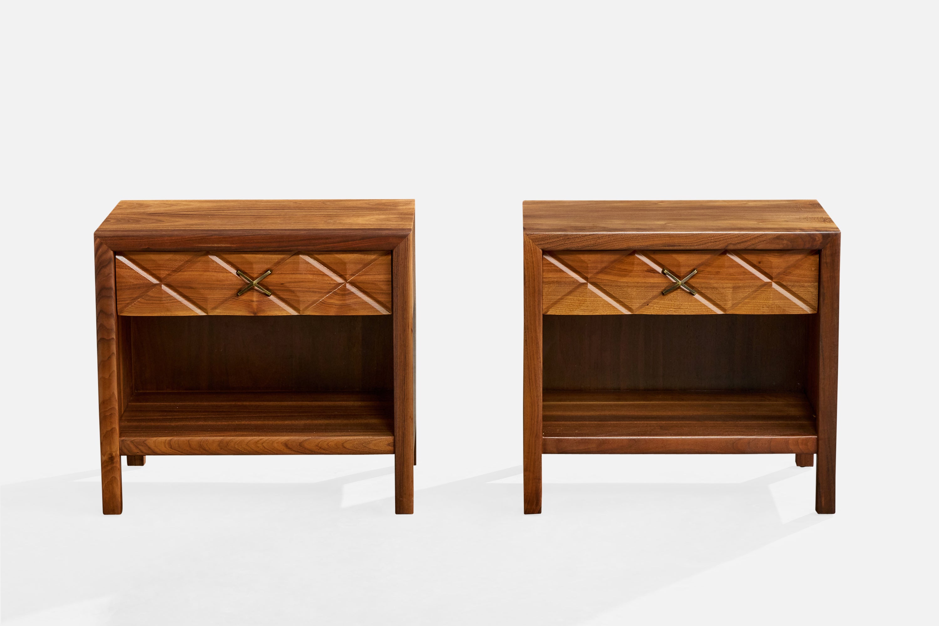 A pair of walnut and brass nightstands designed and produced by Widdicomb, Grand Rapids, Michigan, USA, 1950s.