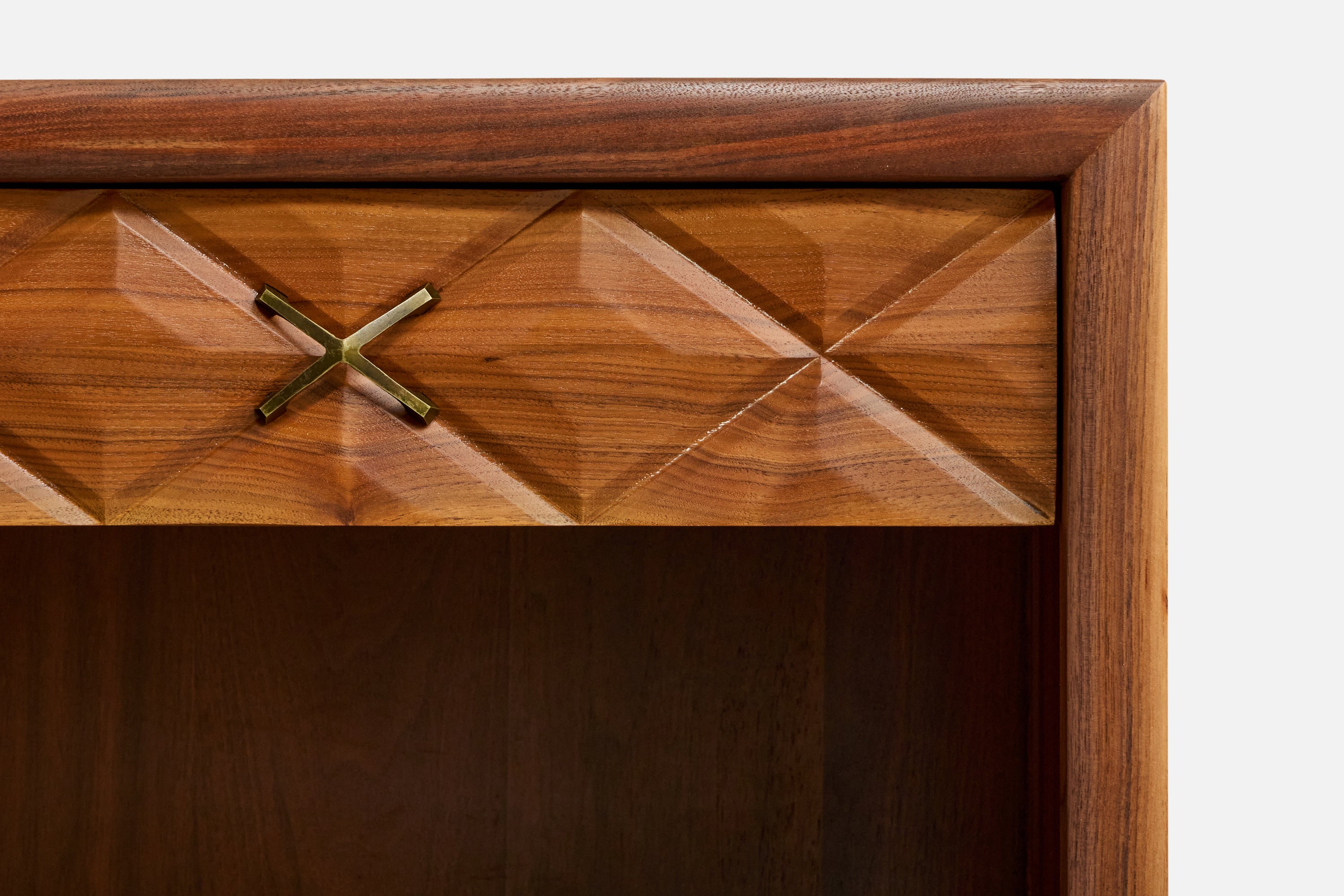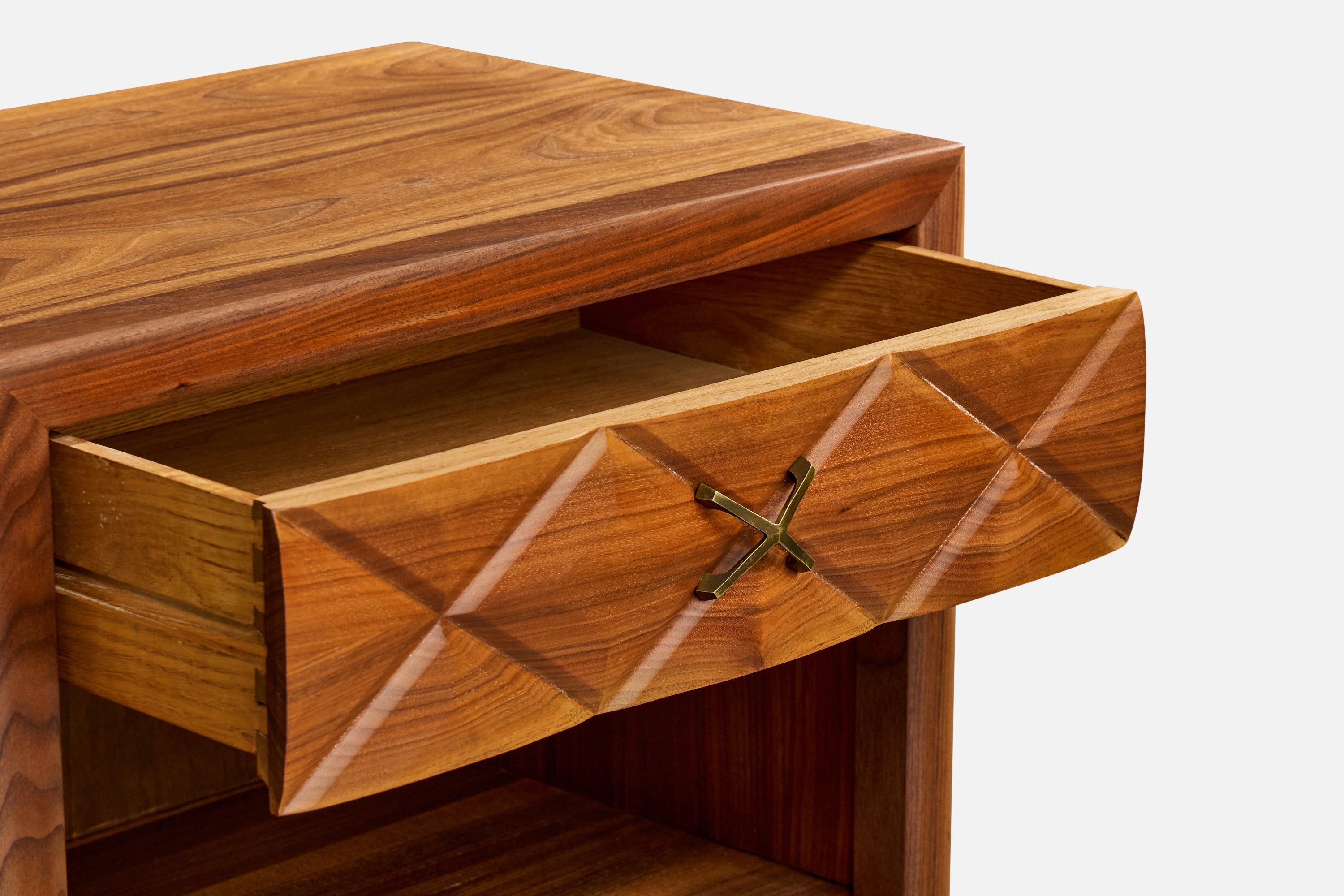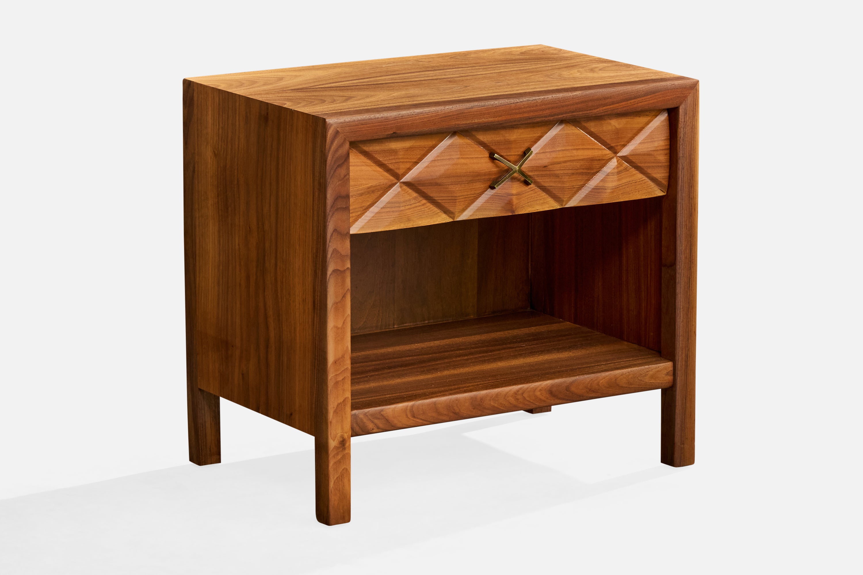 A pair of walnut and brass nightstands designed and produced by Widdicomb, Grand Rapids, Michigan, USA, 1950s.