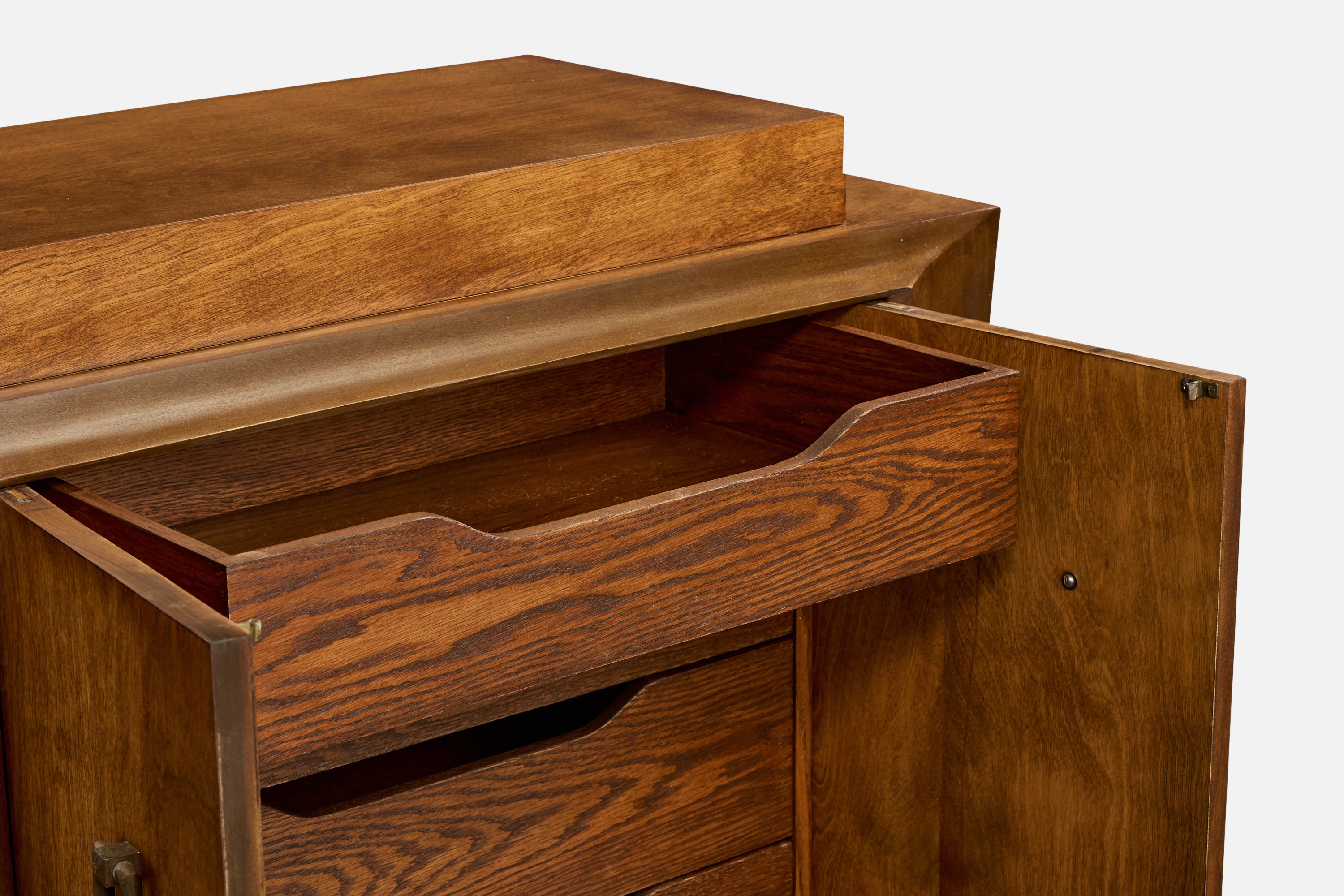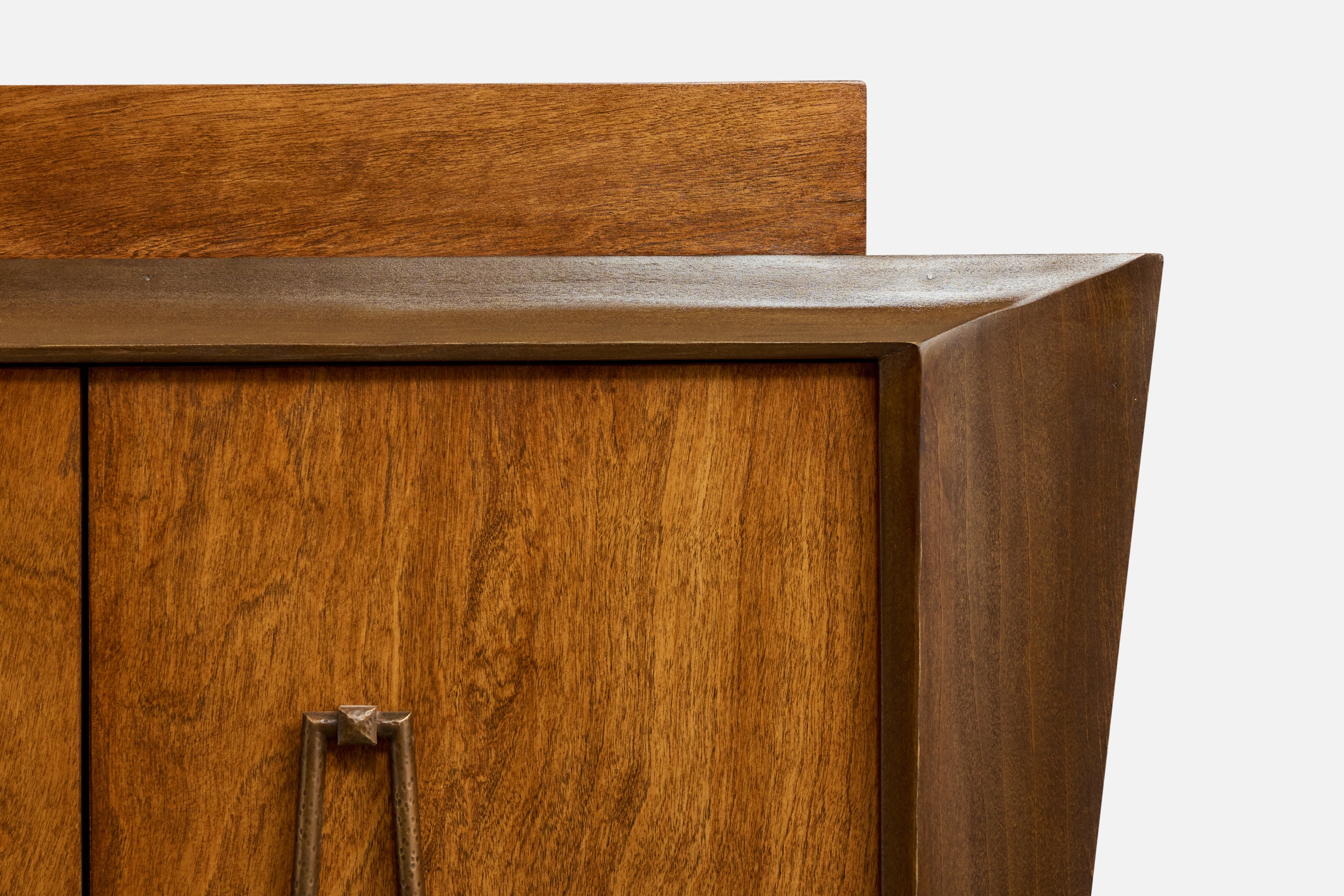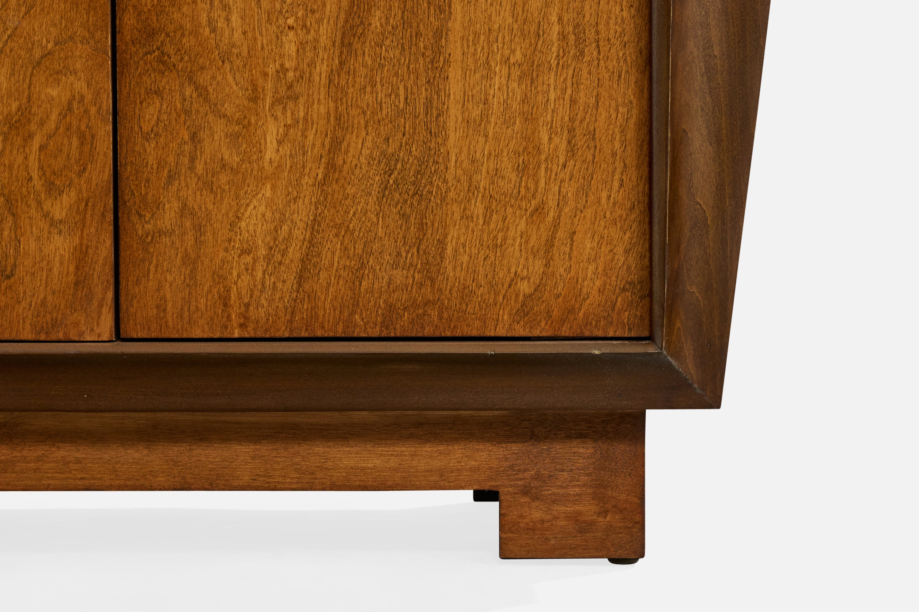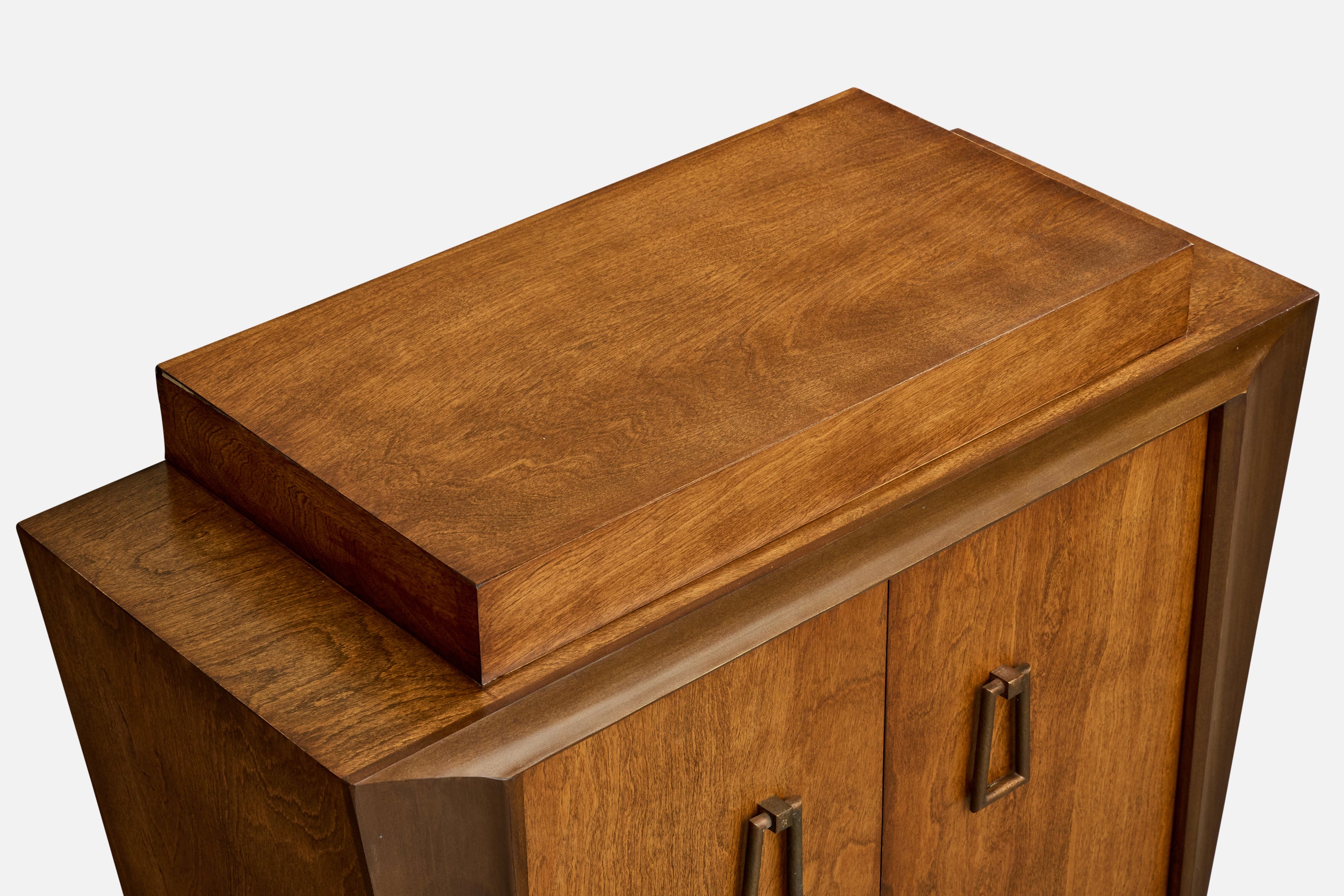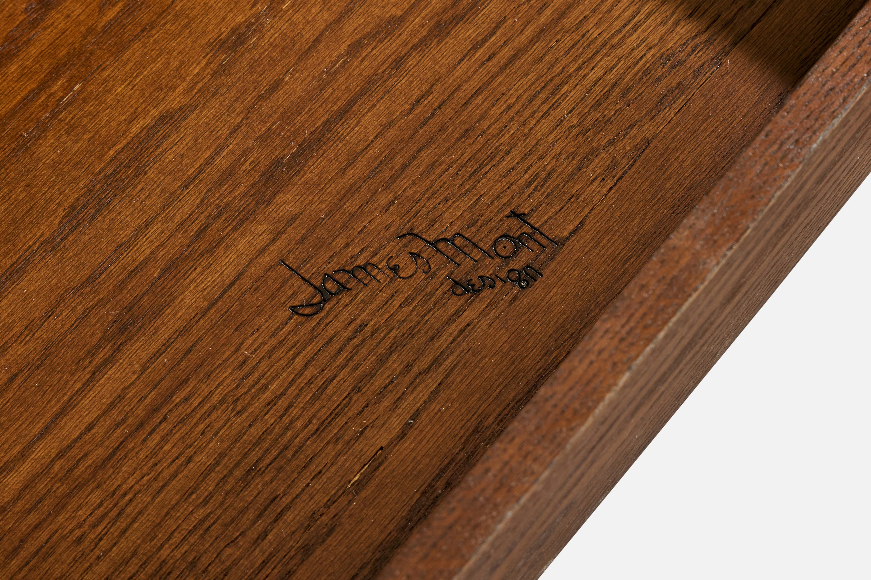 Found engraving “James Mont design” inside cabinet door and top drawer on one cabinet; four drawers. Other cabinet has no drawers or shelving inside.