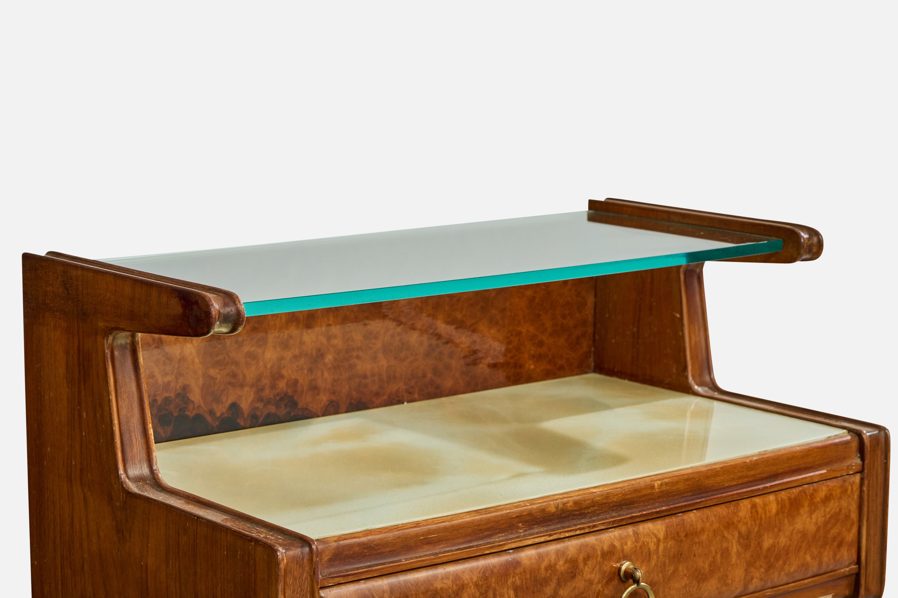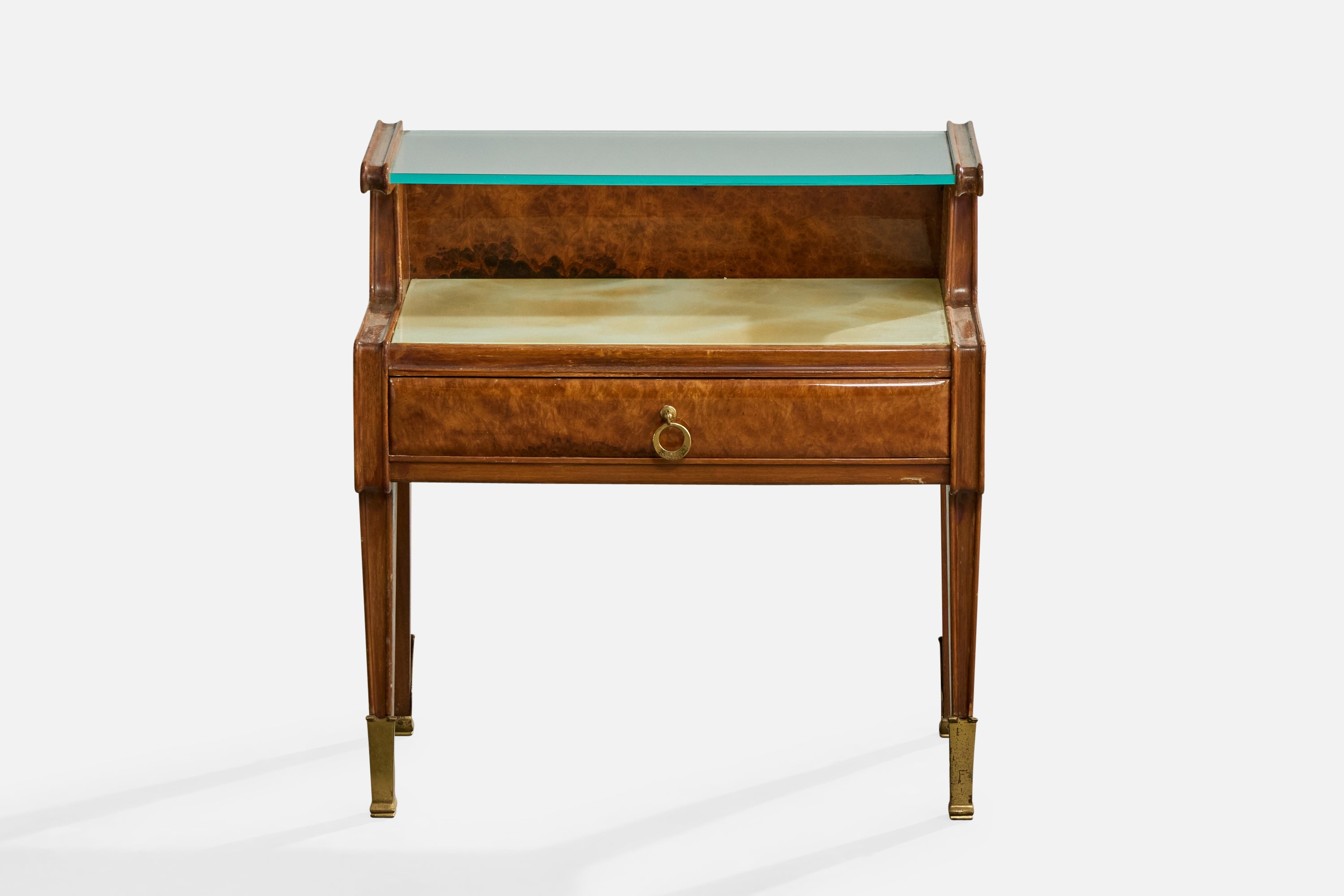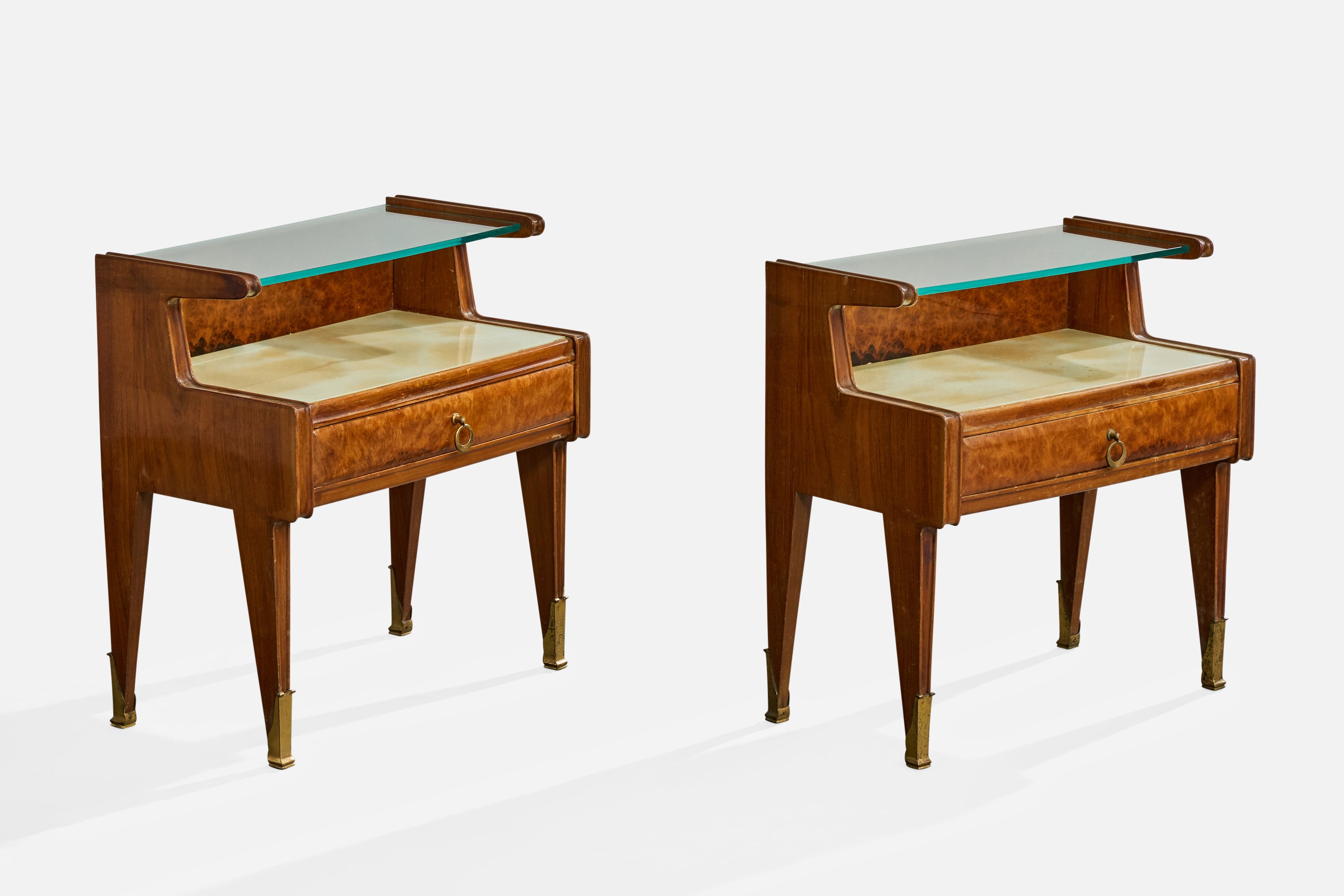 A pair of wood, glass, brass and onyx or onyx colored glass nightstands produced by Dassi, Italy, c. 1950s.