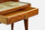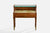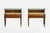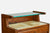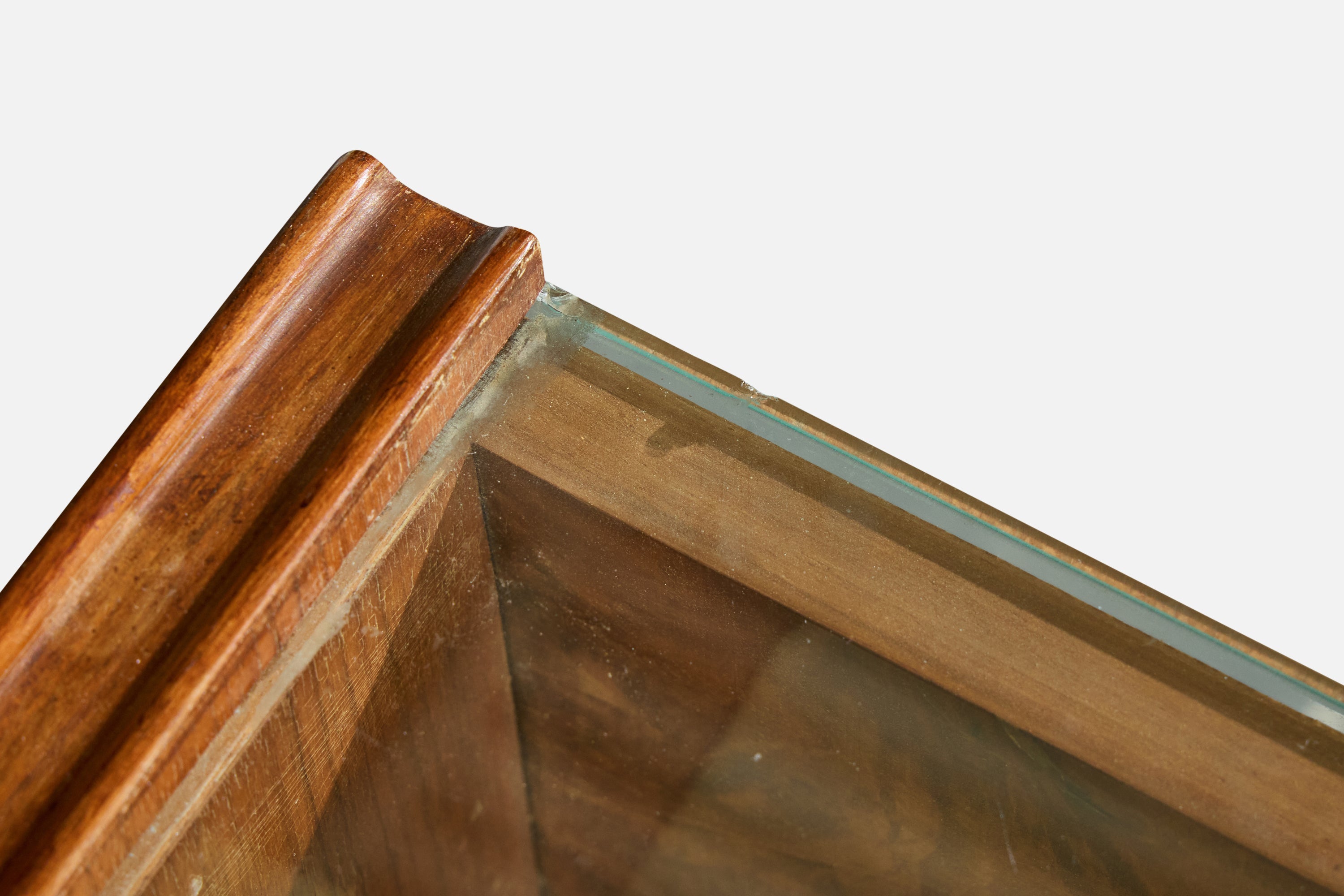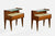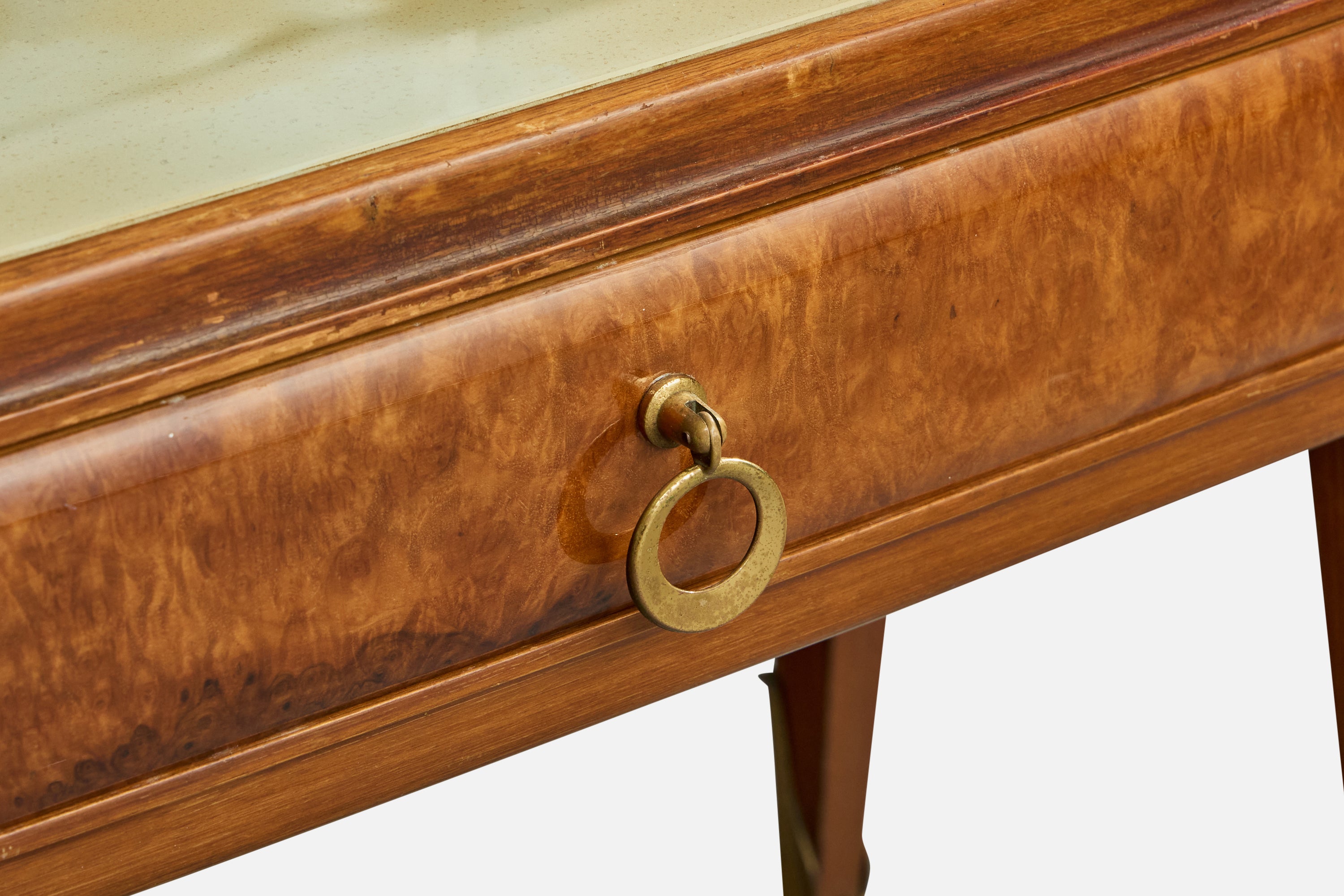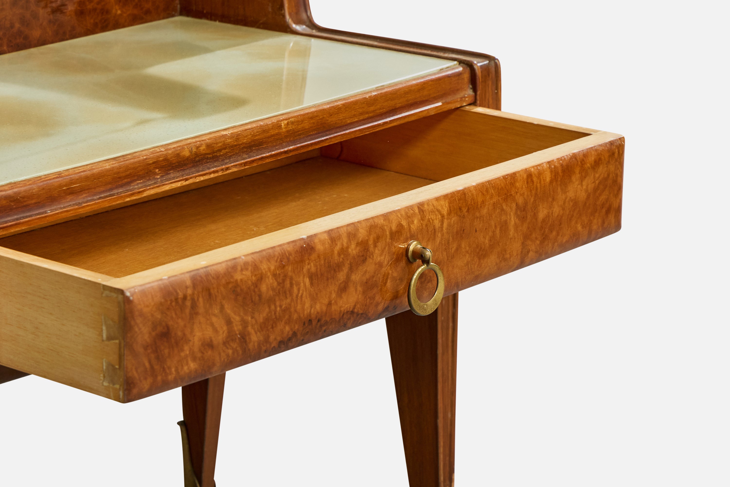 One has moderate wear inside drawer and chips in glass top shelf. Other has mild wear inside drawer and natural wood cracking to top shelf. Mild to moderate imperfections throughout wood and glass. Patina brass feet and drawer pulls.