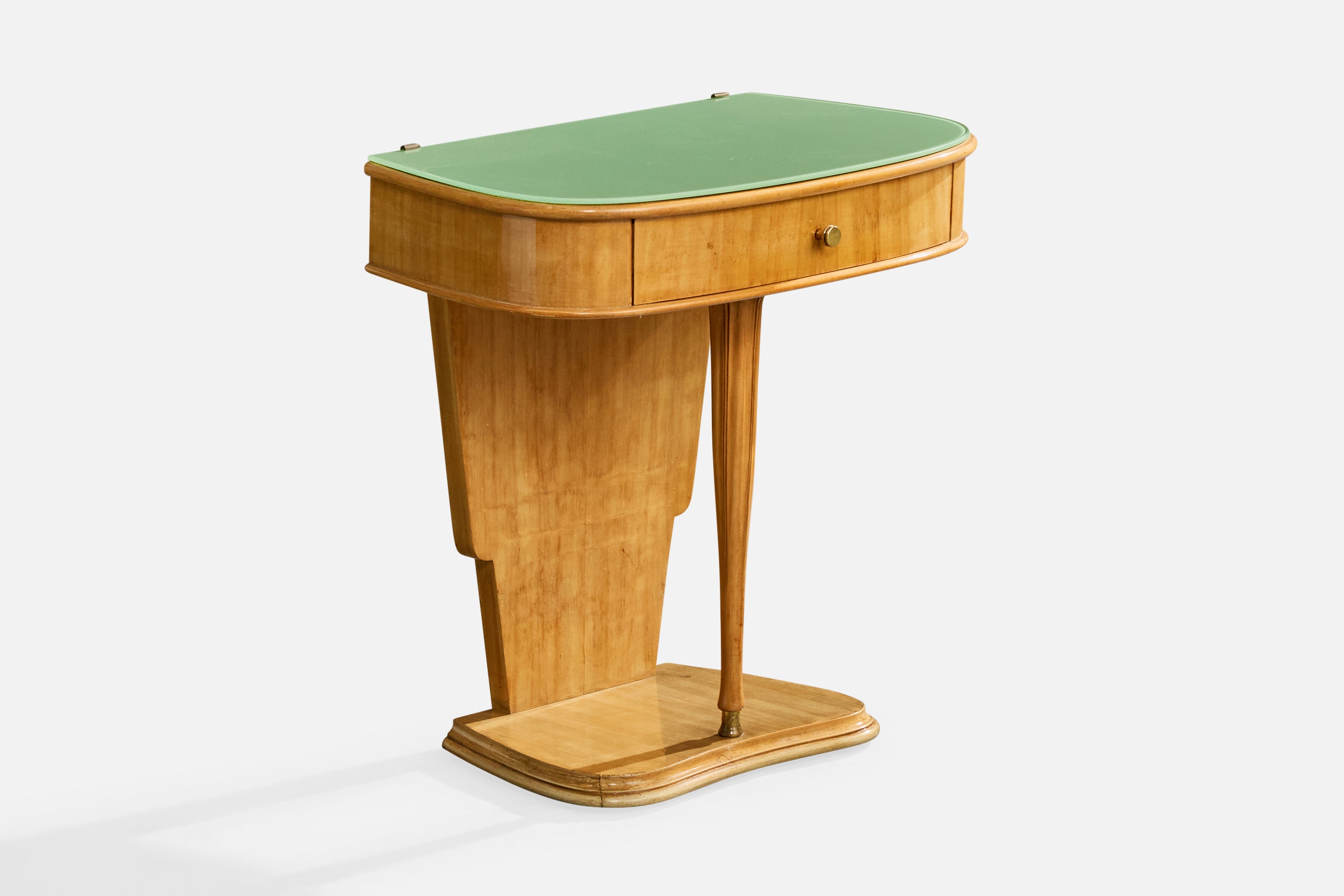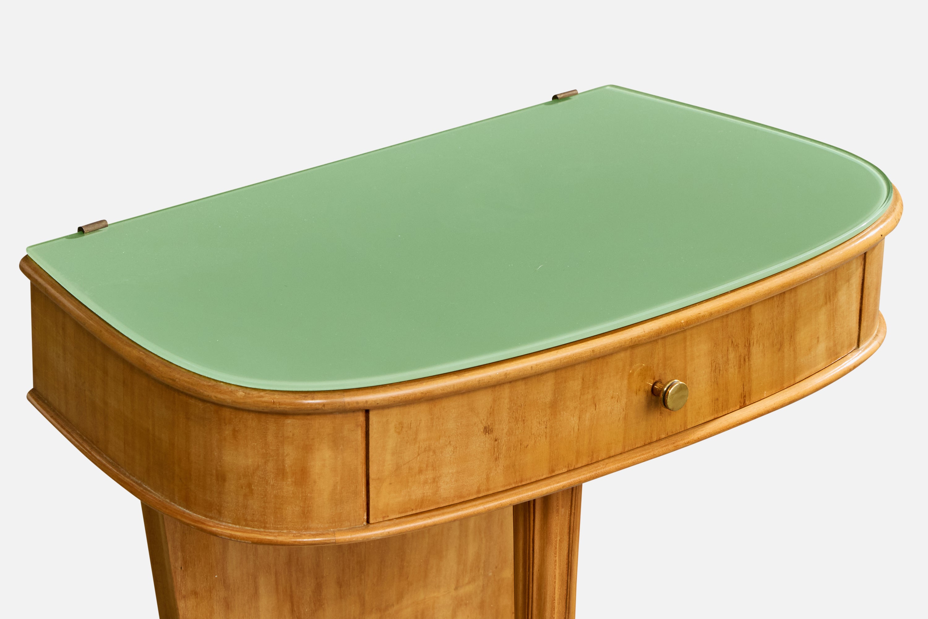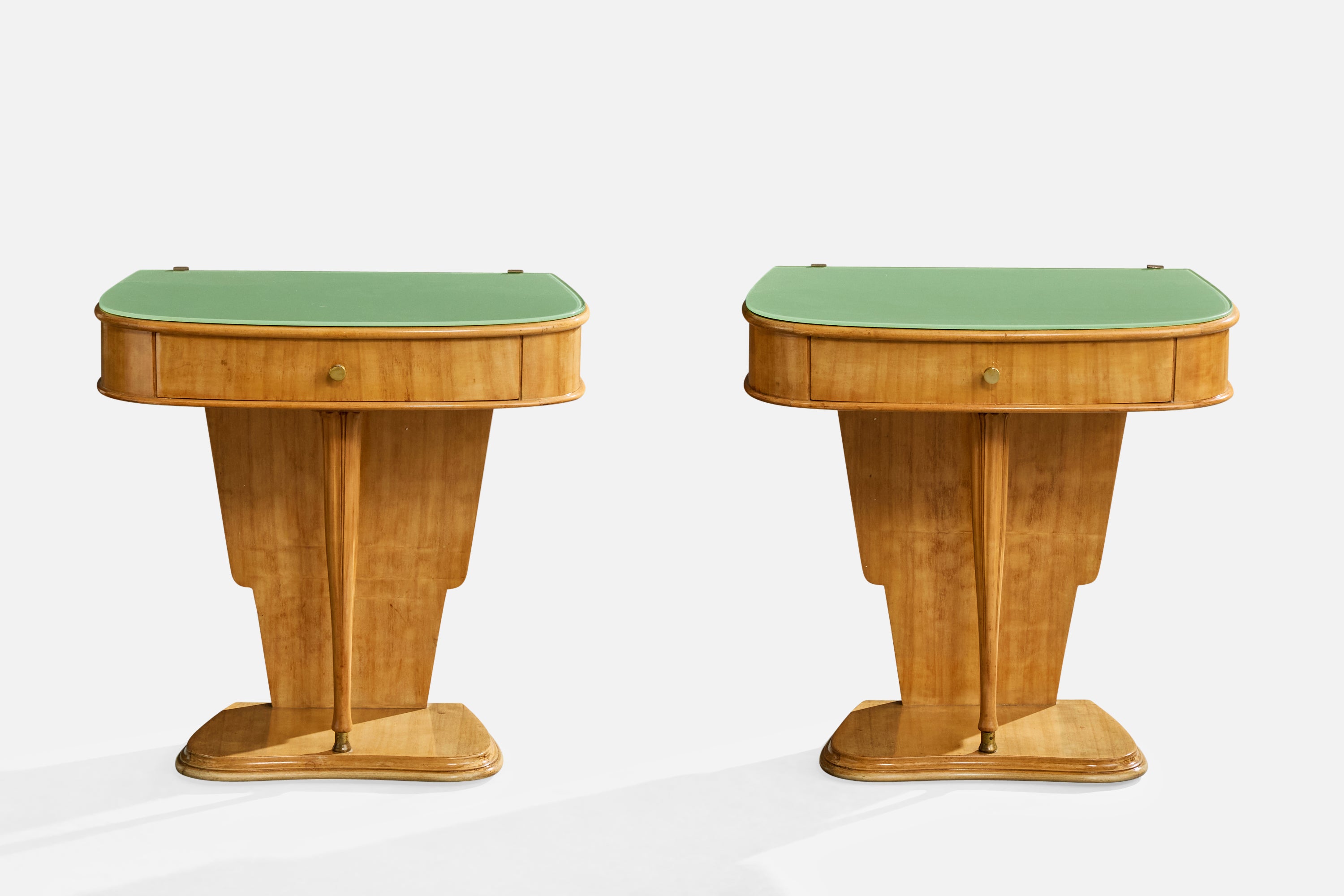 A pair of wood, brass and green-colored glass nightstands designed and produced in Italy, c. 1950s.