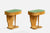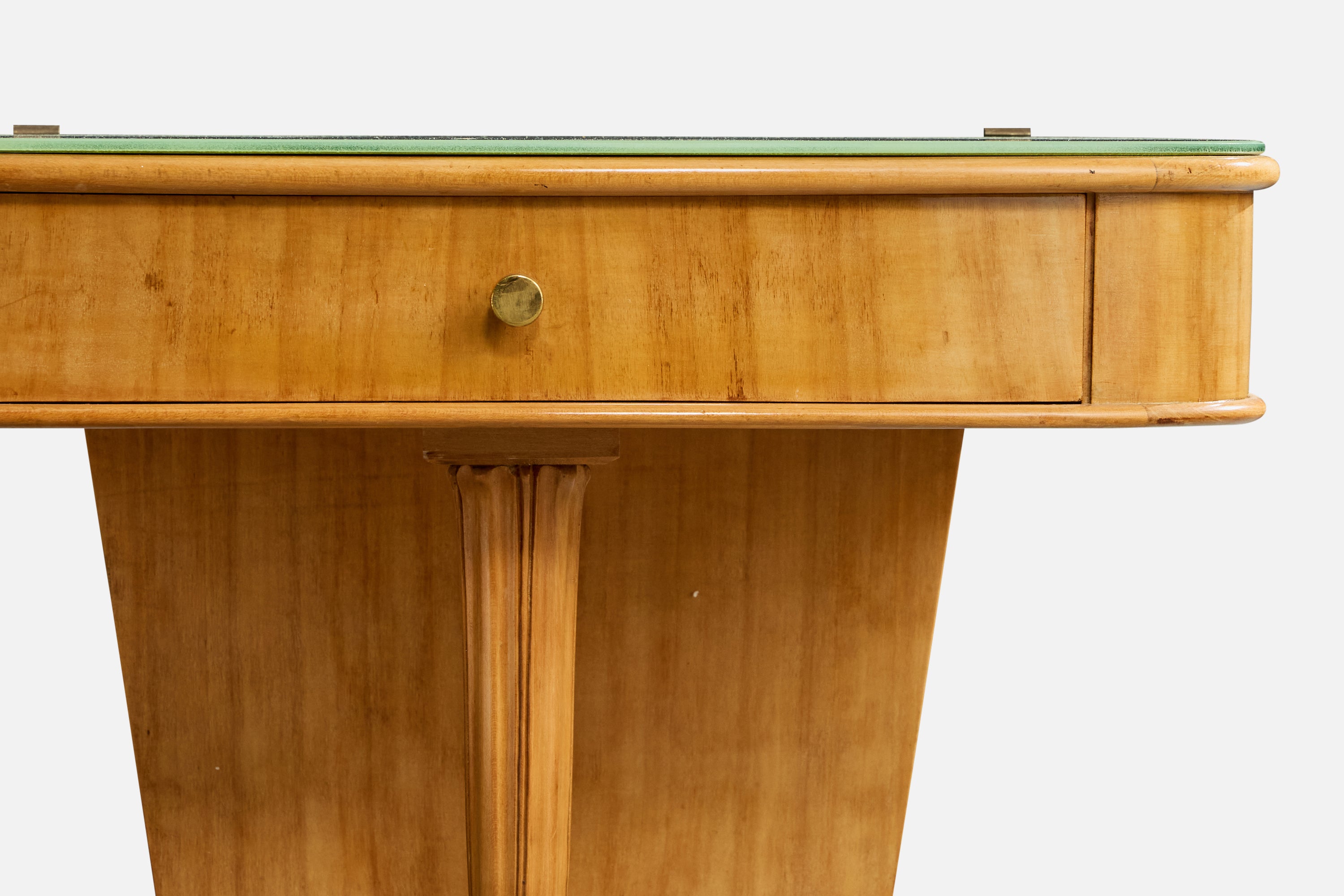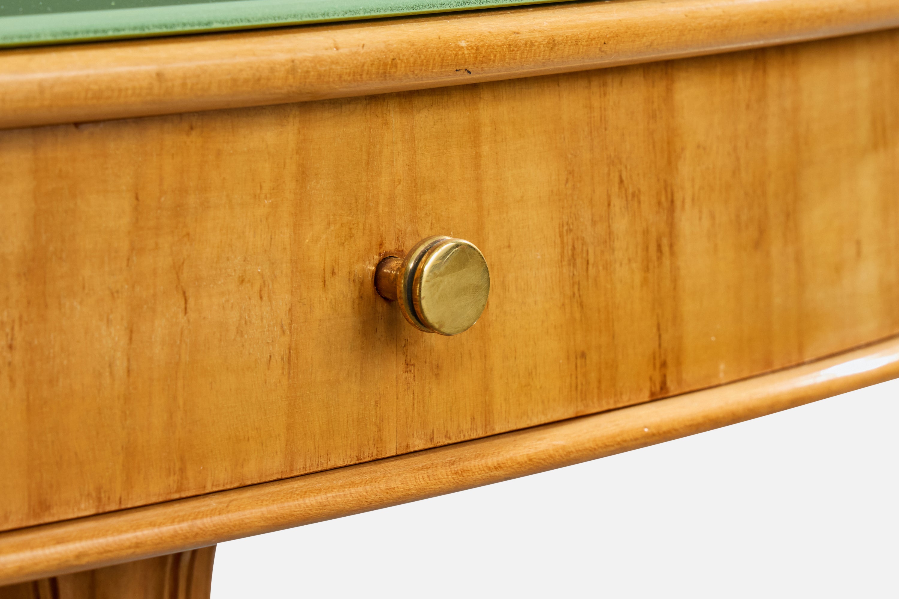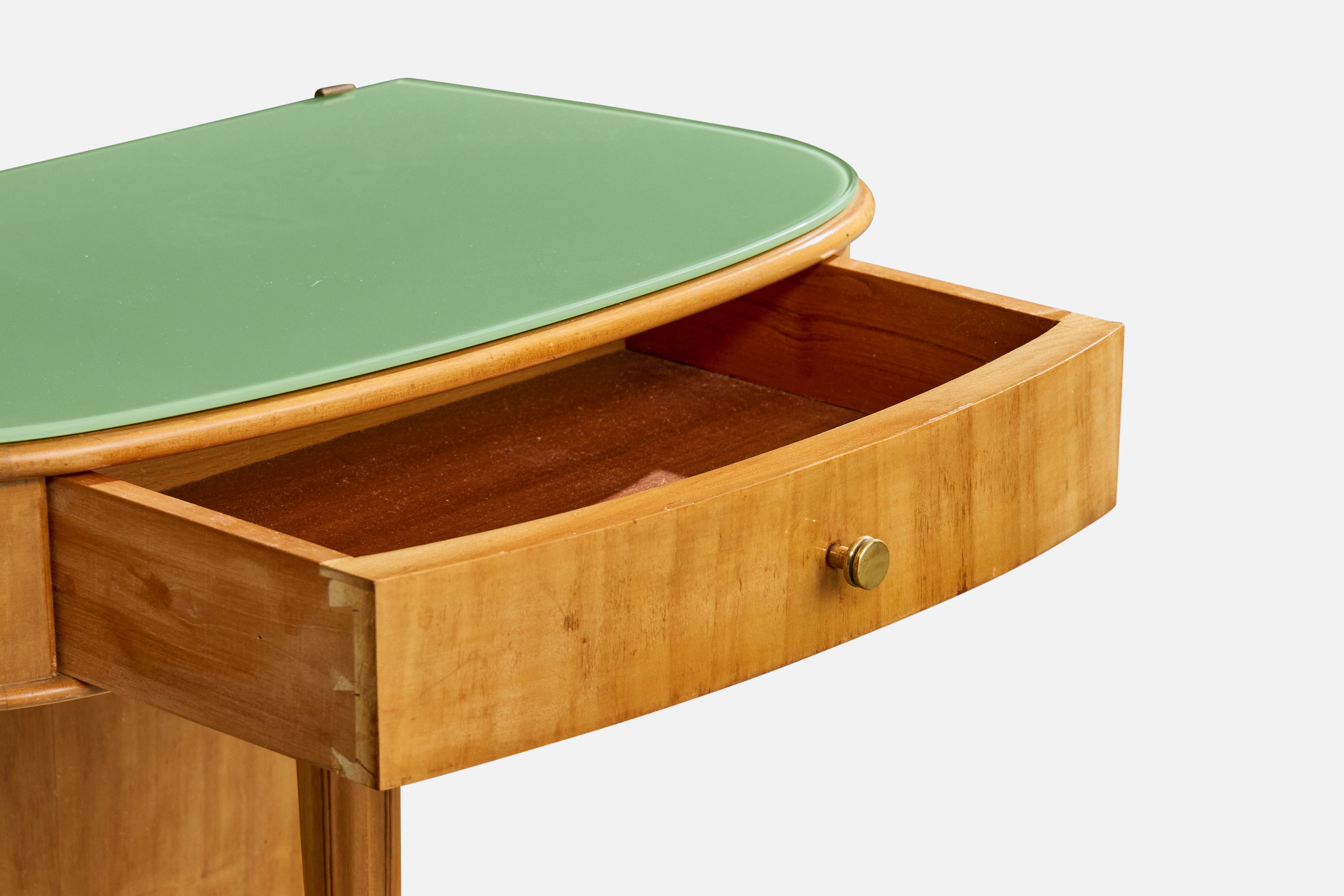 A pair of wood, brass and green-colored glass nightstands designed and produced in Italy, c. 1950s.