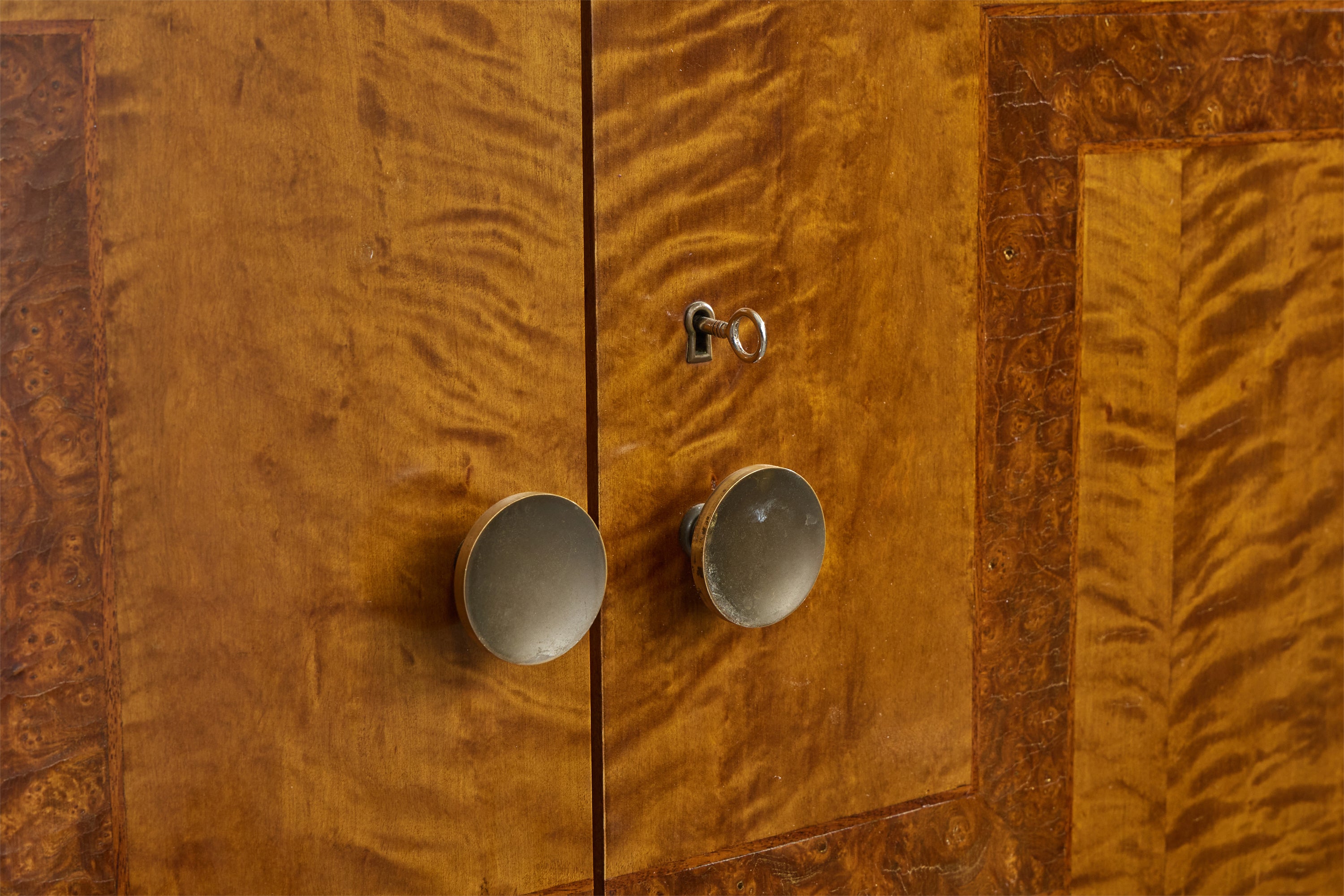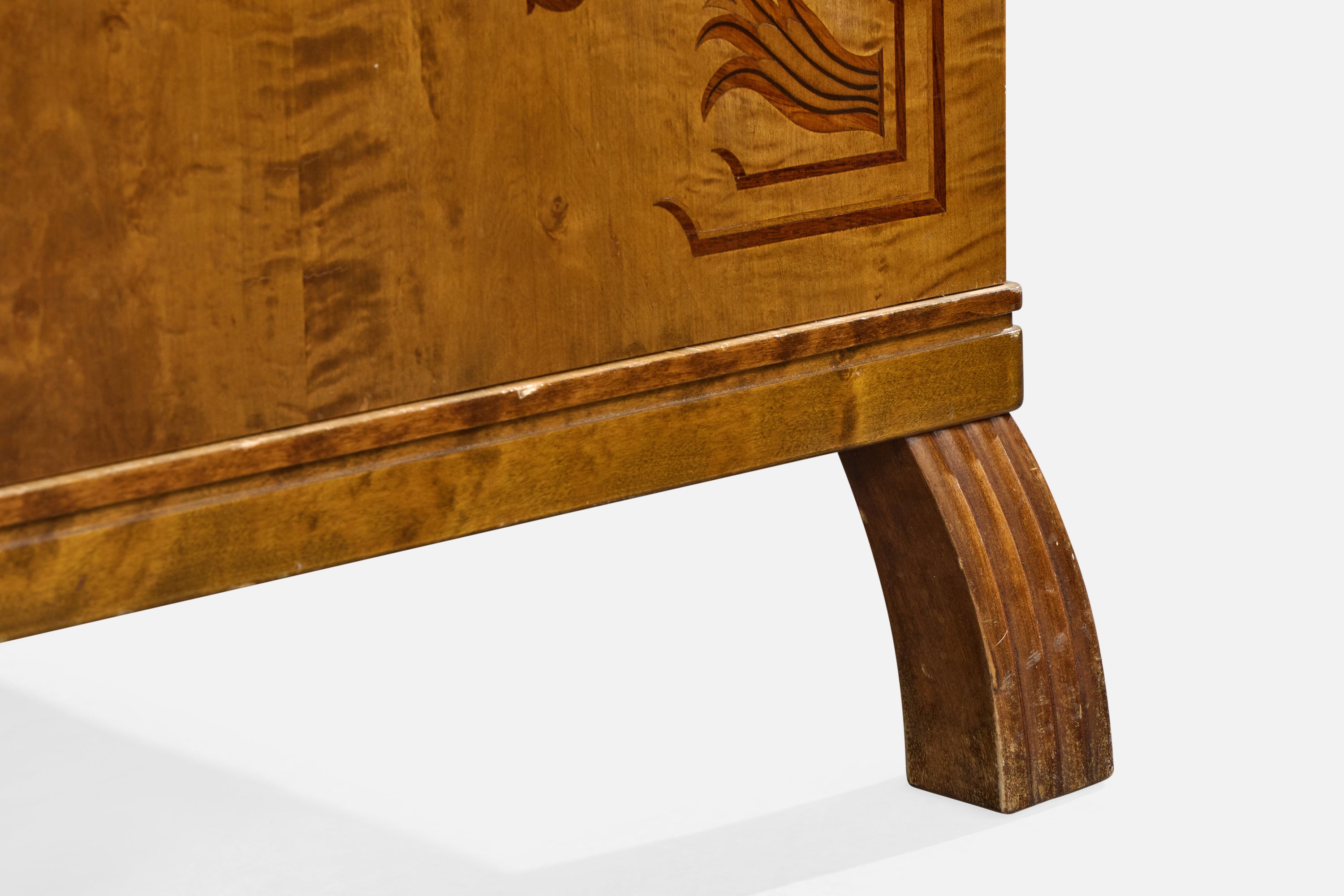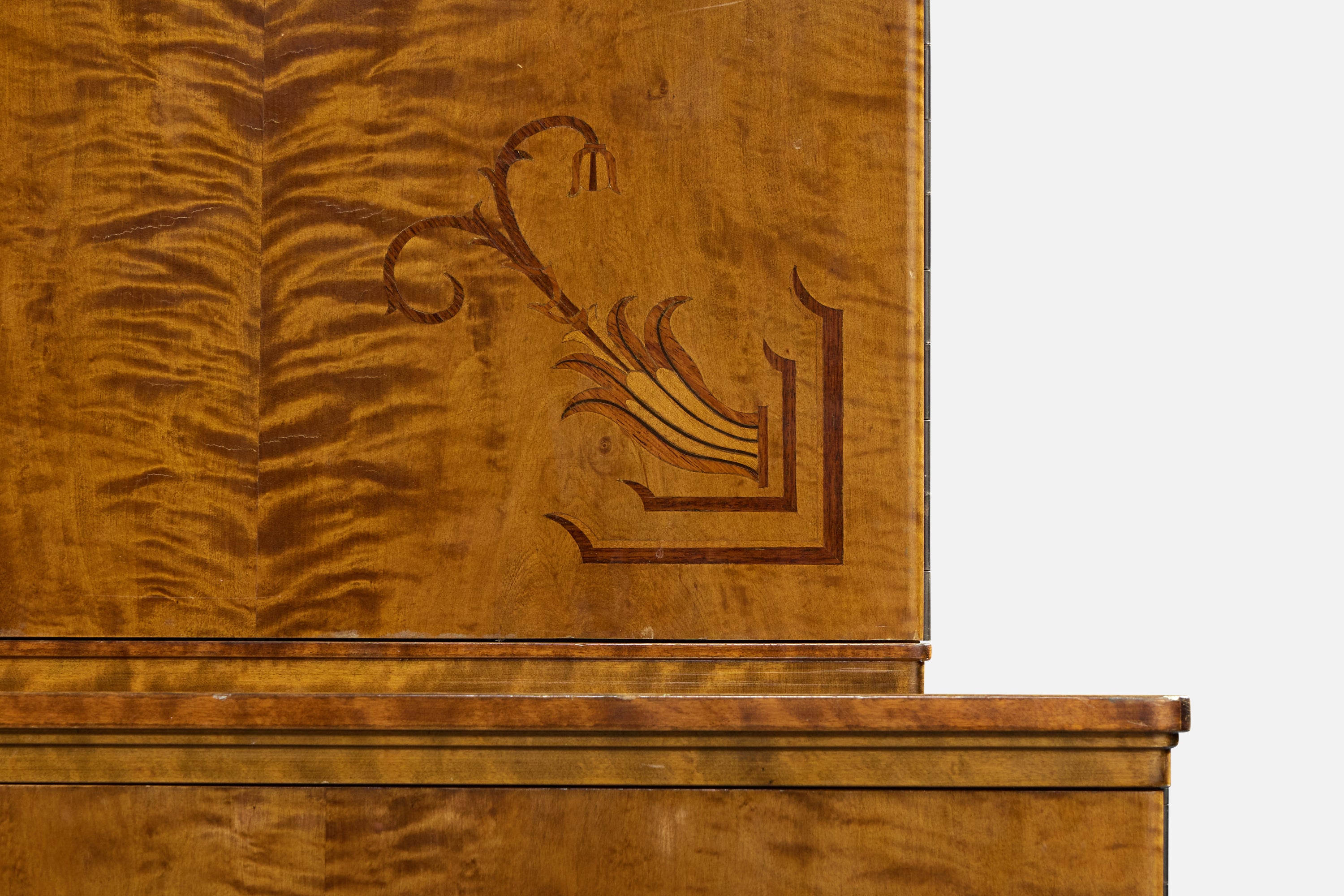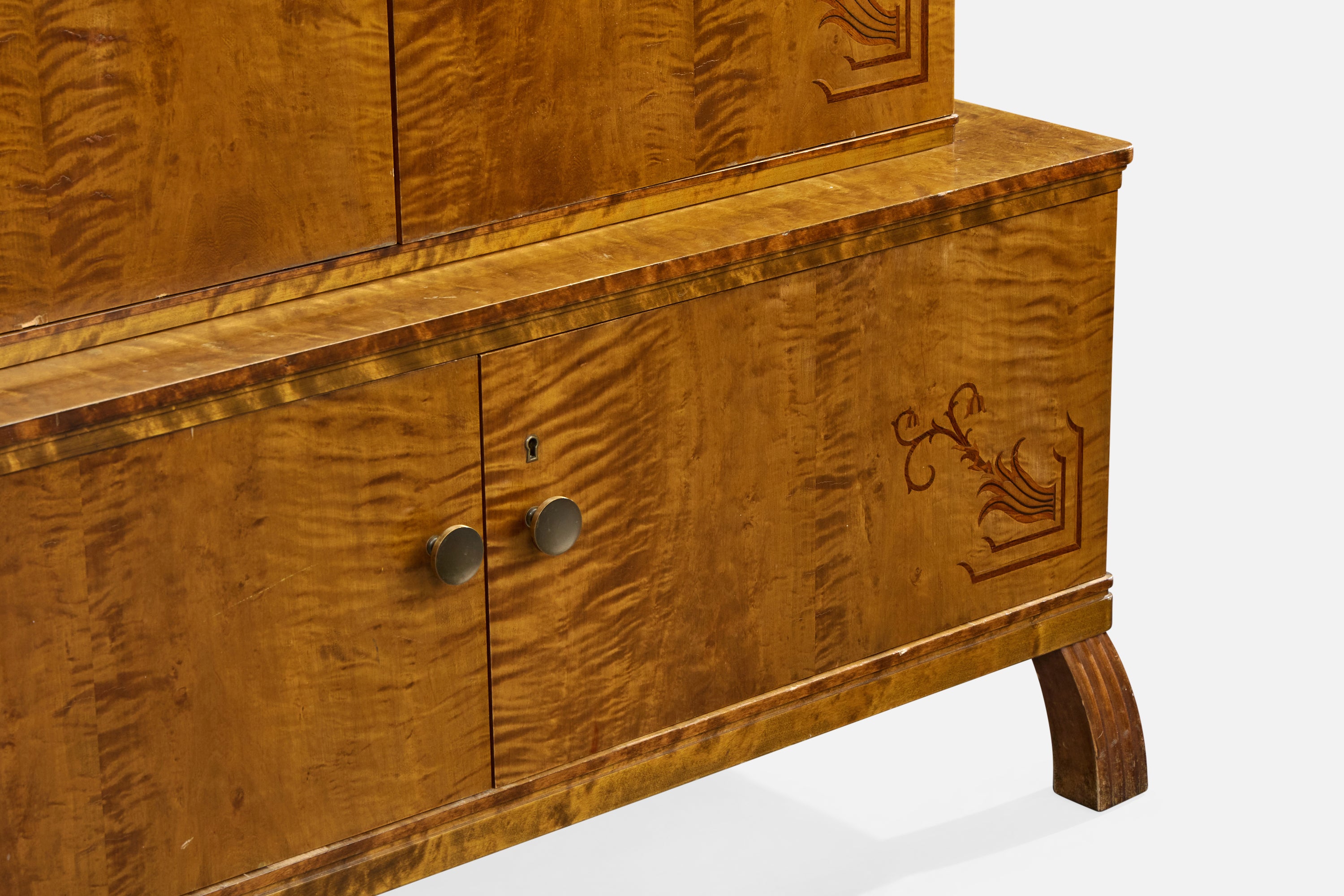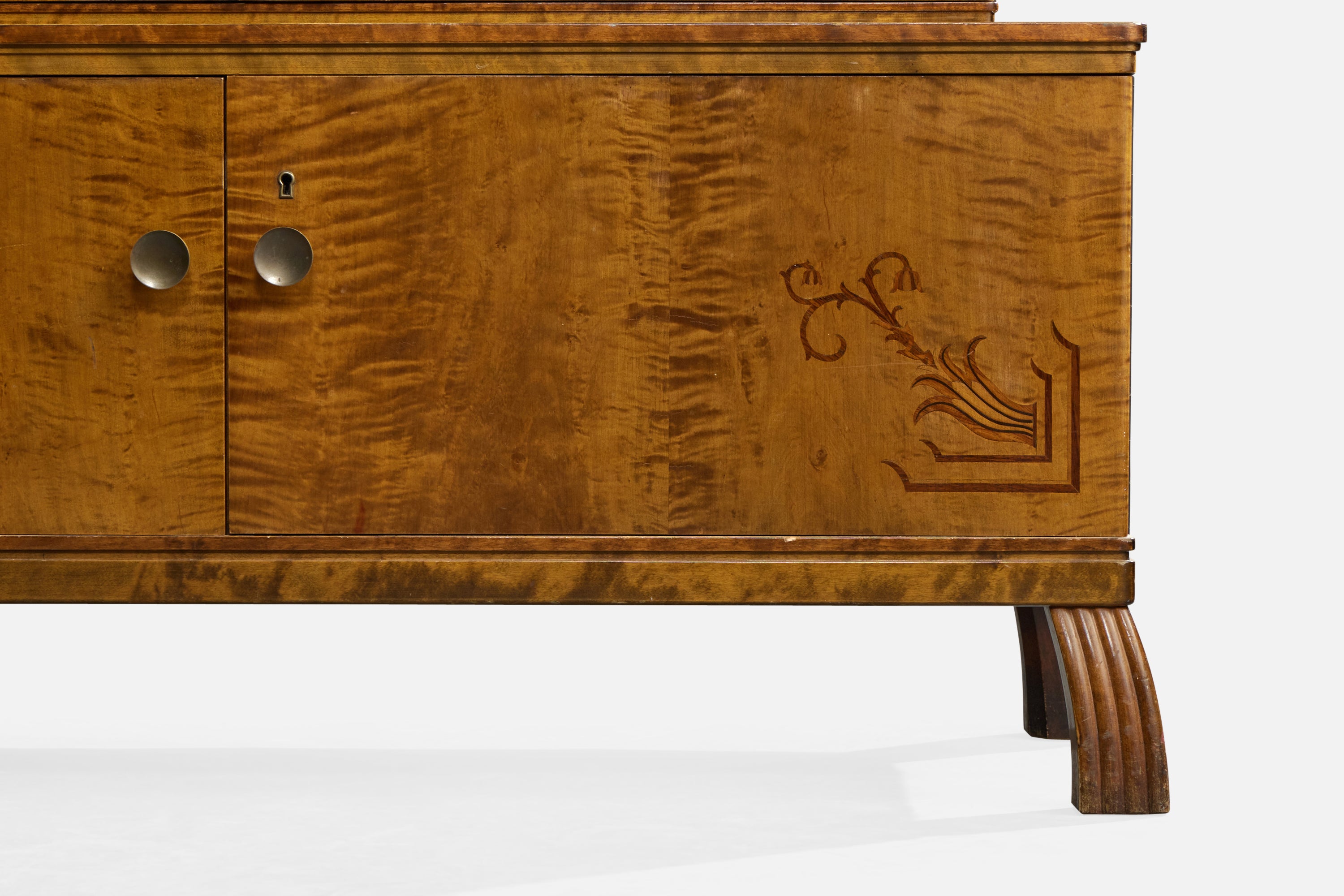 A birch, burl wood, wood inlay and brass cabinet designed and produced in Sweden, c. 1930s.