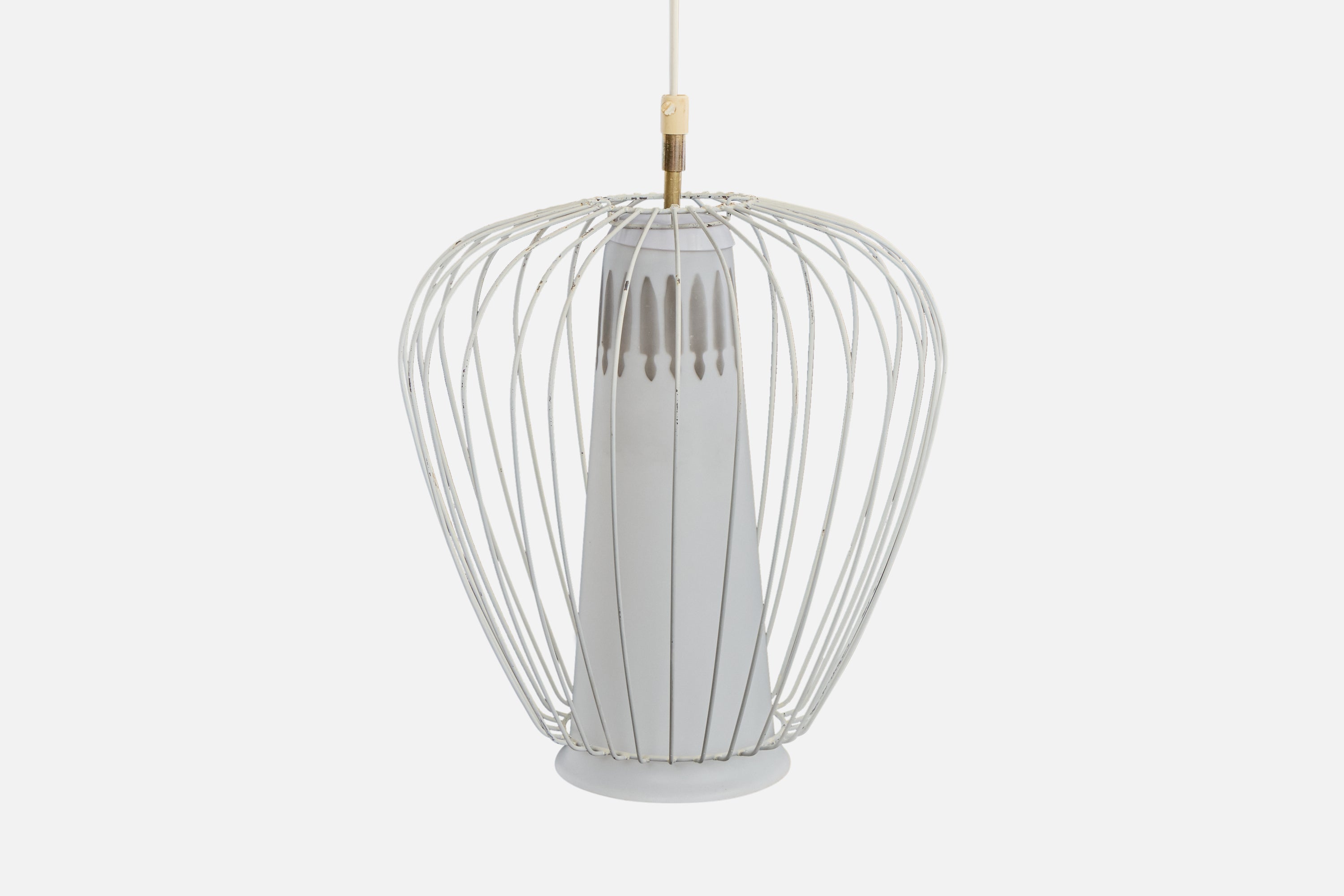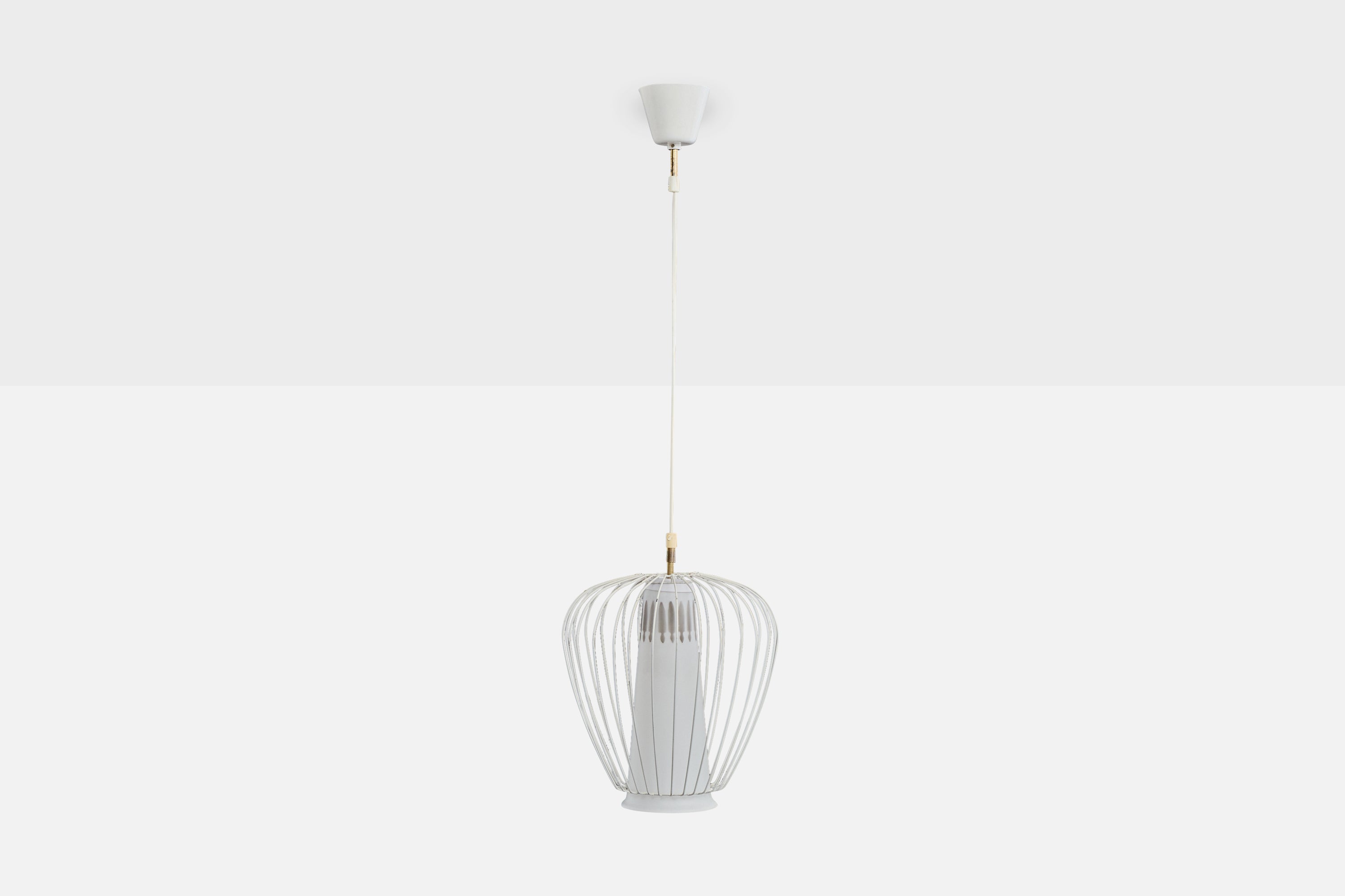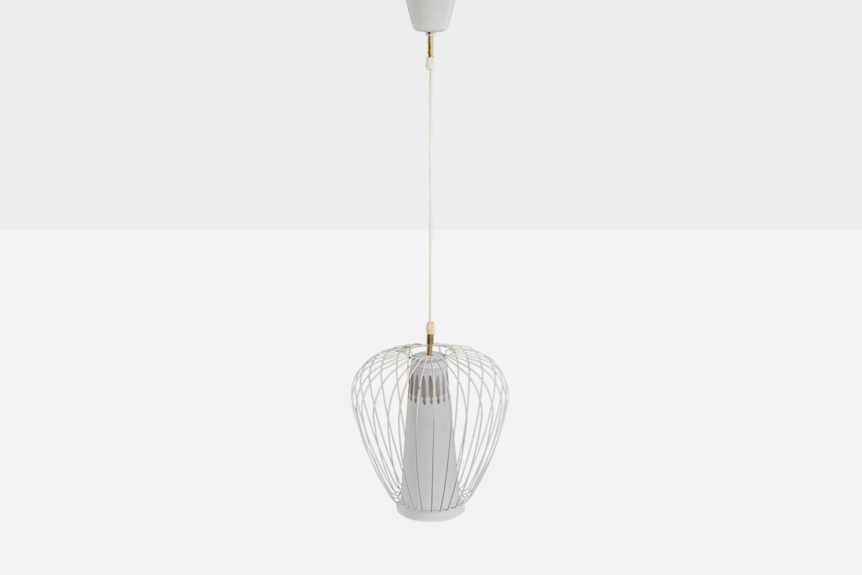 A white opaline glass, white-lacquered metal and brass pendant light designed and produced in Sweden, c. 1950s.