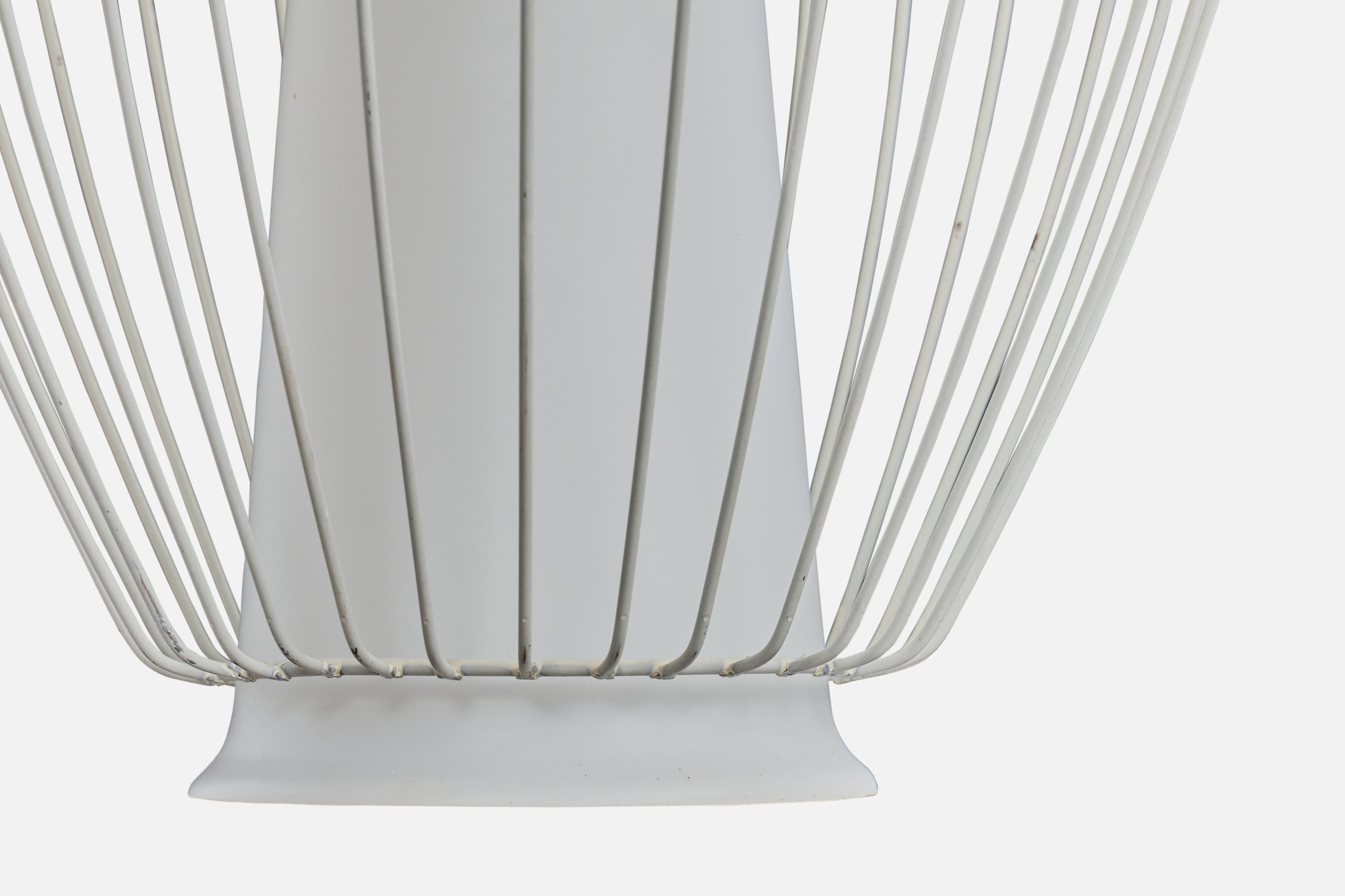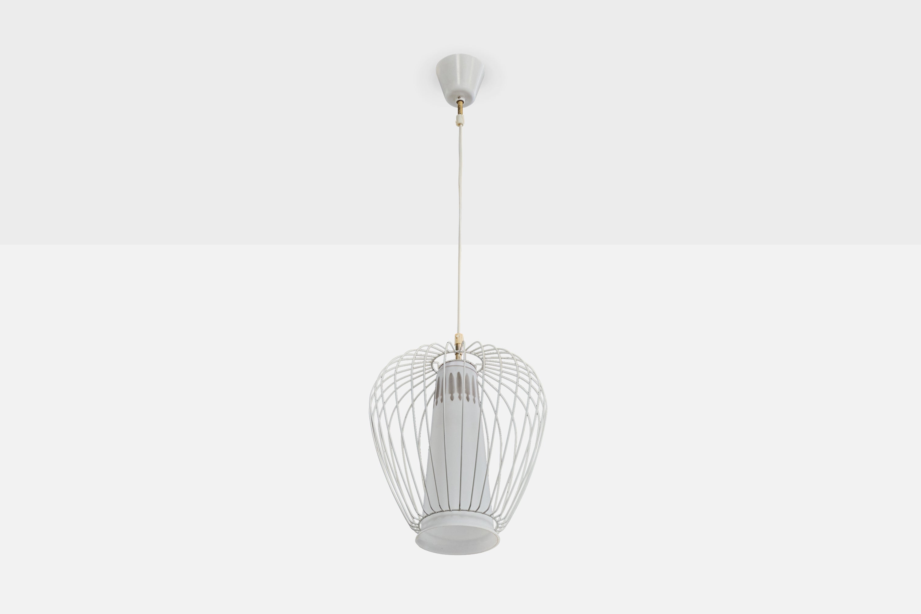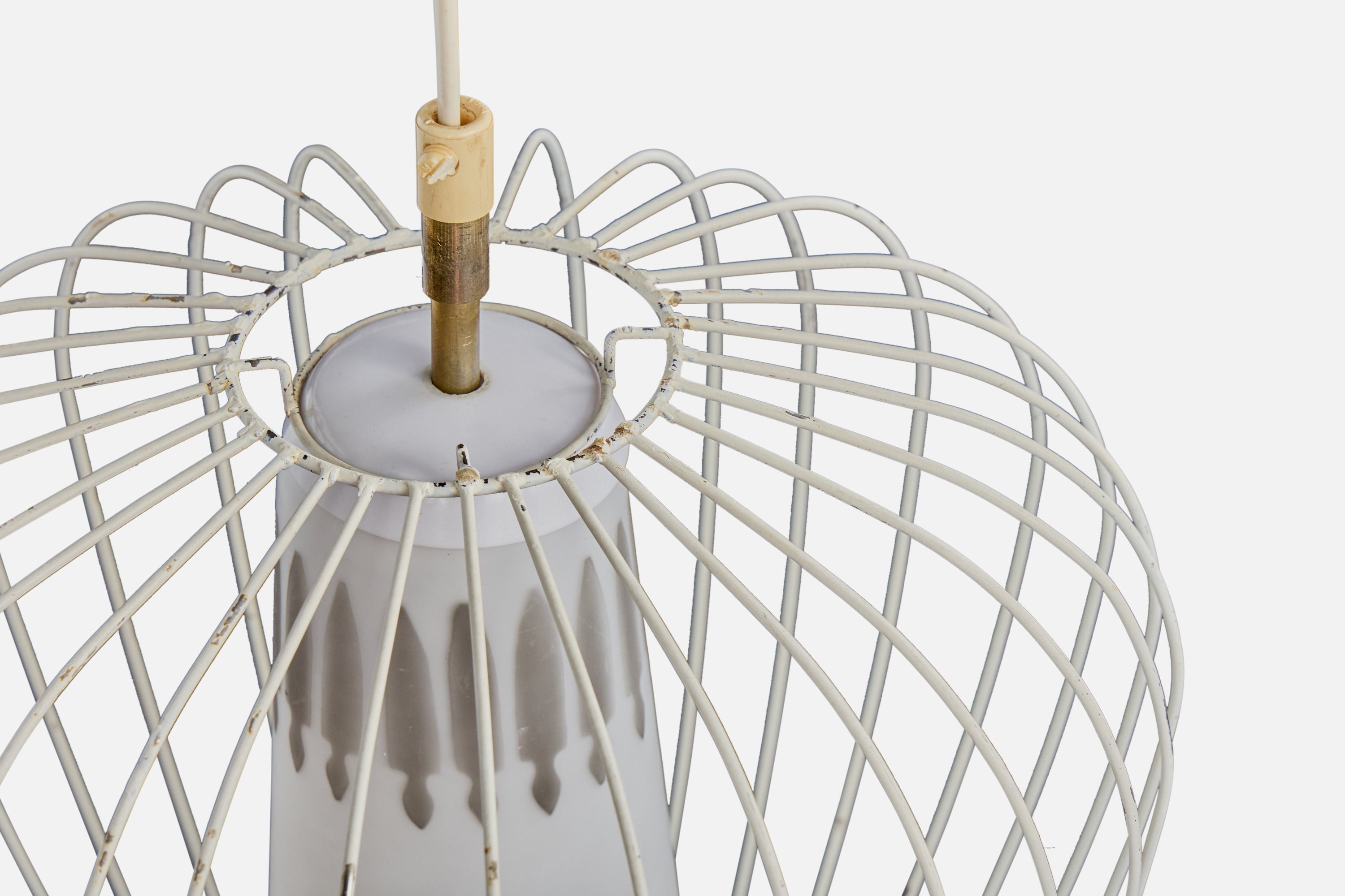 A white opaline glass, white-lacquered metal and brass pendant light designed and produced in Sweden, c. 1950s.