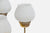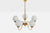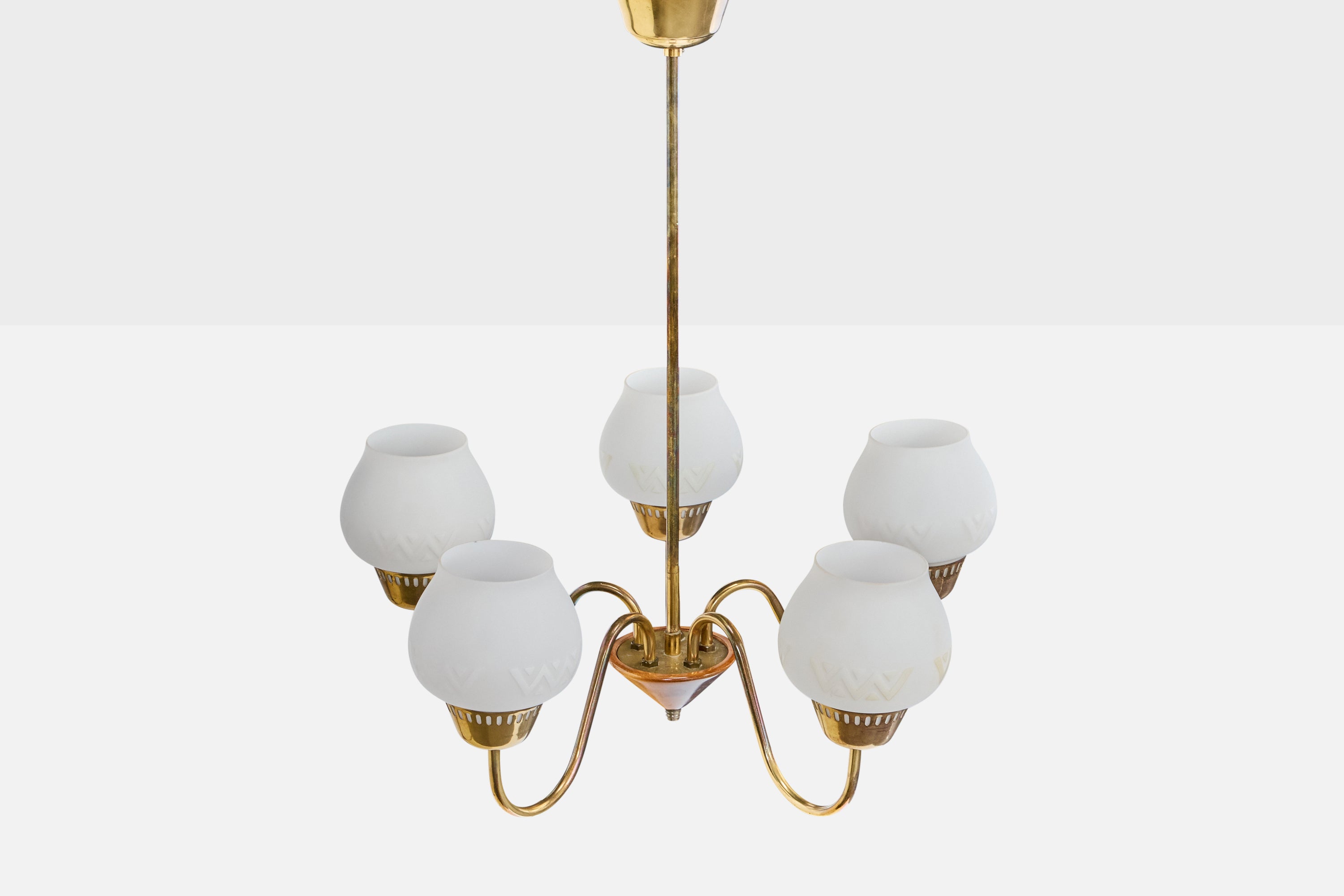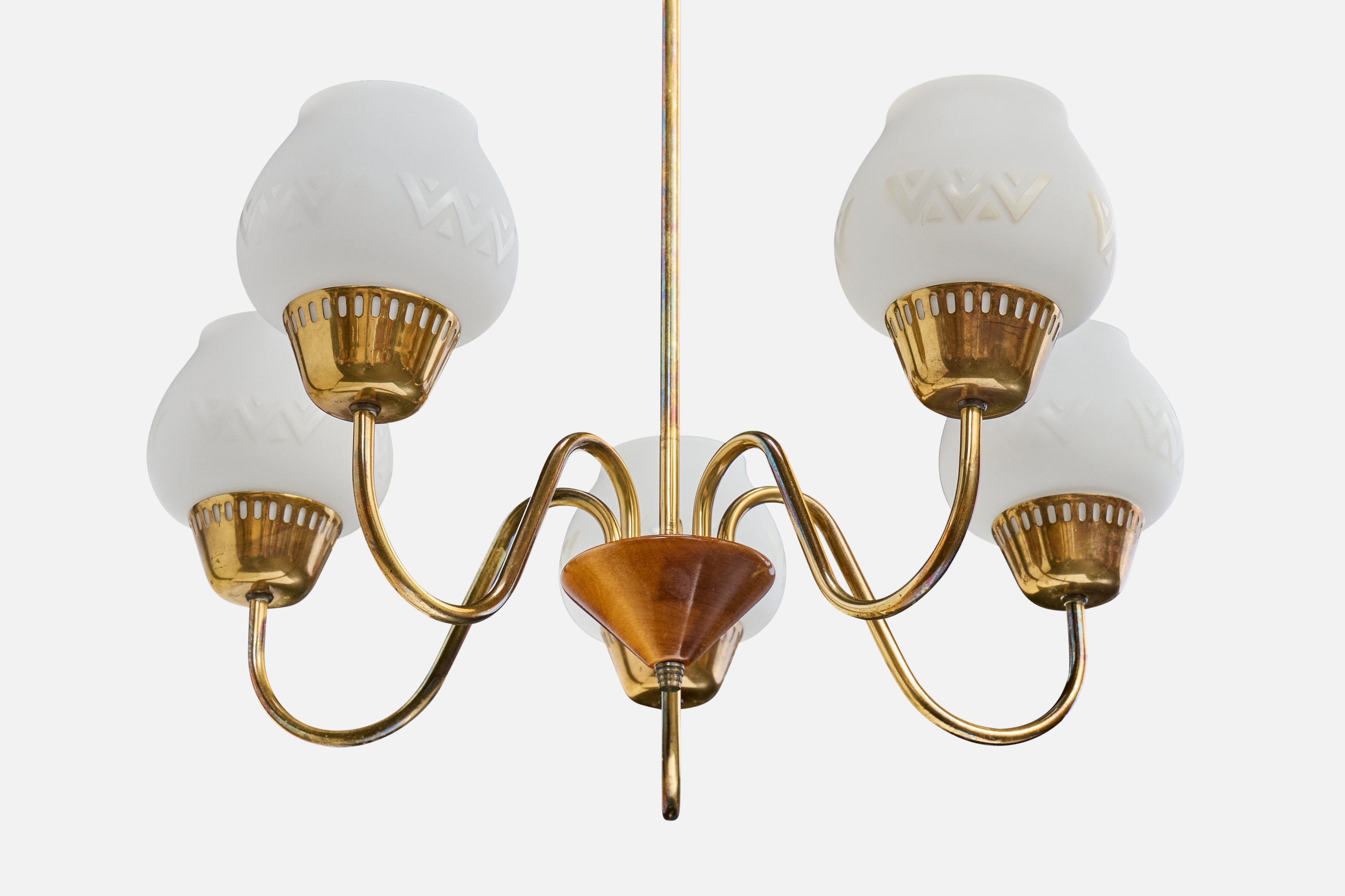 A brass, white opaline glass and stained wood chandelier designed and produced in Sweden, c. 1950s.