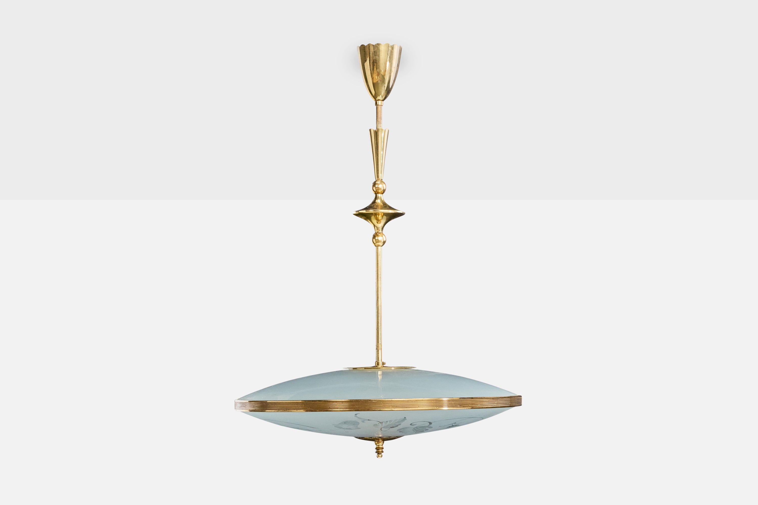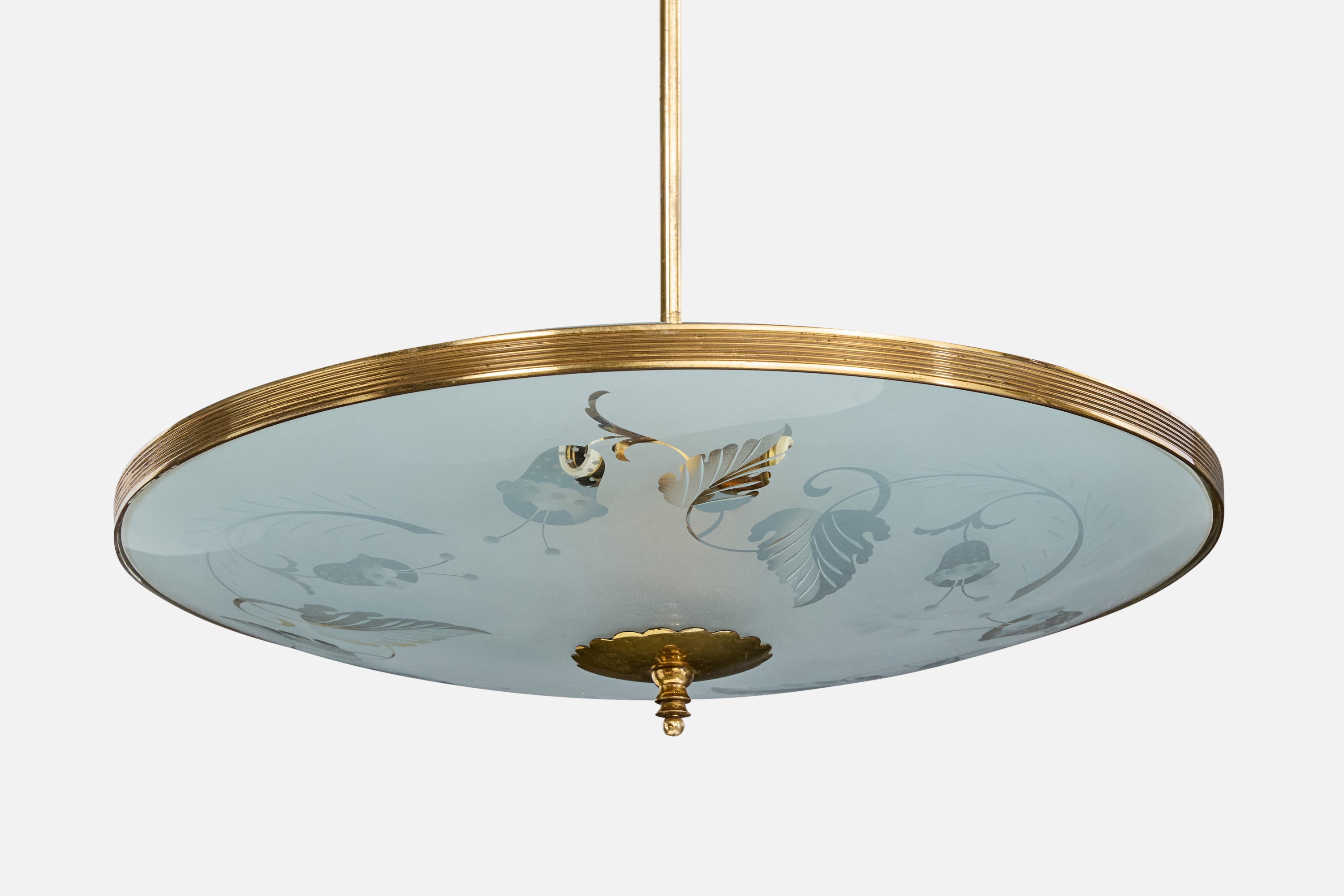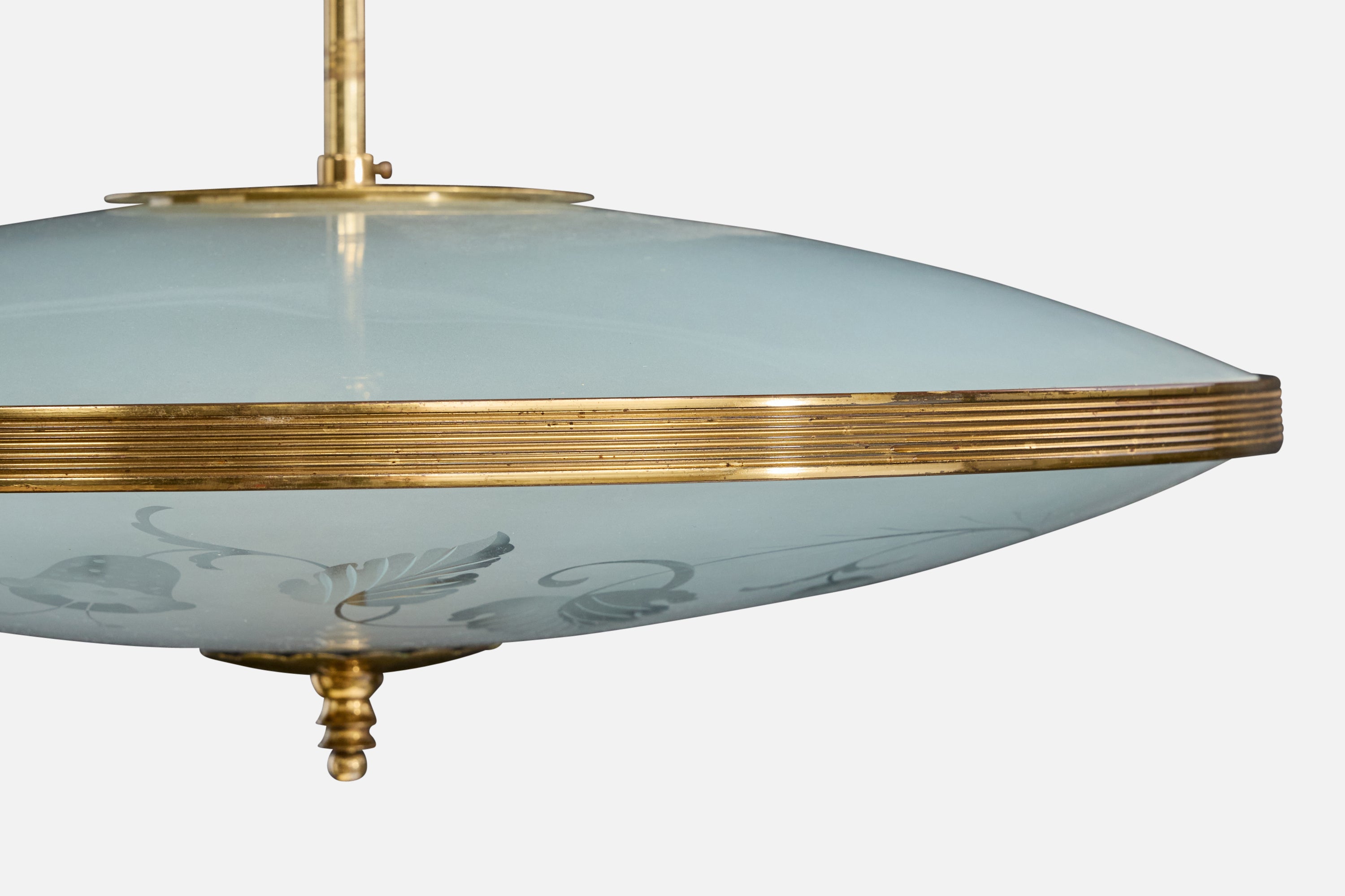 An acid-etched glass and brass pendant light designed and produced in Italy, c. 1940s.