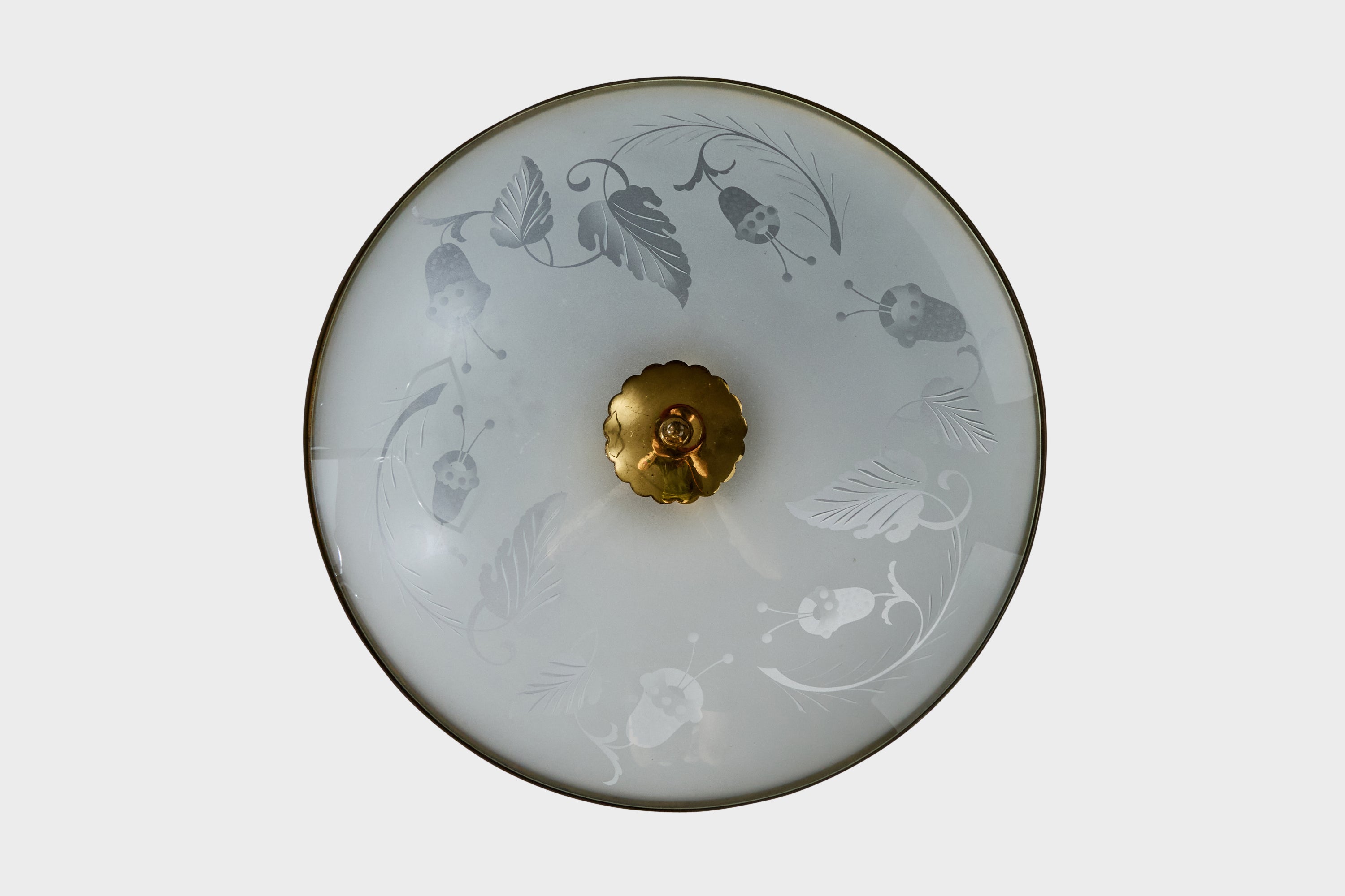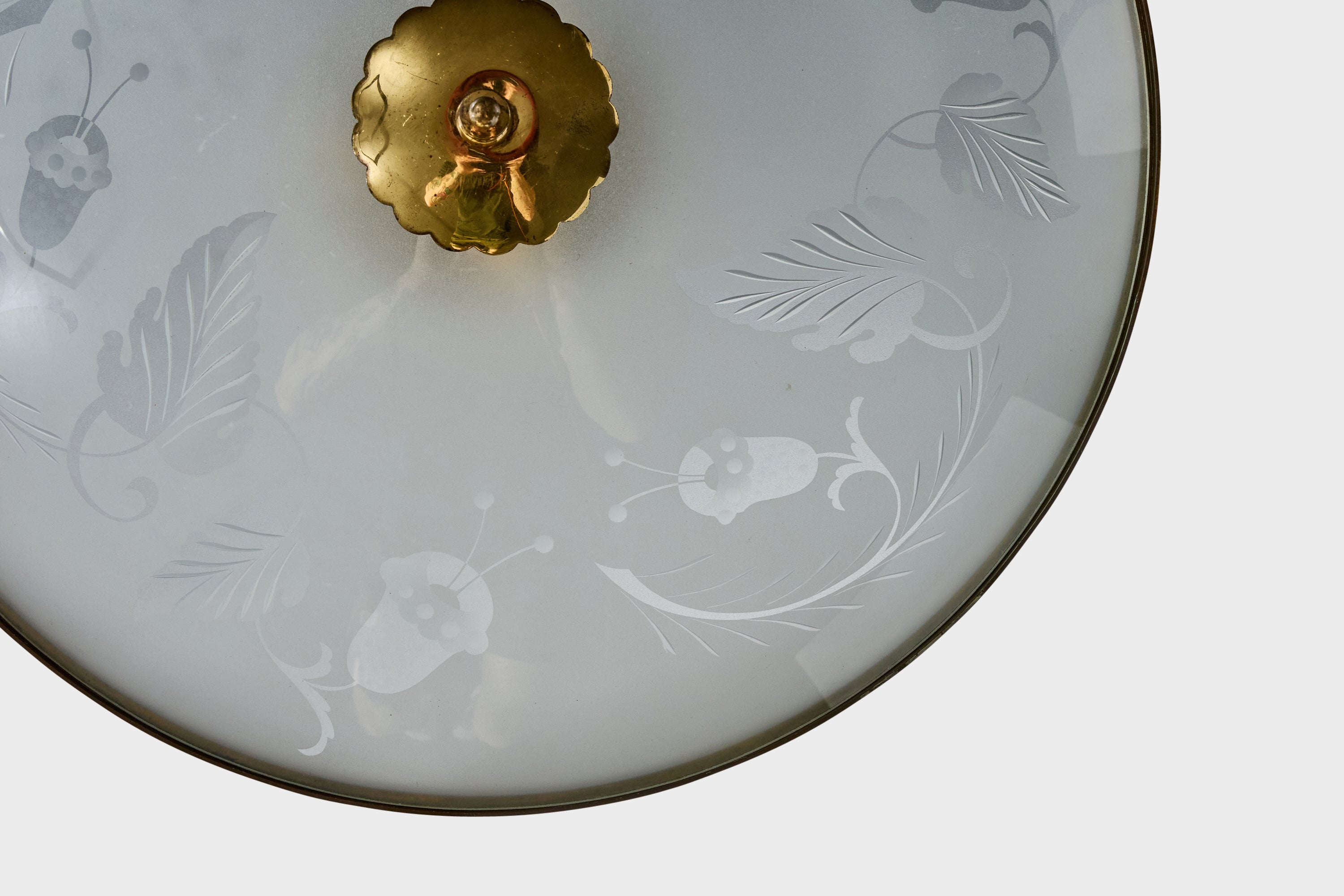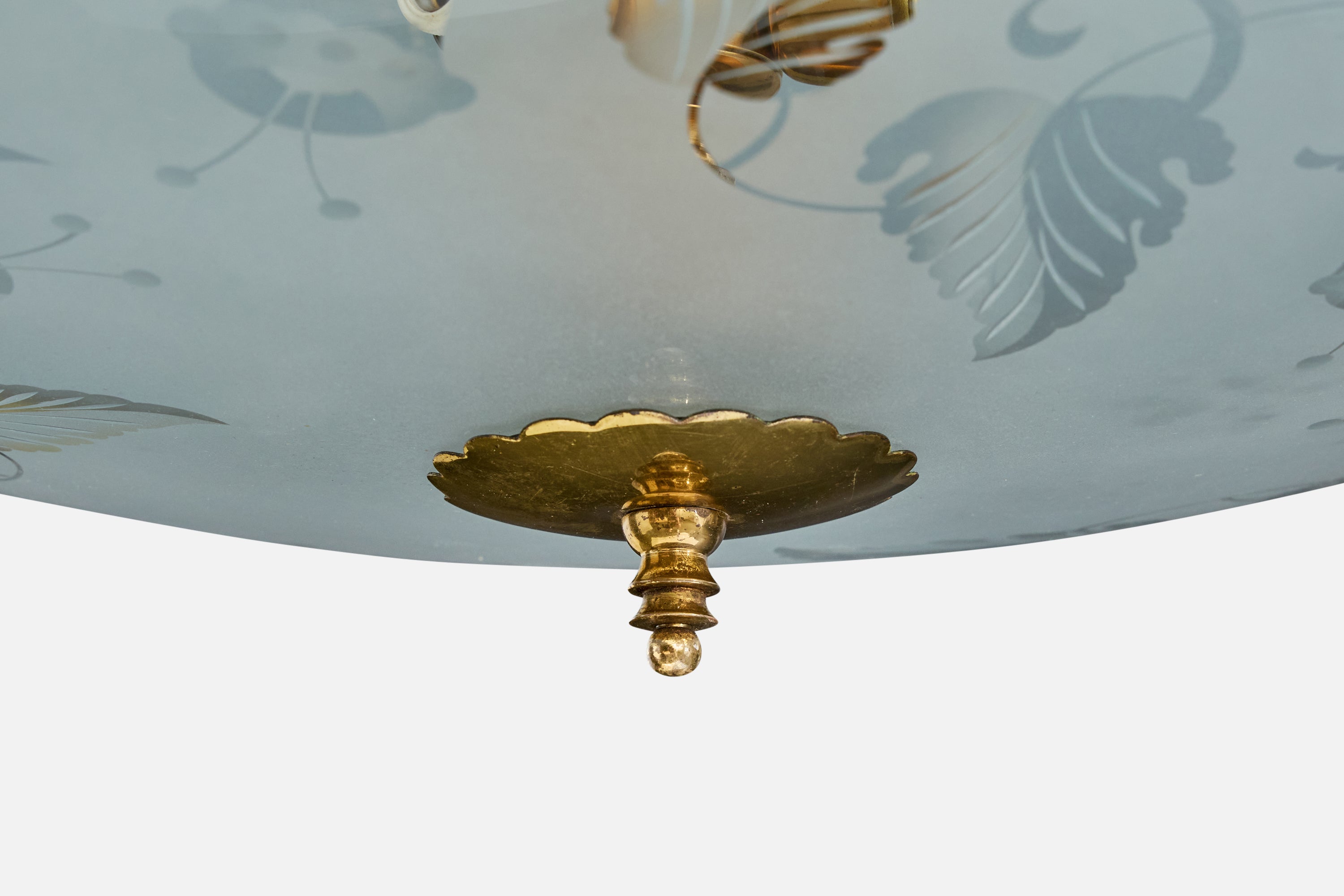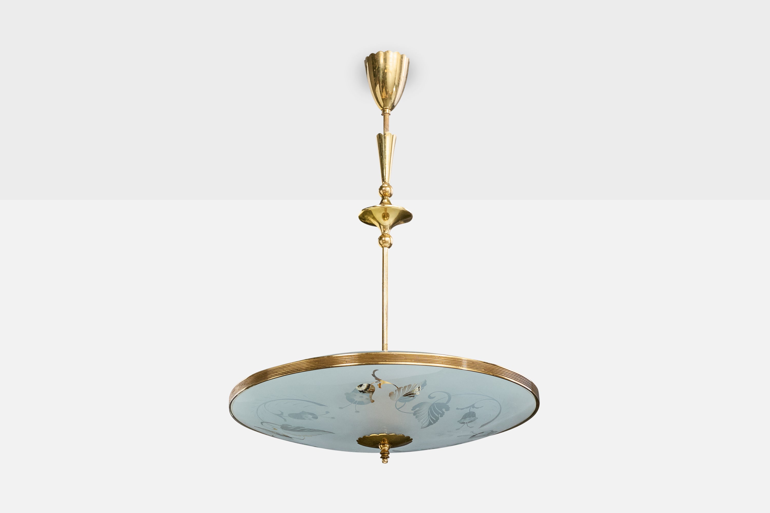 An acid-etched glass and brass pendant light designed and produced in Italy, c. 1940s.