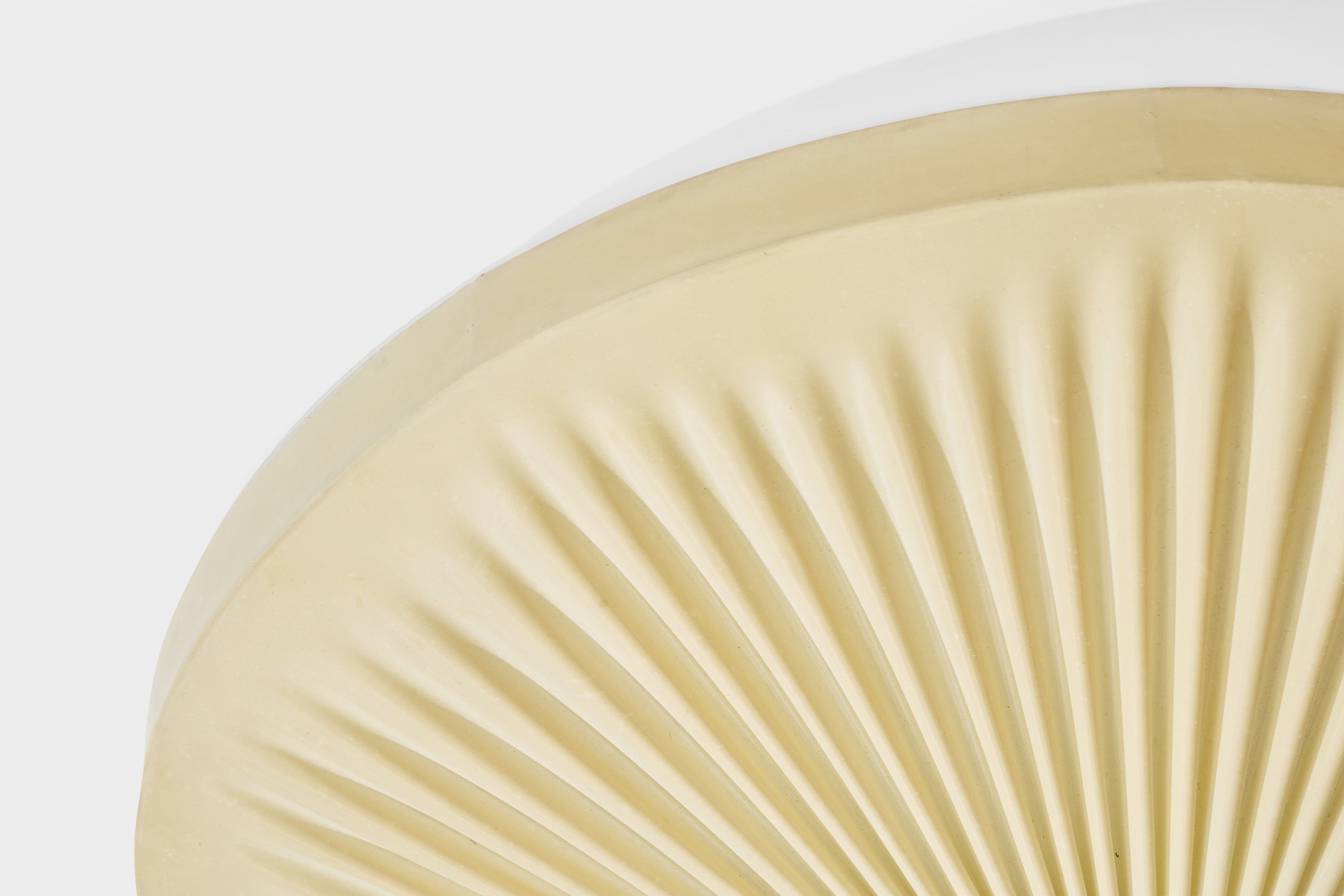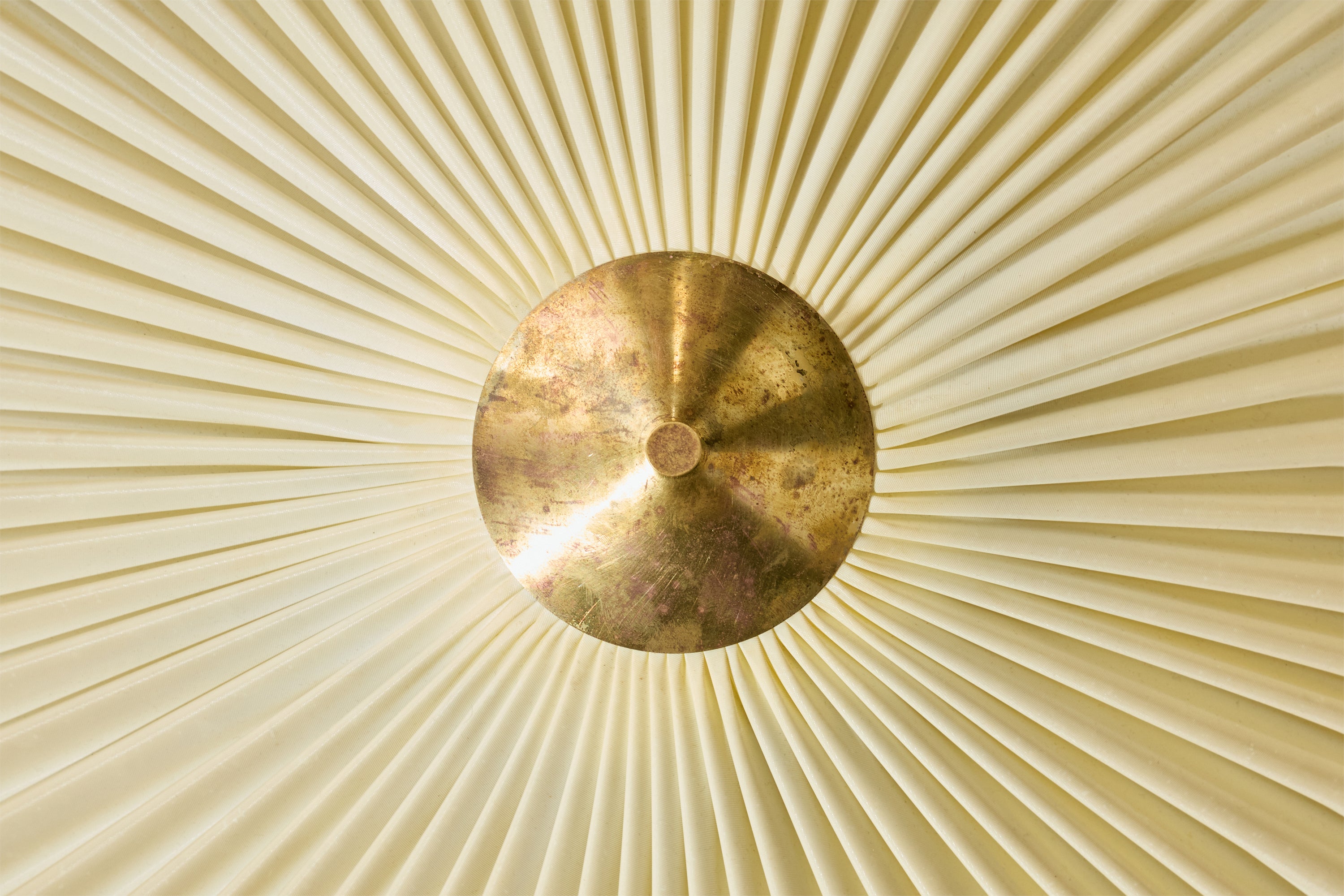 A cream-white resin-coated fabric and brass flush mount designed and produced in Finland, c. 1940s.