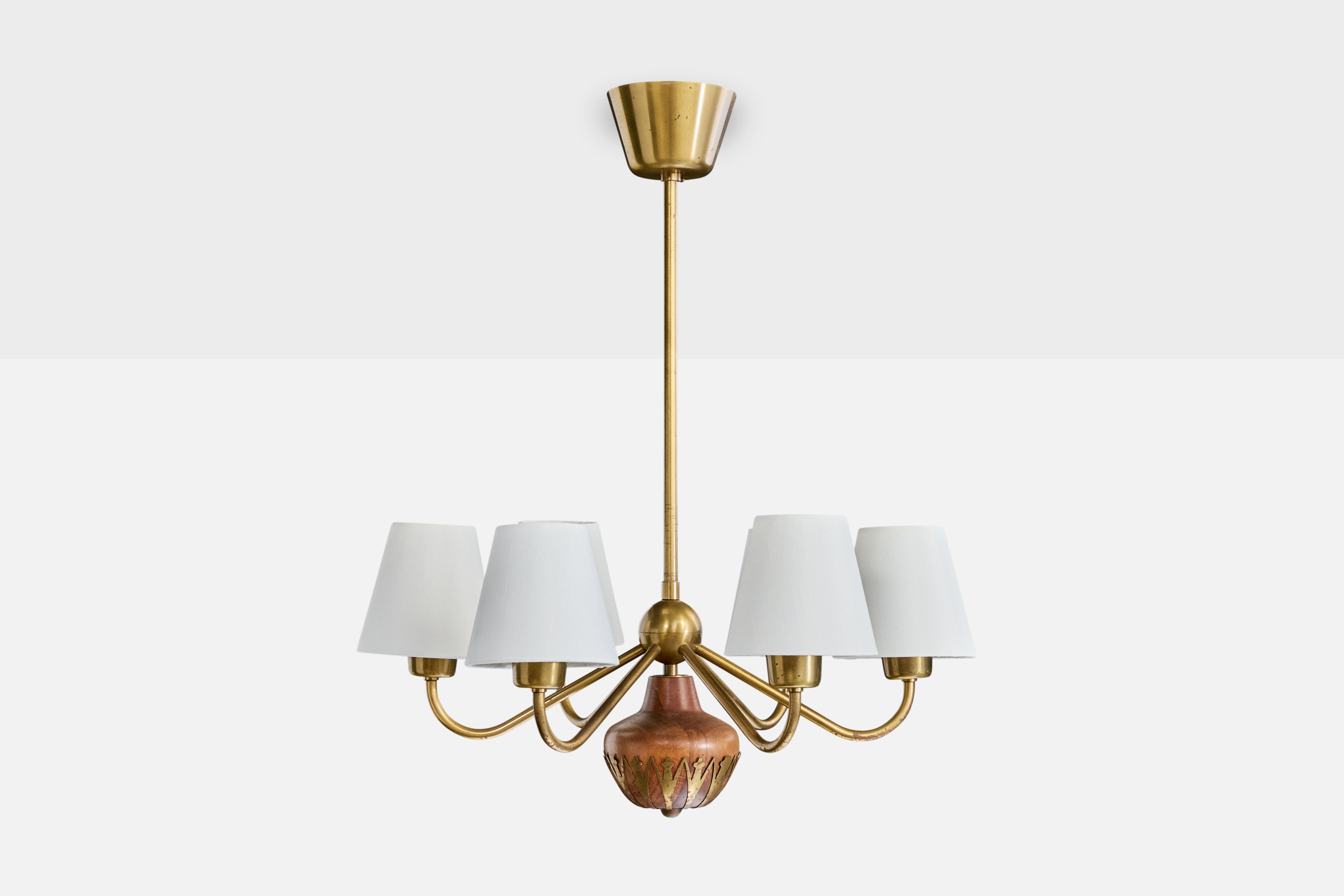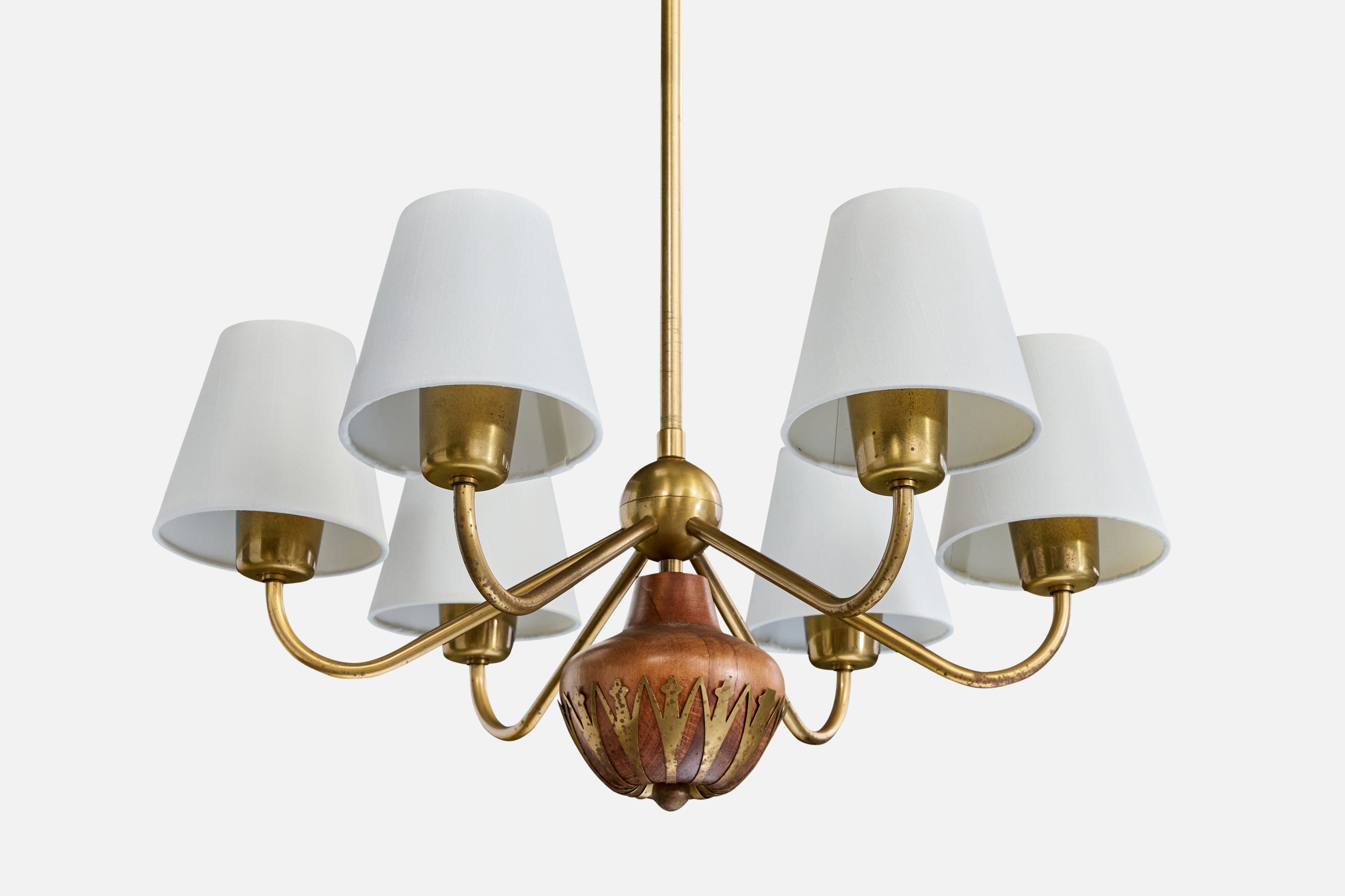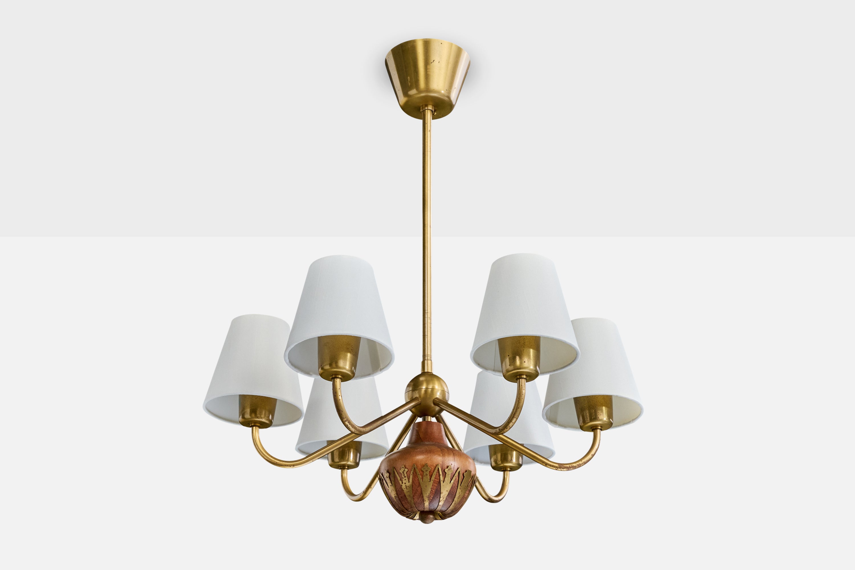 A brass, wood and white fabric chandelier produced by Cebe, Sweden, c. 1940s.