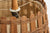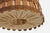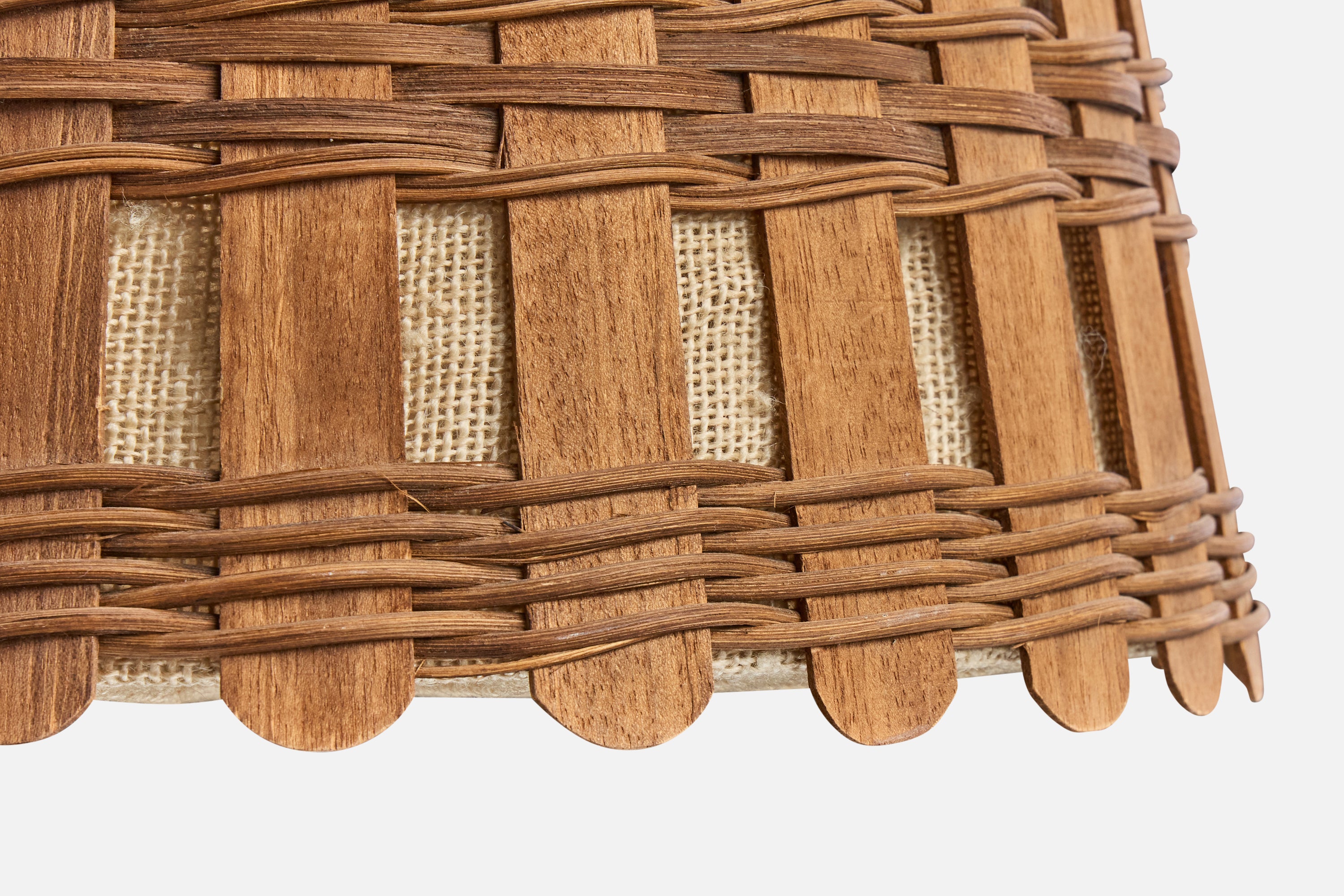 A pair of wood, rattan and brown burlap pendant lights designed and produced in France, c. 1950s.