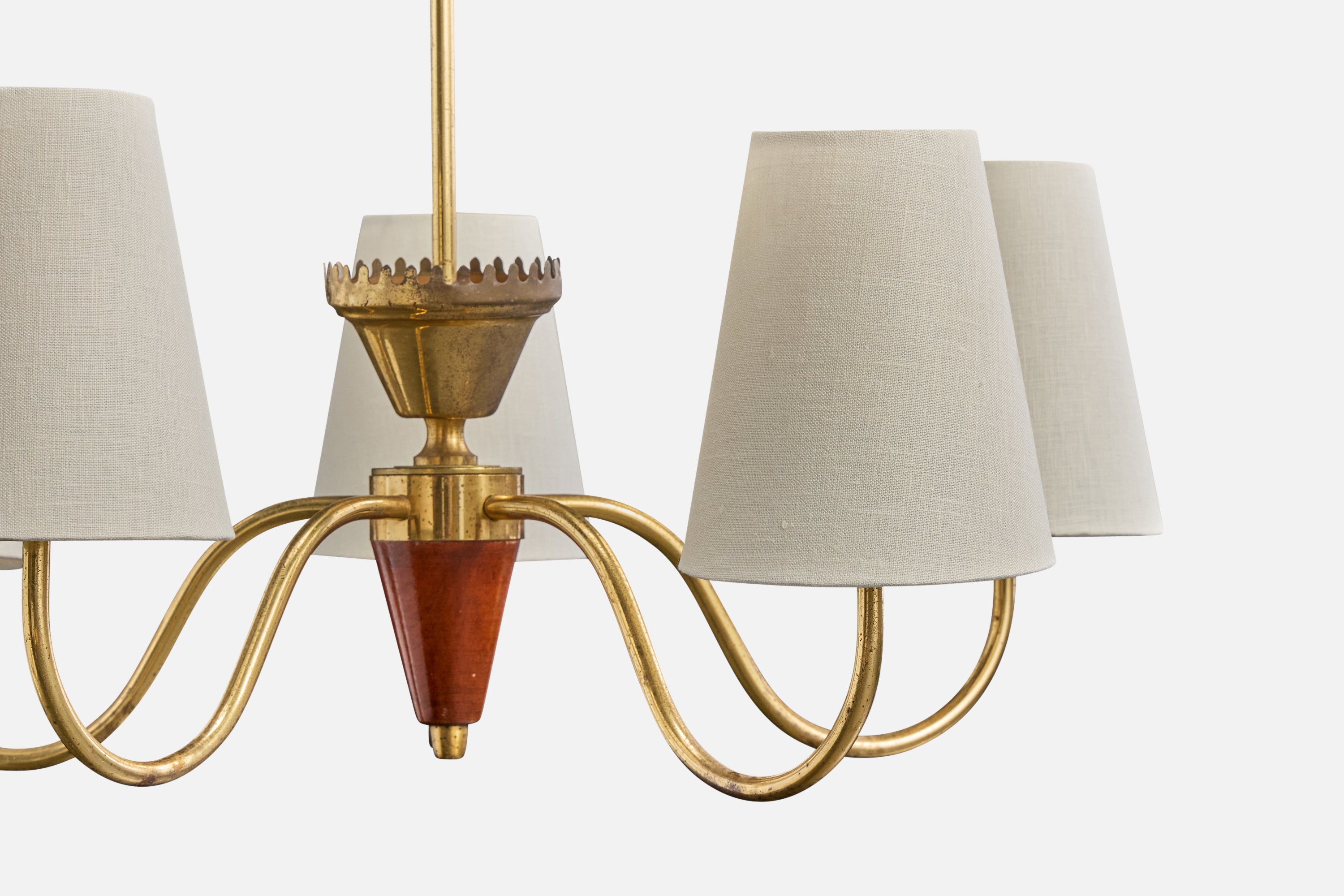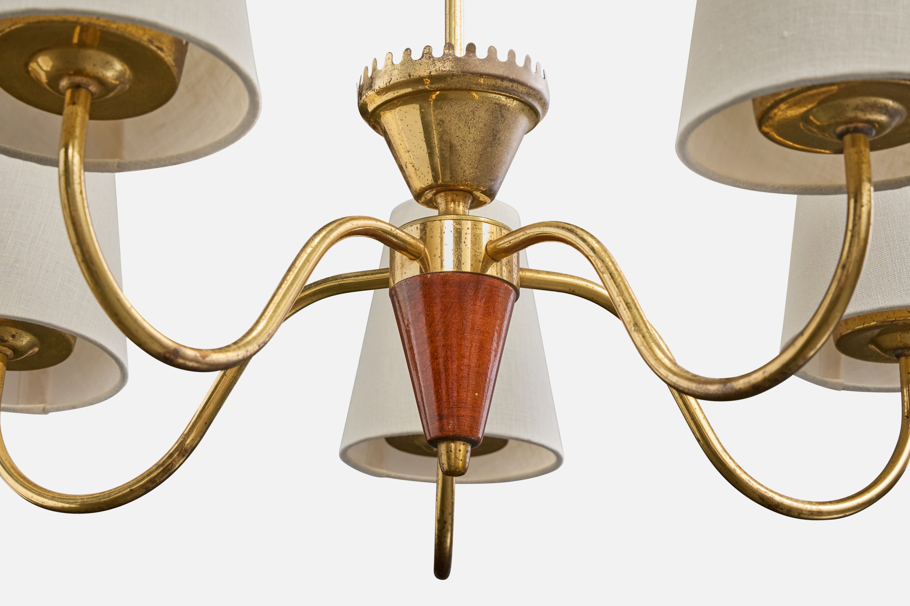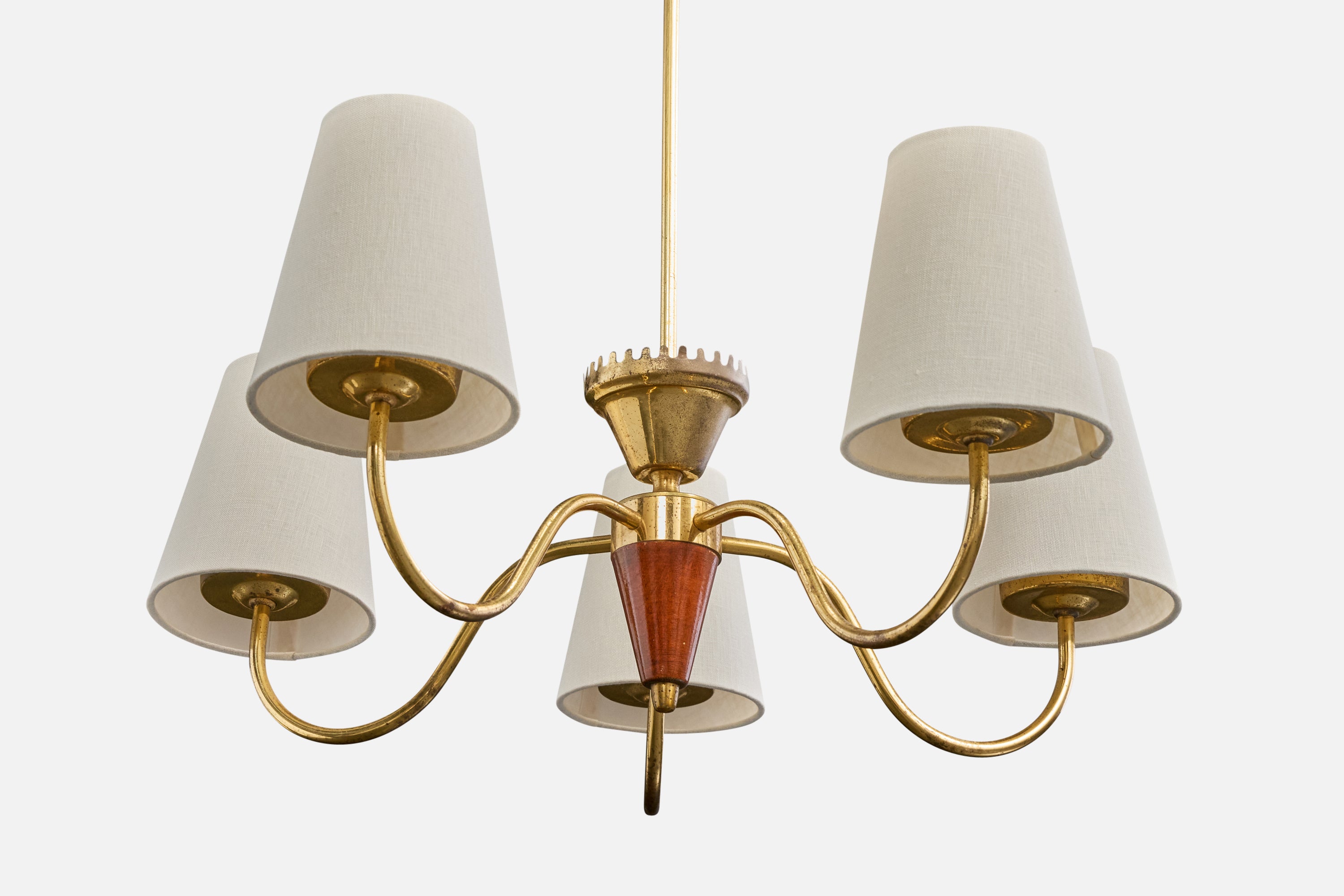 Swedish Designer, Chandelier, Brass, Wood, Fabric, Sweden, 1950s