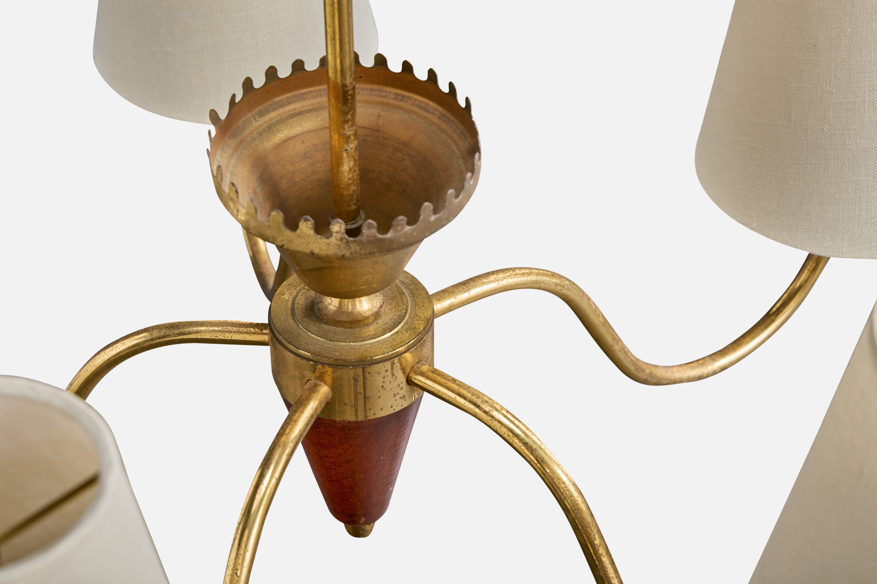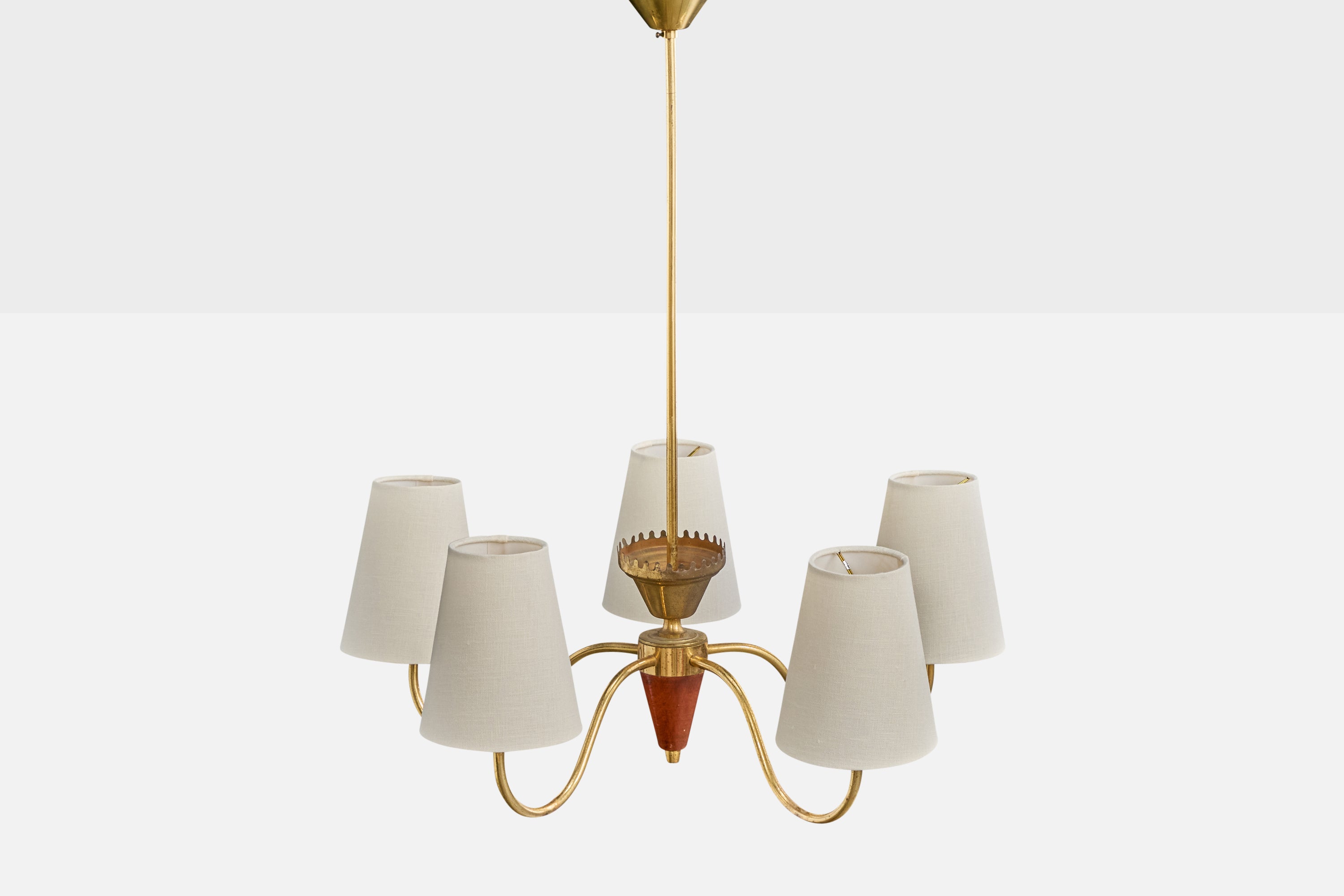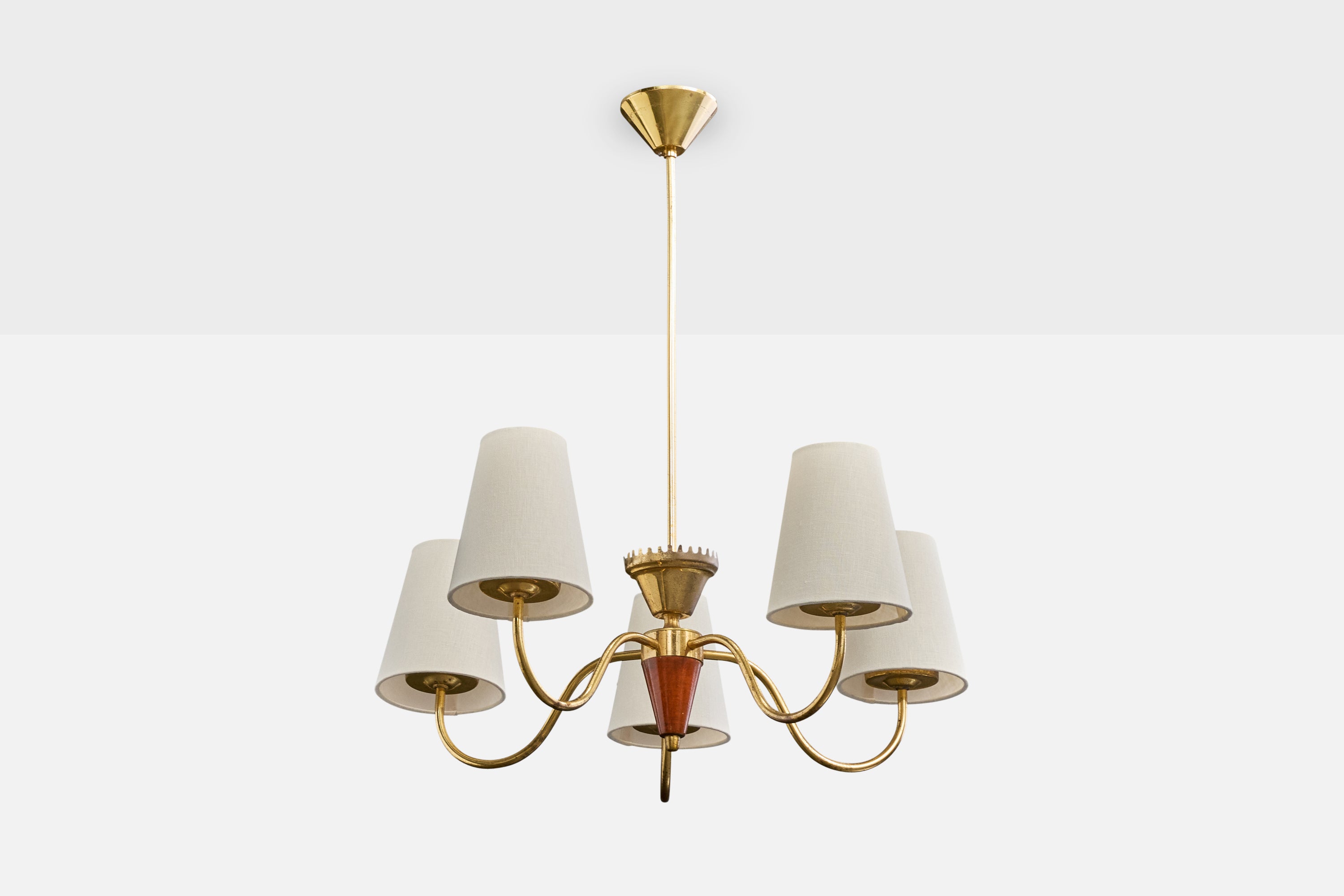 Swedish Designer, Chandelier, Brass, Wood, Fabric, Sweden, 1950s