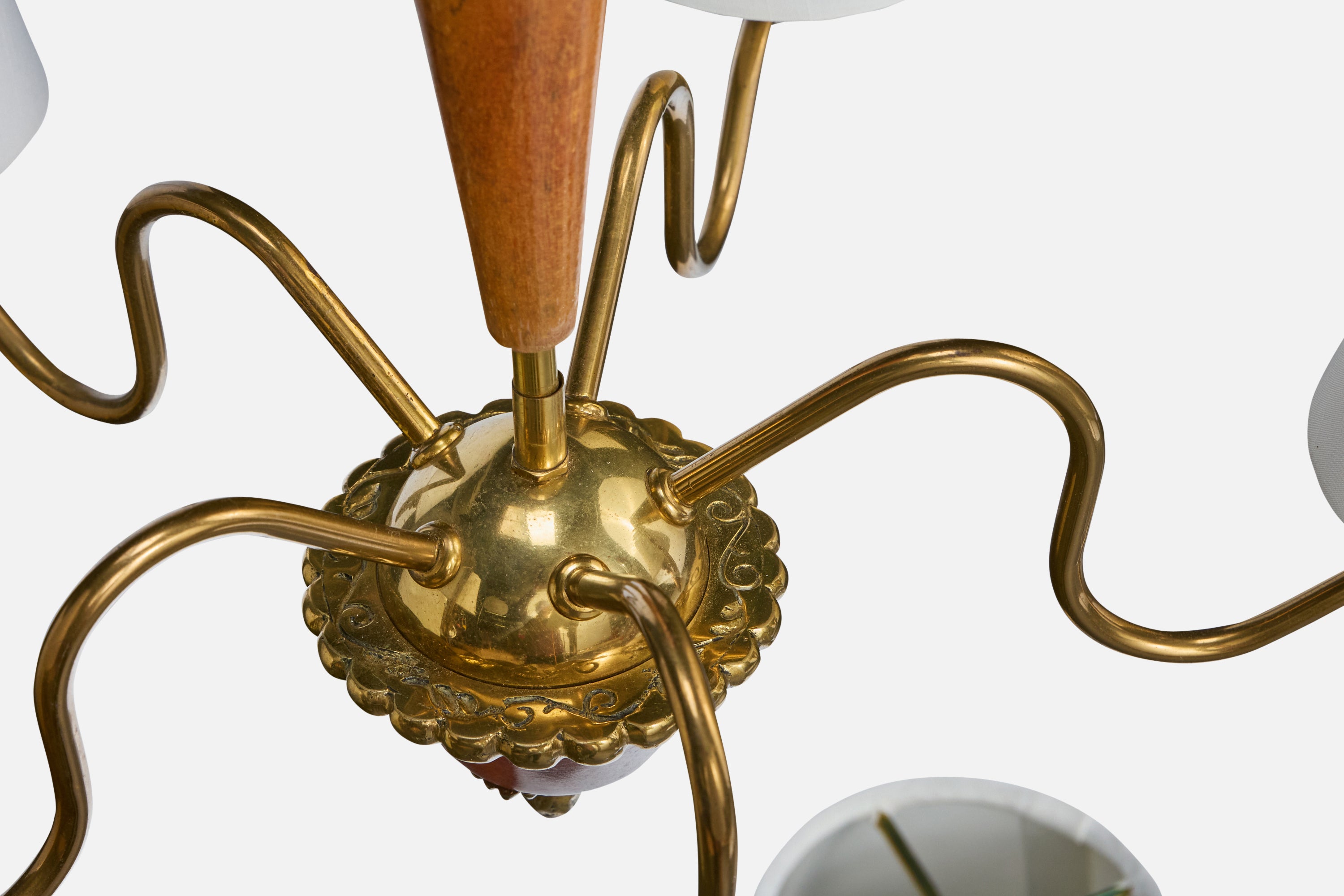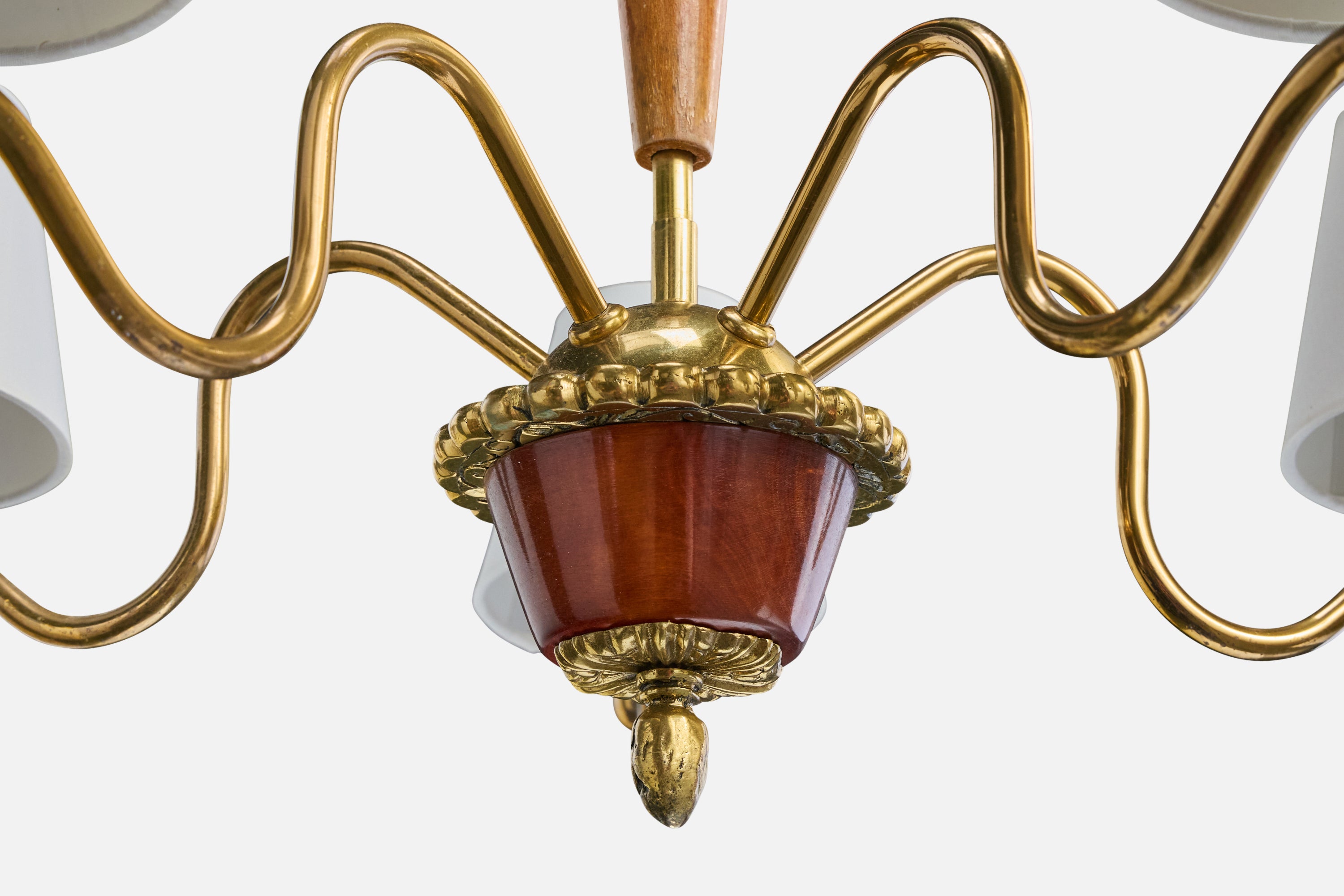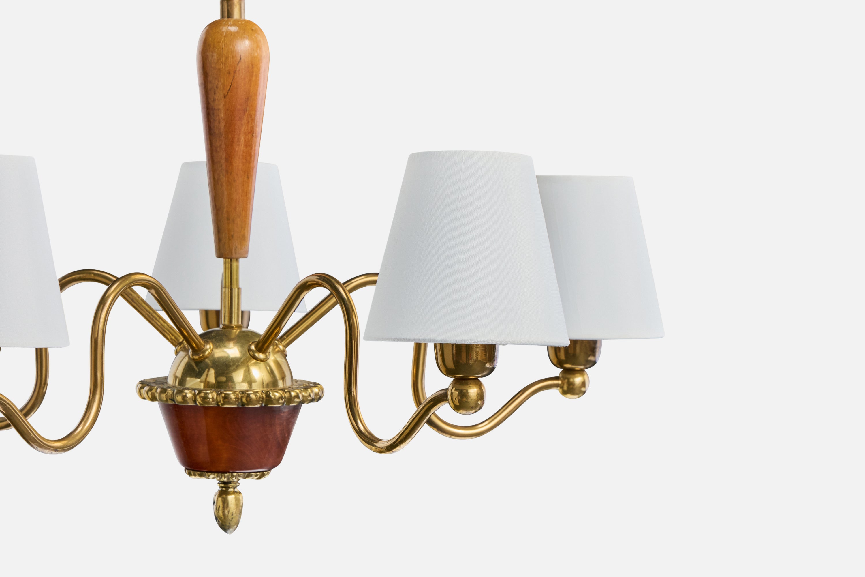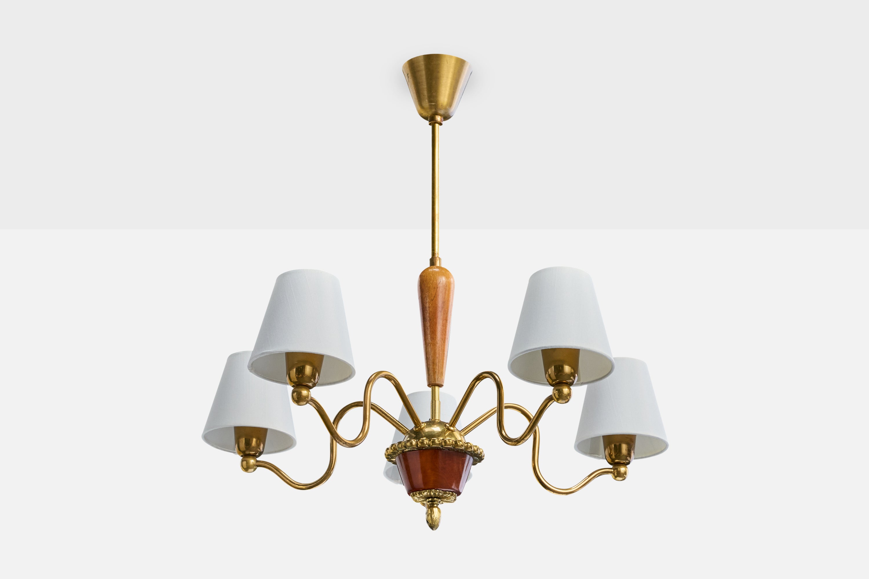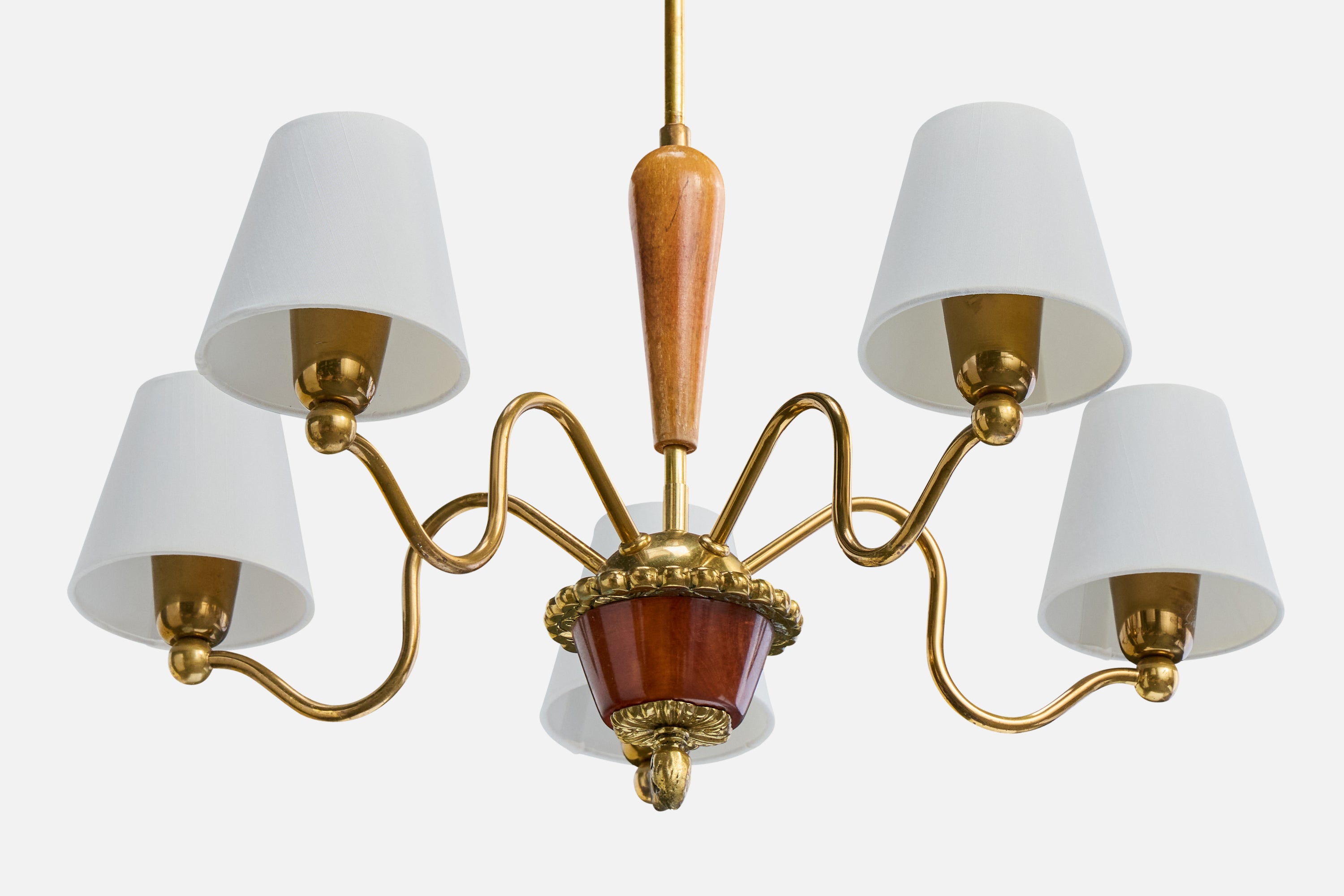 Swedish Designer, Chandelier, Brass, Wood, Fabric, Sweden, 1950s