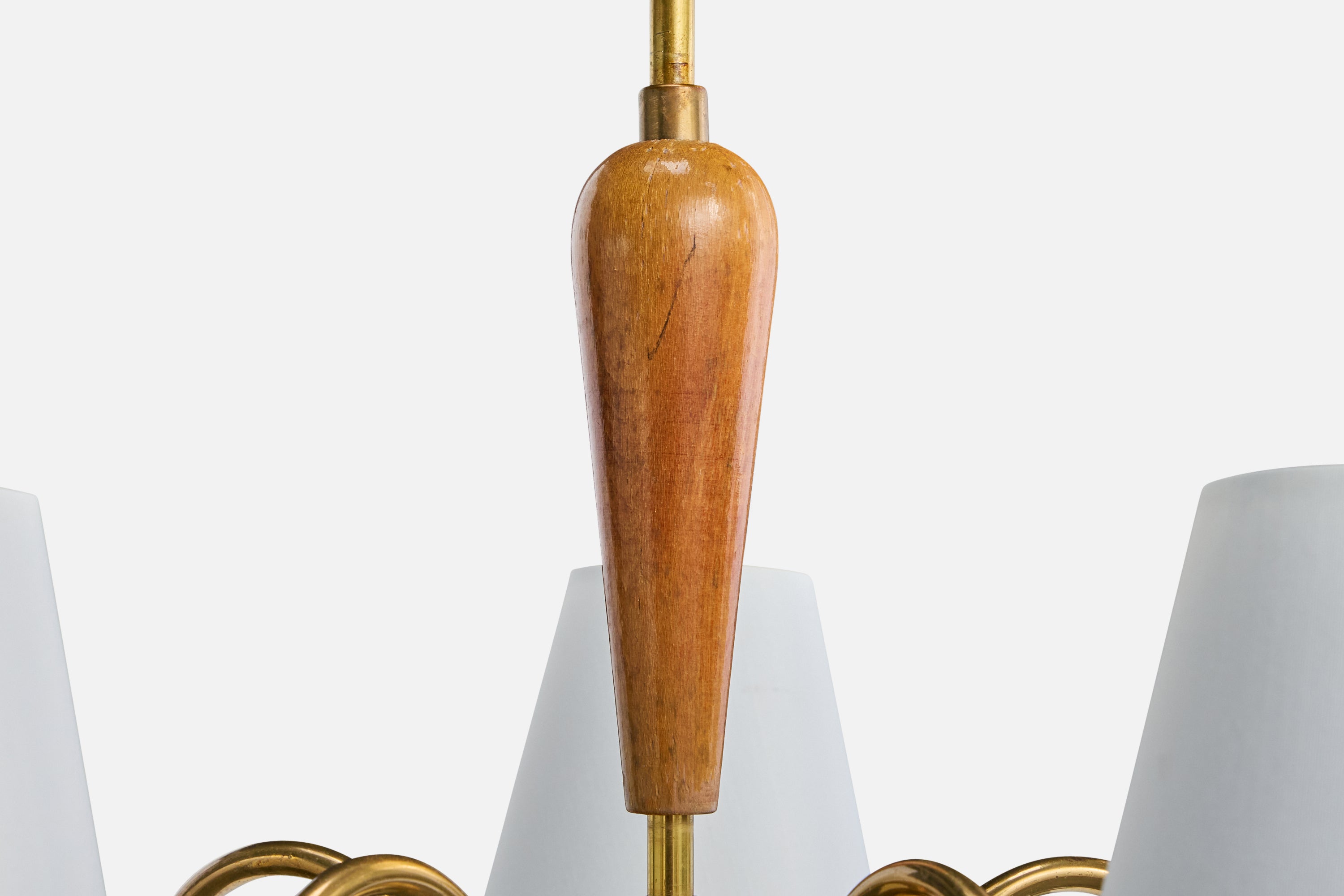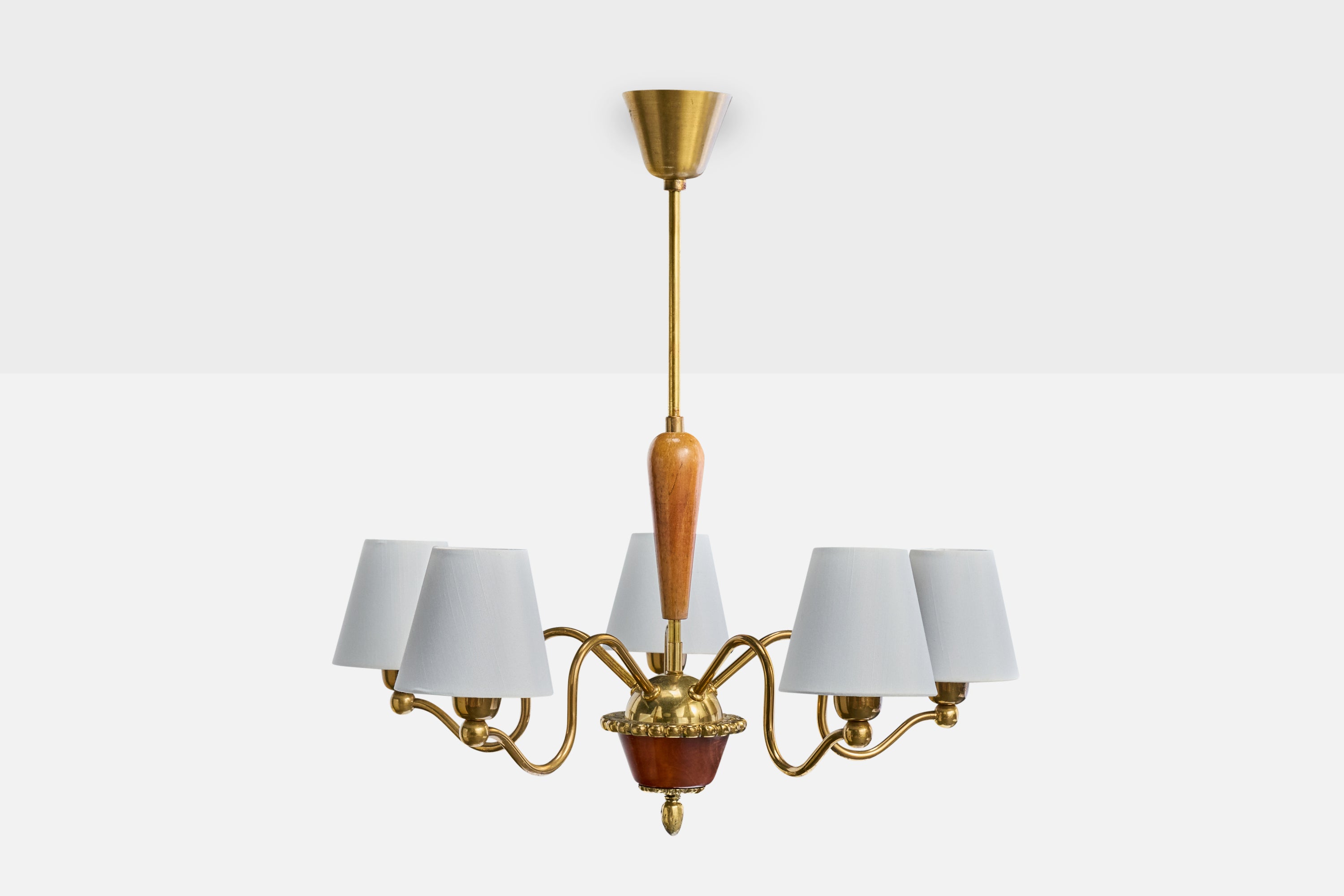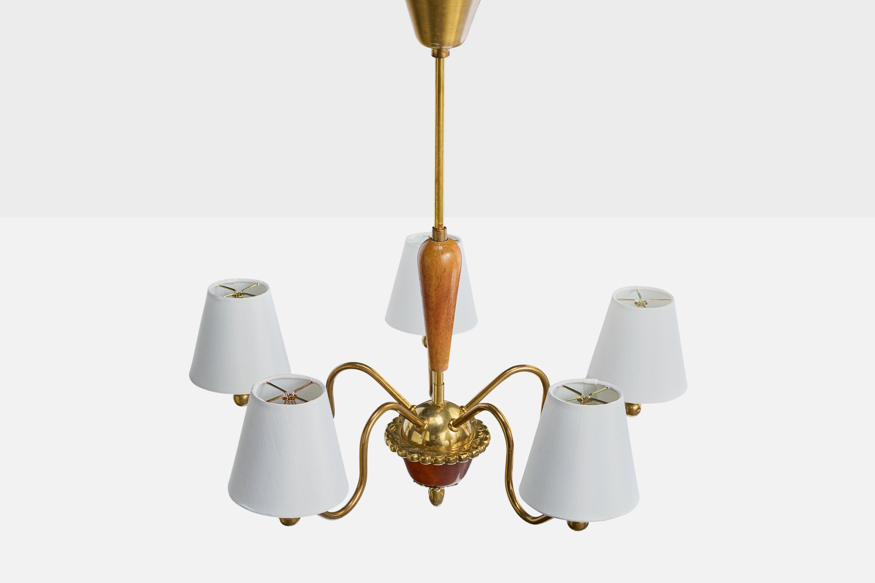 A brass, wood and white fabric chandelier designed and produced in Sweden, c. 1950s.