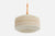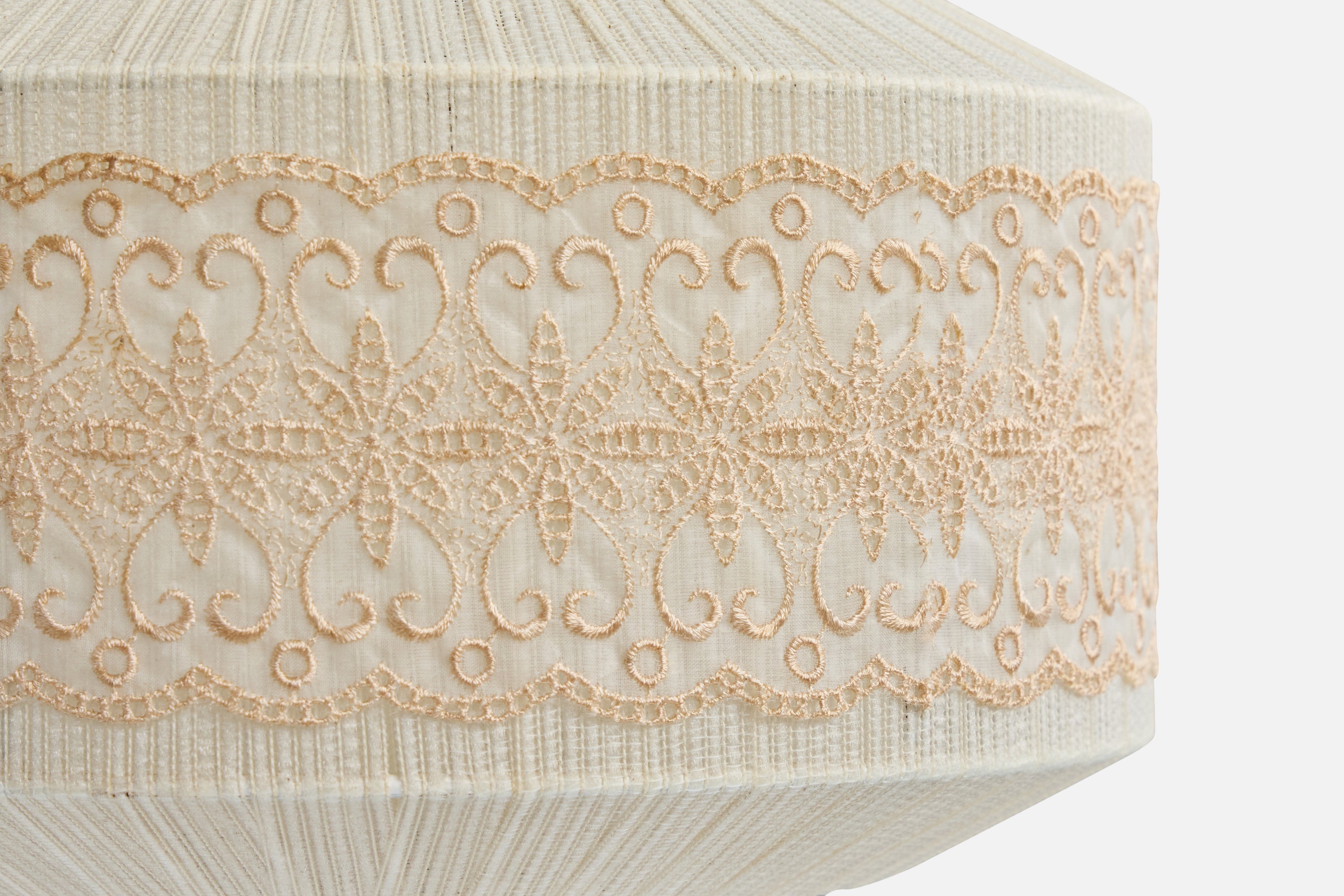 A wood and fabric string pendant light with embroidery details designed and produced in Sweden, c. 1960s.