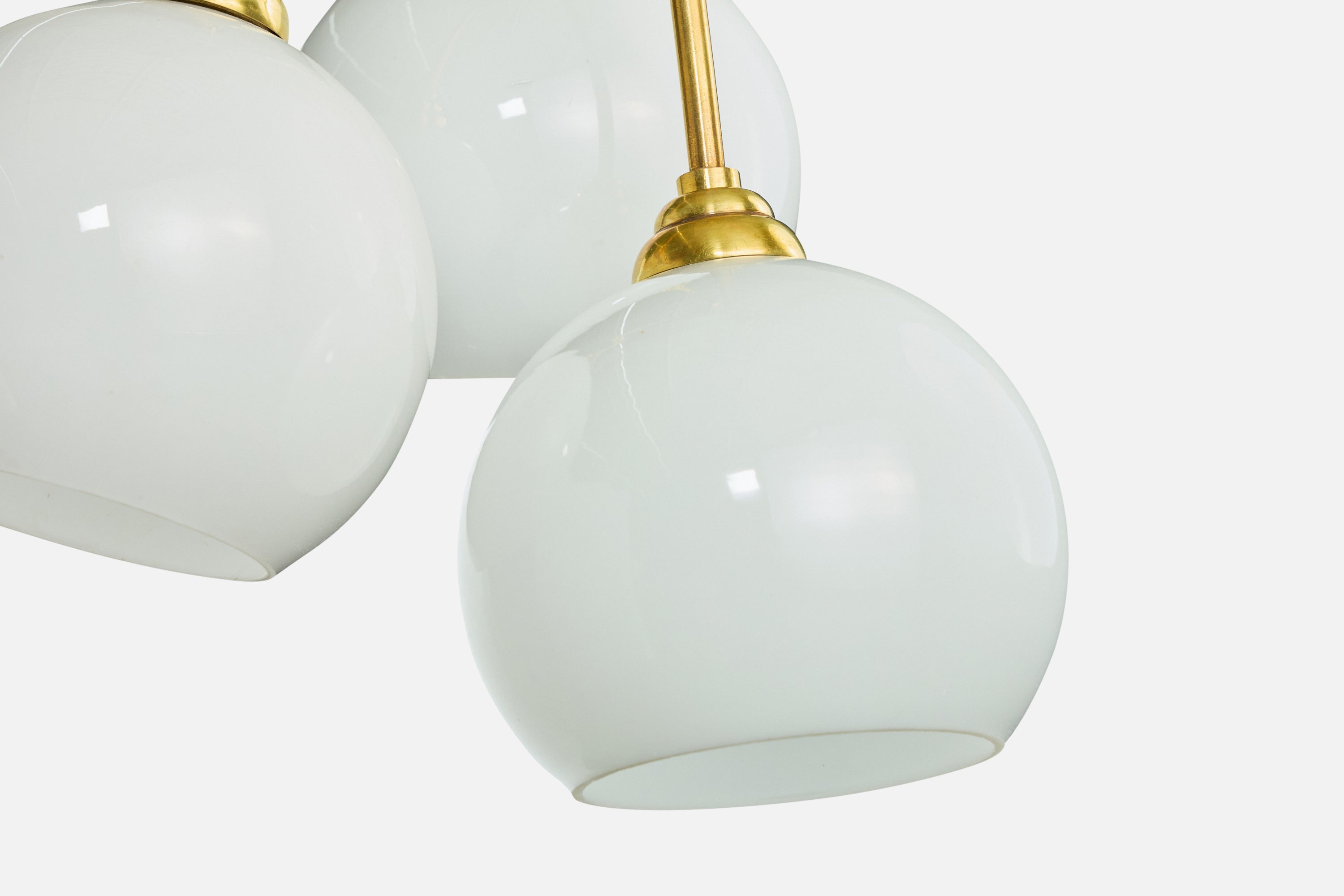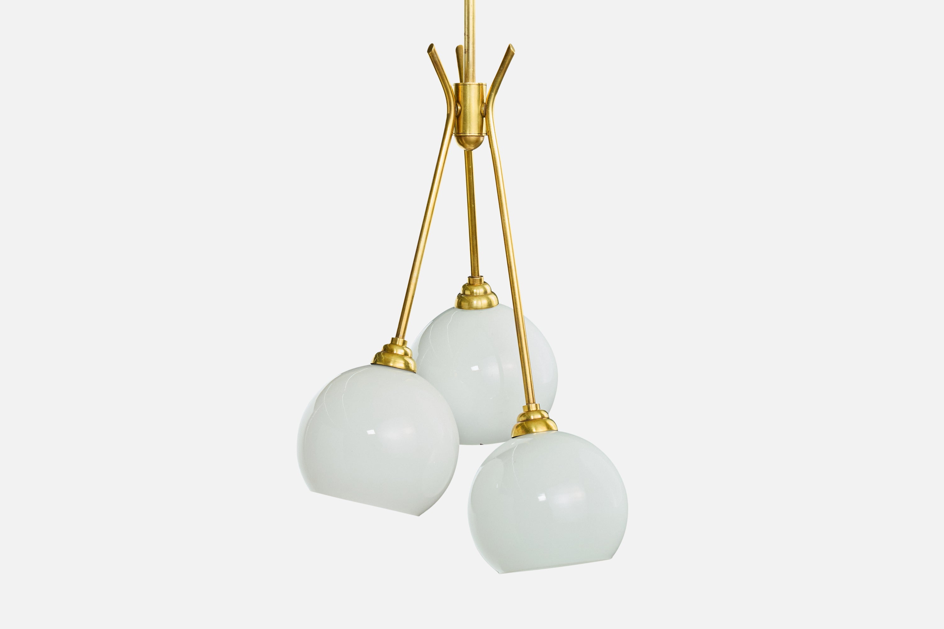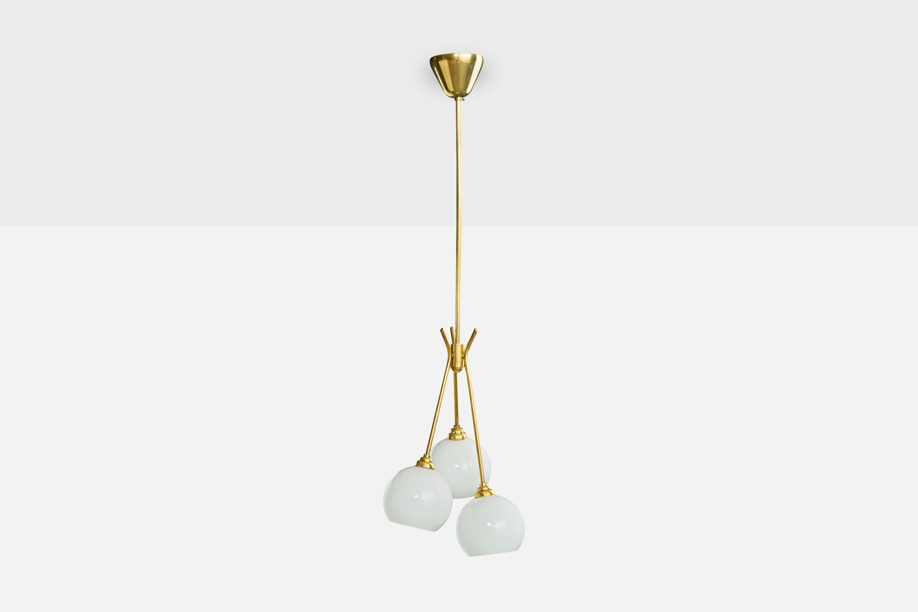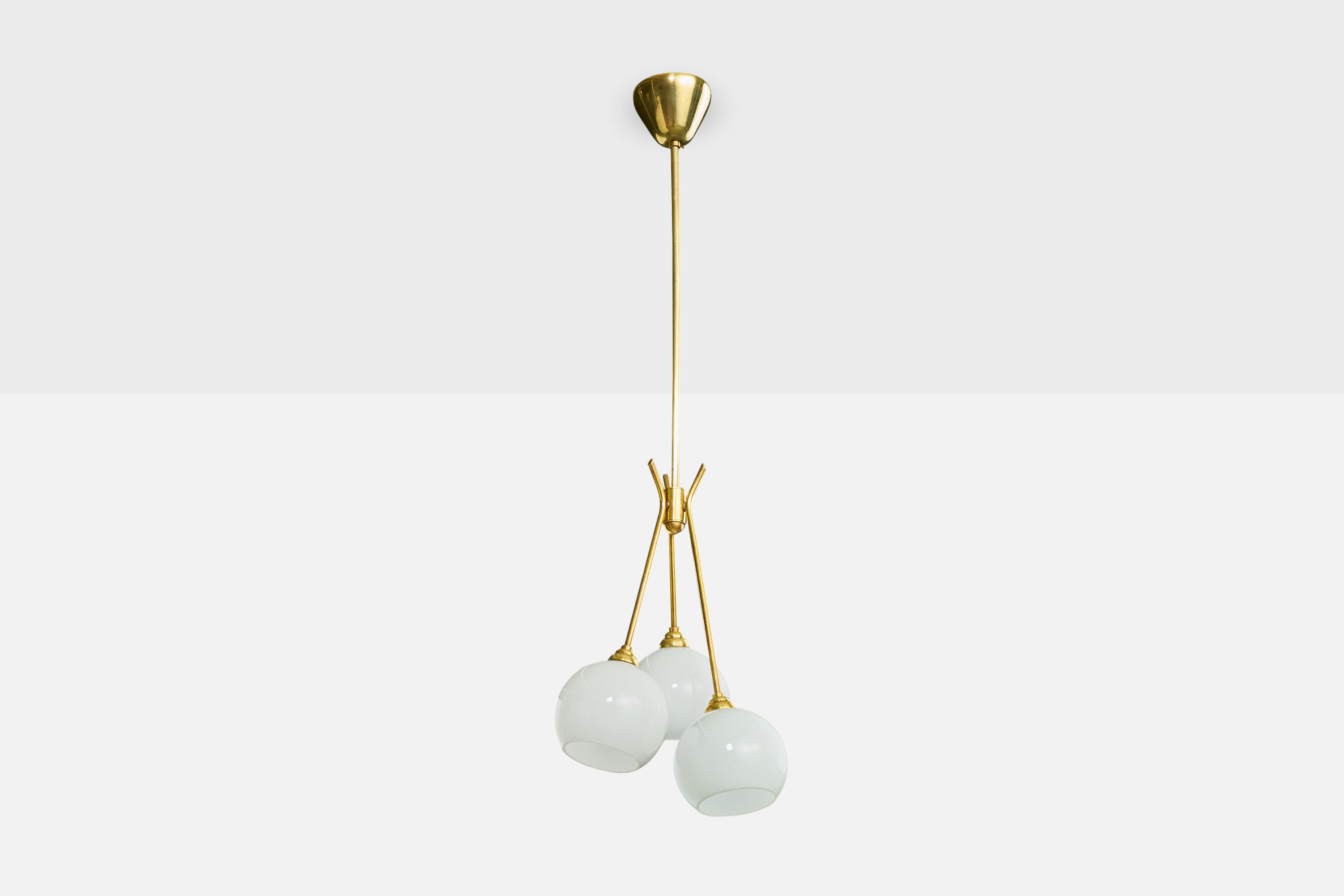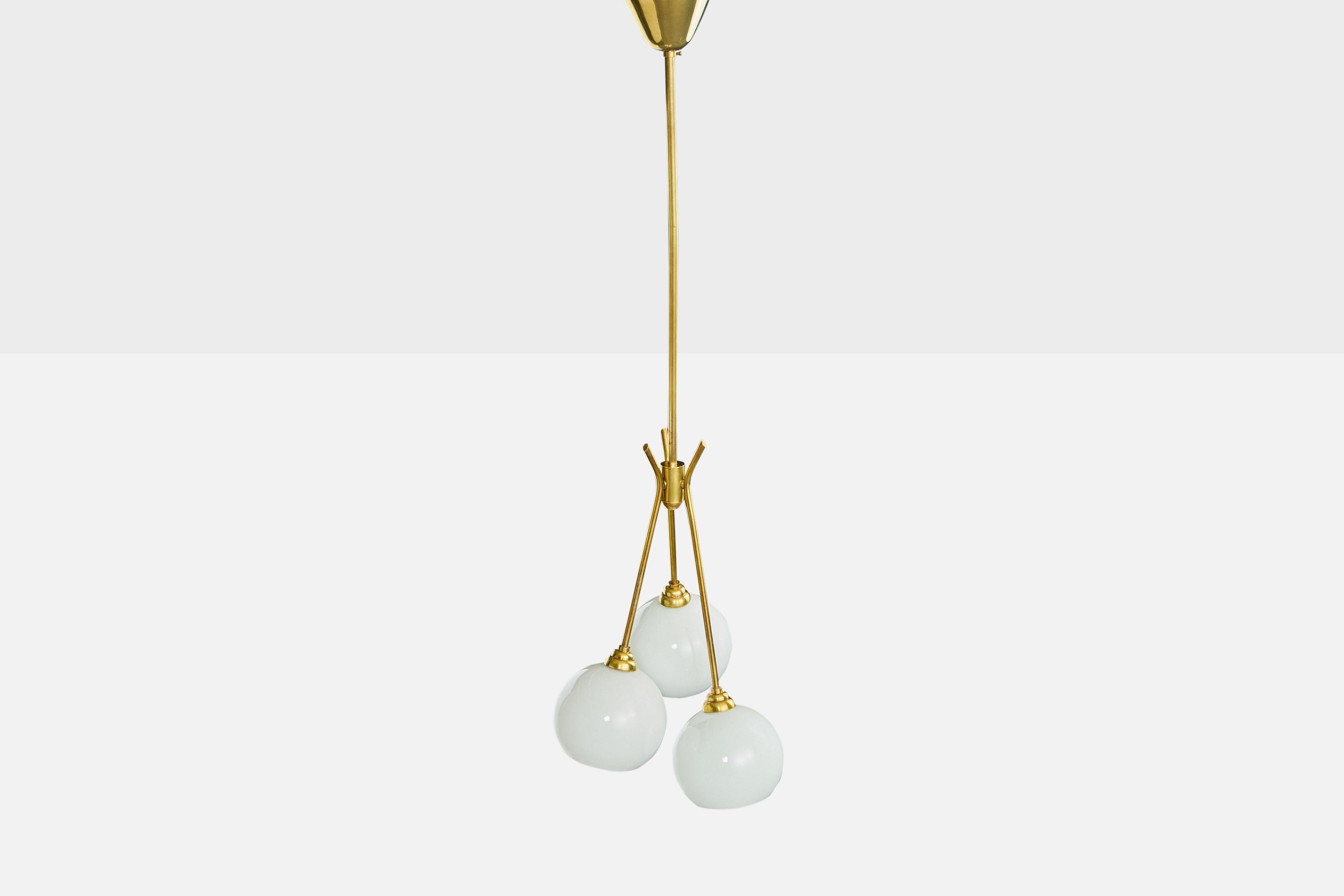 A brass and white opaline glass chandelier designed and produced in France, c. 1950s.