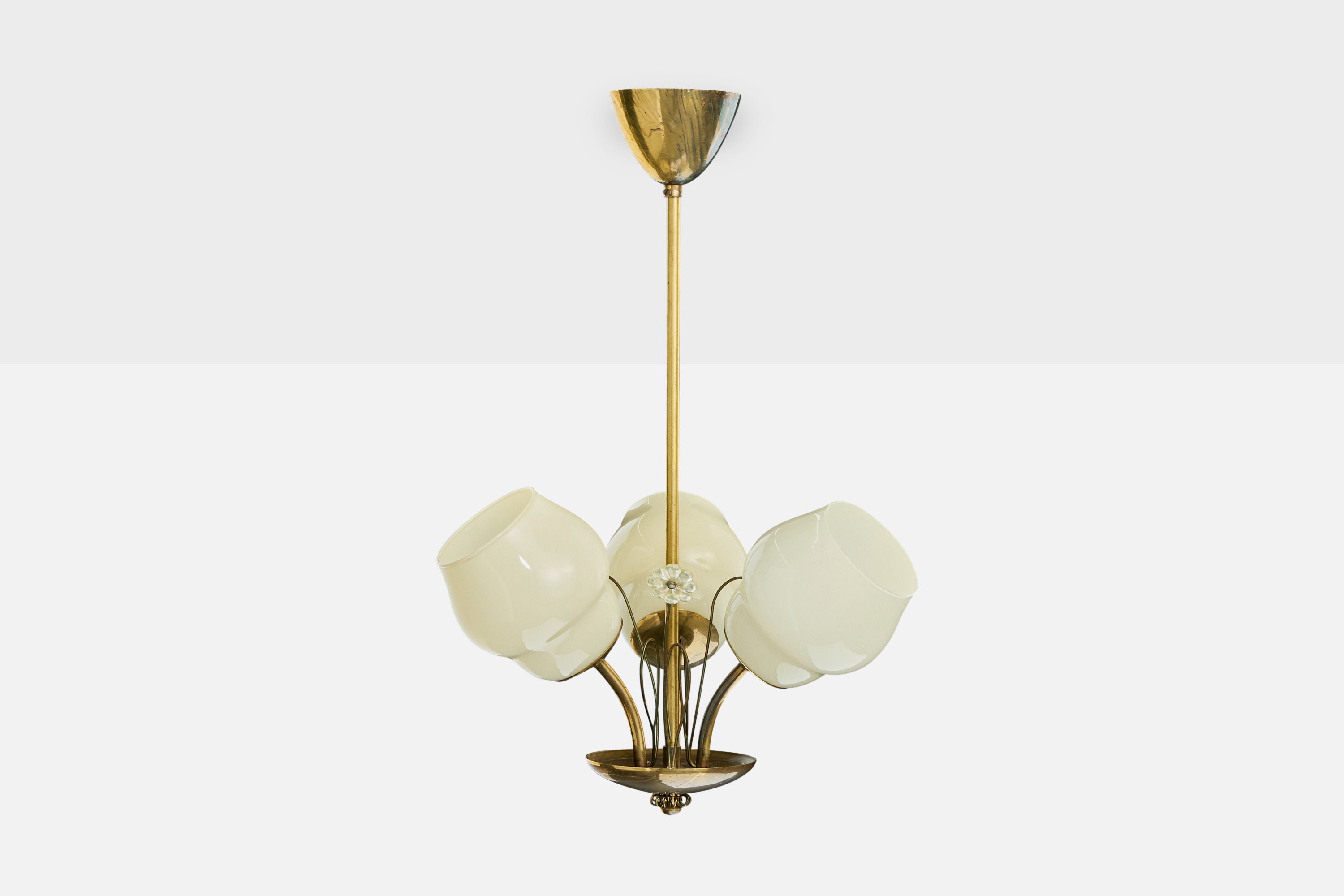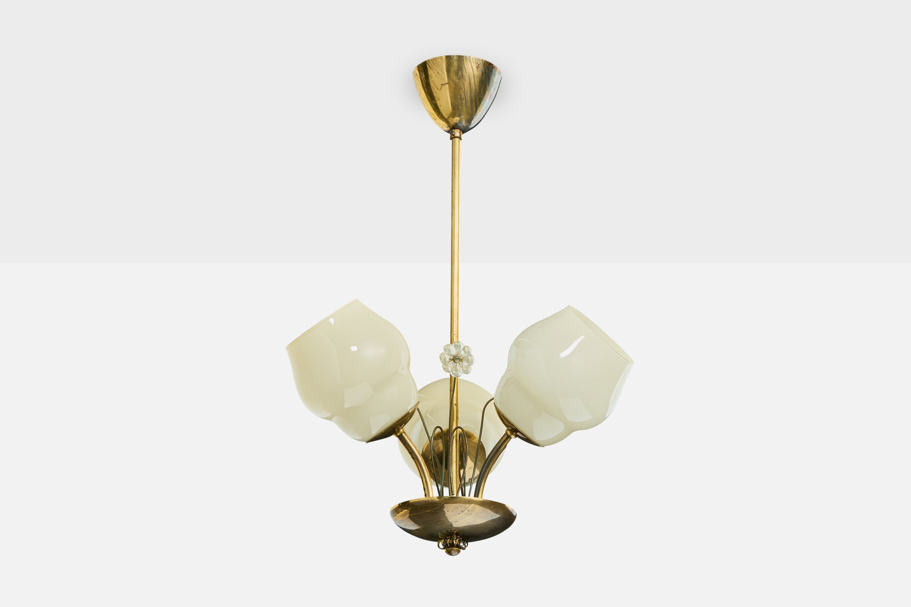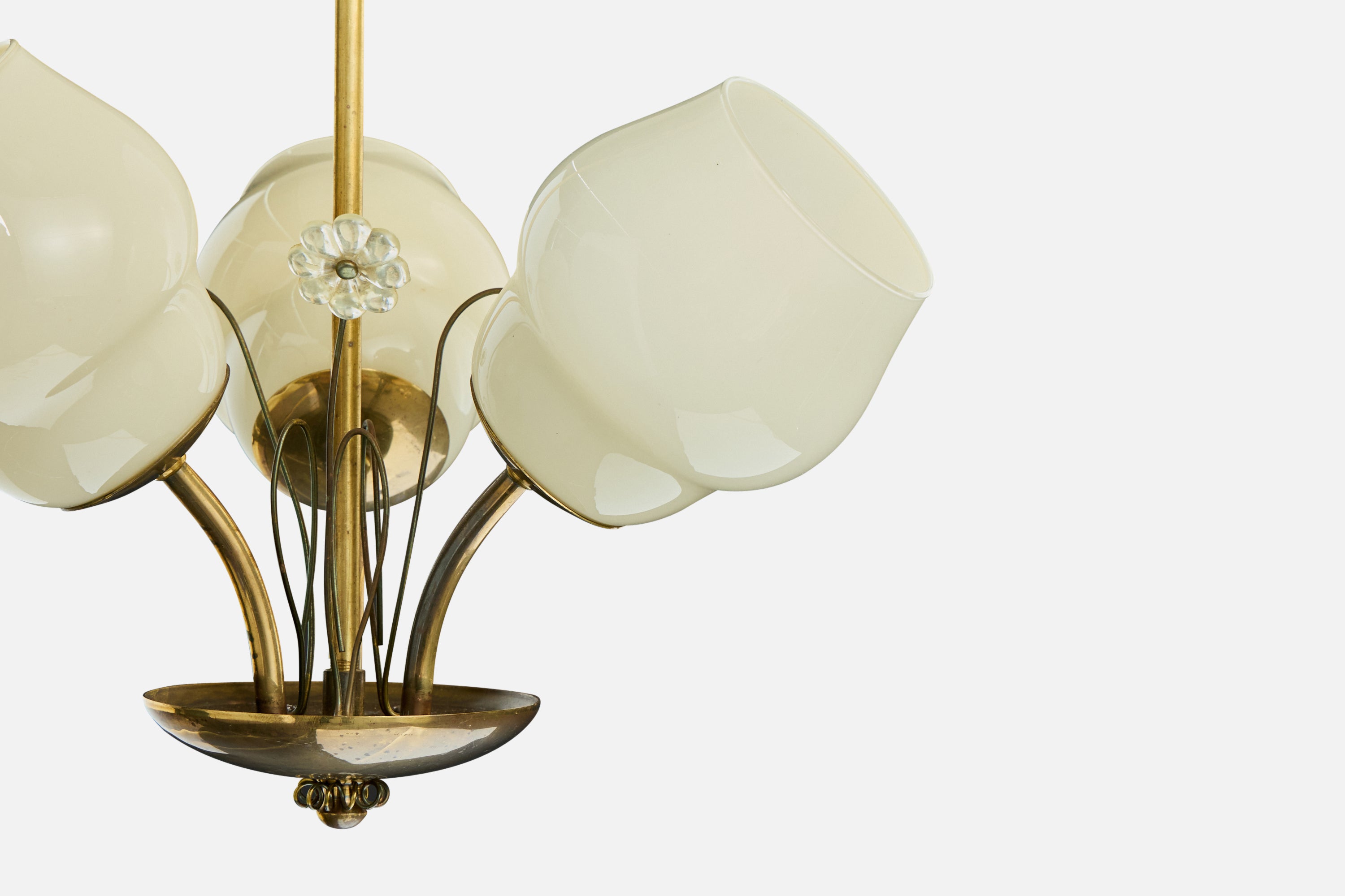 A brass, off-white opaline and crystal glass chandelier produced by Valinte, Finland, c. 1950s.