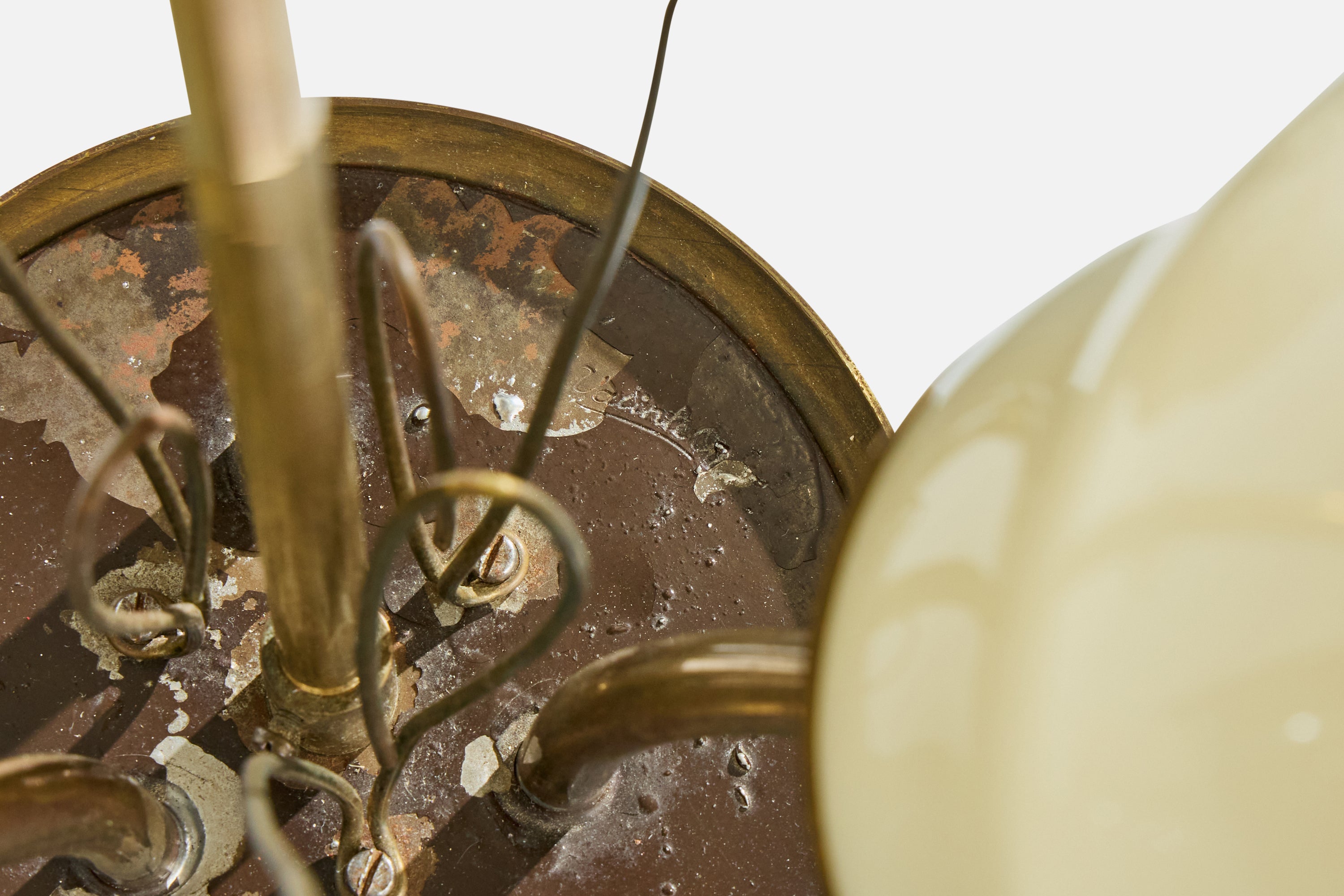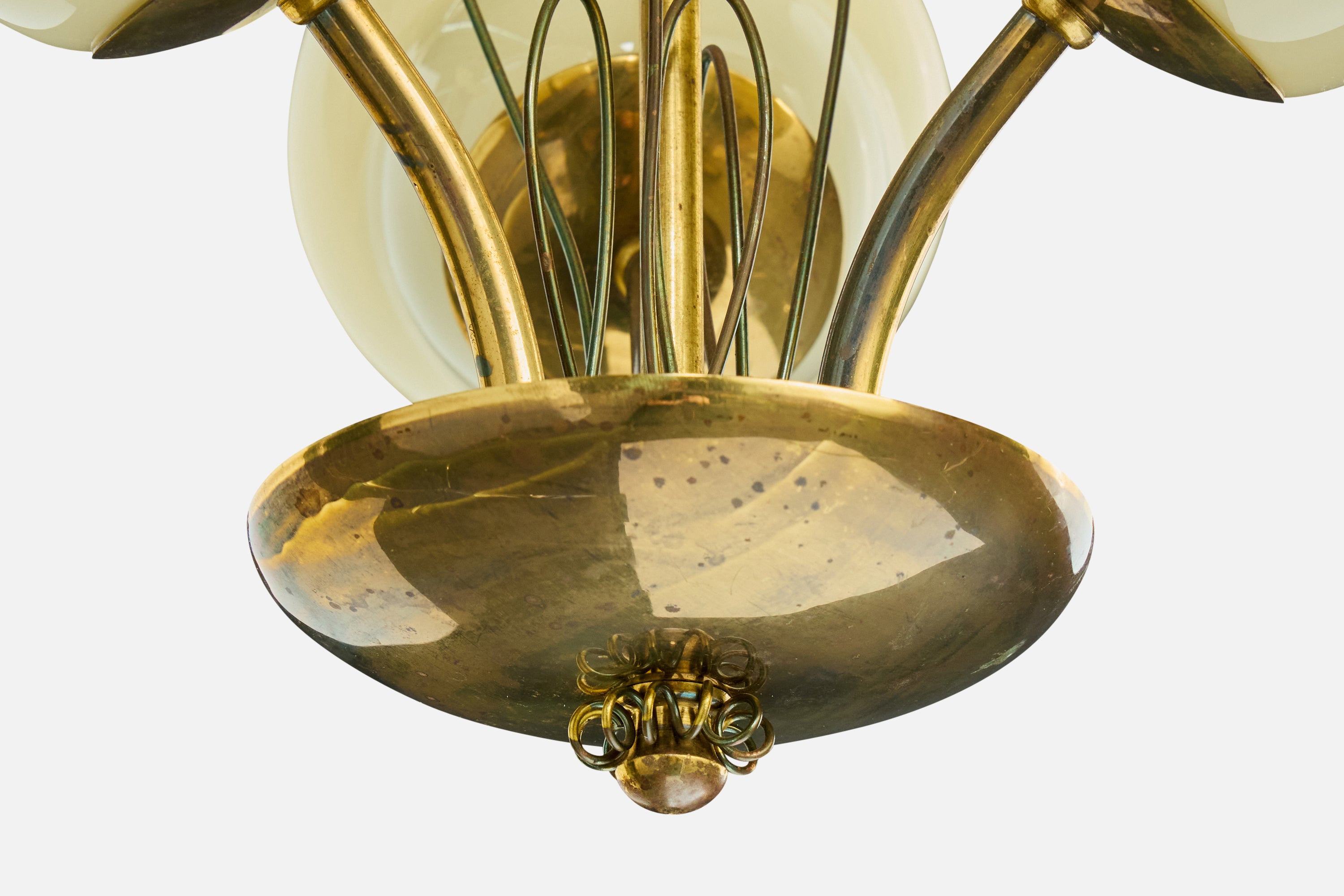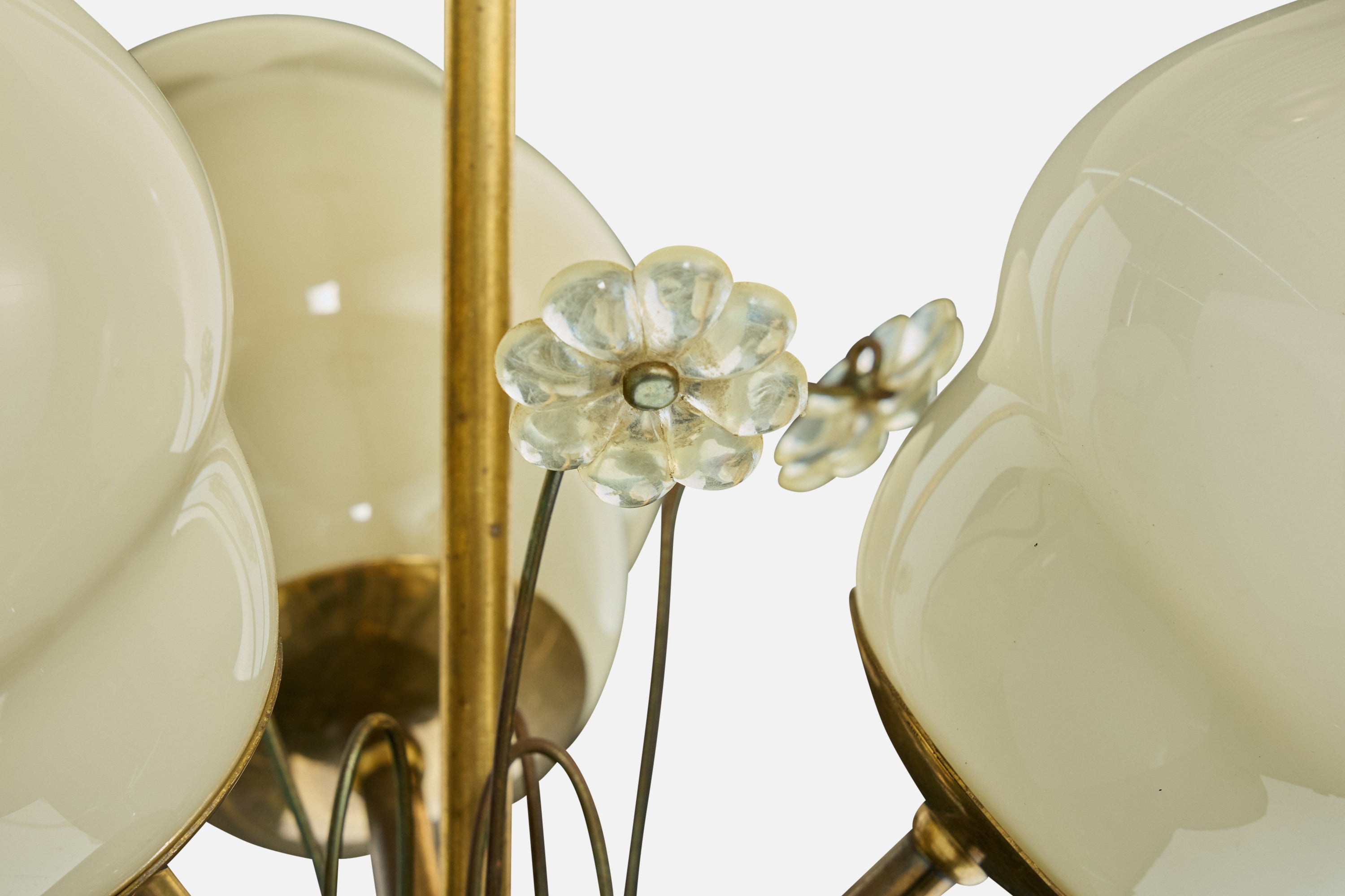 A brass, off-white opaline and crystal glass chandelier produced by Valinte, Finland, c. 1950s.