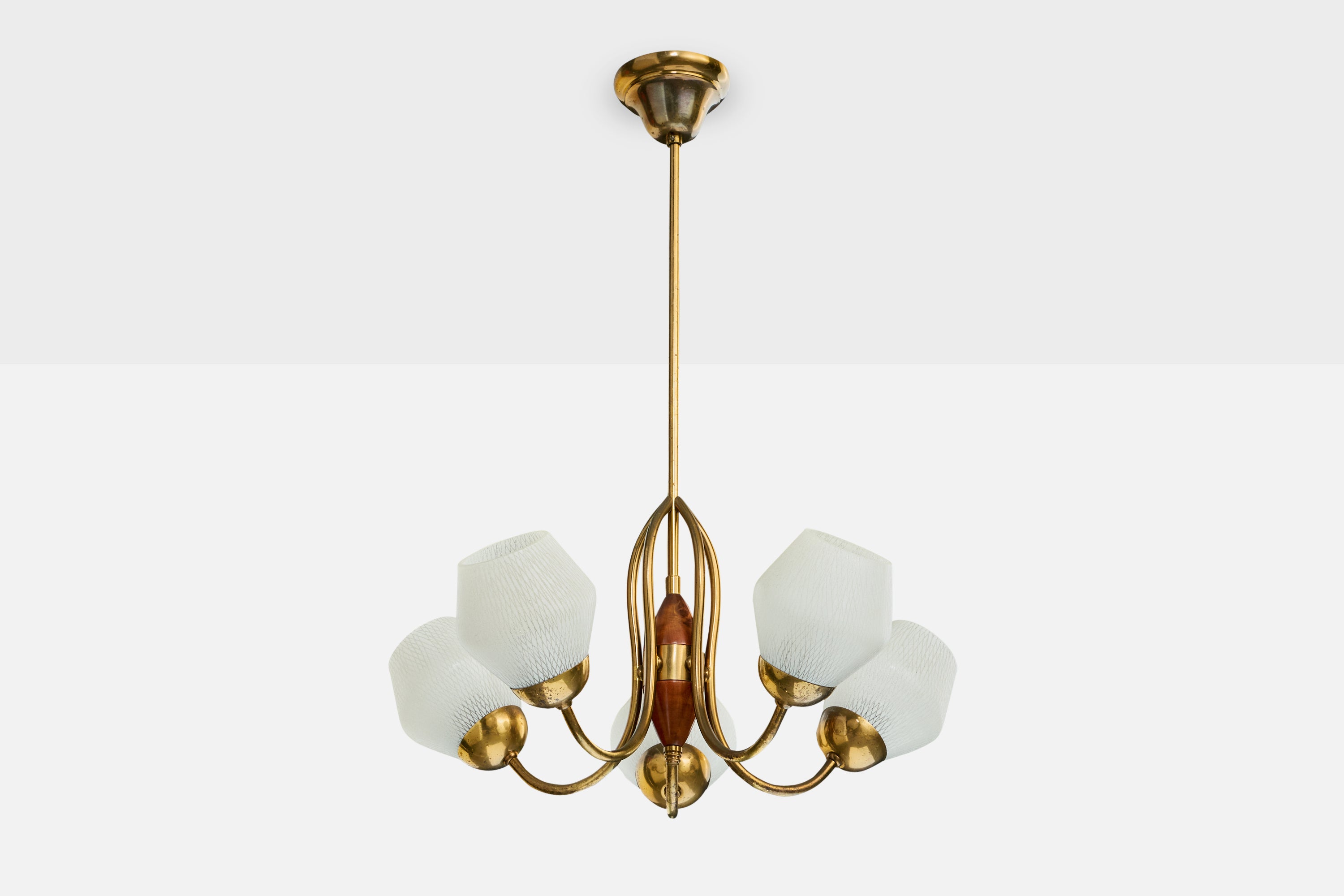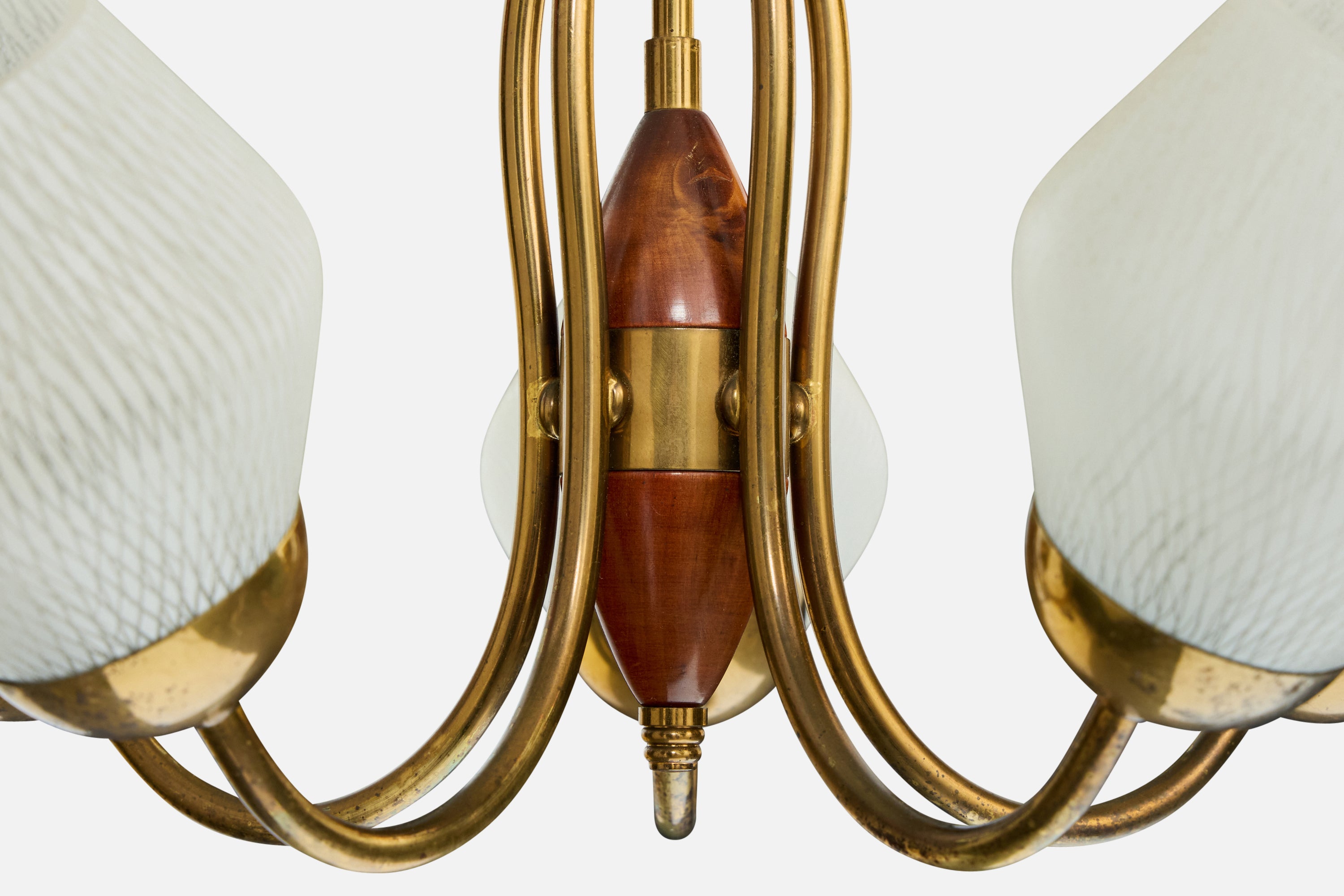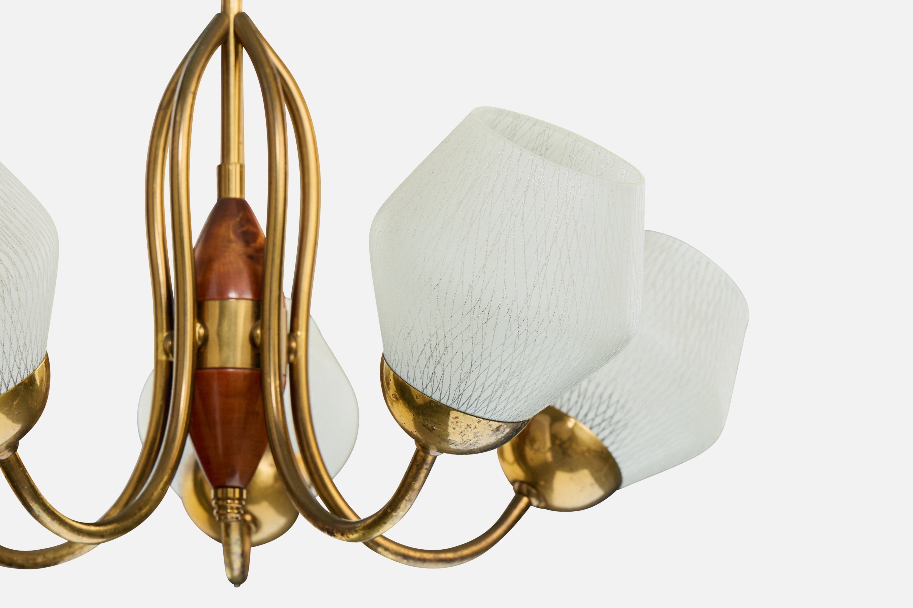 Swedish Designer, Chandelier, Brass, Wood, Glass, Sweden, 1950s
