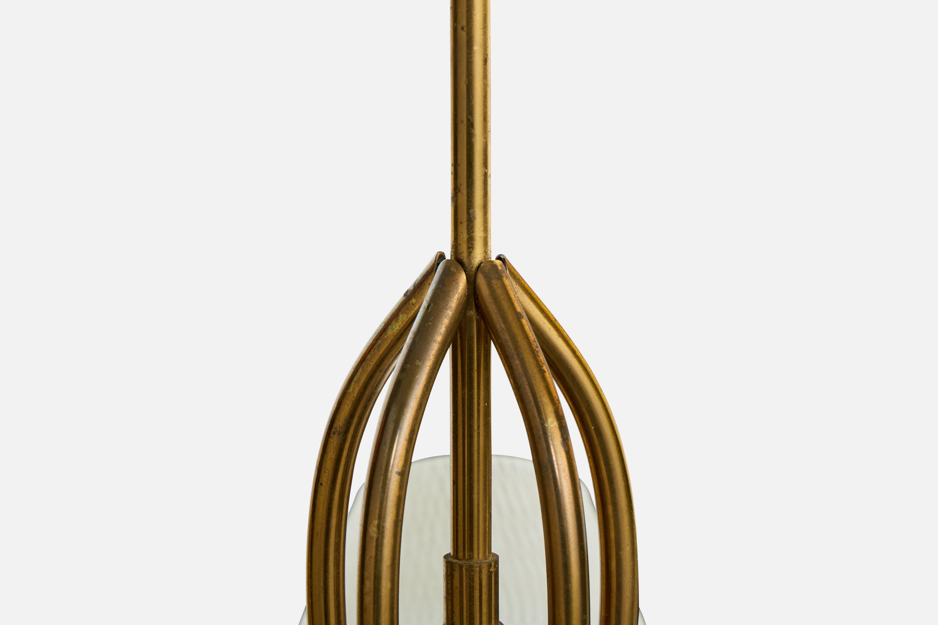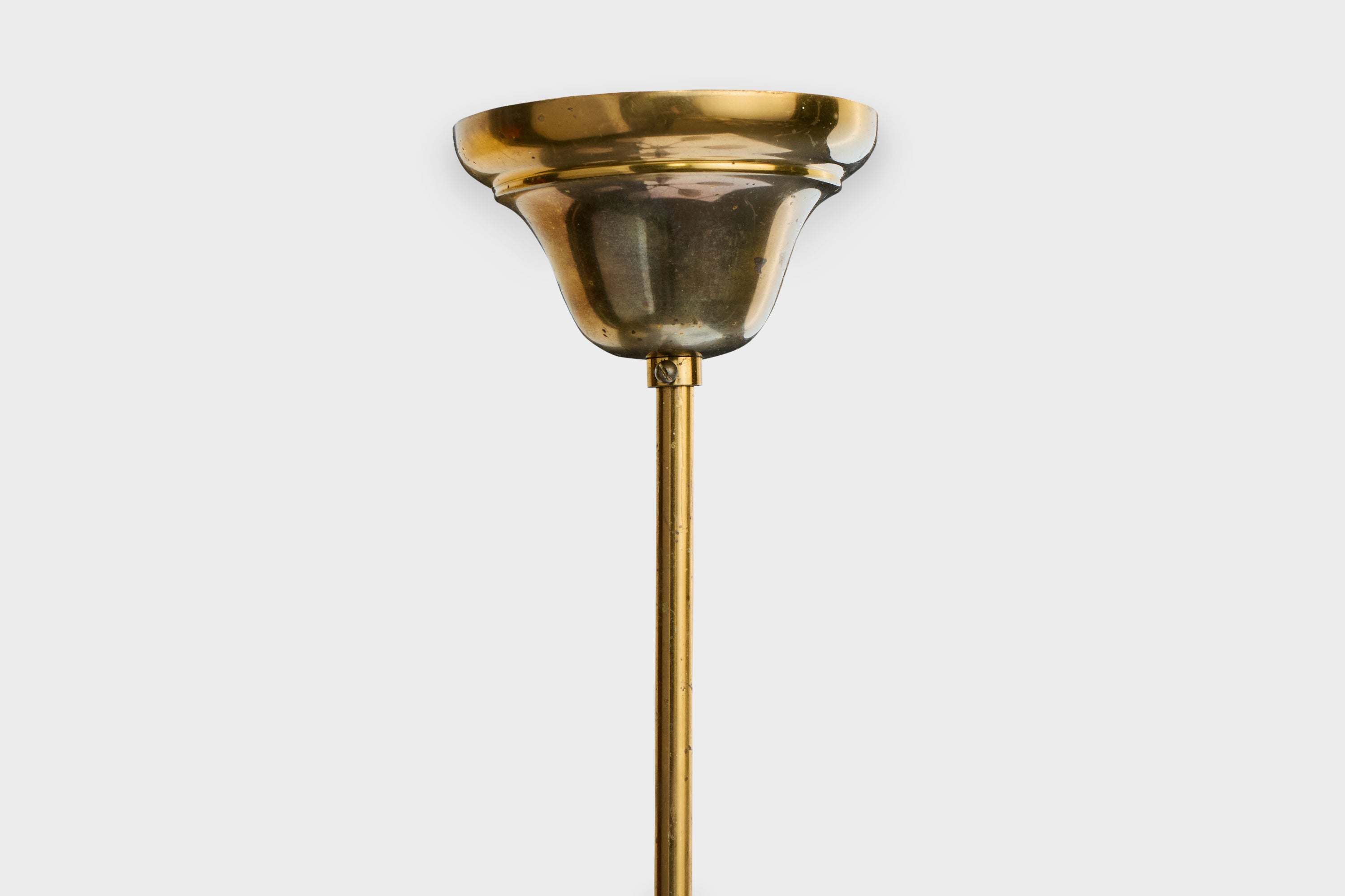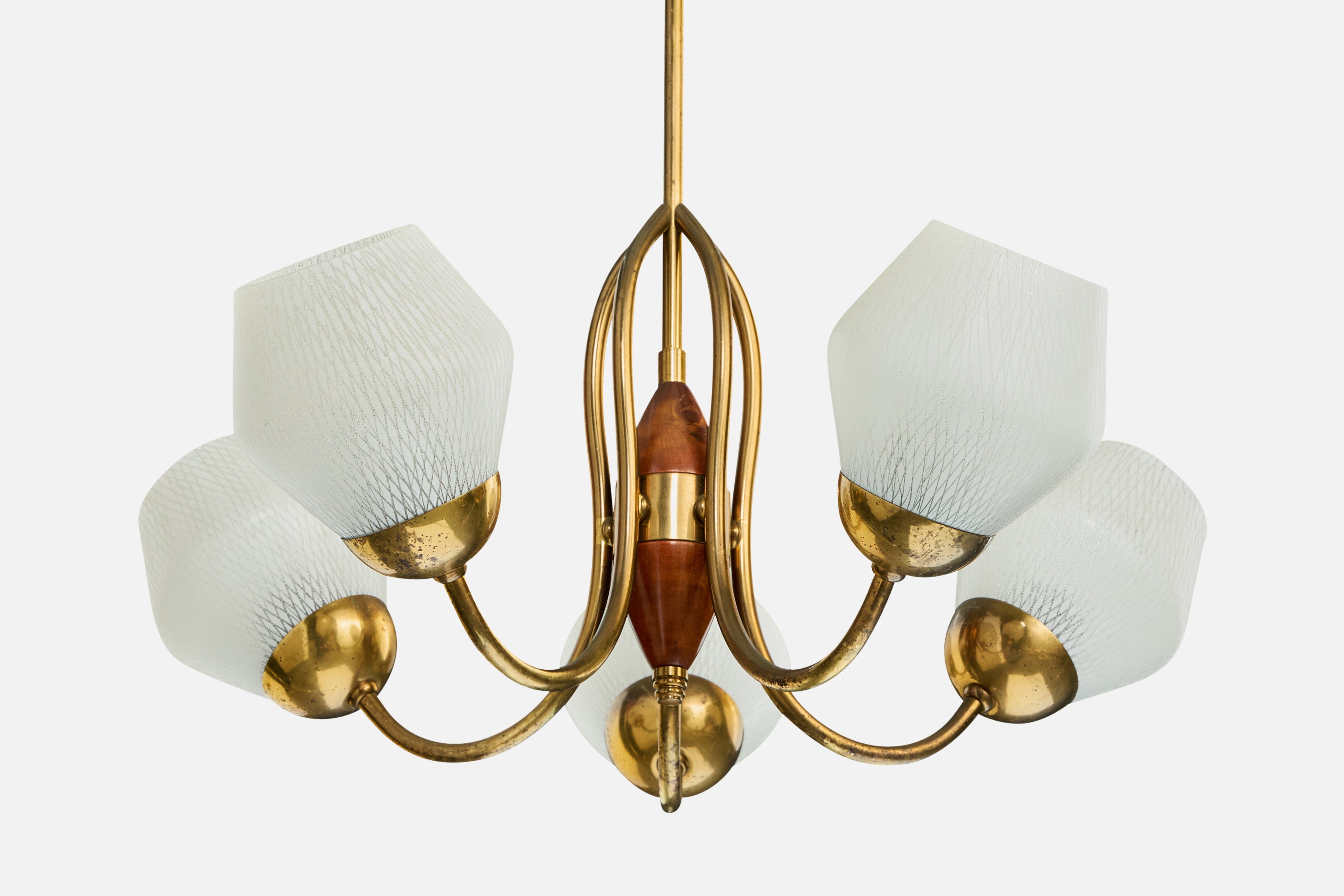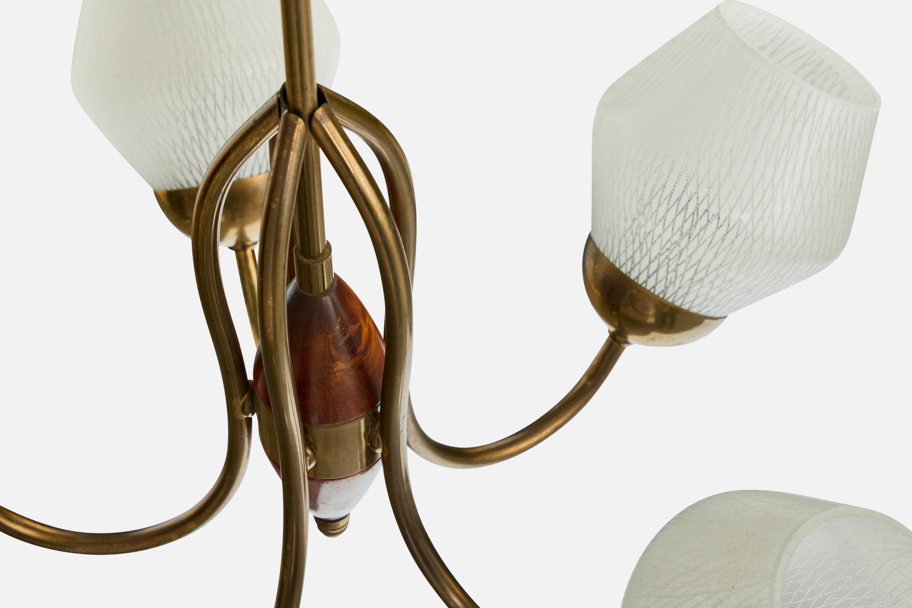 Swedish Designer, Chandelier, Brass, Wood, Glass, Sweden, 1950s