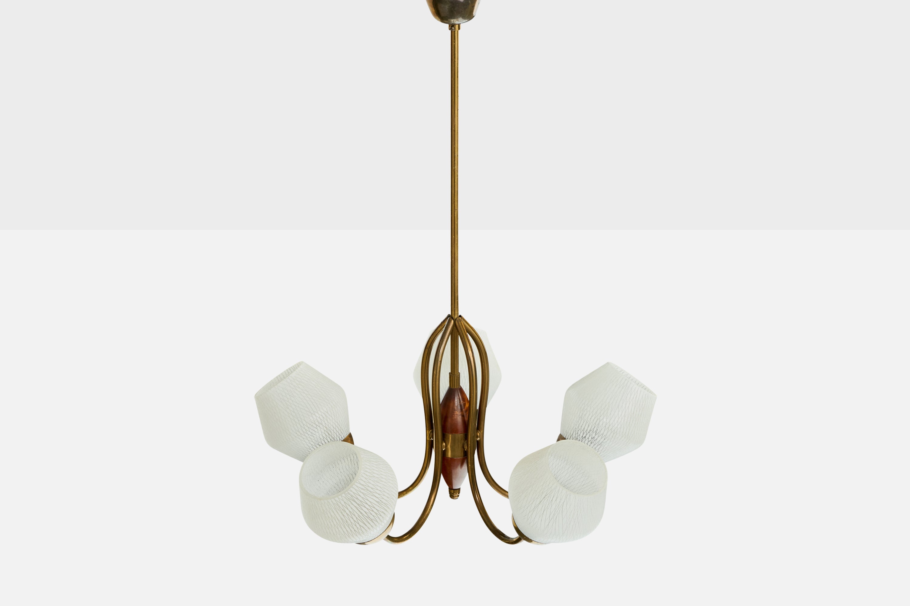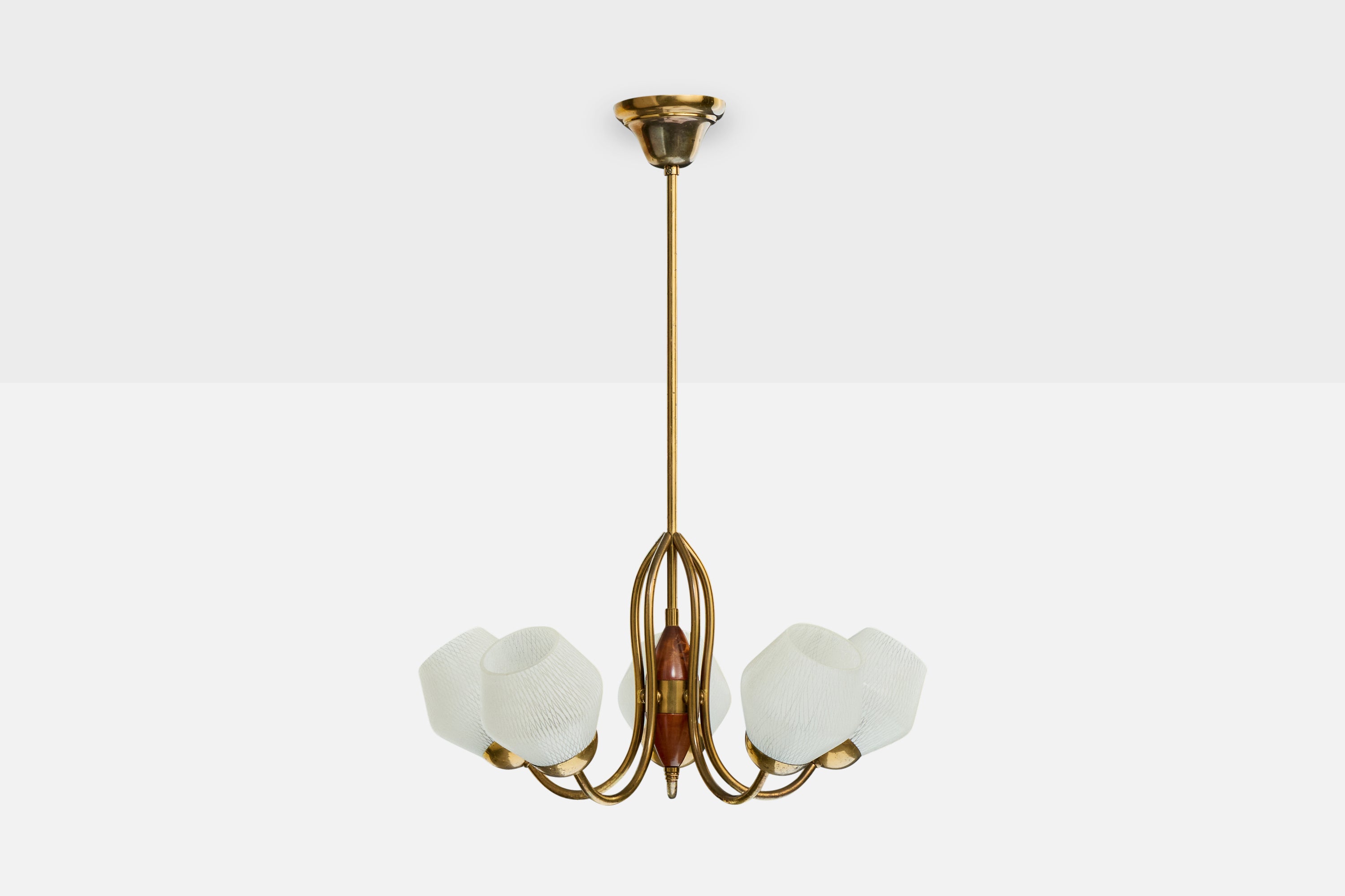 A brass, wood and white opaline glass chandelier designed and produced in Sweden, c. 1950s.
