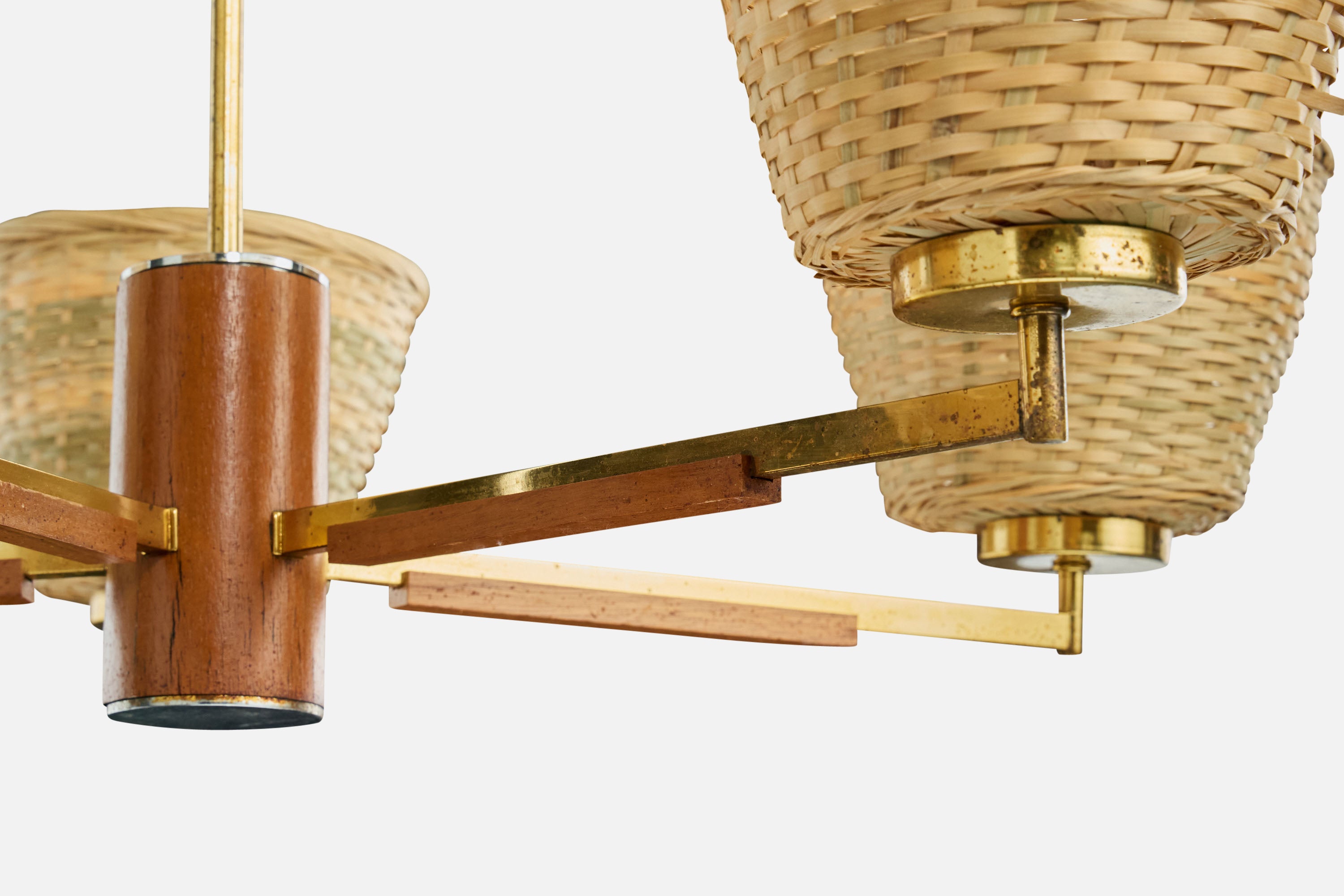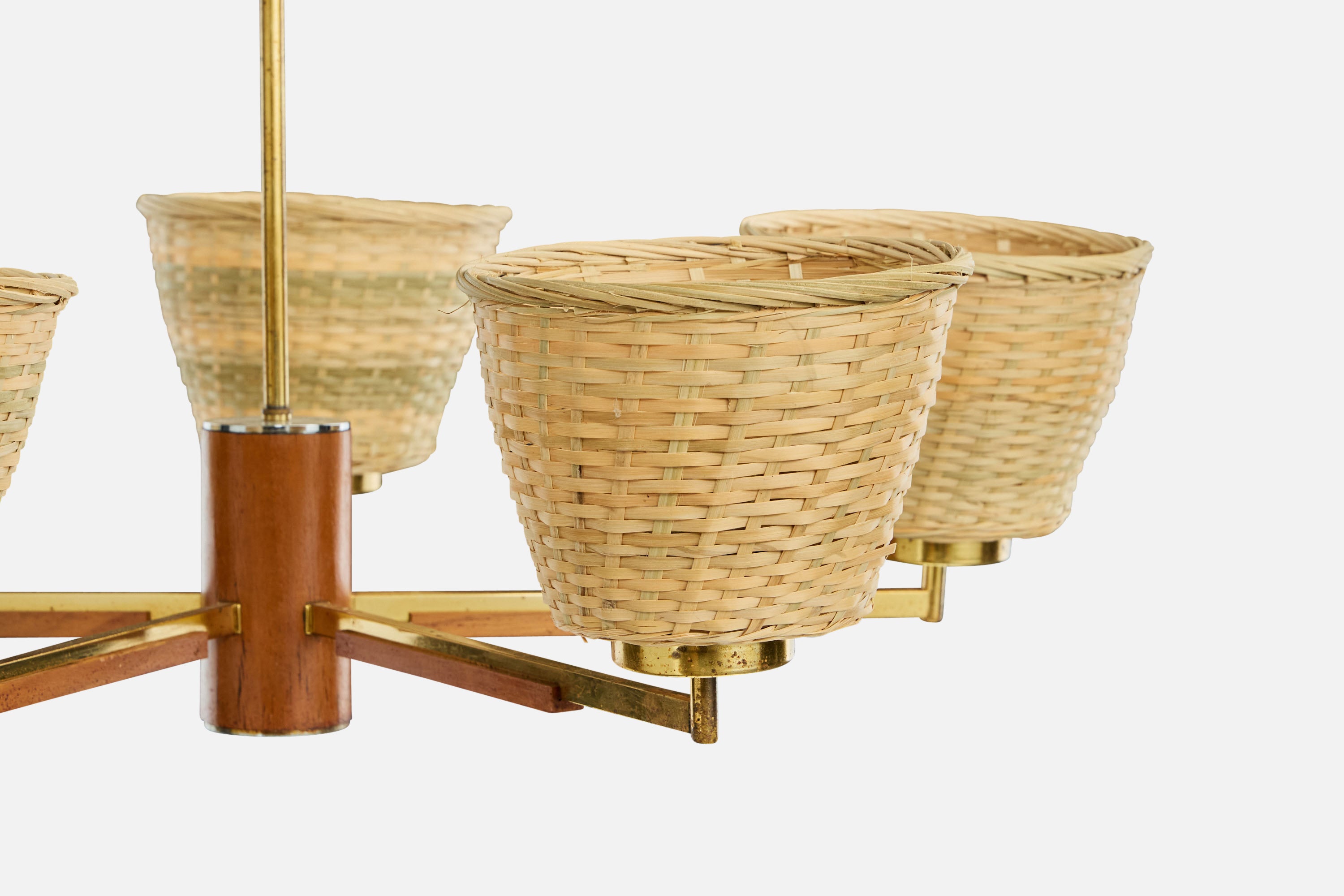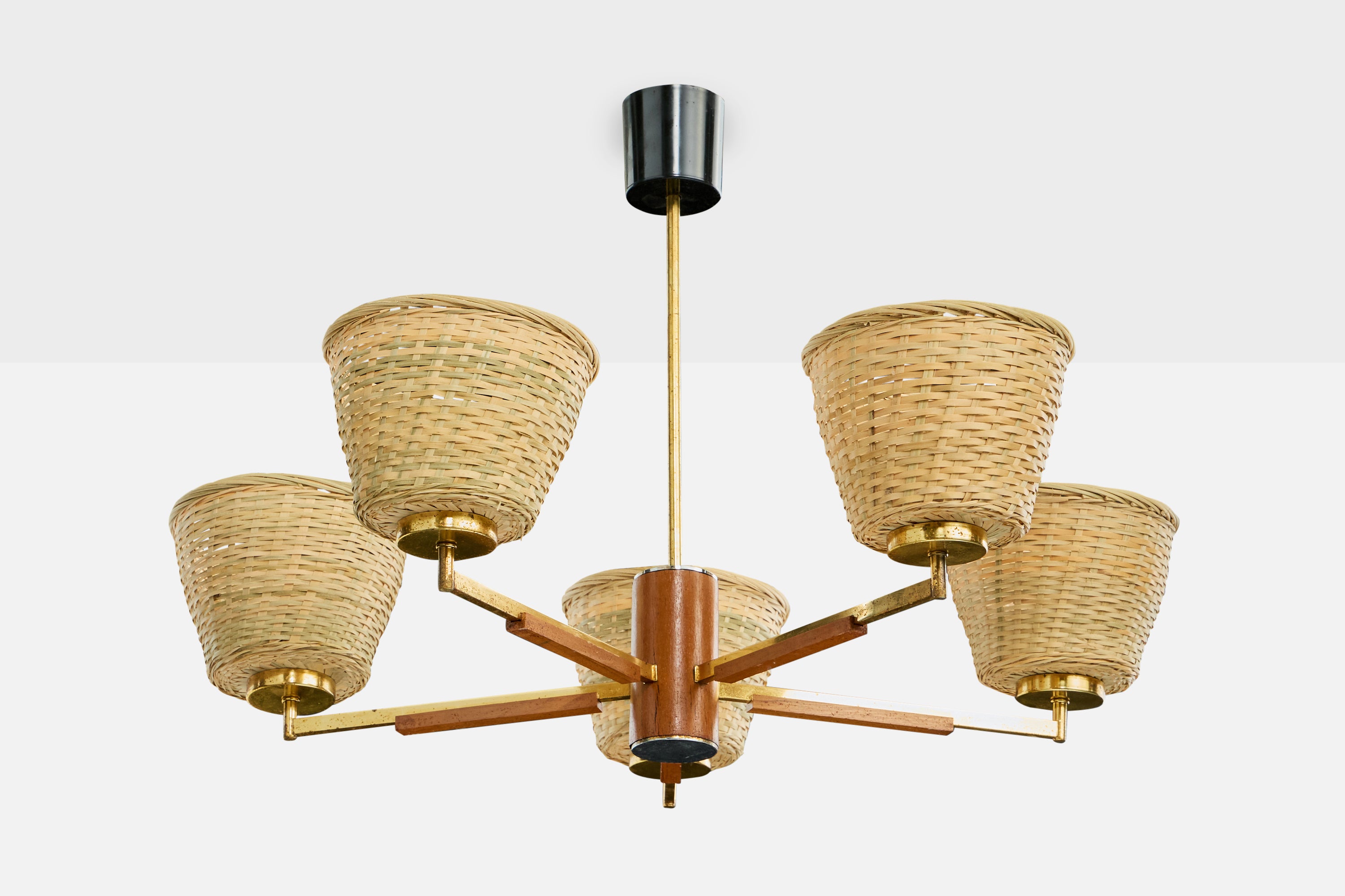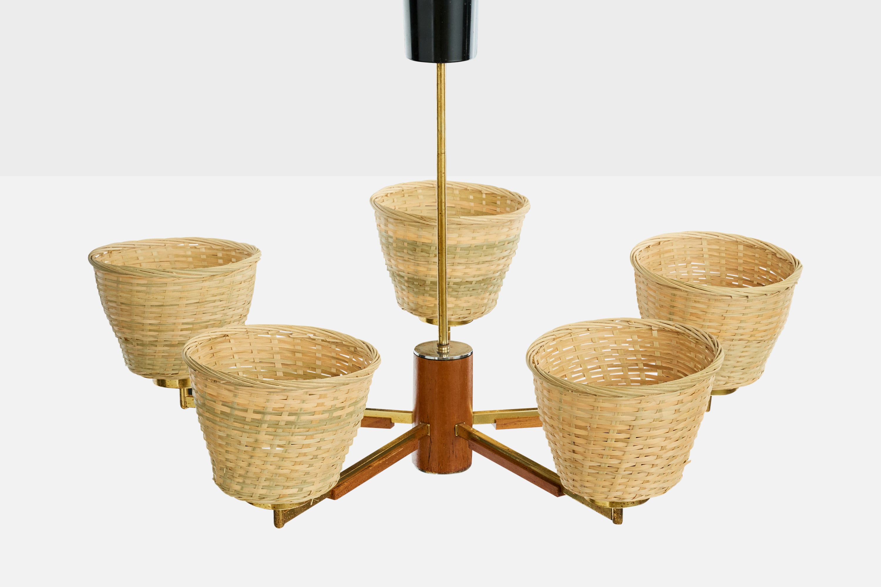 A brass, teak and rattan chandelier designed and produced in Sweden, c. 1950s.
