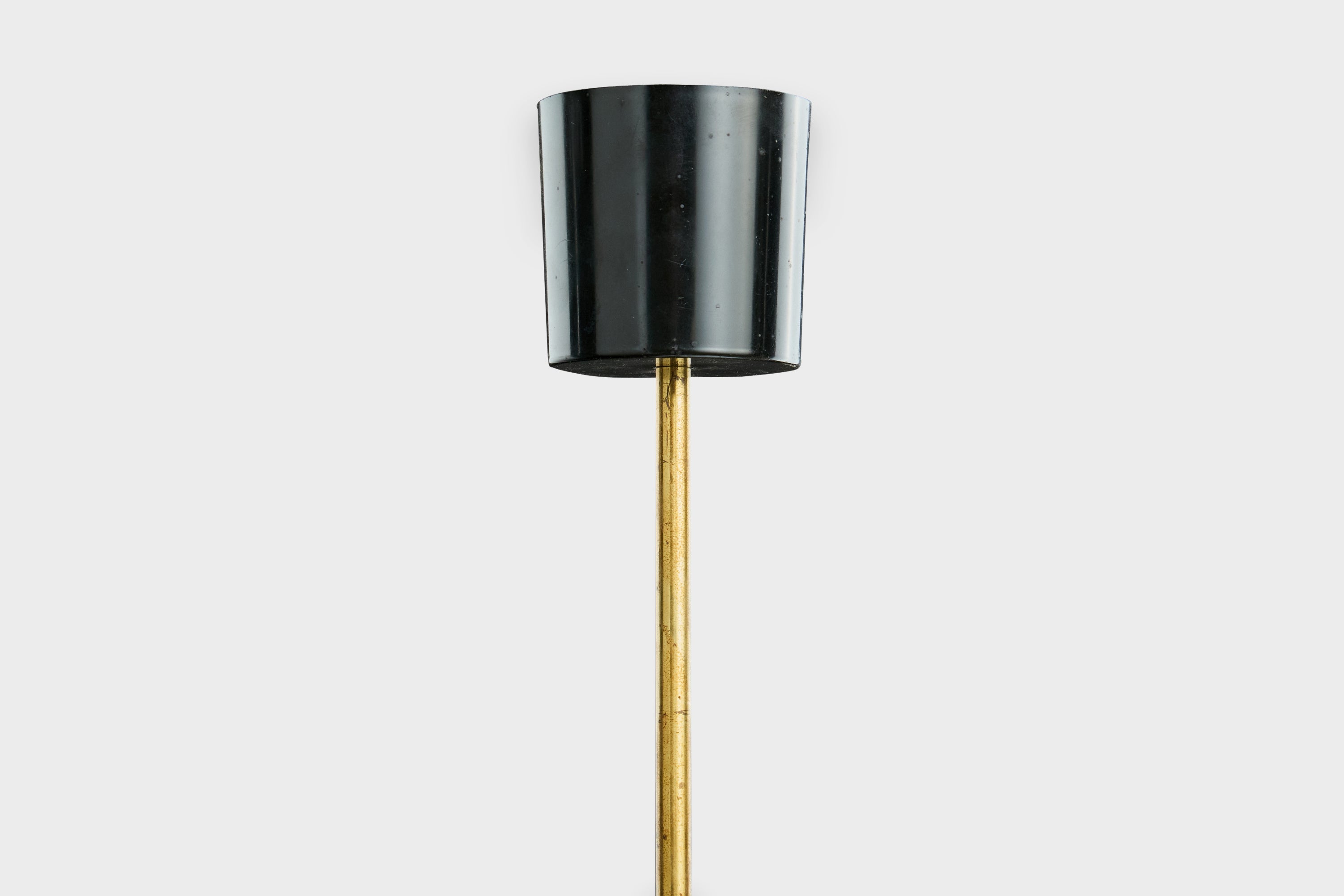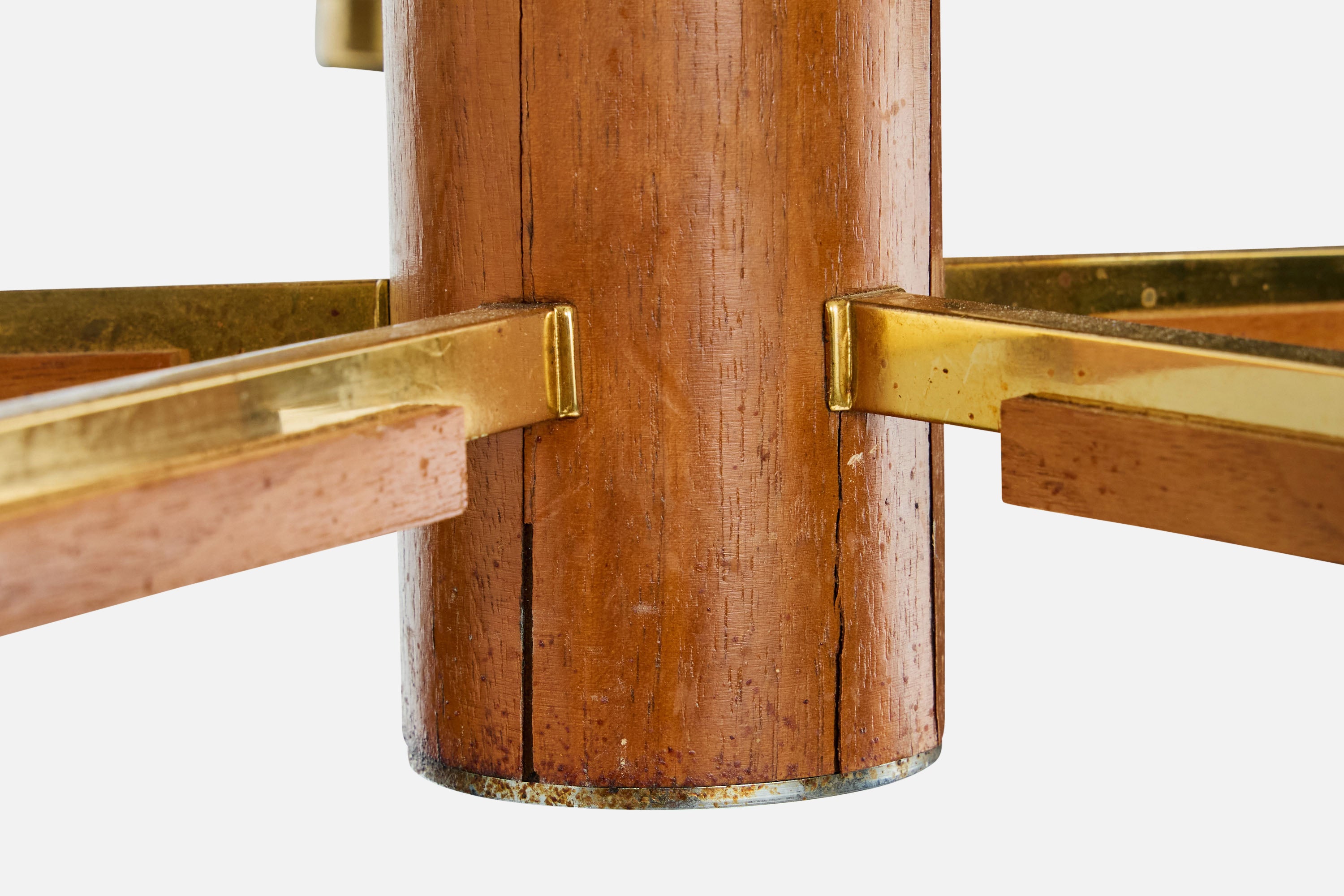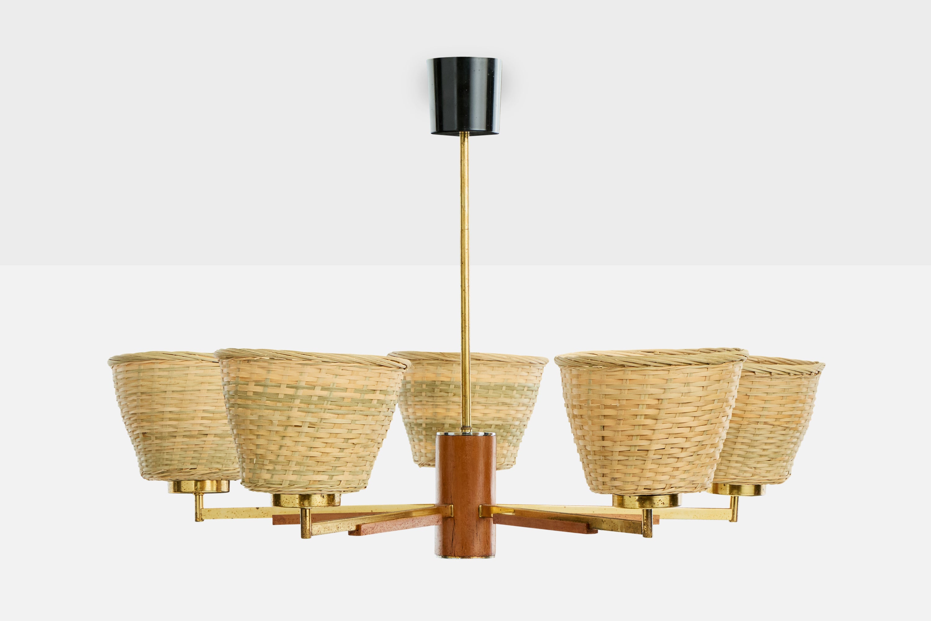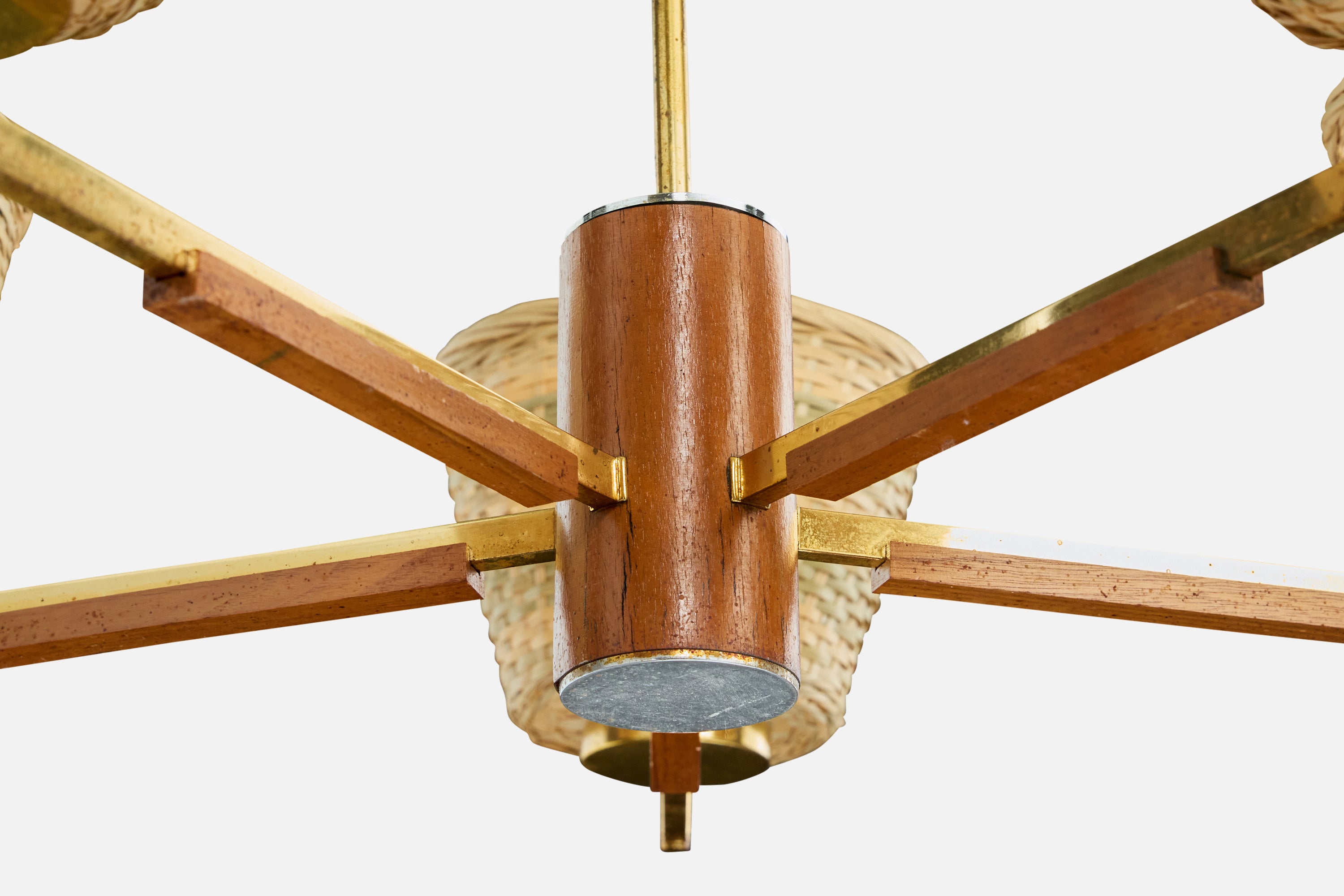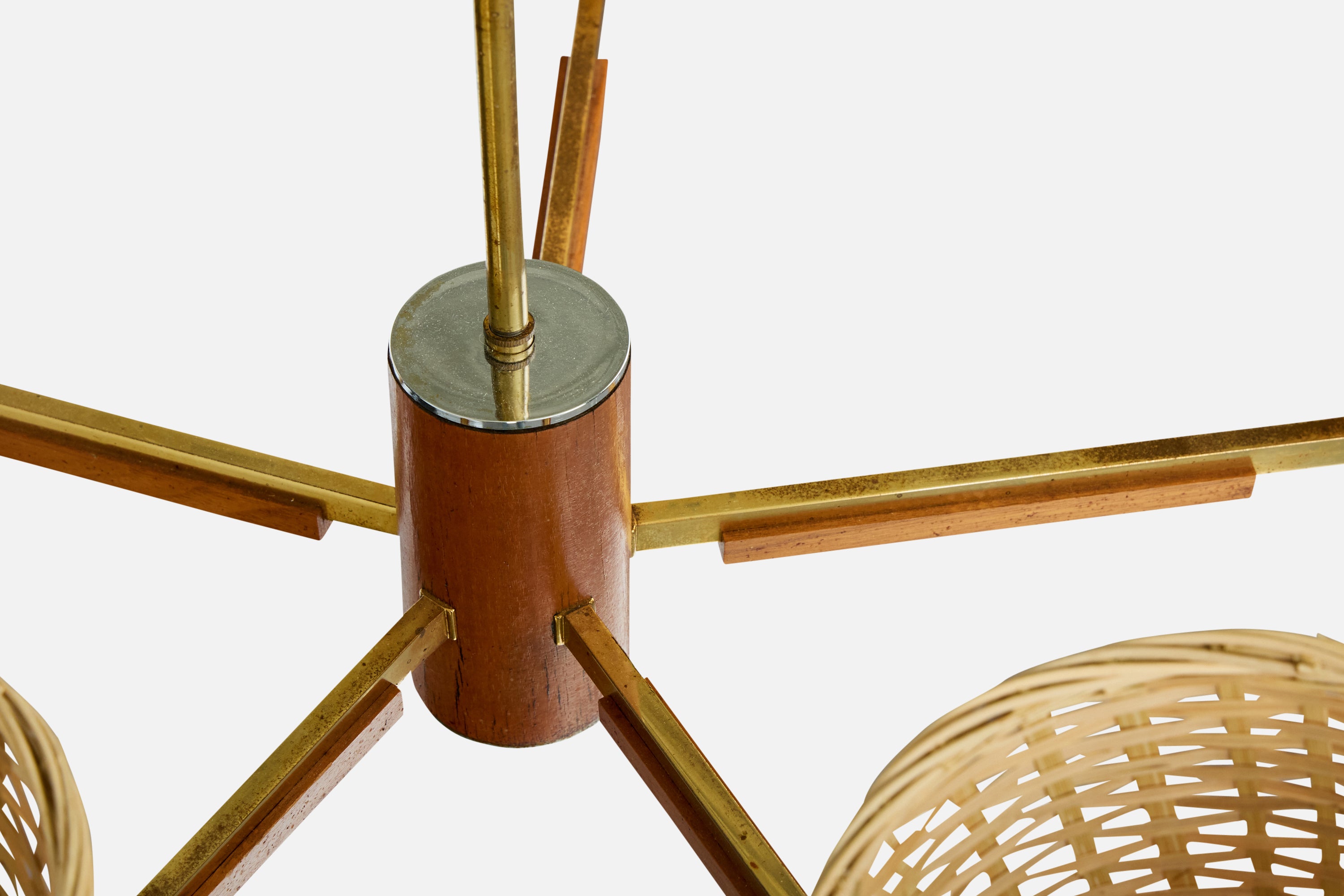 A brass, teak and rattan chandelier designed and produced in Sweden, c. 1950s.