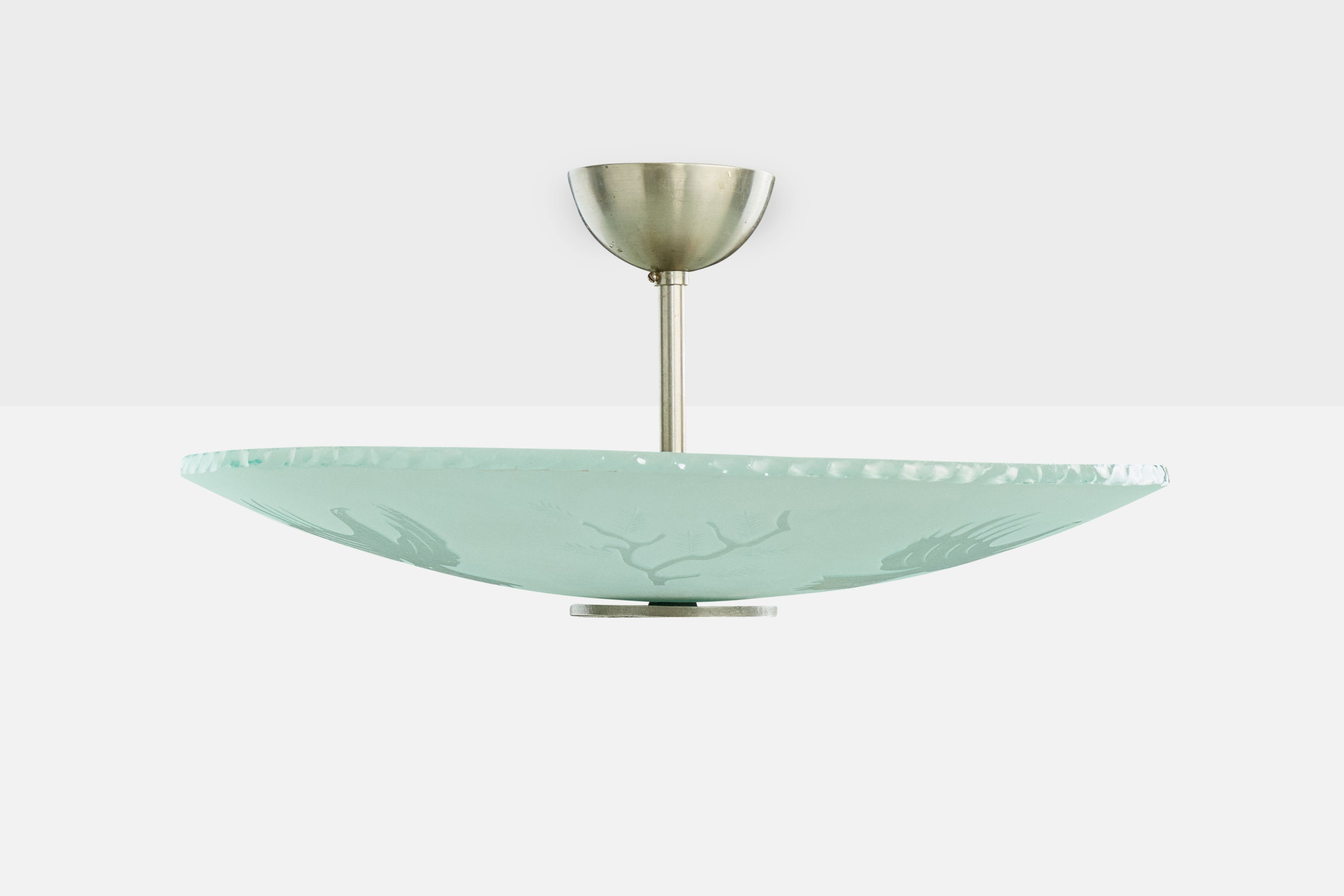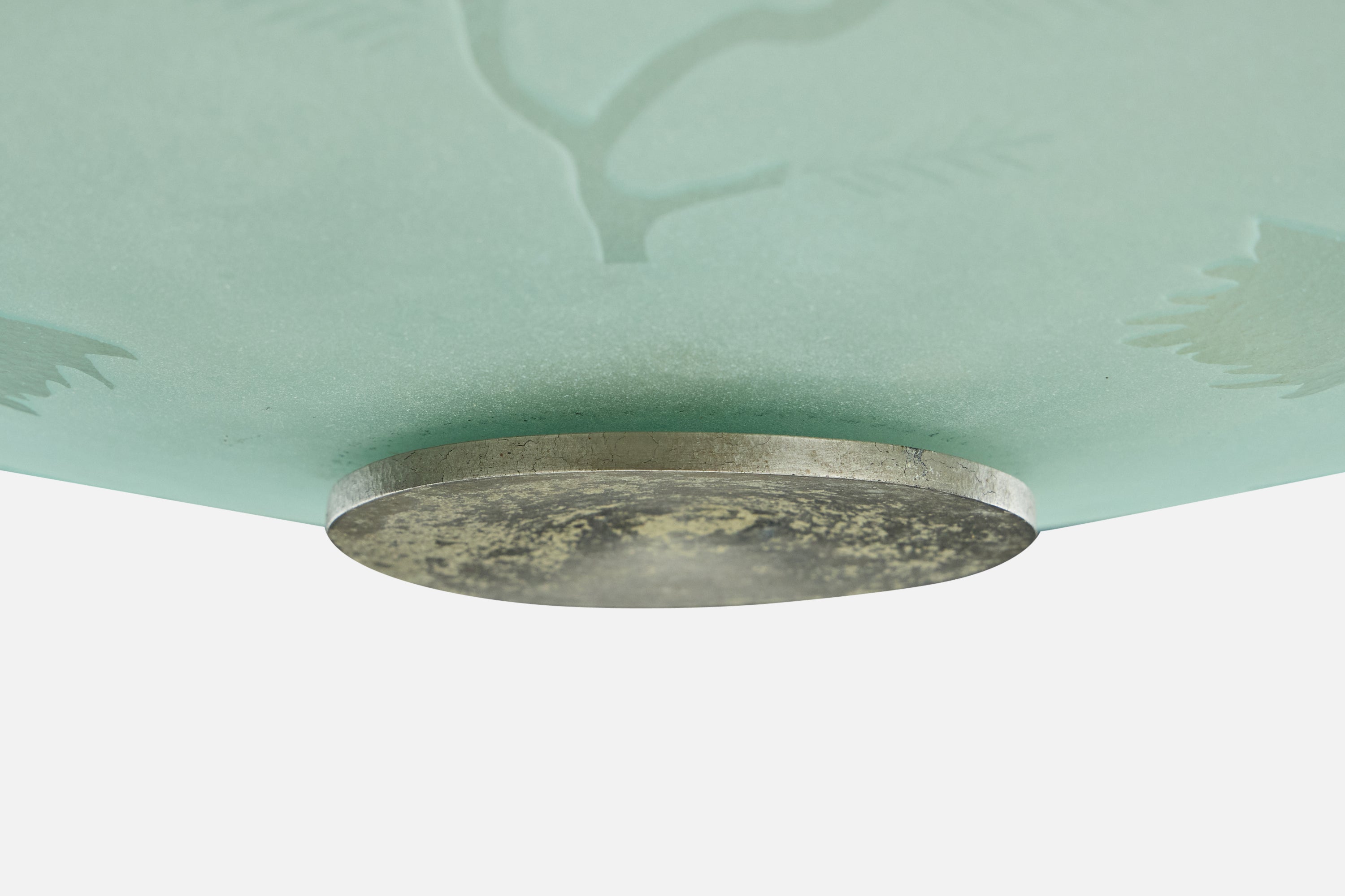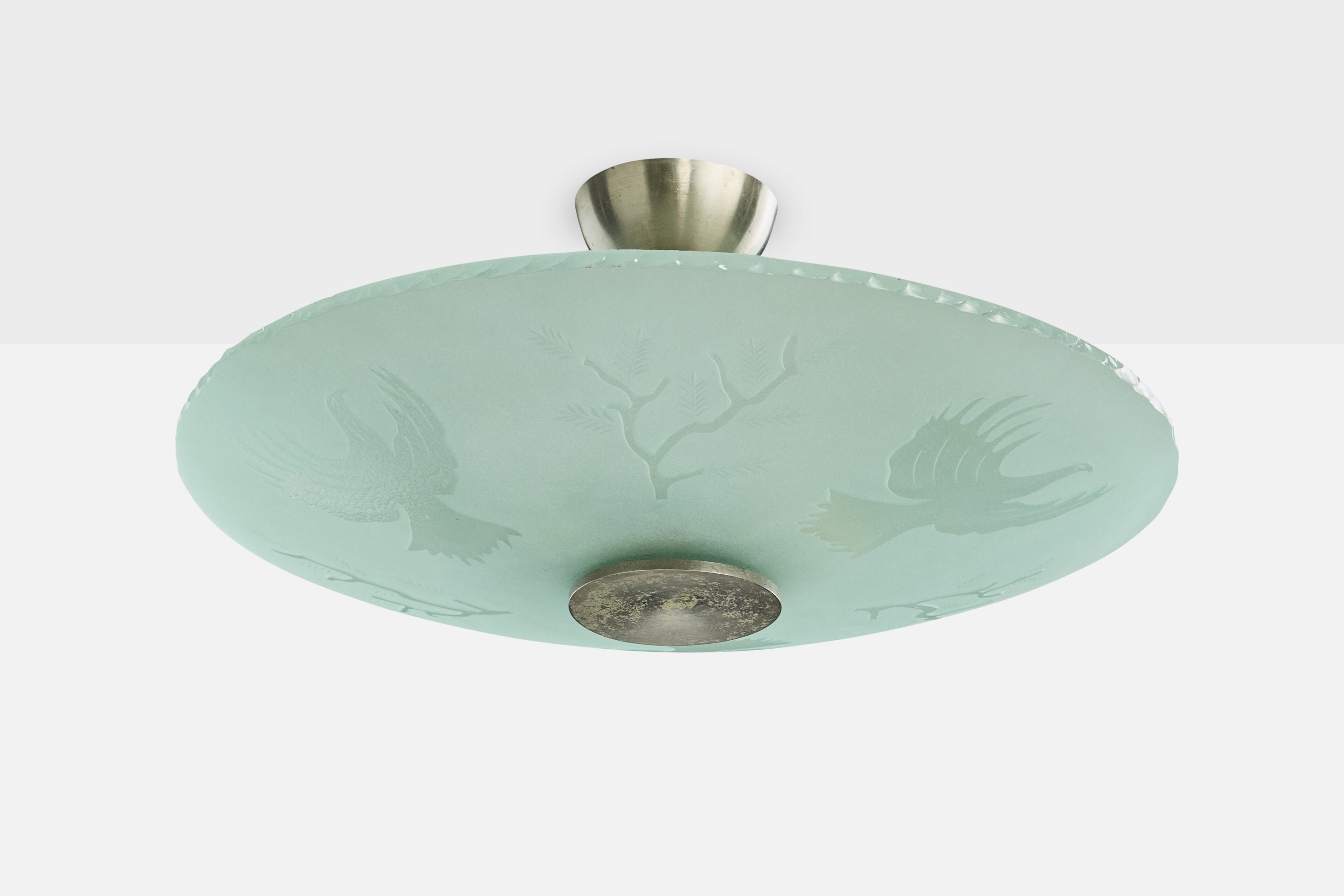 A sand-blasted glass and metal flush mount with etched motifs designed and produced in Sweden, c. 1940s.