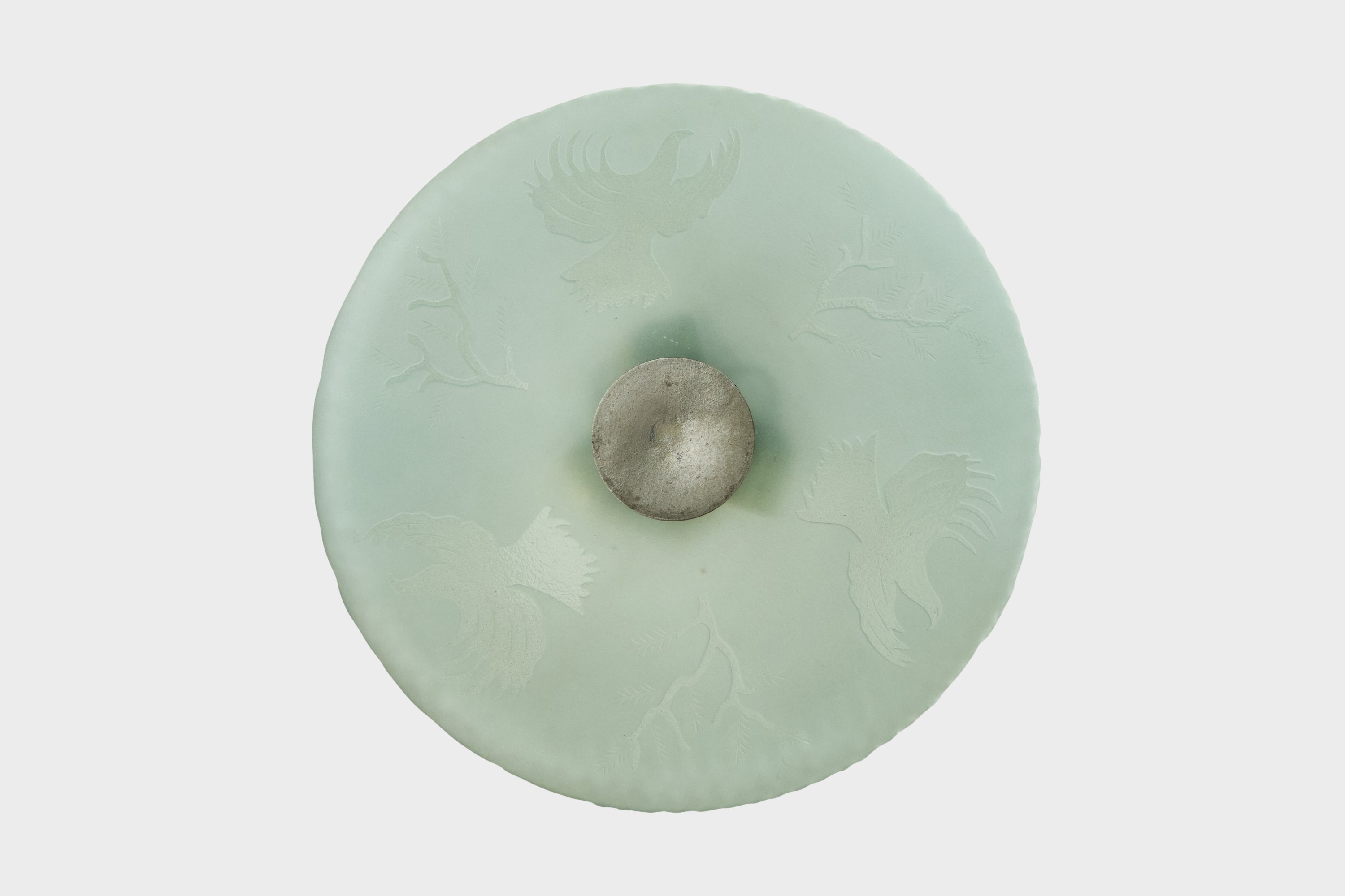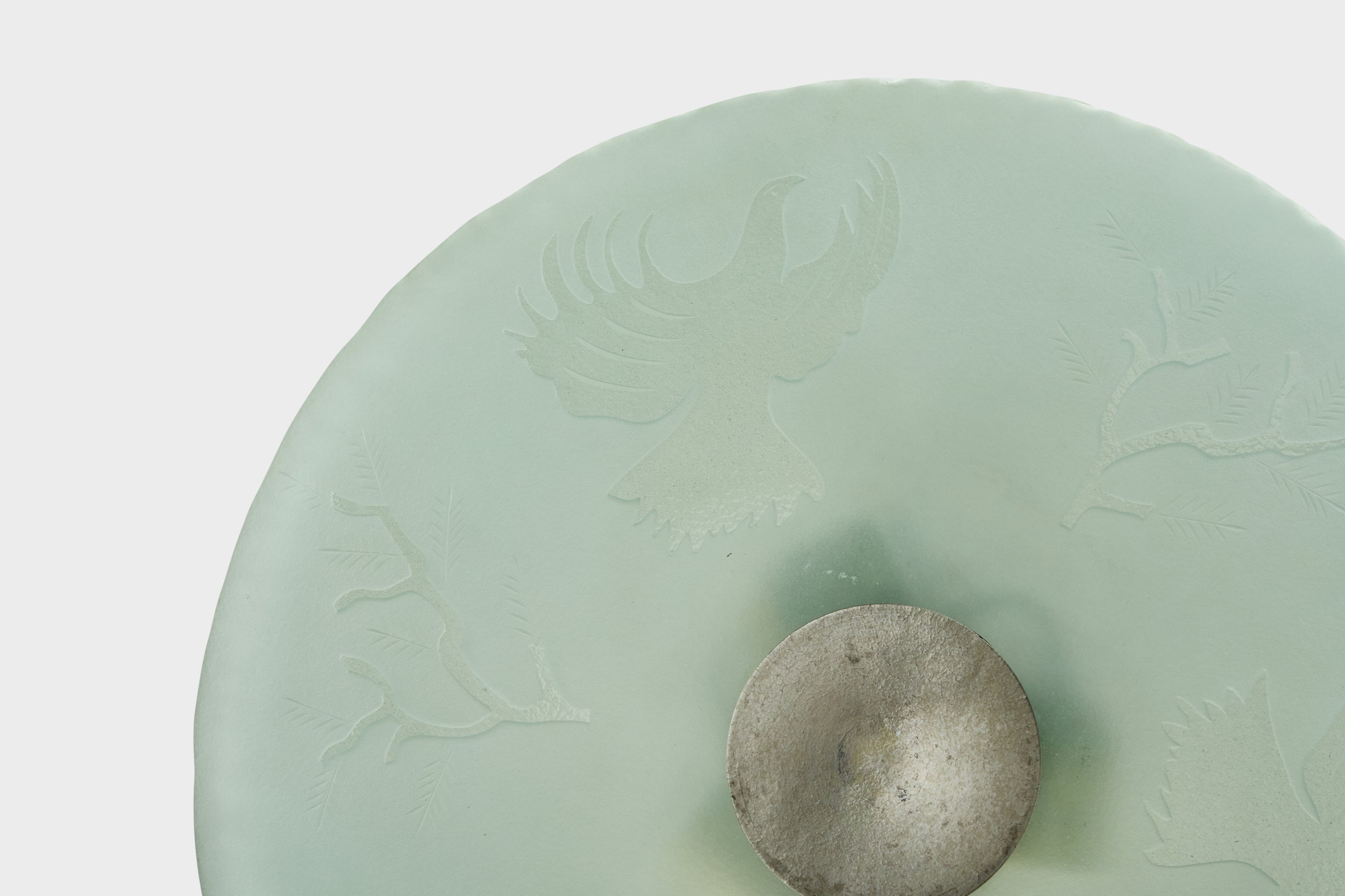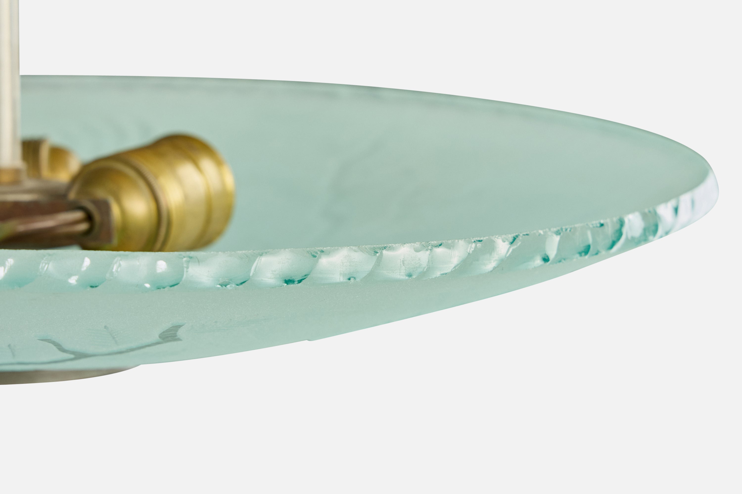 A sand-blasted glass and metal flush mount with etched motifs designed and produced in Sweden, c. 1940s.