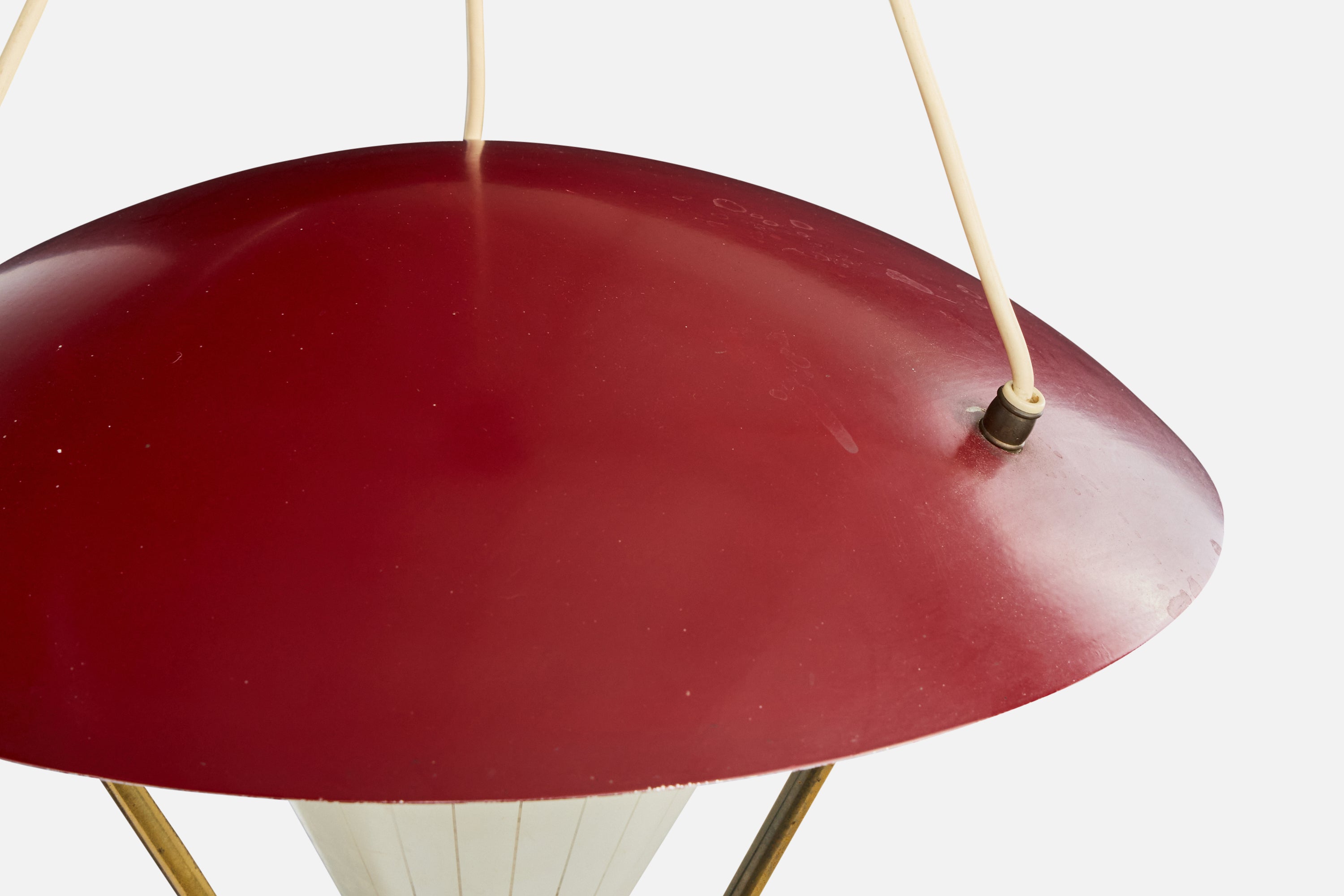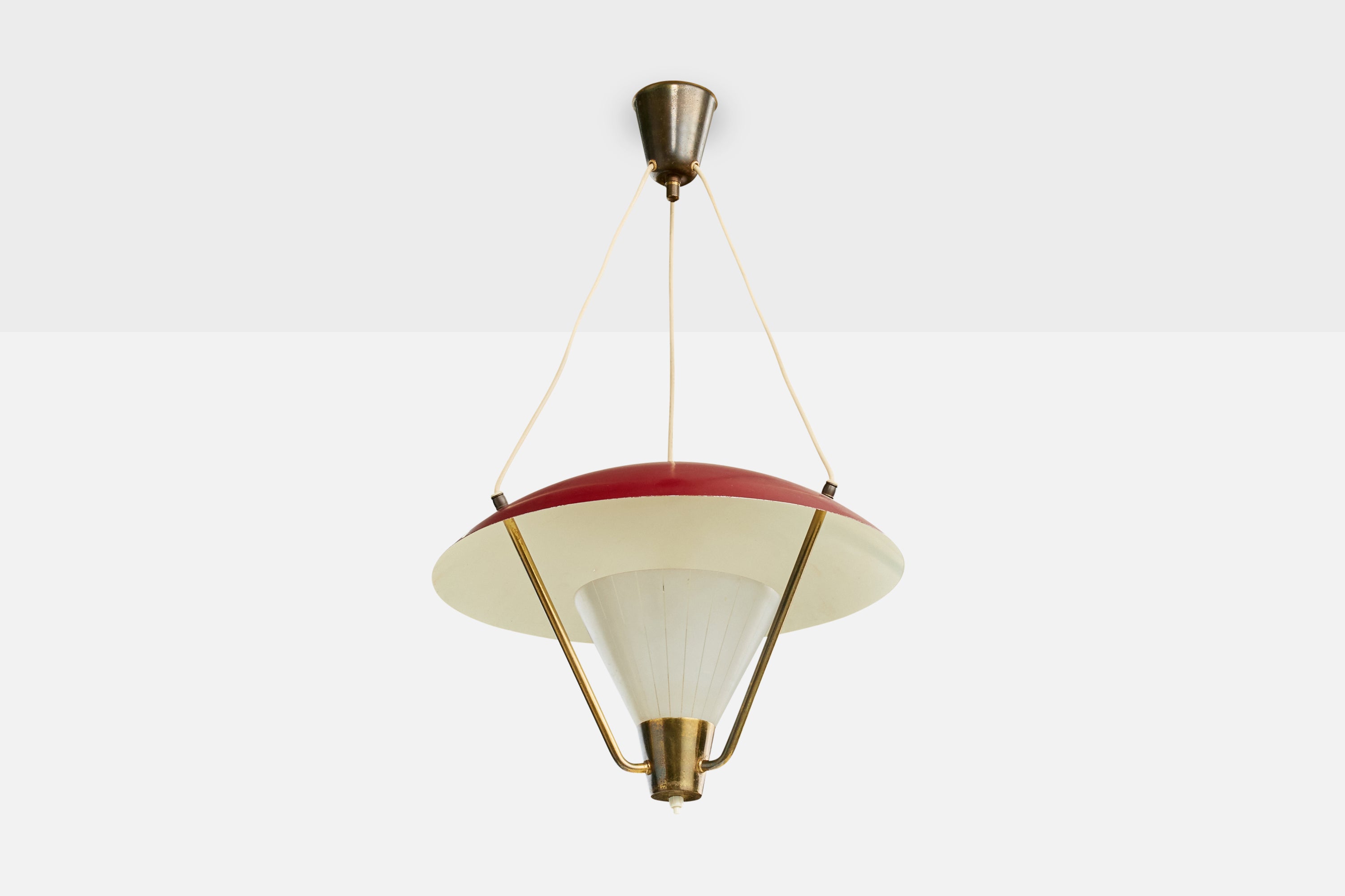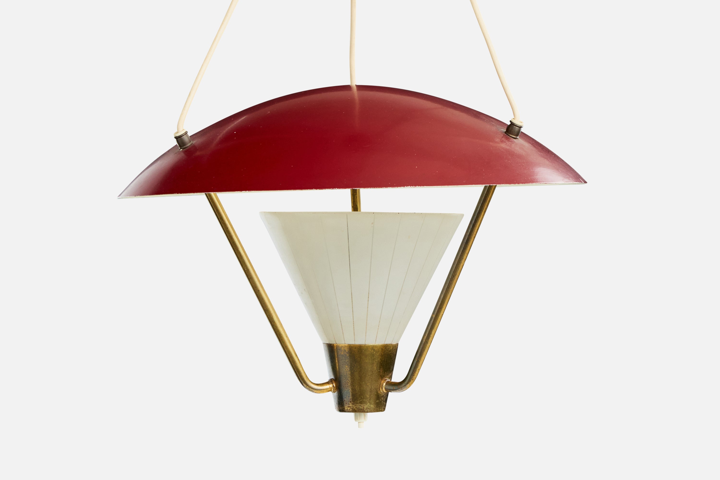 A brass, red, white-lacquered metal and white etched glass pendant light likely designed and produced in Denmark, c. 1950s.