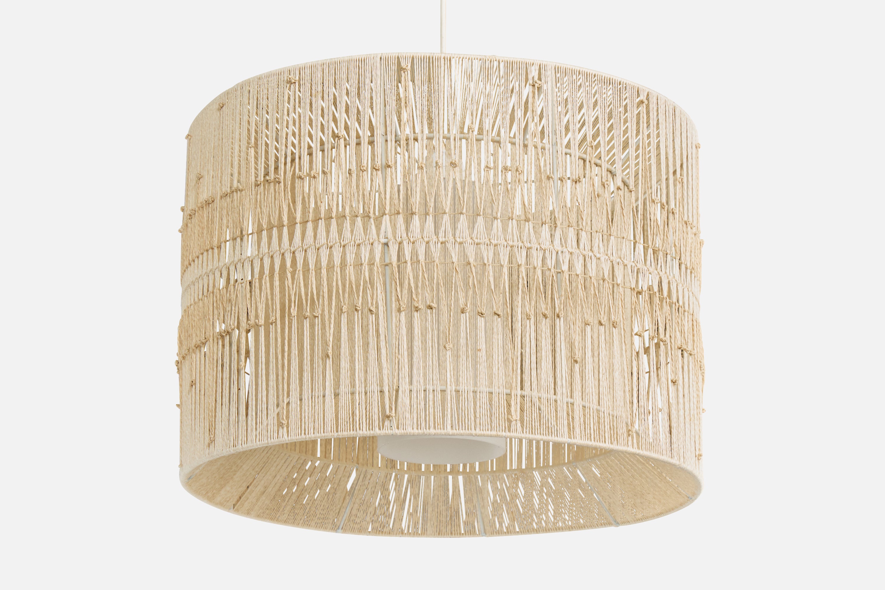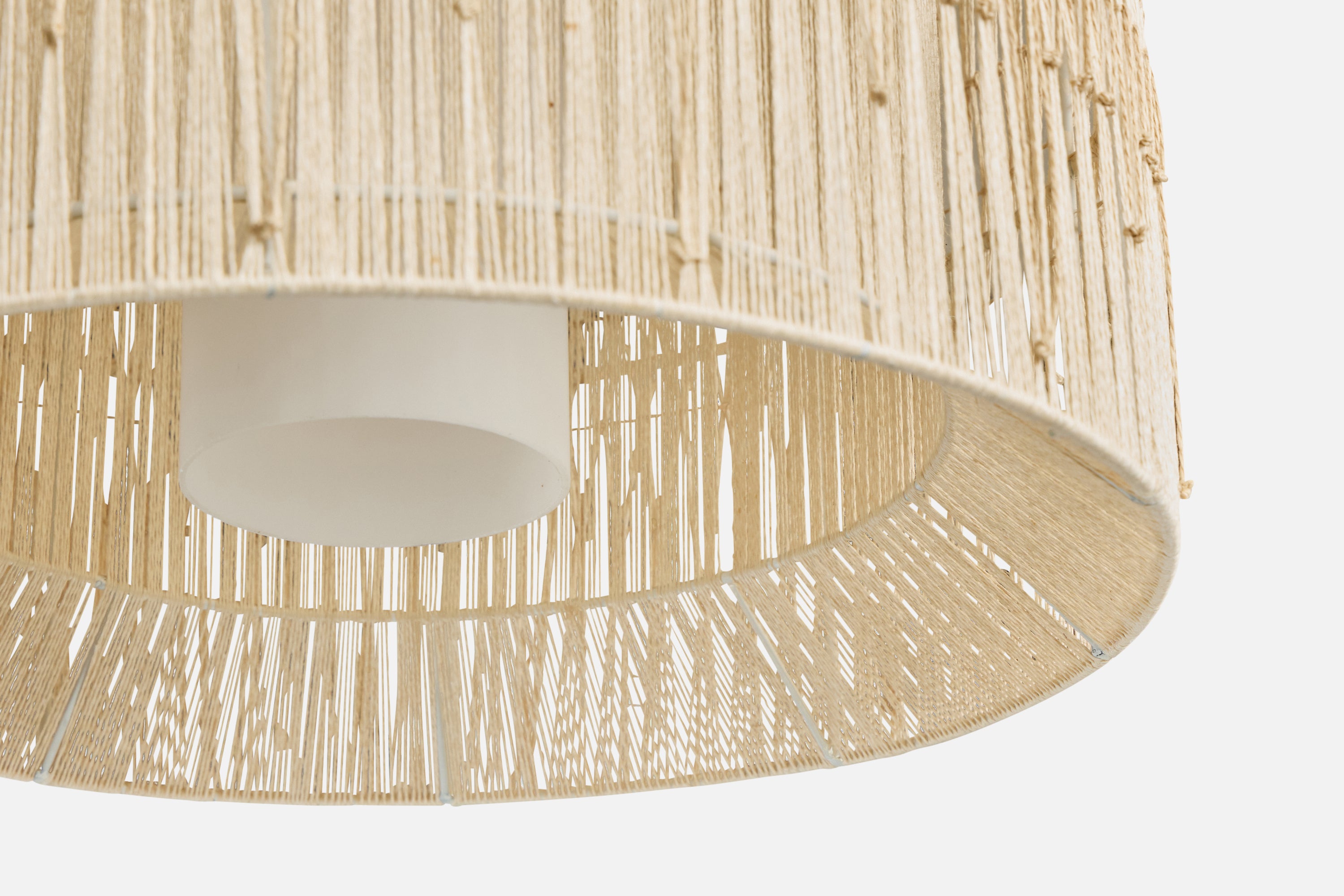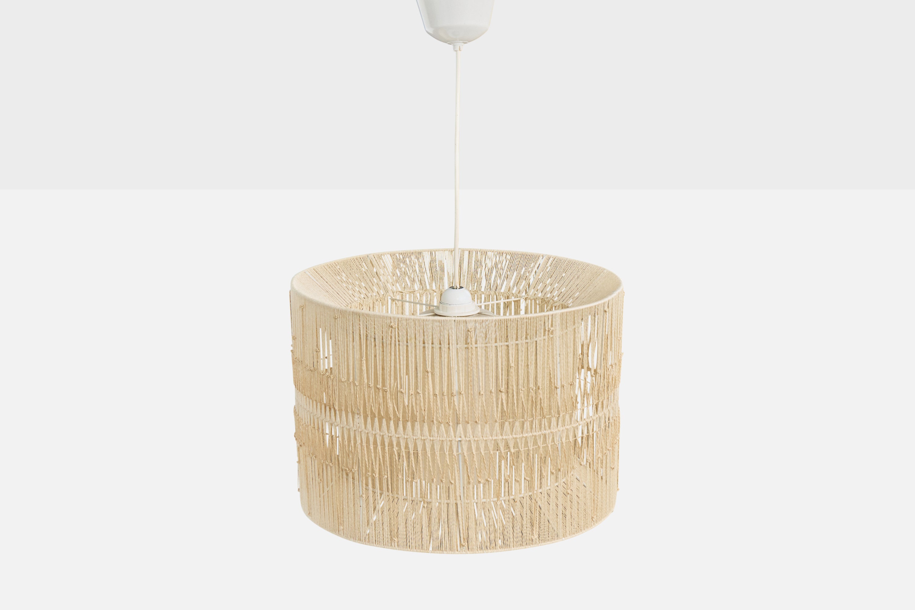 A beige fabric string and white opaline glass pendant light designed and produced in Sweden, c. 1960s.