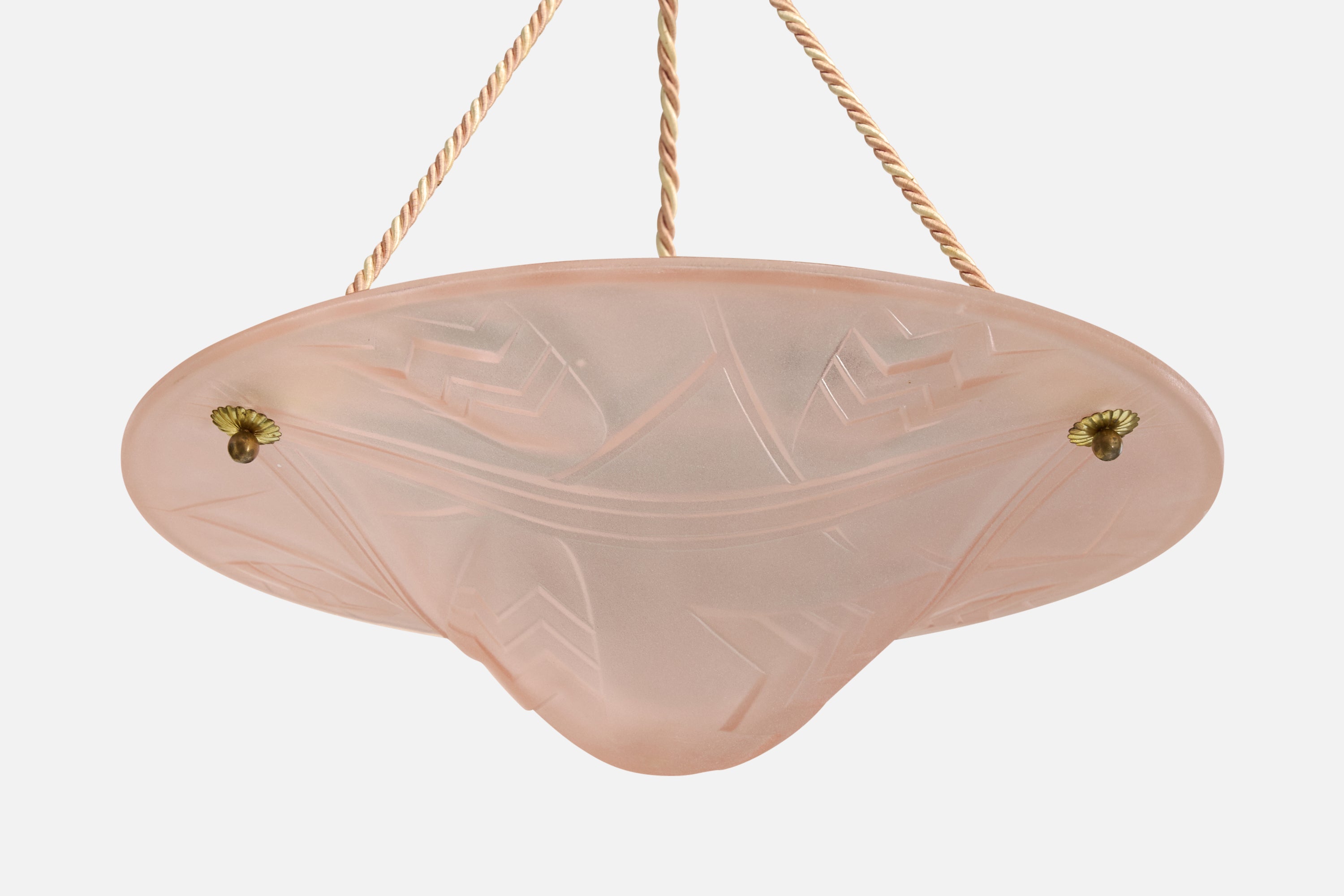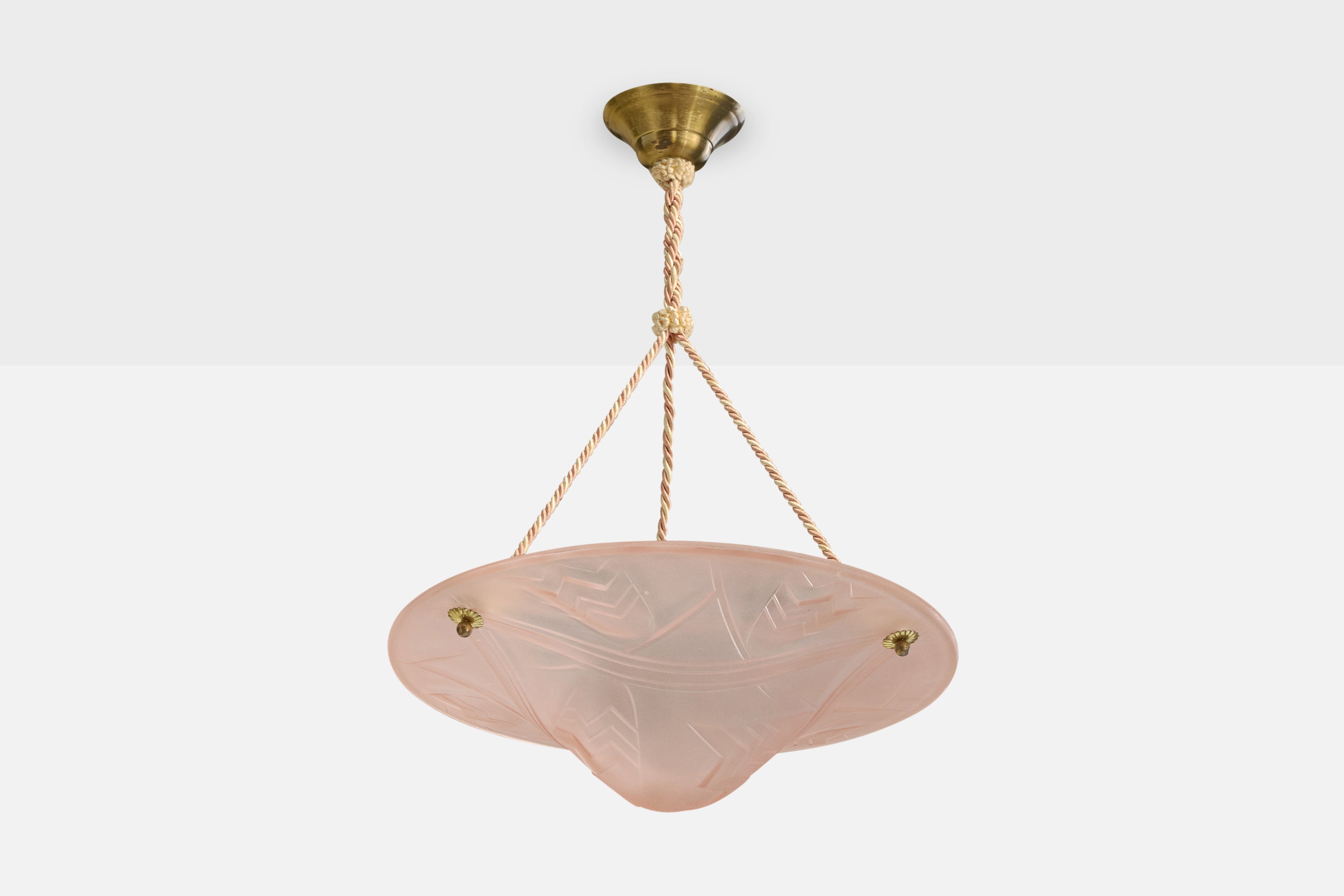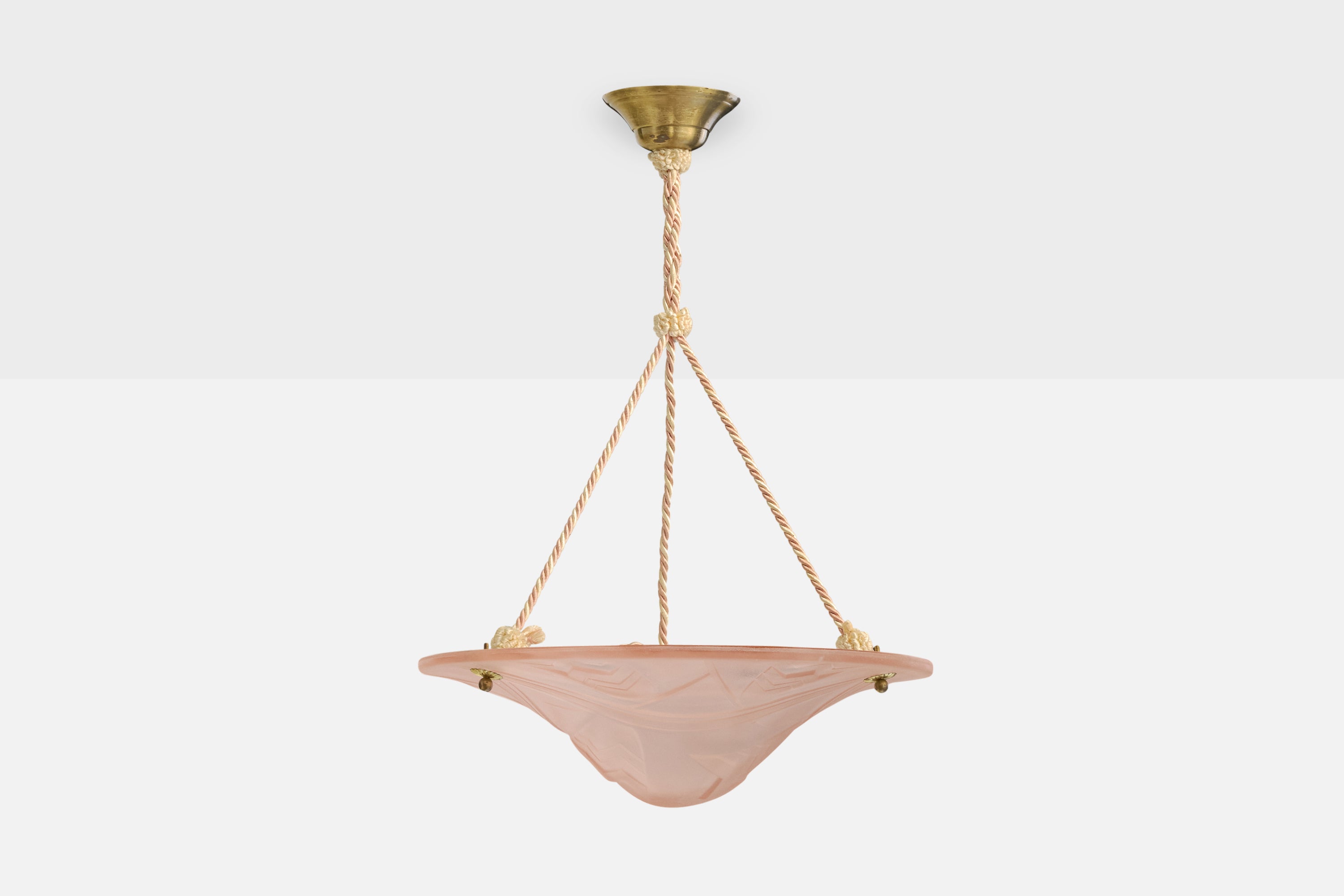 A pink glass, rope and brass pendant light designed and produced in France, c. 1930s.