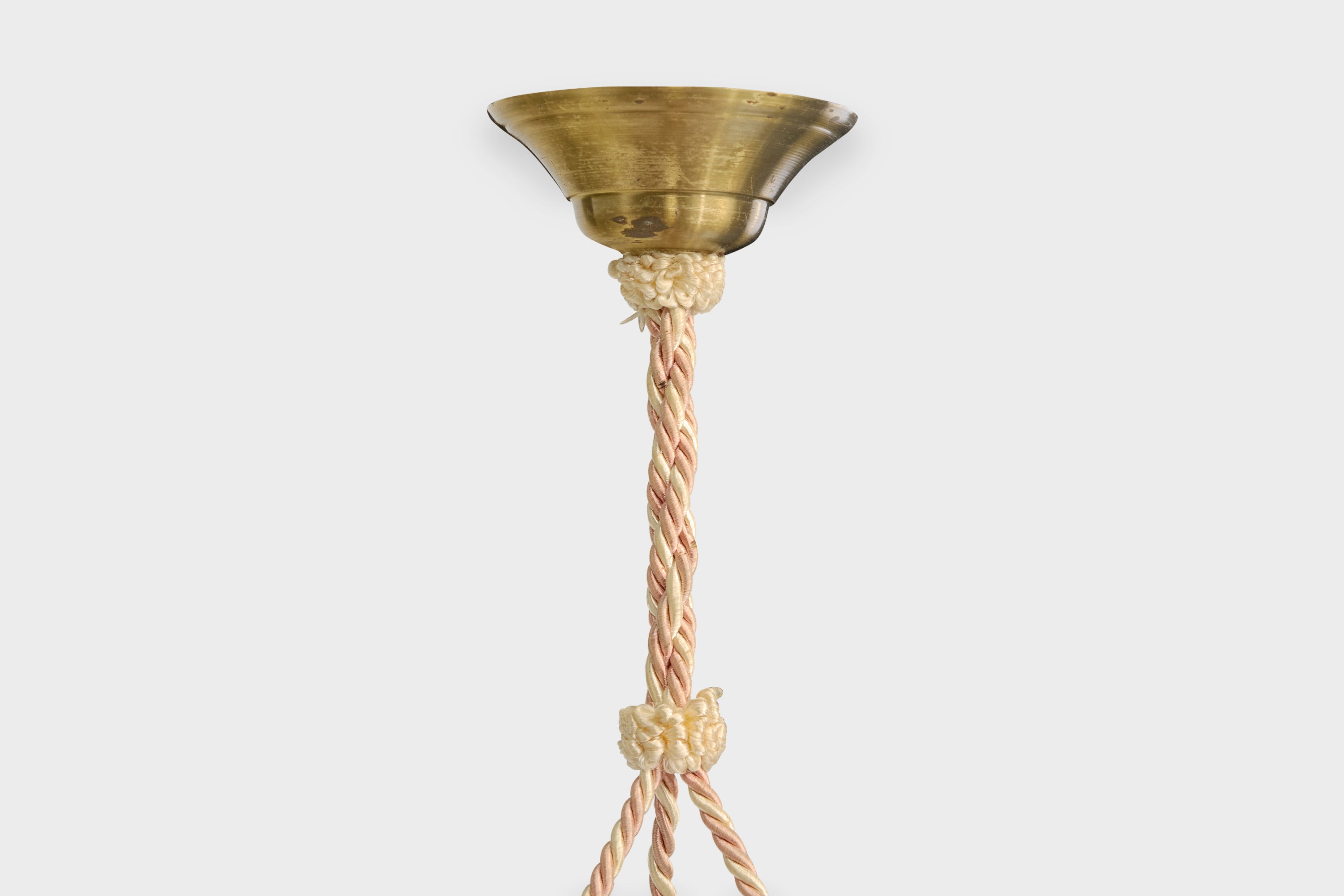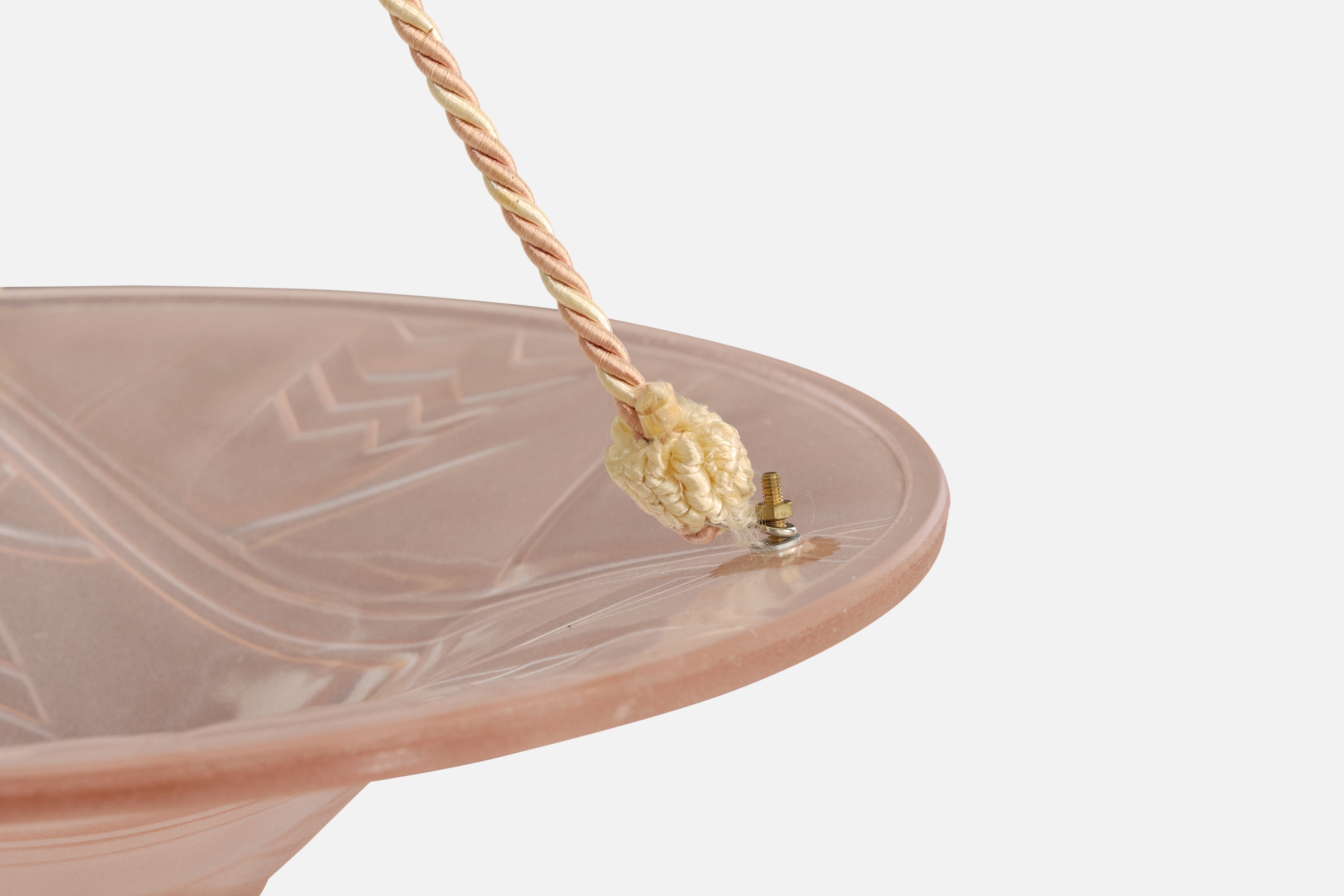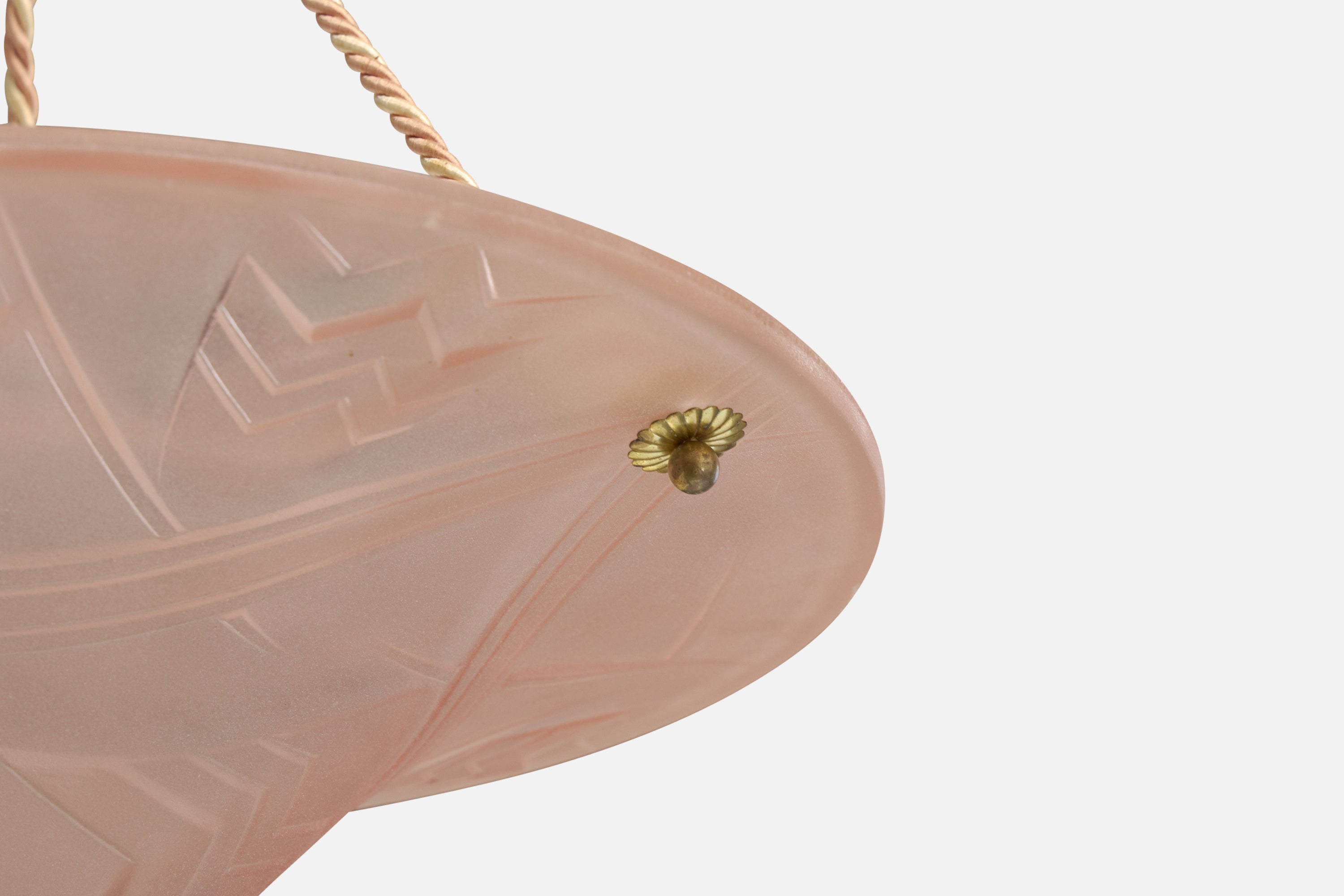 A pink glass, rope and brass pendant light designed and produced in France, c. 1930s.