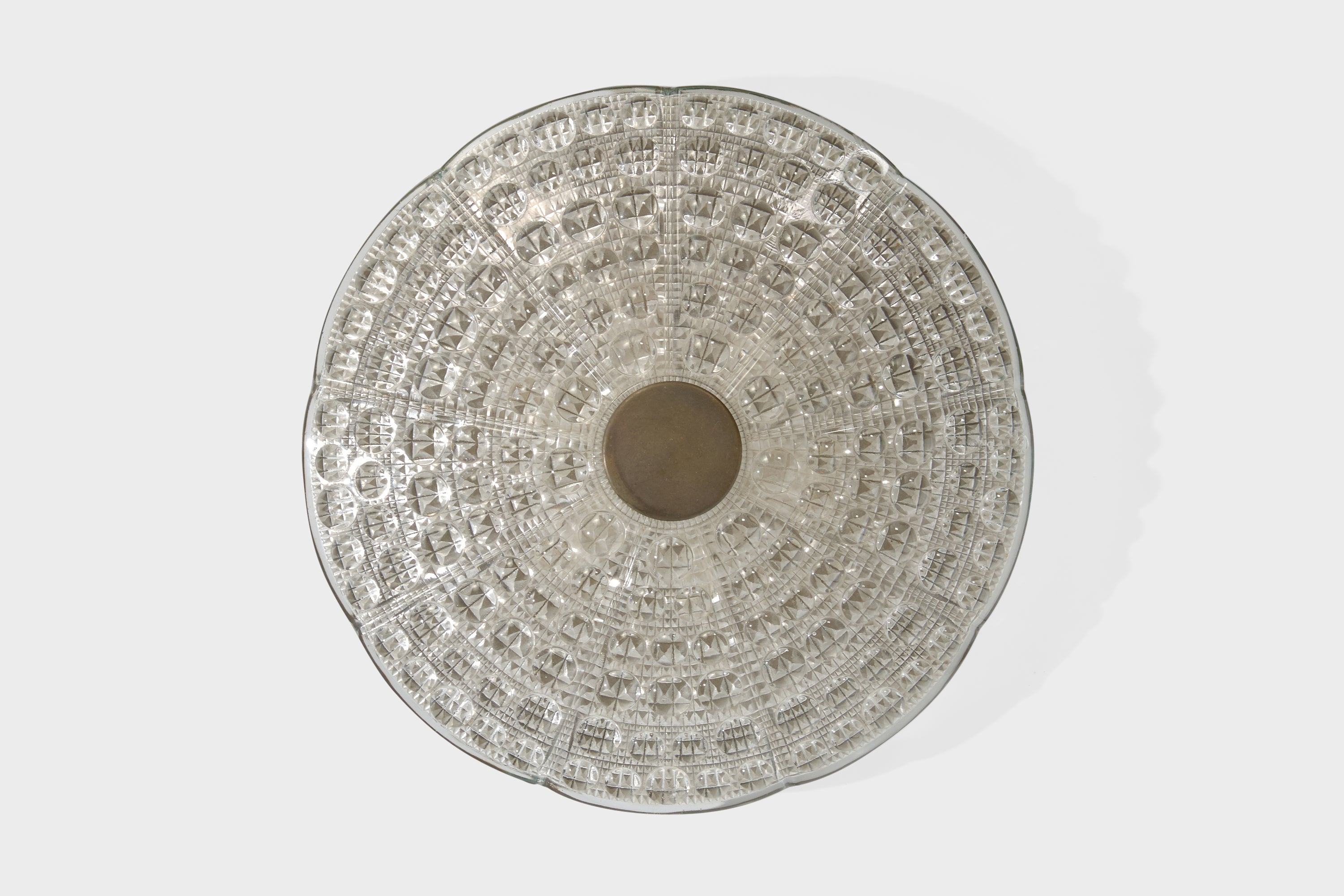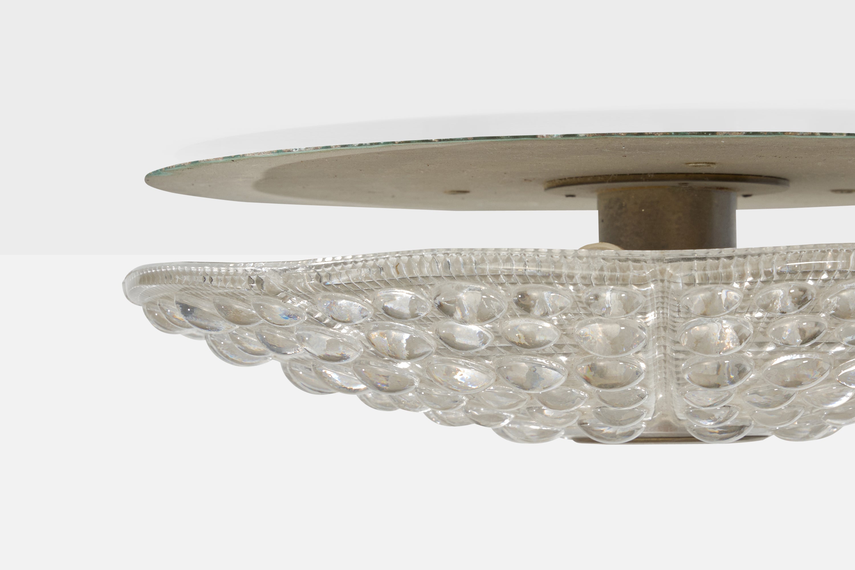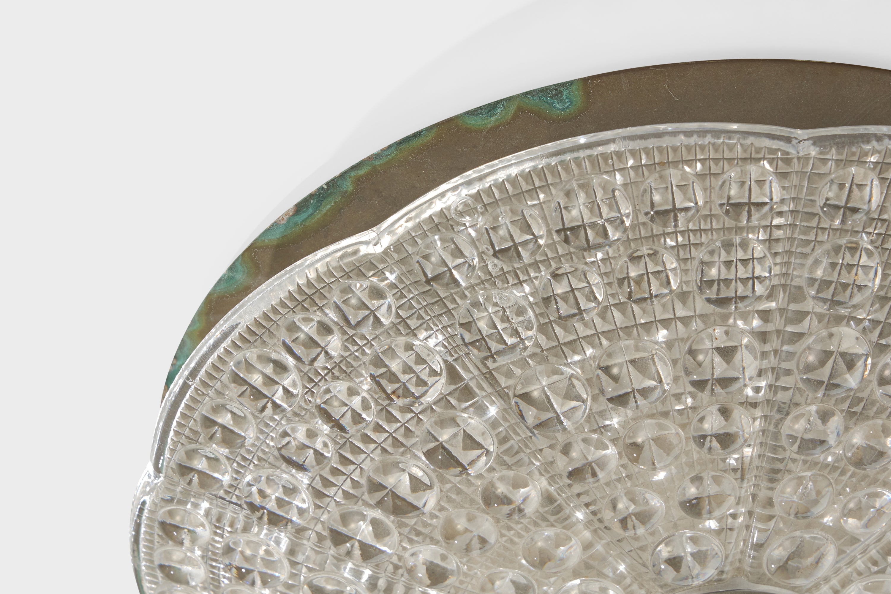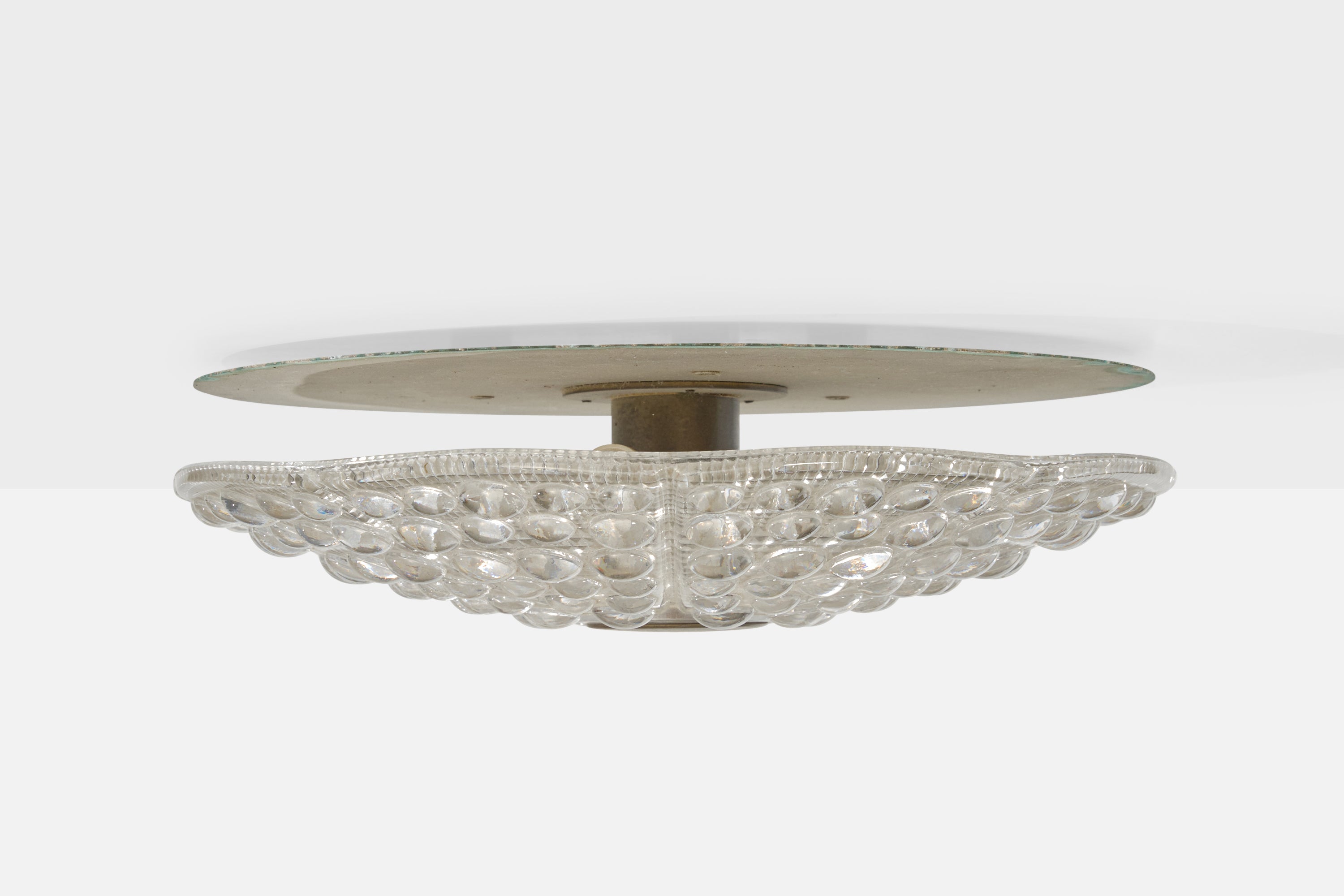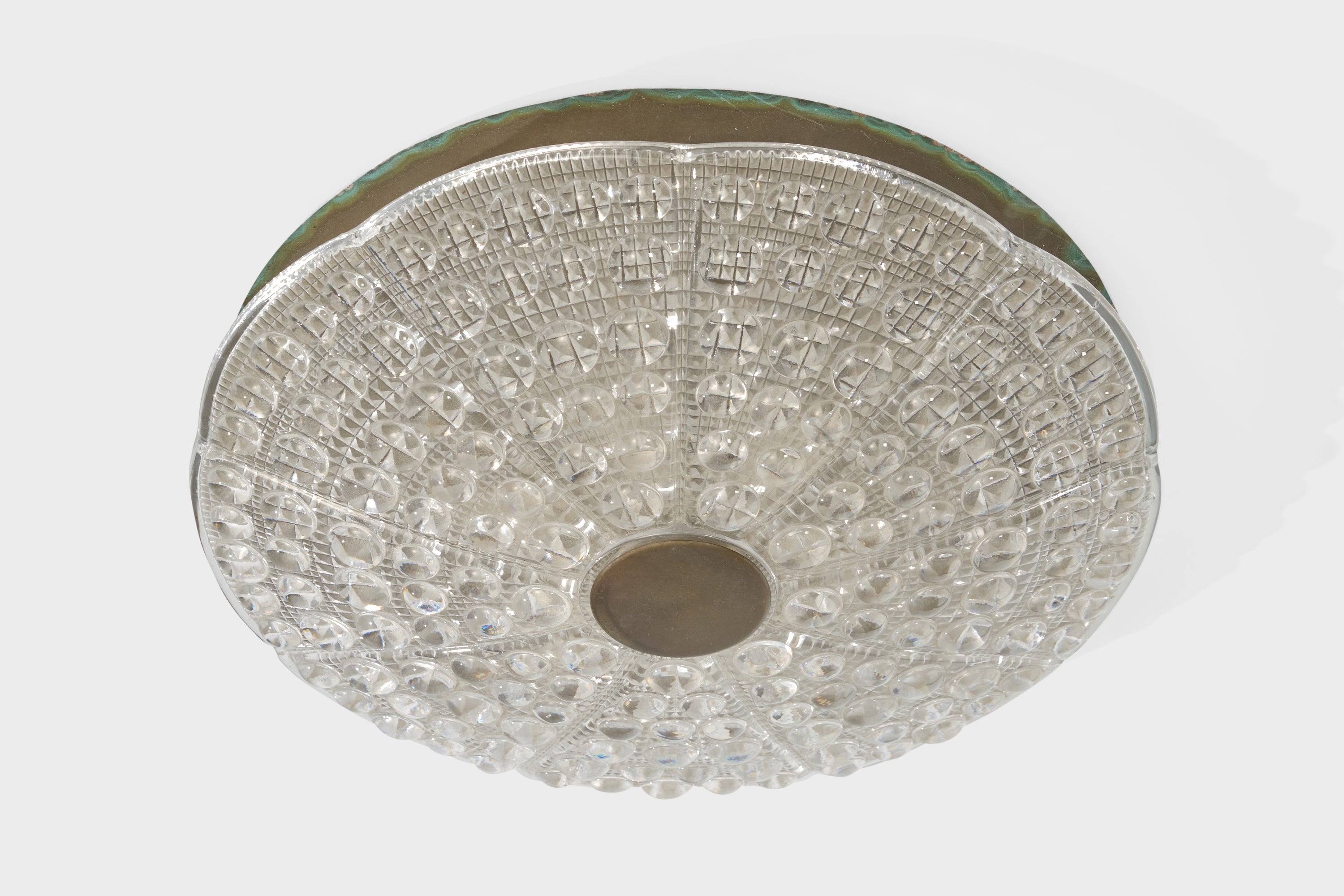 A glass and brass flush mount designed by Carl Fagerlund and produced by Orrefors, Sweden, c. 1950s.