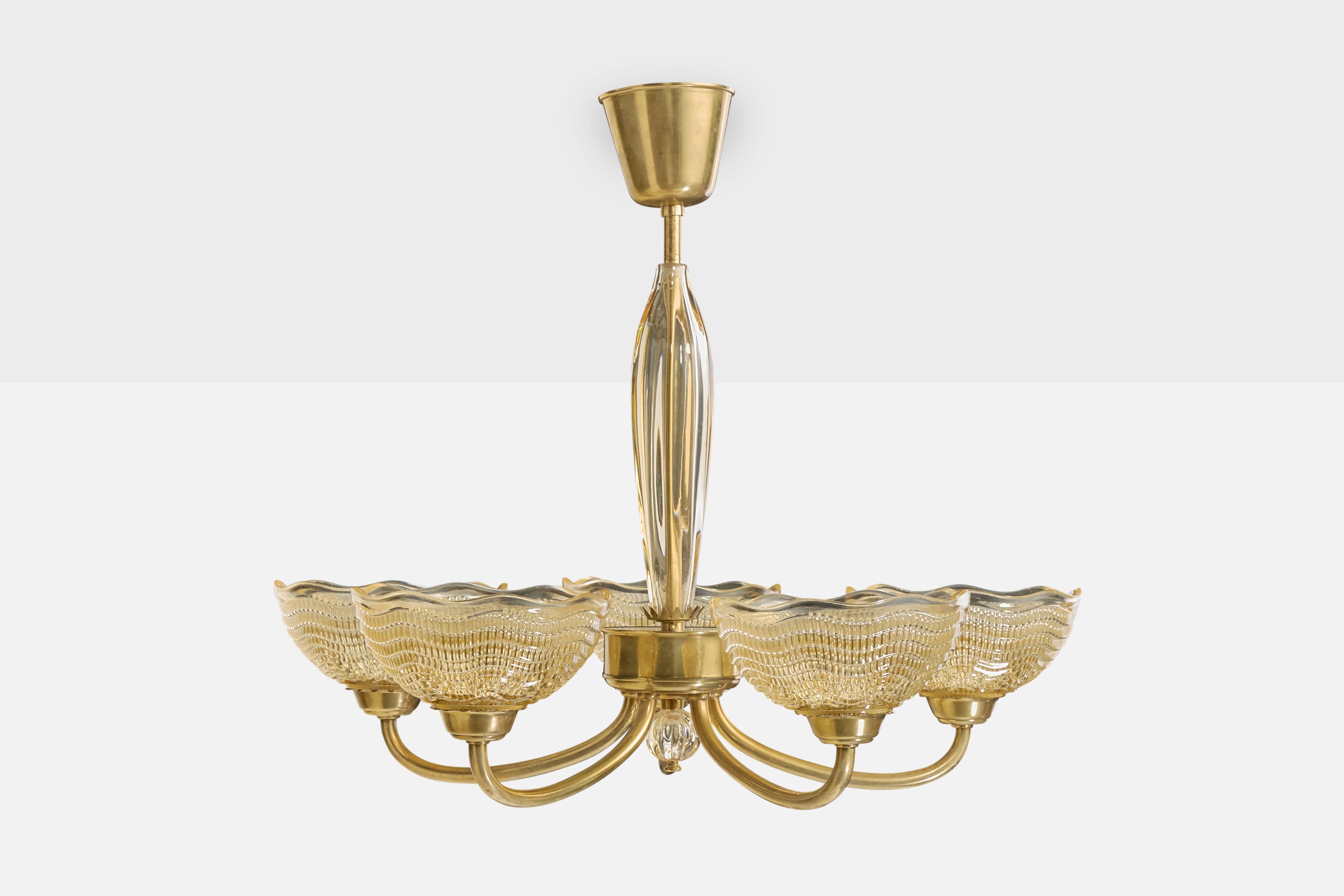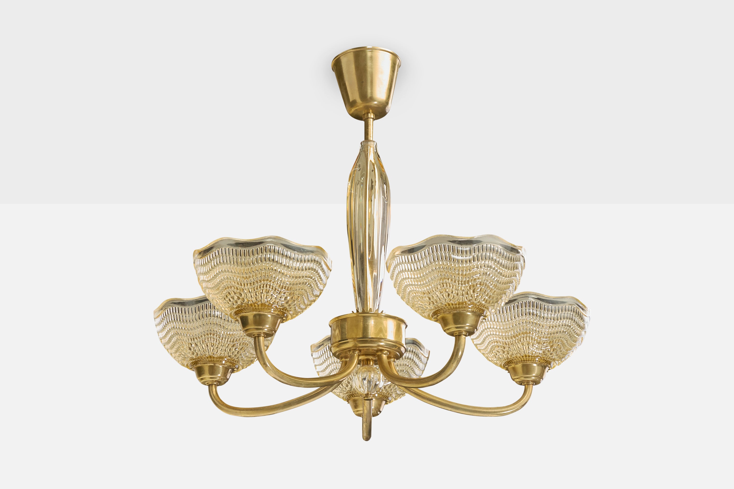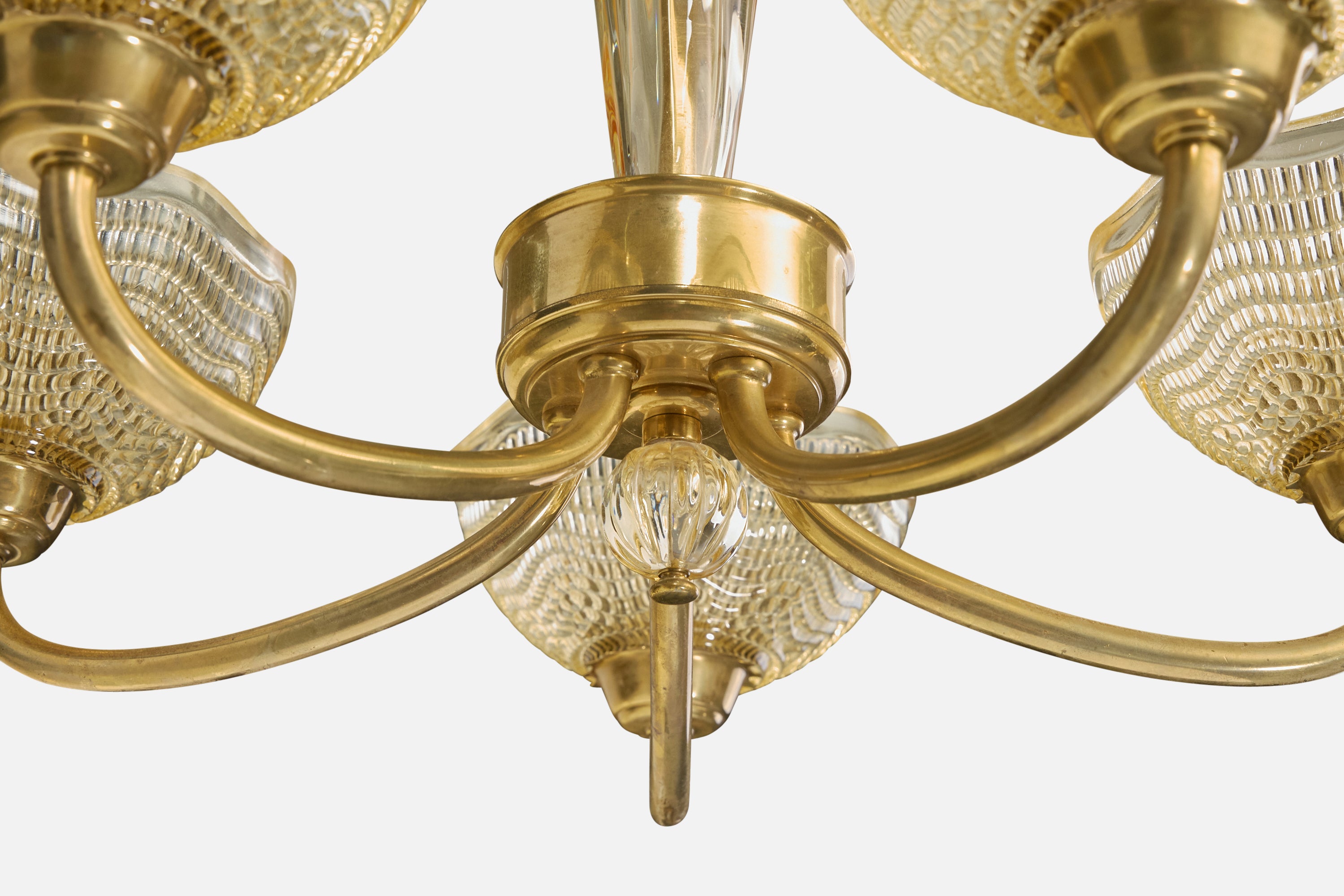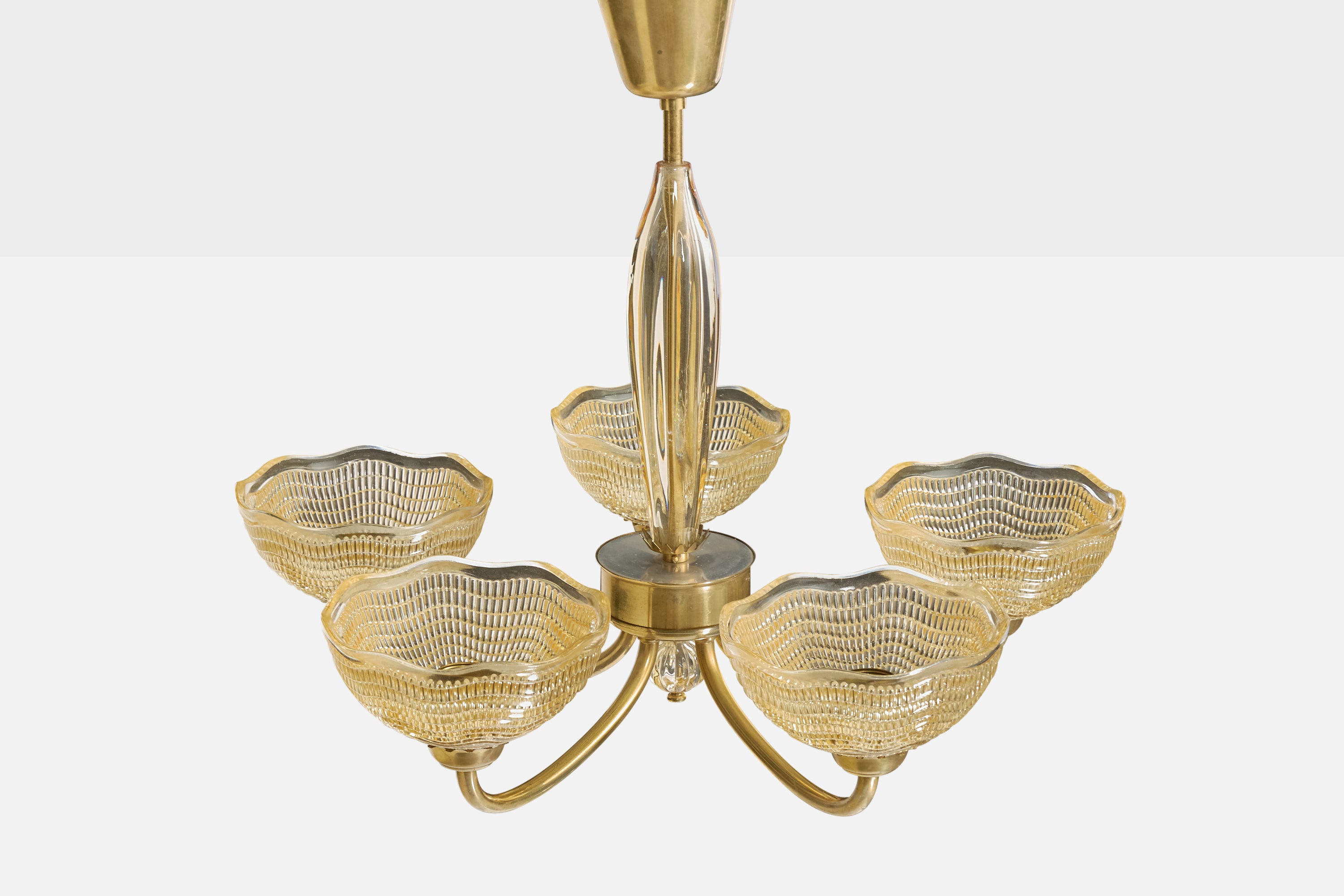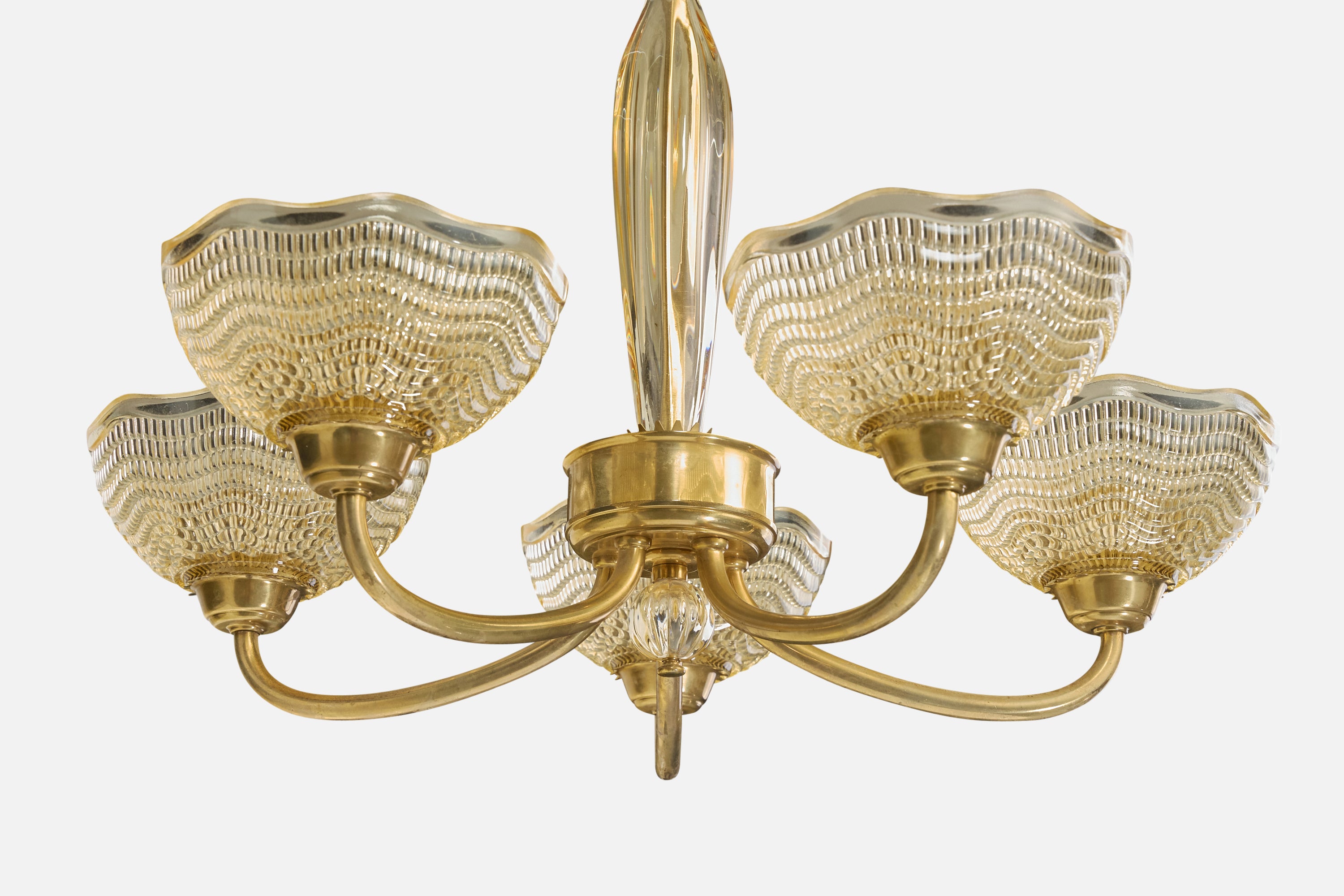 A glass and brass chandelier designed by Fritz Kurz and produced by Orrefors, Sweden, c. 1950s.
