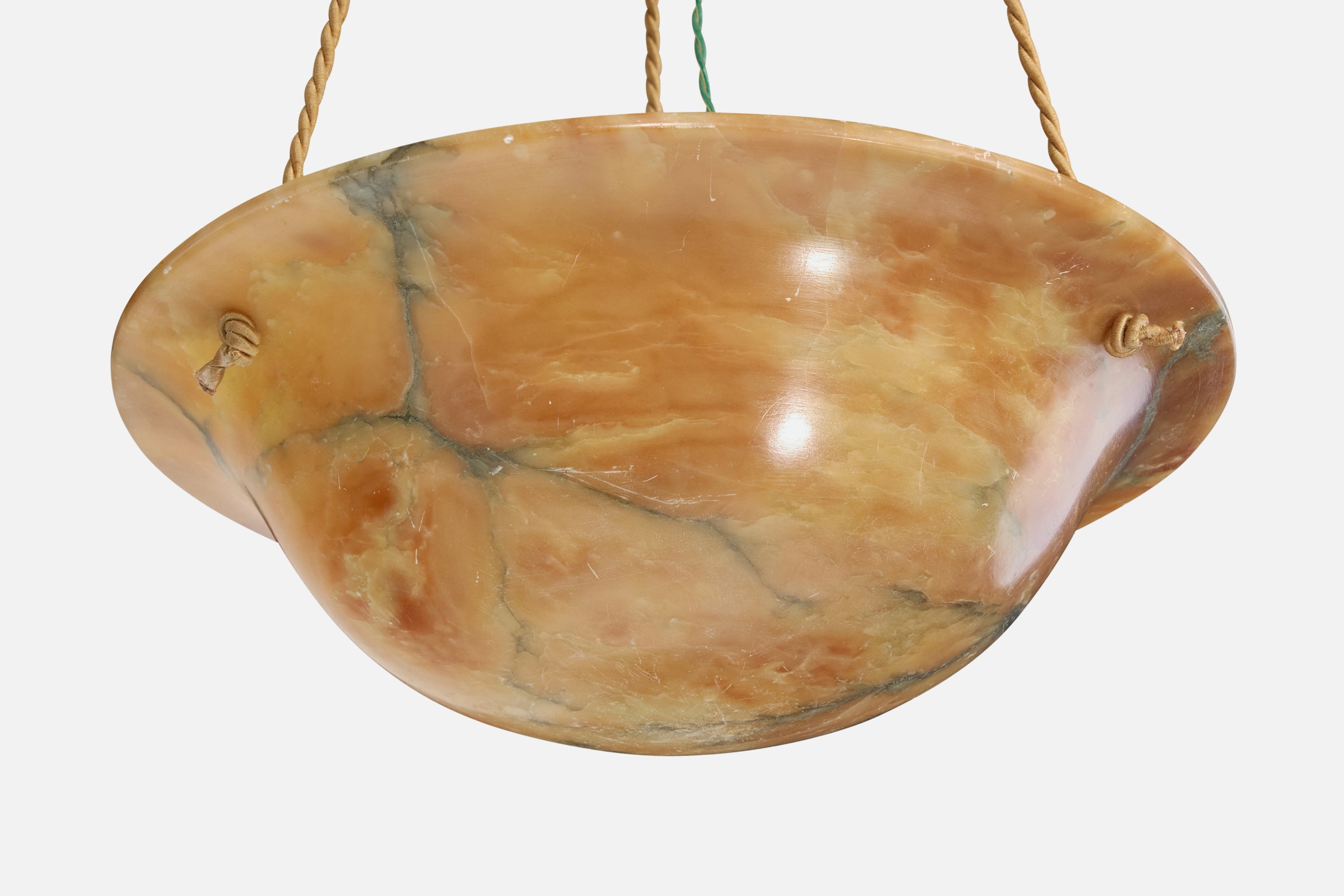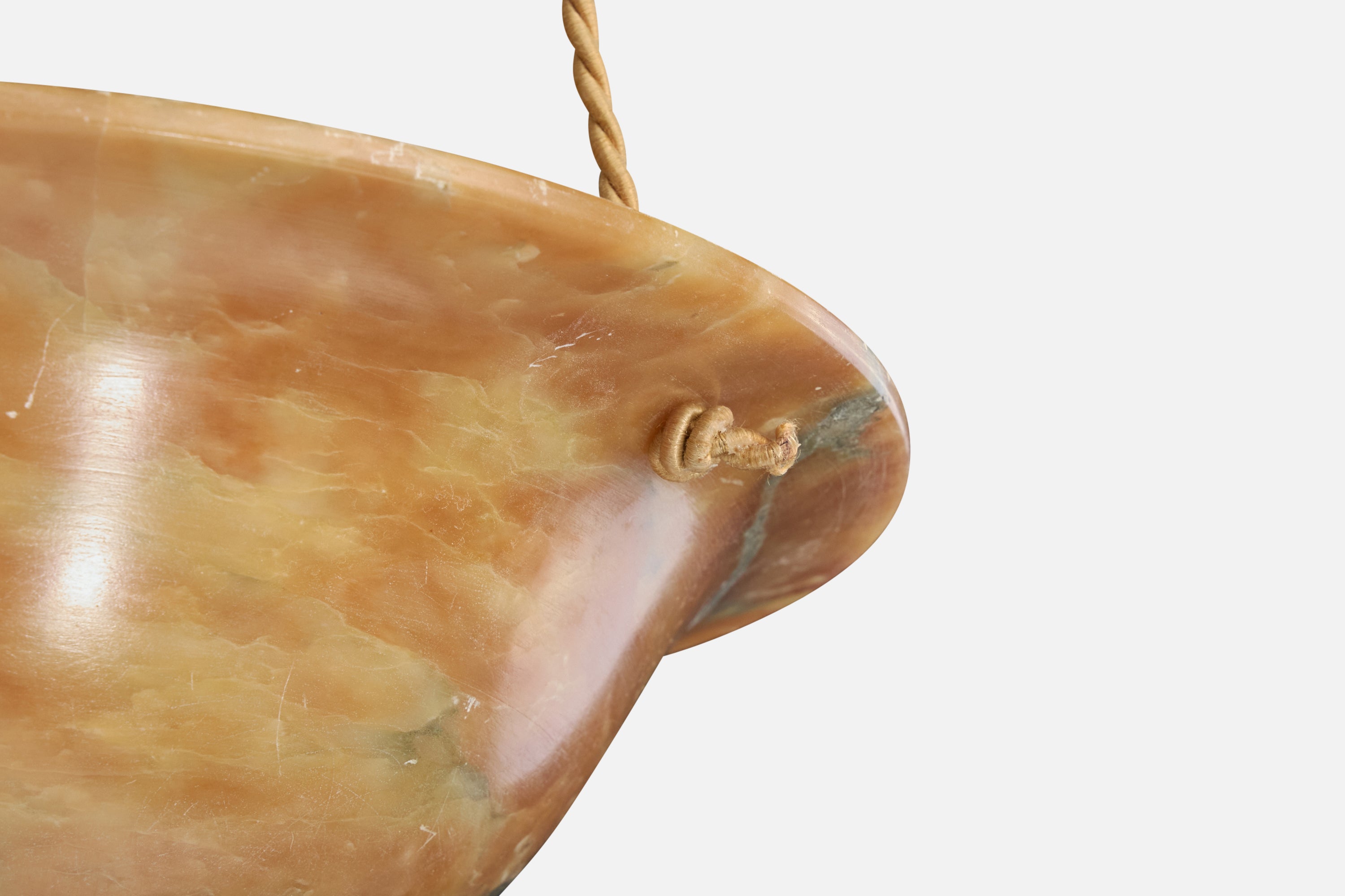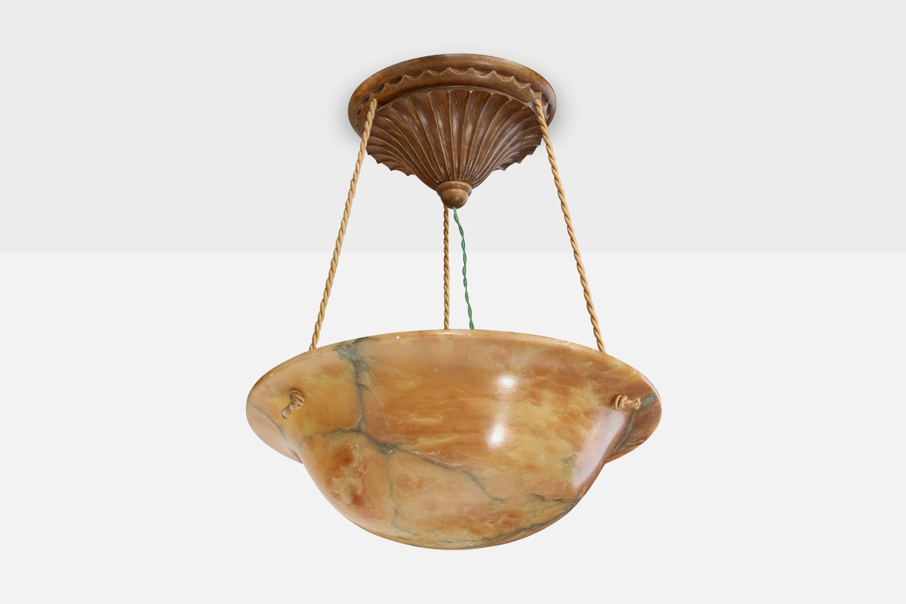 An alabaster, rope and stained wood pendant light designed and produced in France, c. 1930s.