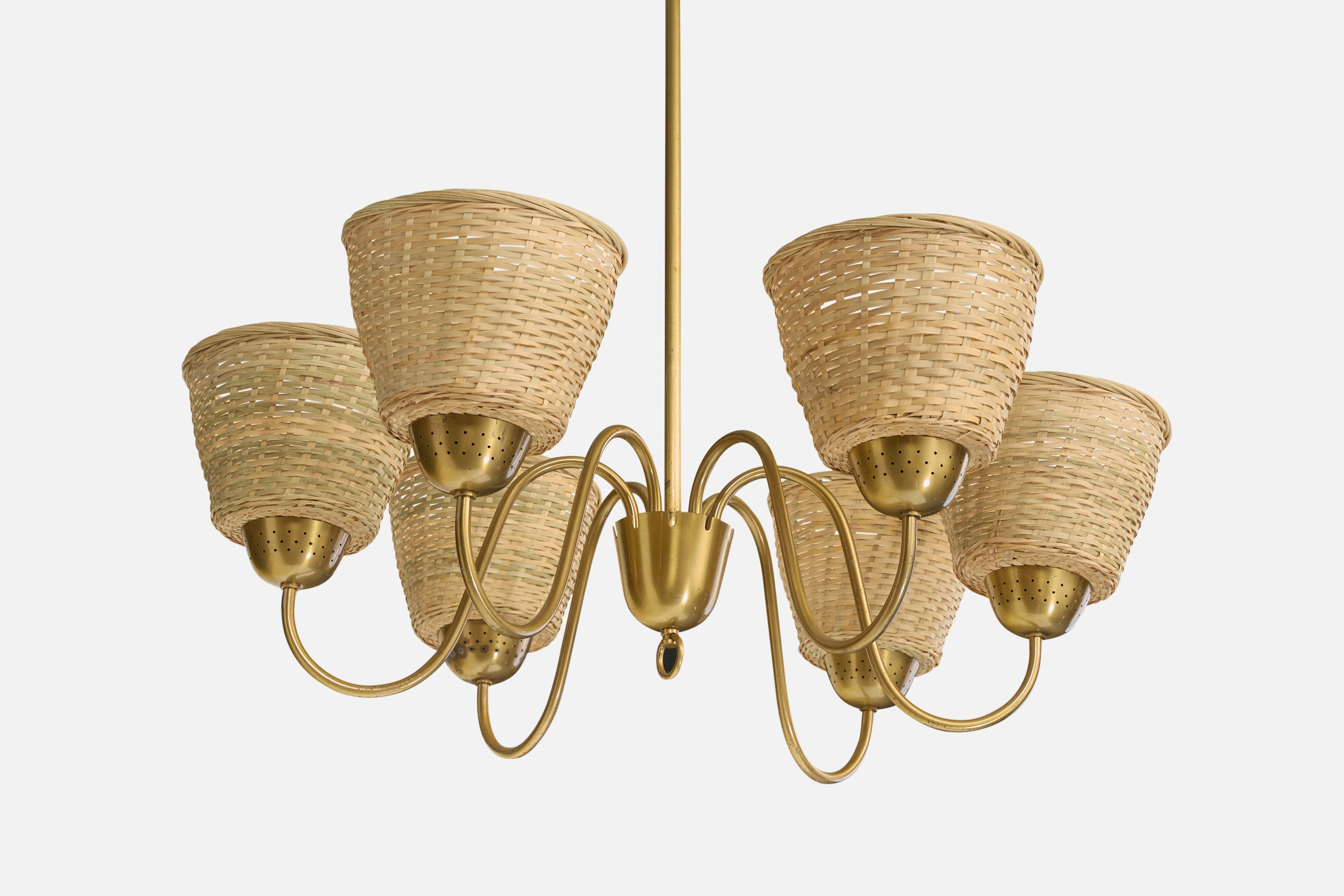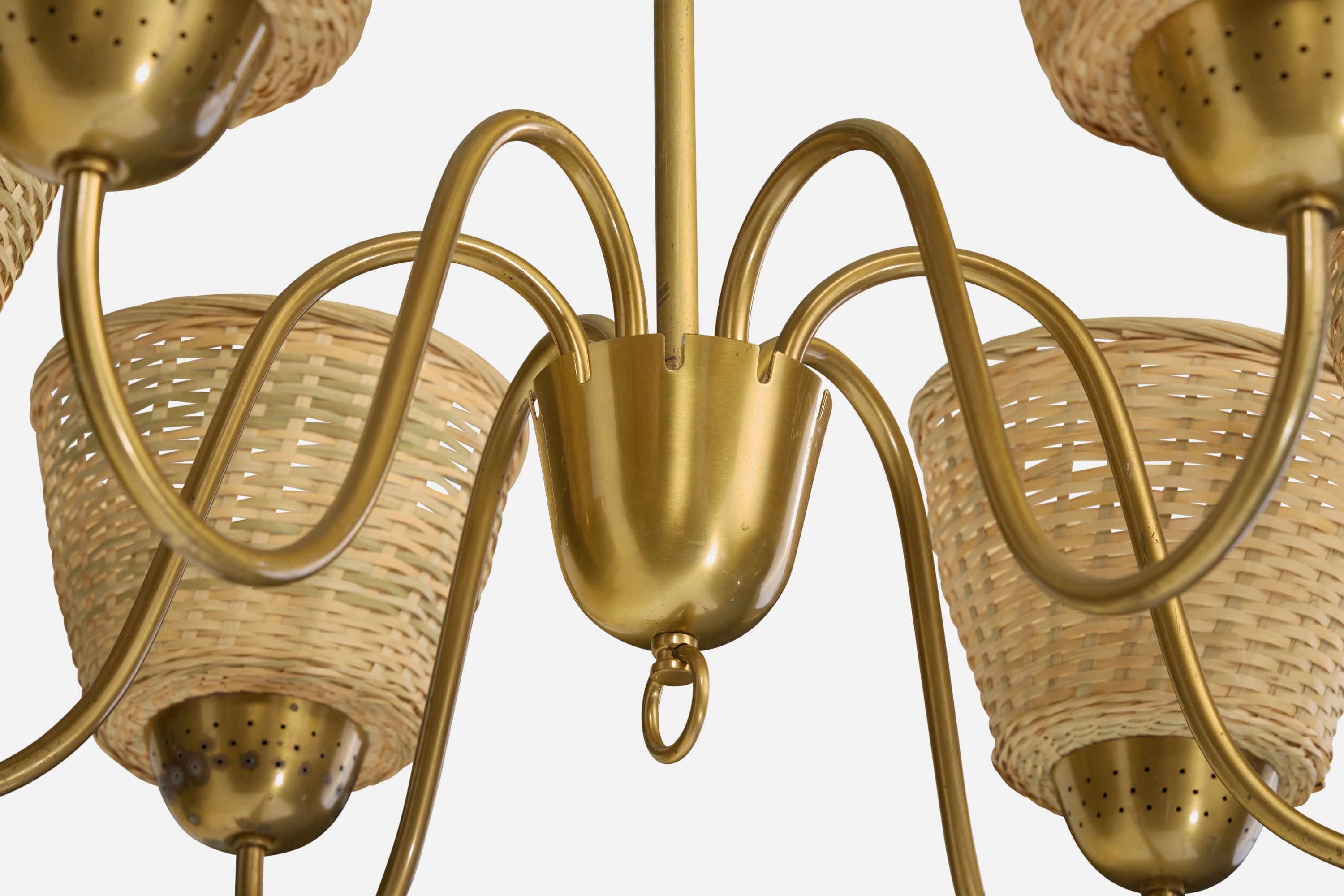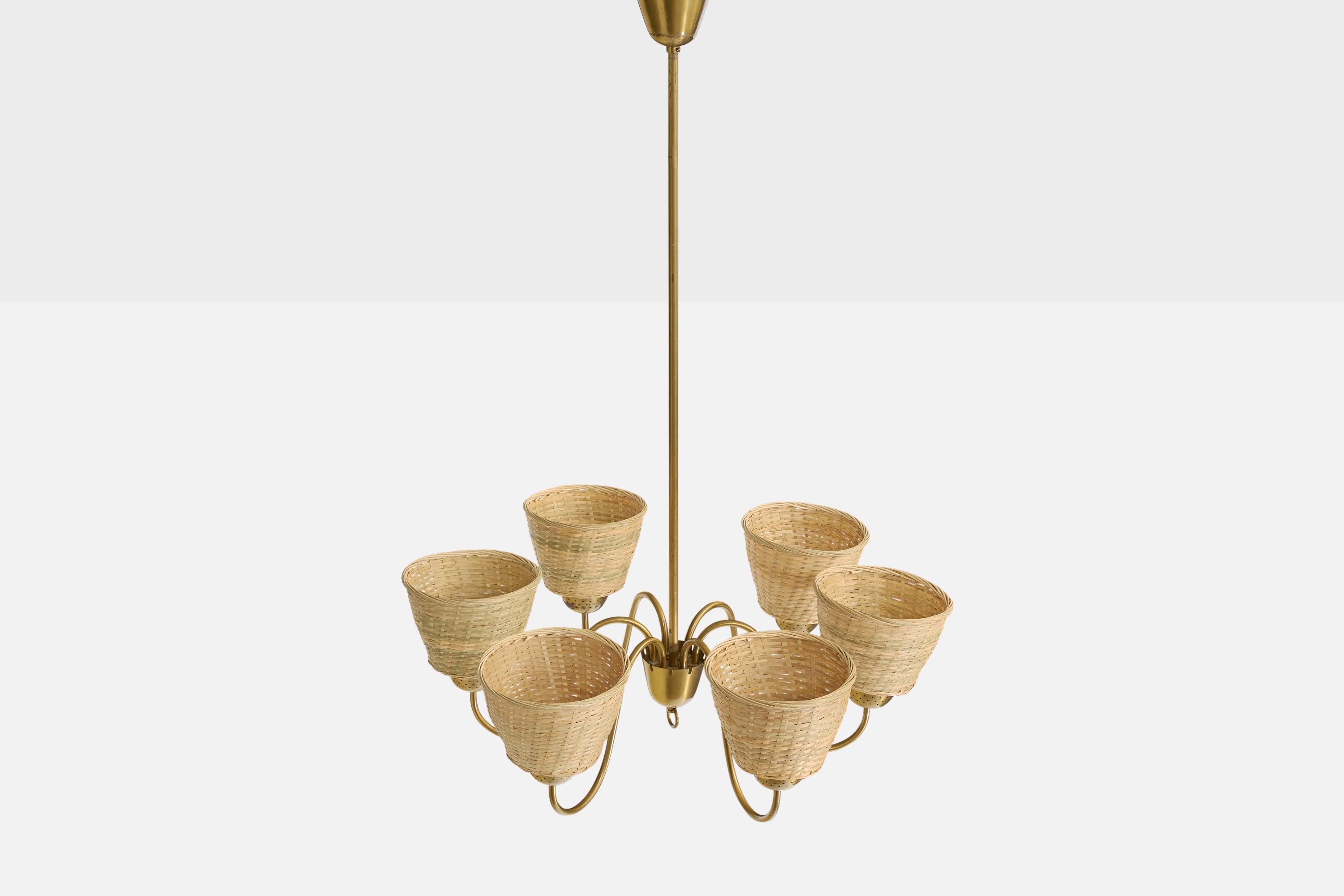 A brass and rattan chandelier produced by Bergboms, Sweden, c. 1940s.