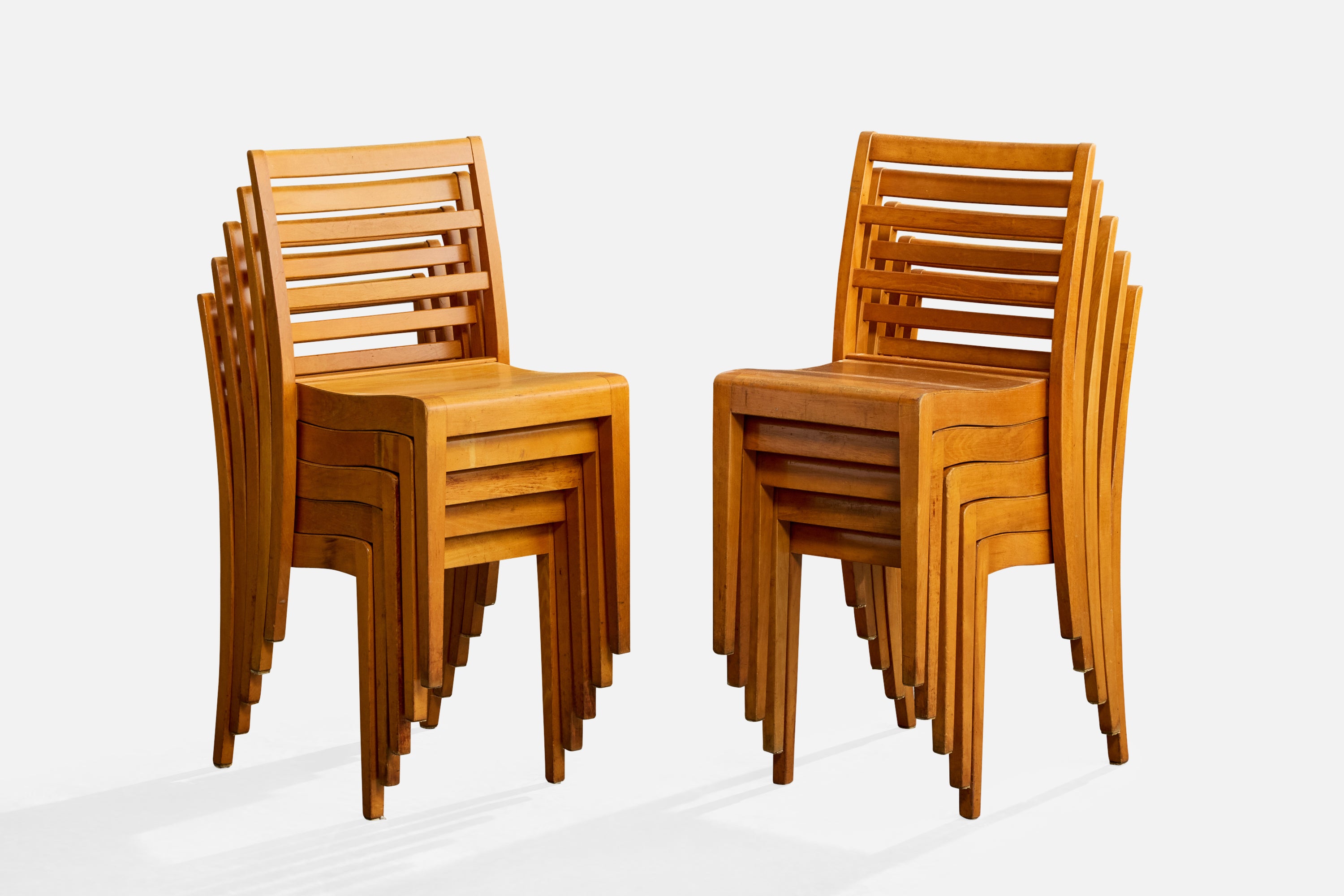 A set of 10 stackable birch dining room chairs or birch chairs produced by Sorø Stolefabrik, Denmark, c. 1950s.