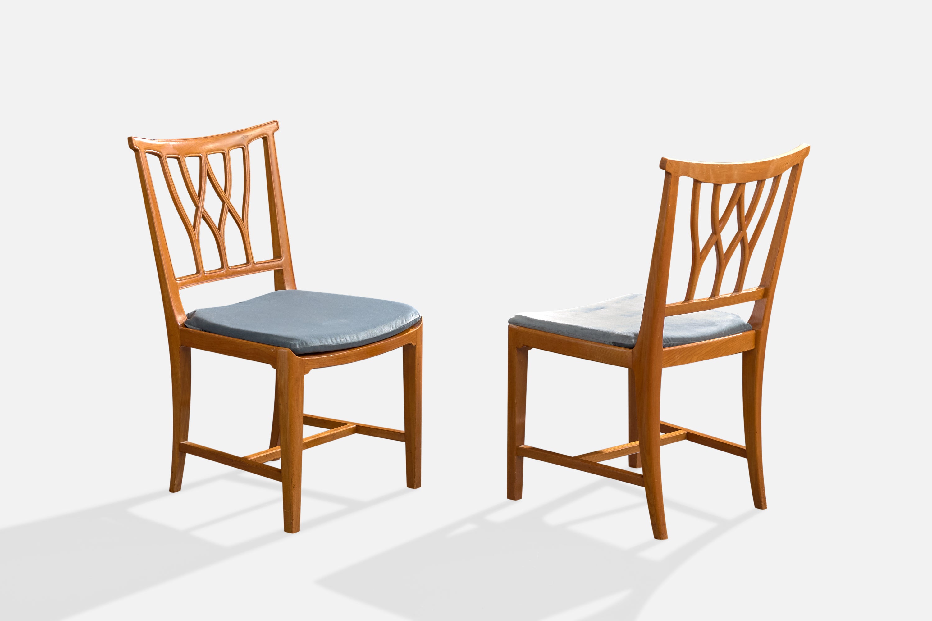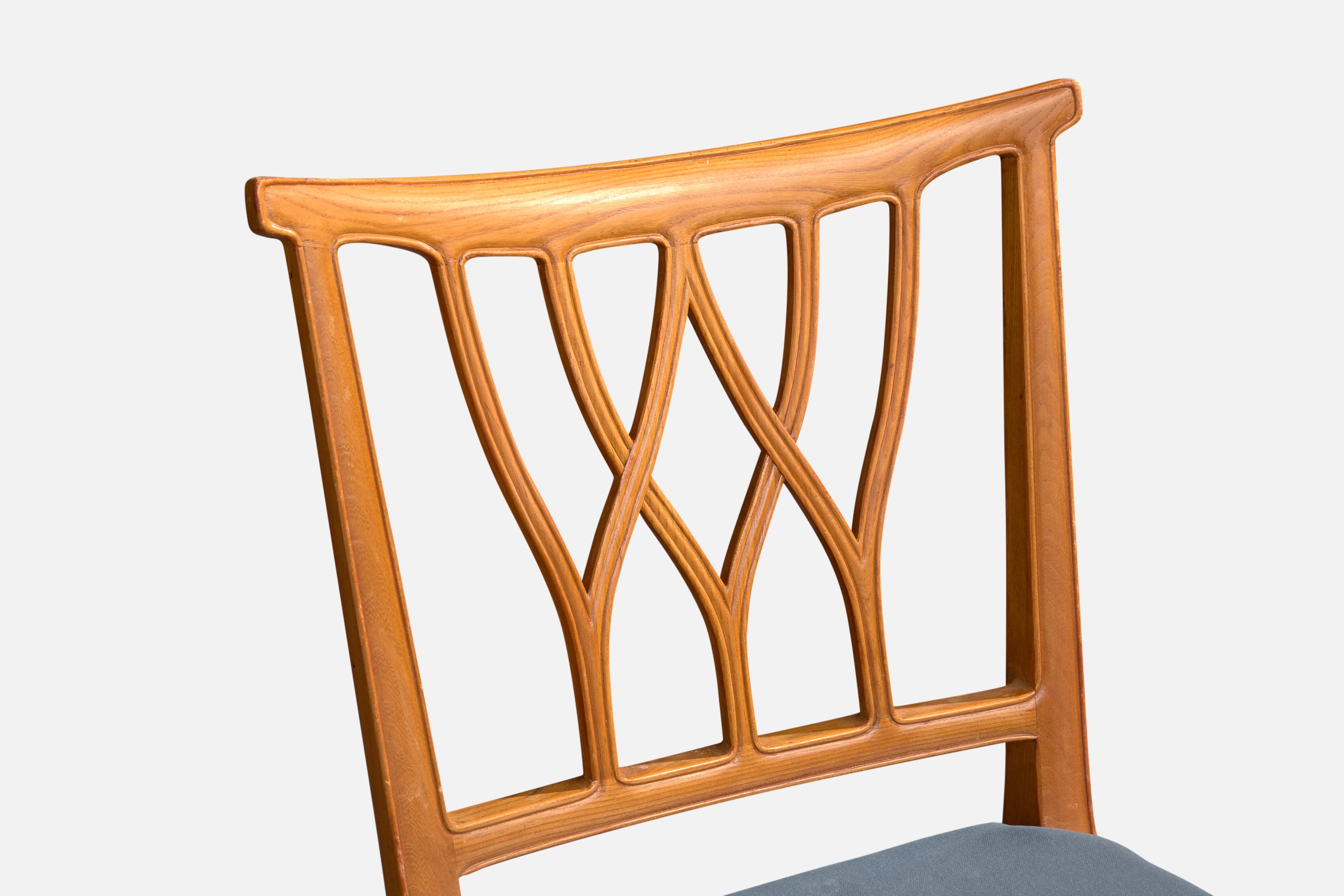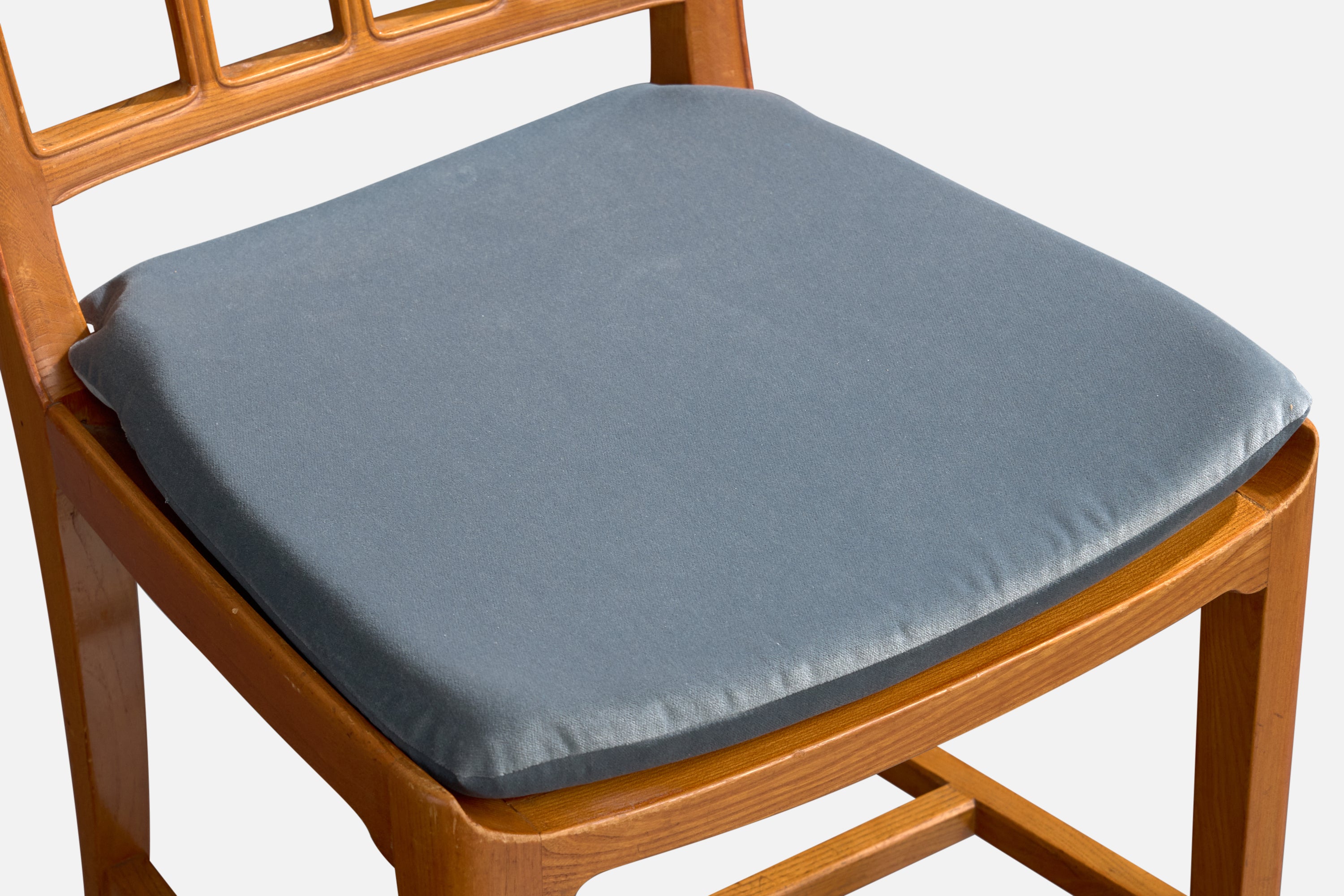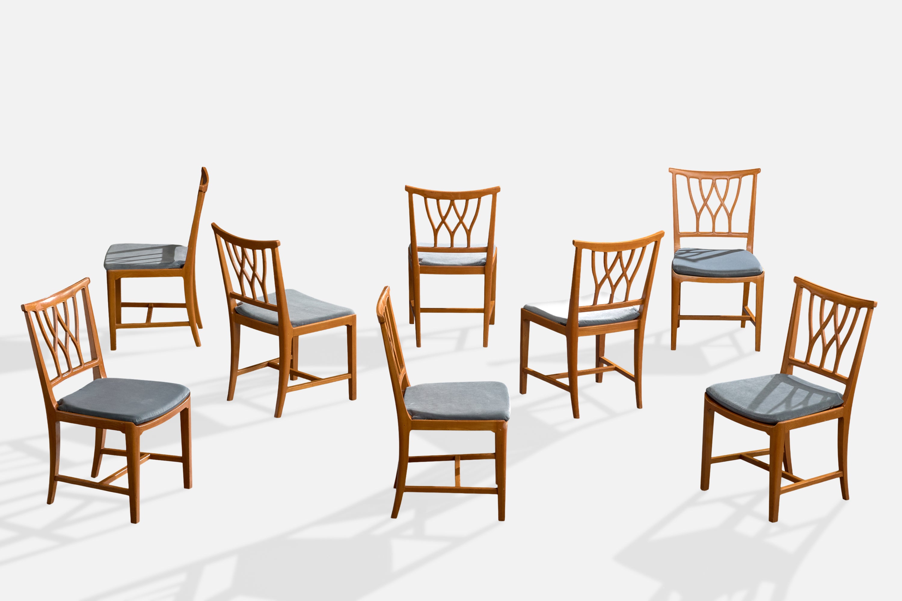 A set of 8 birch and blue velvet dining room chairs designed and produced by Runar Engblom, Sweden, c. 1940s.