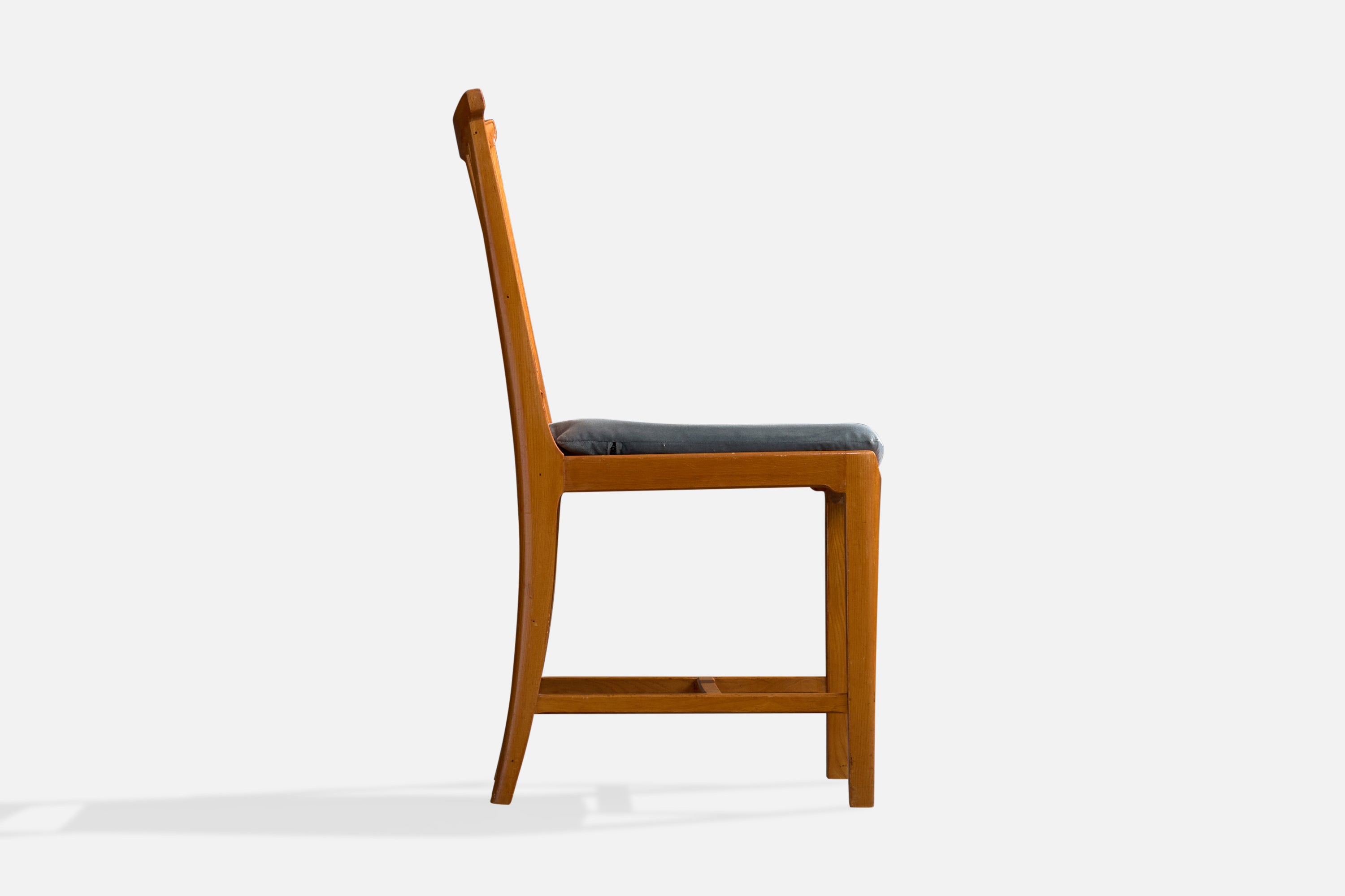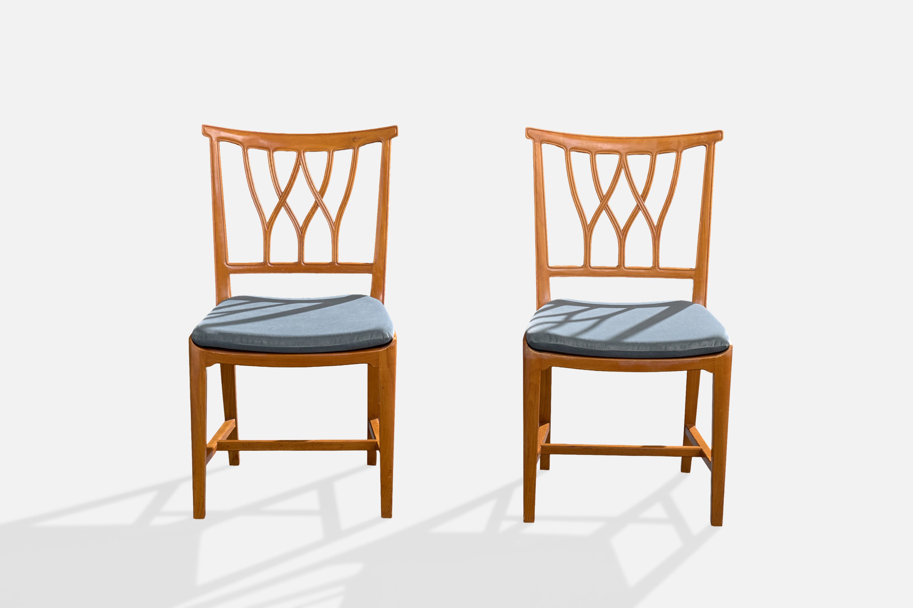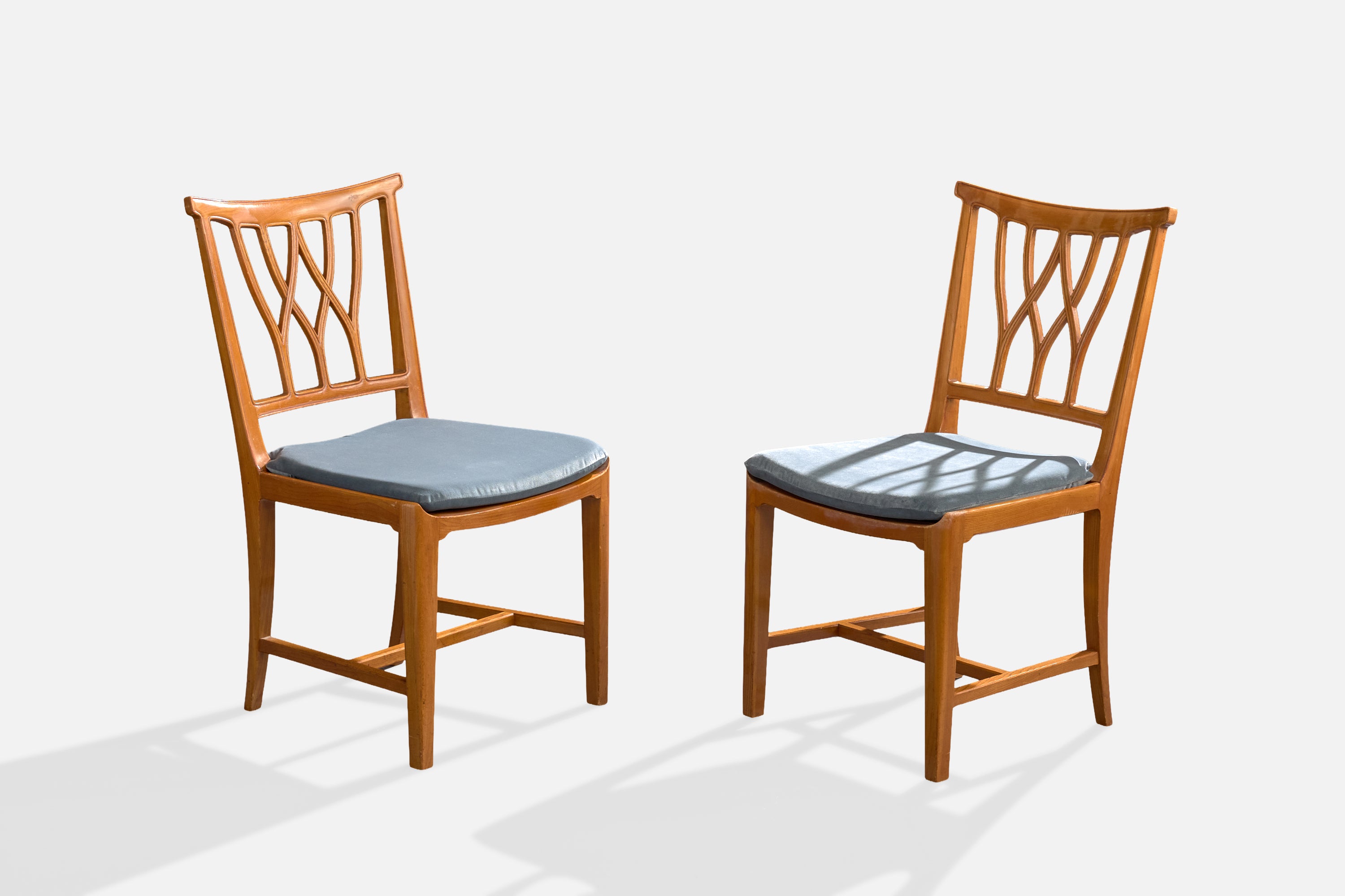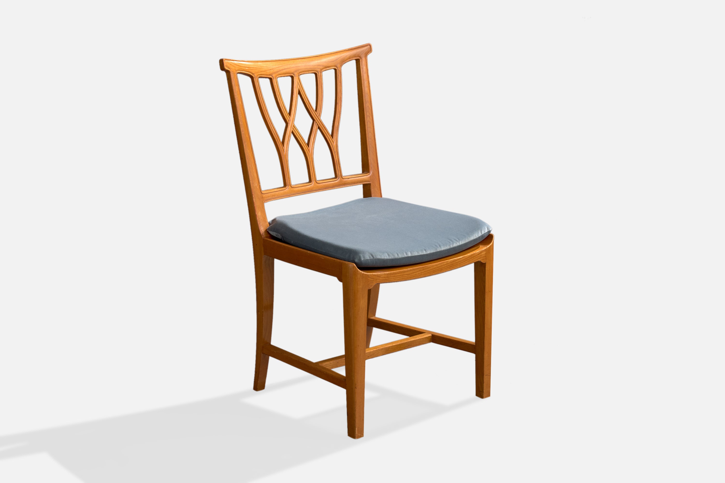 A set of 8 birch and blue velvet dining room chairs designed and produced by Runar Engblom, Sweden, c. 1940s.